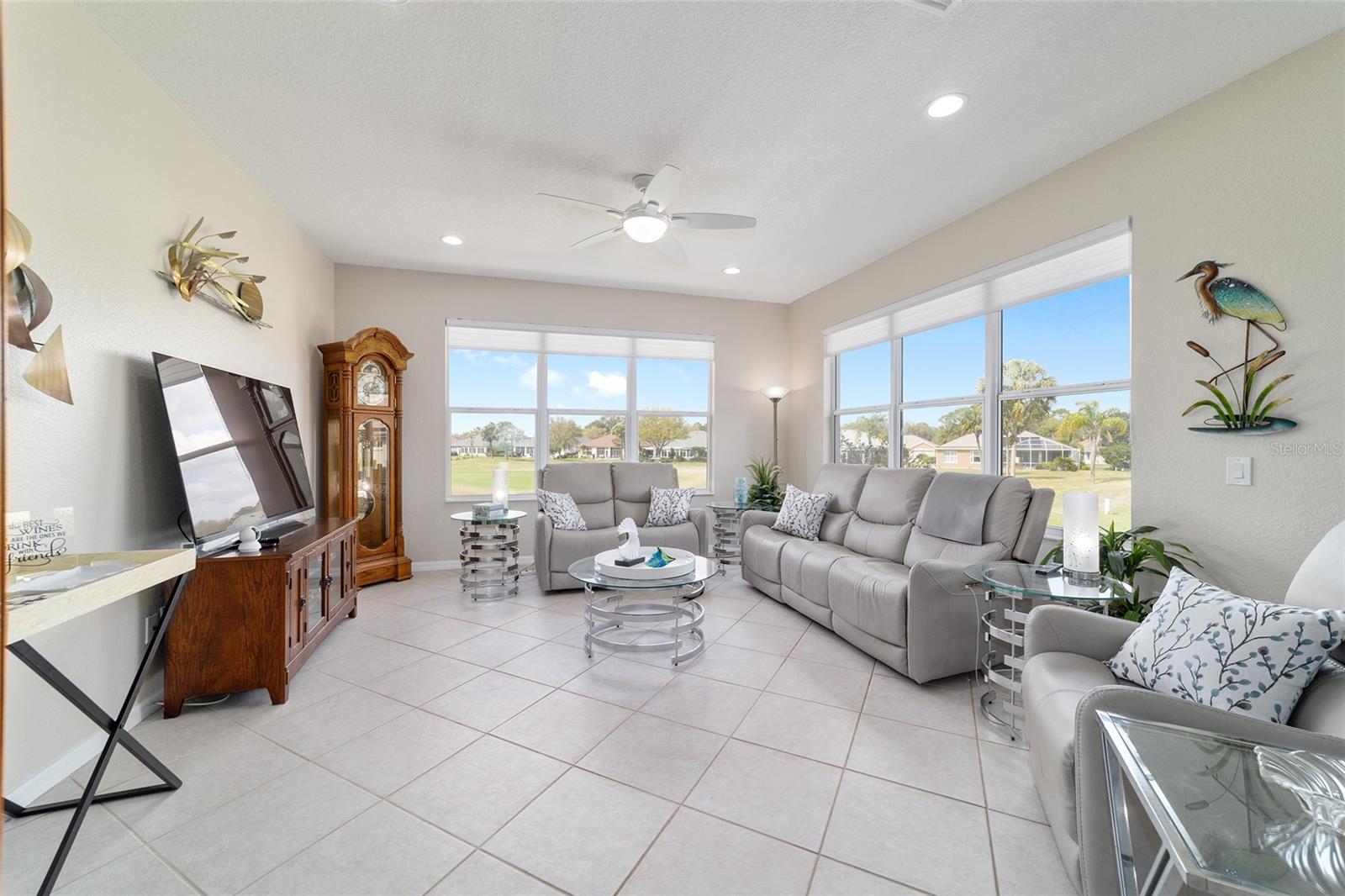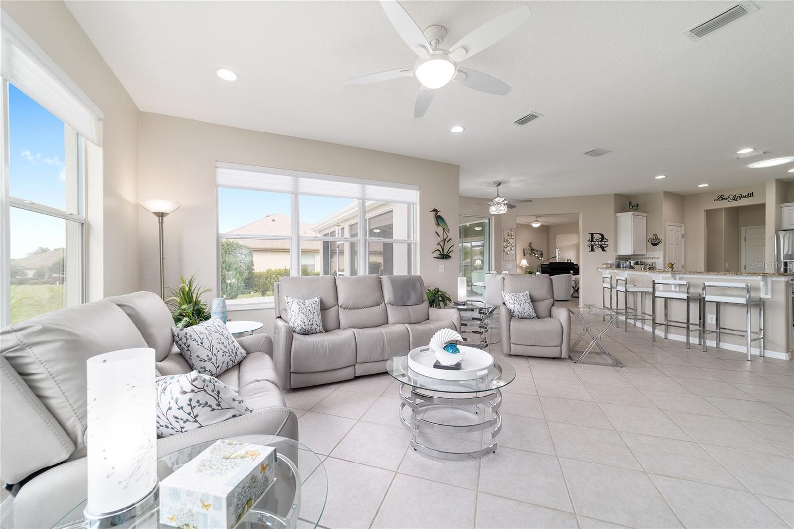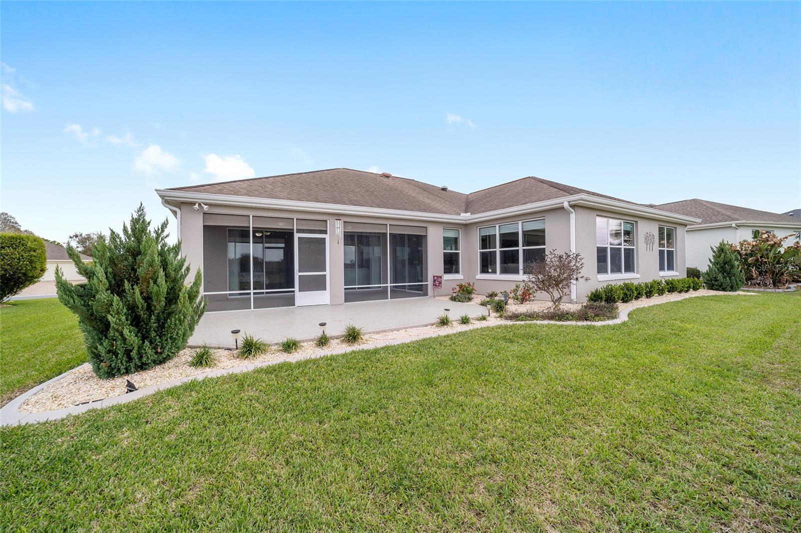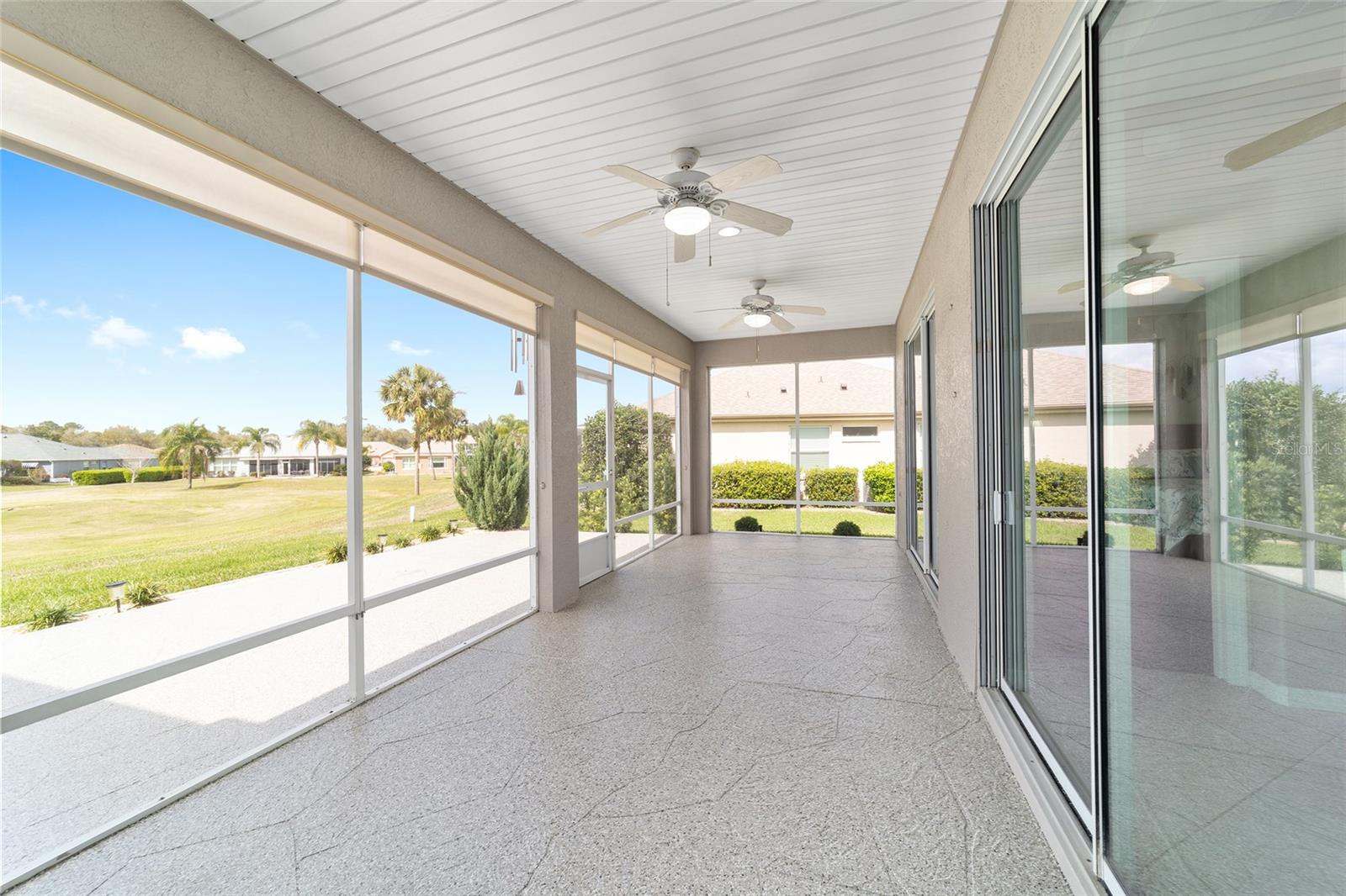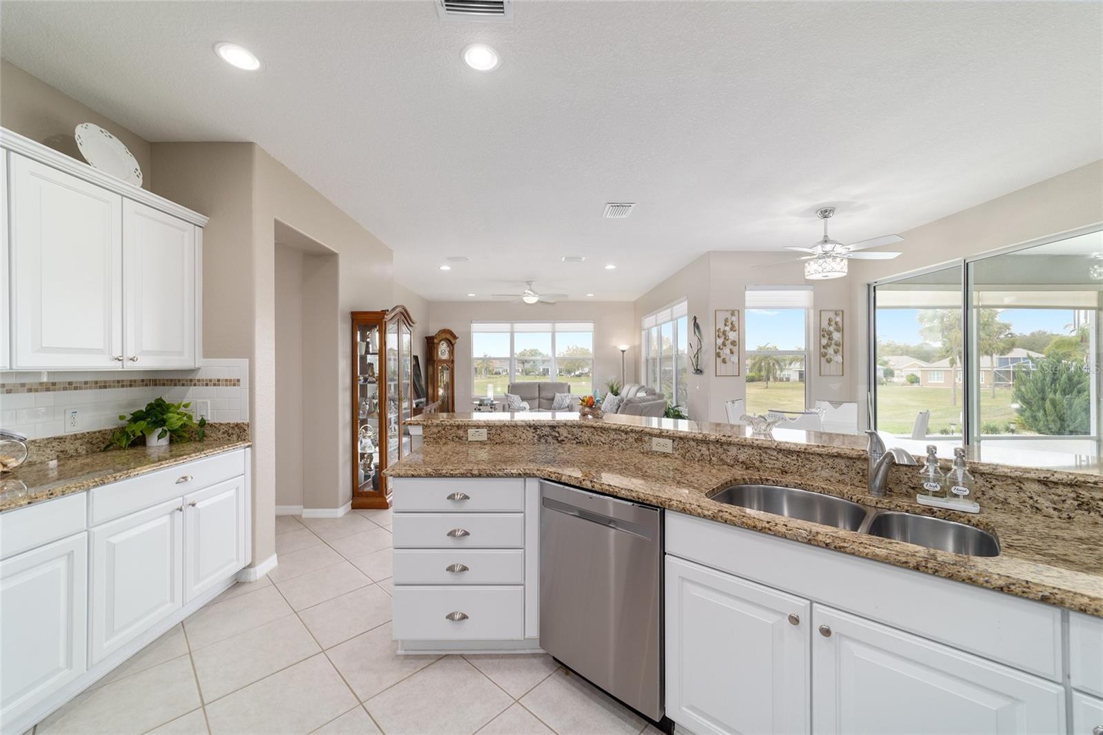Some homes truly have it all, and this Kingston 3-bedroom, 2-bath home is one of them! A unique property with an unbeatable location just off the 5th green of the Memorial Golf Course, this home offers both stunning views and exceptional privacy. From the moment you step through the leaded glass front doors, the breathtaking golf course vista immediately captures your attention. The interior is equally impressive, featuring ceramic tile throughout, except for the three bedrooms, which boast engineered wood flooring.The dream kitchen is designed for both style and functionality, showcasing granite countertops, a tiled backsplash, top-of-the-line stainless steel appliances, white cabinets with double-rollout drawers, ample recessed lighting, and a solar tube for natural light. The kitchen flows effortlessly into the family room, a perfect spot to relax or enjoy golf course views. The living and dining rooms are enhanced by elegant silhouetted shades, while the family room, living room, and all bedrooms are equipped with fans featuring light packages.The primary suite is a showstopper, extending the entire length of the home and leading to a spacious primary bath with a large separate shower, an oval soaking tub, and raised double vanities. Outdoor living is just as spectacular, with a screened lanai opening to a designer concrete patio, ideal for grilling, soaking up the sun, or watching golfers up close. Recently, the lanai floor and patio received a fresh coat of paint, matching the newly painted designer driveway.The landscaping is professionally designed and meticulously maintained, complementing the home's pristine curb appeal. The garage, extended by 4 feet, also includes a separate golf cart garage. Both the garage and driveway feature a durable epoxy finish. Additional updates include a 5-year-old HVAC system, and to top it off, a brand-new roof was installed April 2025. Don’t miss out on this beautiful, move-in-ready home in a sought-after location! Call today to schedule your private showing.