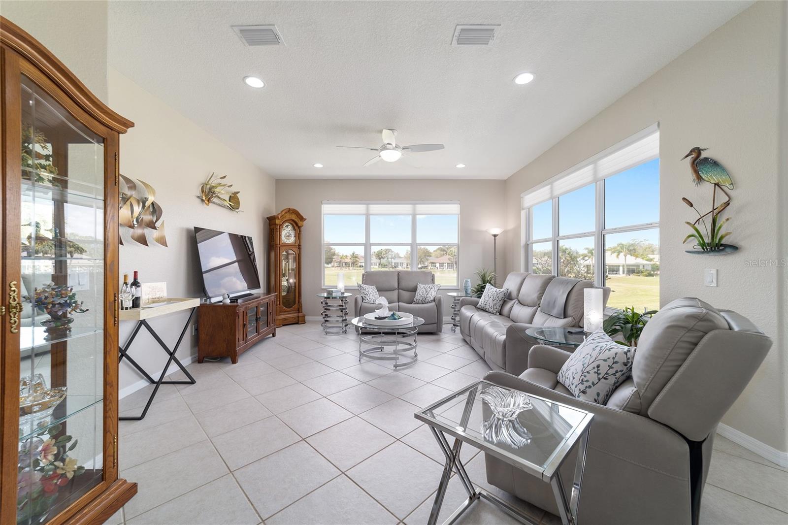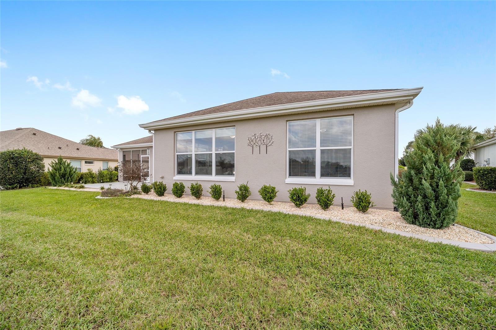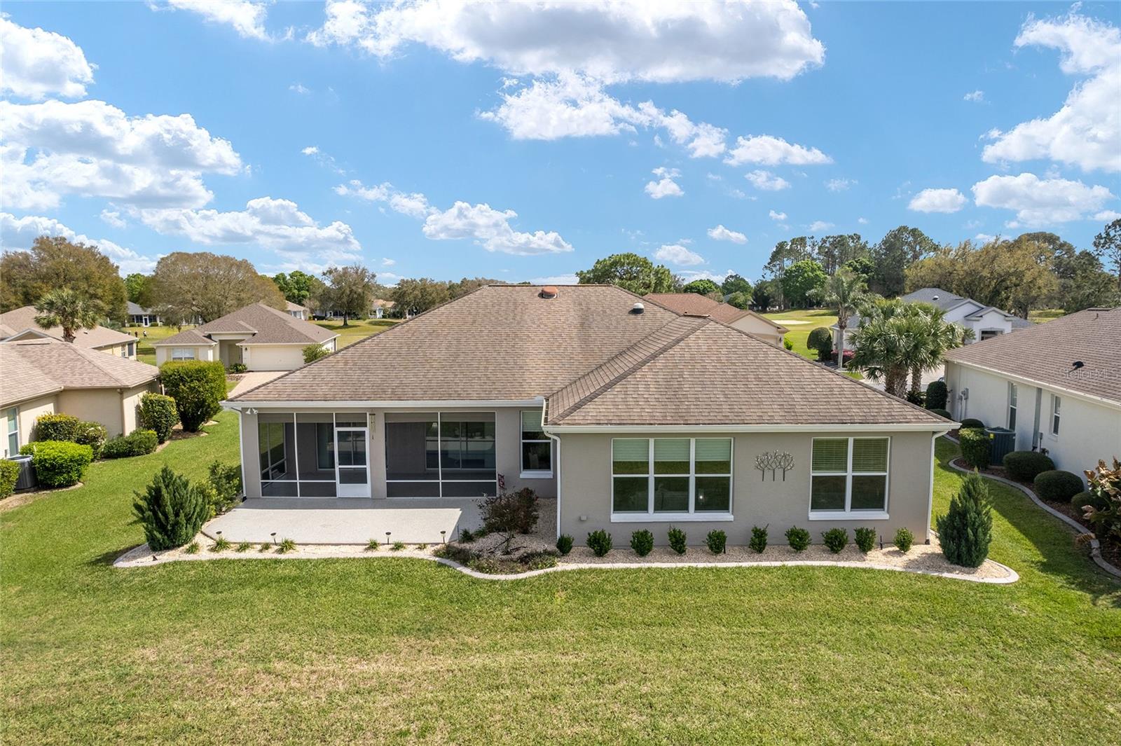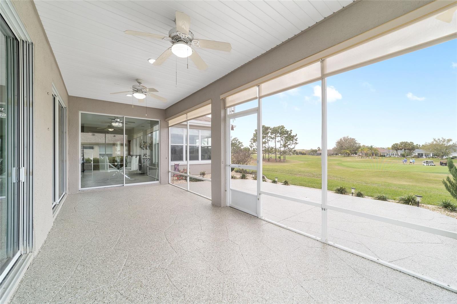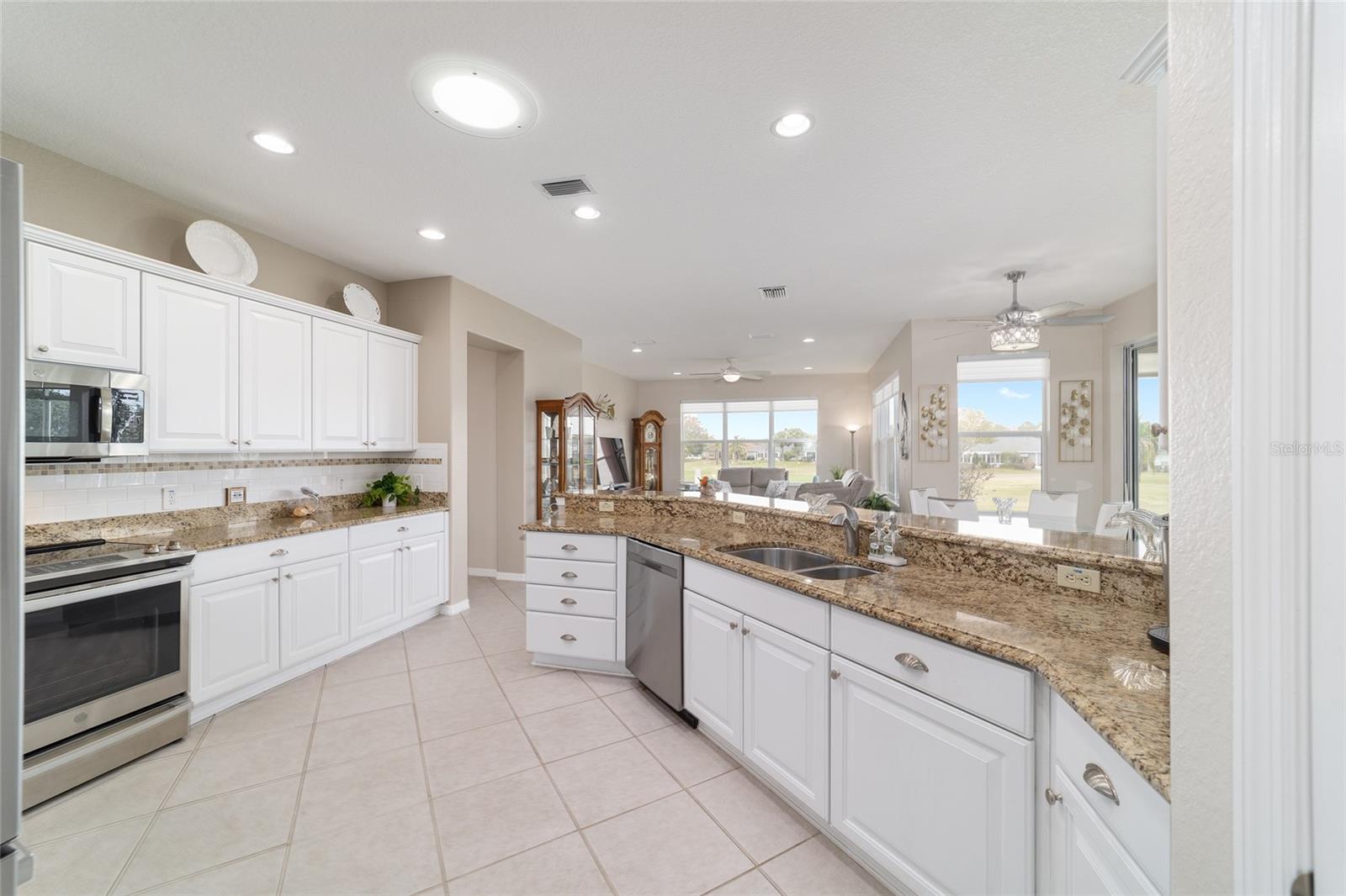 Some homes truly have it all, and this Kingston 3-bedroom, 2-bath home is one of them! A unique property with an unbeatable location just off the 5th green of the Memorial Golf Course, this home offers both stunning views and exceptional privacy. From the moment you step through the leaded glass front doors, the breathtaking golf course vista immediately captures your attention. The interior is equally impressive, featuring ceramic tile throughout, except for the three bedrooms, which boast engineered wood flooring.The dream kitchen is designed for both style and functionality, showcasing granite countertops, a tiled backsplash, top-of-the-line stainless steel appliances, white cabinets with double-rollout drawers, ample recessed lighting, and a solar tube for natural light. The kitchen flows effortlessly into the family room, a perfect spot to relax or enjoy golf course views. The living and dining rooms are enhanced by elegant silhouetted shades, while the family room, living room, and all bedrooms are equipped with fans featuring light packages.The primary suite is a showstopper, extending the entire length of the home and leading to a spacious primary bath with a large separate shower, an oval soaking tub, and raised double vanities. Outdoor living is just as spectacular, with a screened lanai opening to a designer concrete patio, ideal for grilling, soaking up the sun, or watching golfers up close. Recently, the lanai floor and patio received a fresh coat of paint, matching the newly painted designer driveway.The landscaping is professionally designed and meticulously maintained, complementing the home's pristine curb appeal. The garage, extended by 4 feet, also includes a separate golf cart garage. Both the garage and driveway feature a durable epoxy finish. Additional updates include a 5-year-old HVAC system, and to top it off, a brand-new roof was installed April 2025. Don’t miss out on this beautiful, move-in-ready home in a sought-after location! Call today to schedule your private showing.