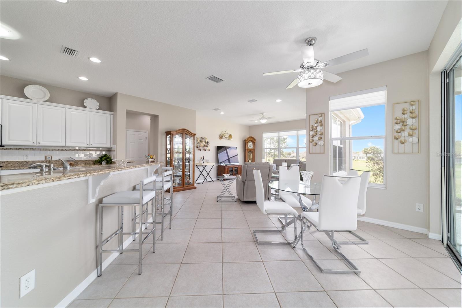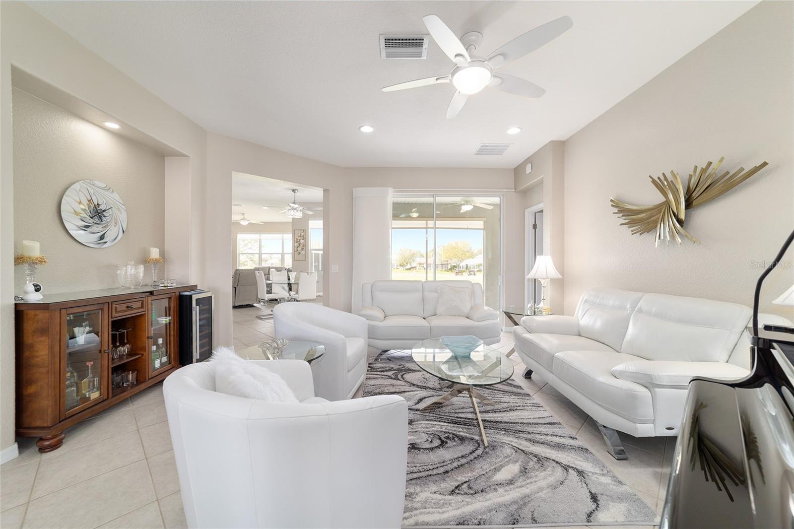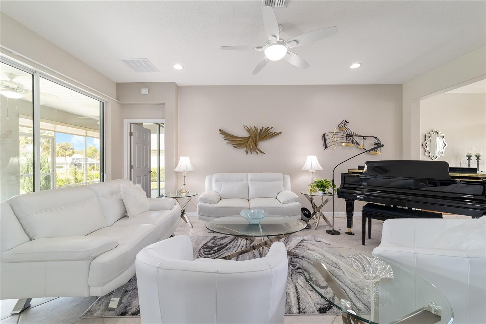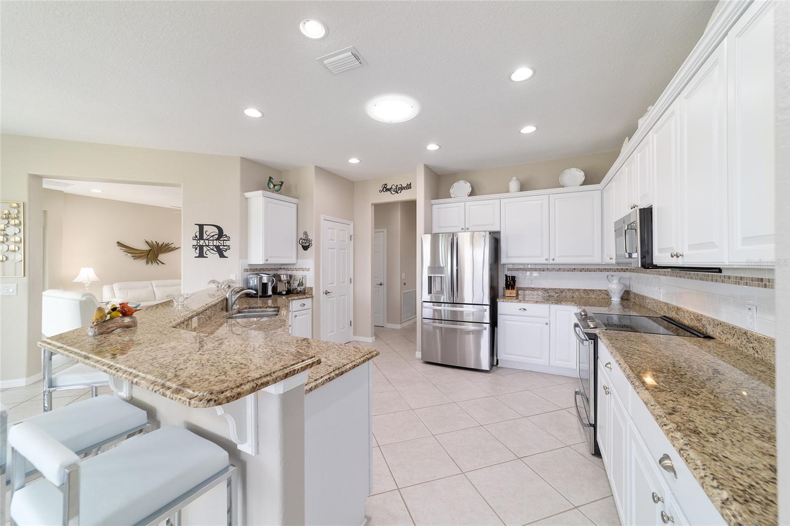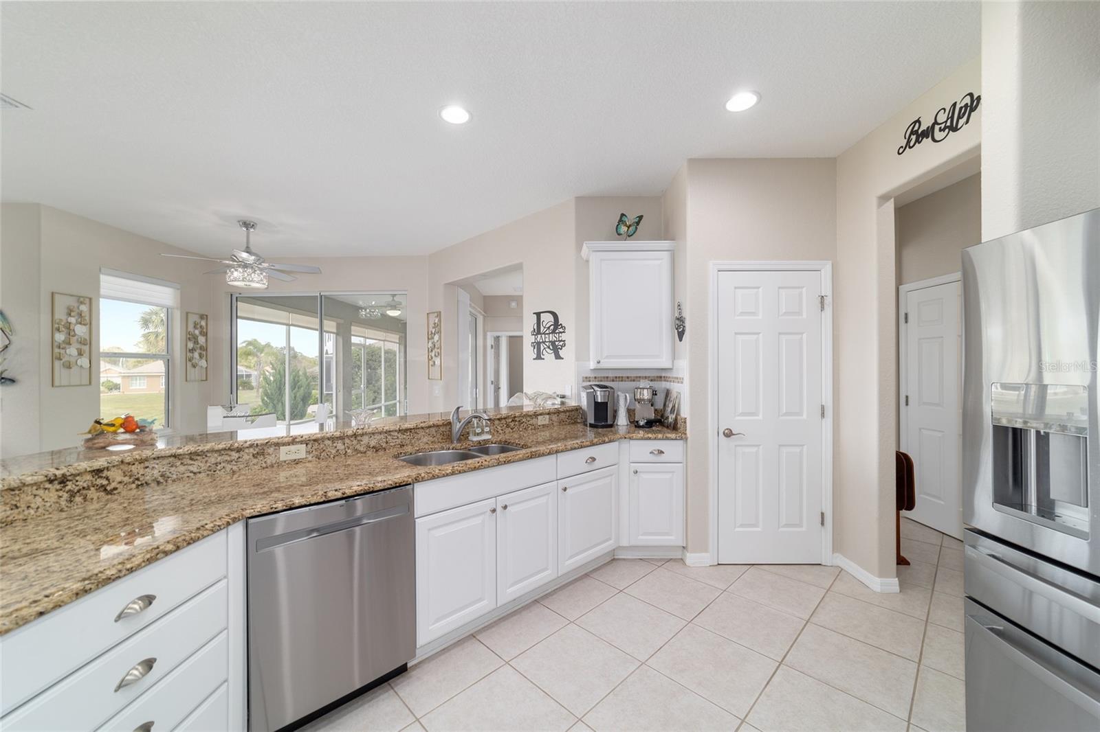 Some homes truly have it all, and this Kingston 3-bedroom, 2-bath home is one of them! A unique property with an unbeatable location just off the 5th green of the Memorial Golf Course, this home offers both stunning views and exceptional privacy. From the moment you step through the leaded glass front doors, the breathtaking golf course vista immediately captures your attention. The interior is equally impressive, featuring ceramic tile throughout, except for the three bedrooms, which boast engineered wood flooring.The dream kitchen is designed for both style and functionality, showcasing granite countertops, a tiled backsplash, top-of-the-line stainless steel appliances, white cabinets with double-rollout drawers, ample recessed lighting, and a solar tube for natural light. The kitchen flows effortlessly into the family room, a perfect spot to relax or enjoy golf course views. The living and dining rooms are enhanced by elegant silhouetted shades, while the family room, living room, and all bedrooms are equipped with fans featuring light packages.The primary suite is a showstopper, extending the entire length of the home and leading to a spacious primary bath with a large separate shower, an oval soaking tub, and raised double vanities. Outdoor living is just as spectacular, with a screened lanai opening to a designer concrete patio, ideal for grilling, soaking up the sun, or watching golfers up close. Recently, the lanai floor and patio received a fresh coat of paint, matching the newly painted designer driveway.The landscaping is professionally designed and meticulously maintained, complementing the home's pristine curb appeal. The garage, extended by 4 feet, also includes a separate golf cart garage. Both the garage and driveway feature a durable epoxy finish. Additional updates include a 5-year-old HVAC system, and to top it off, a brand-new roof was installed April 2025. Don’t miss out on this beautiful, move-in-ready home in a sought-after location! Call today to schedule your private showing.