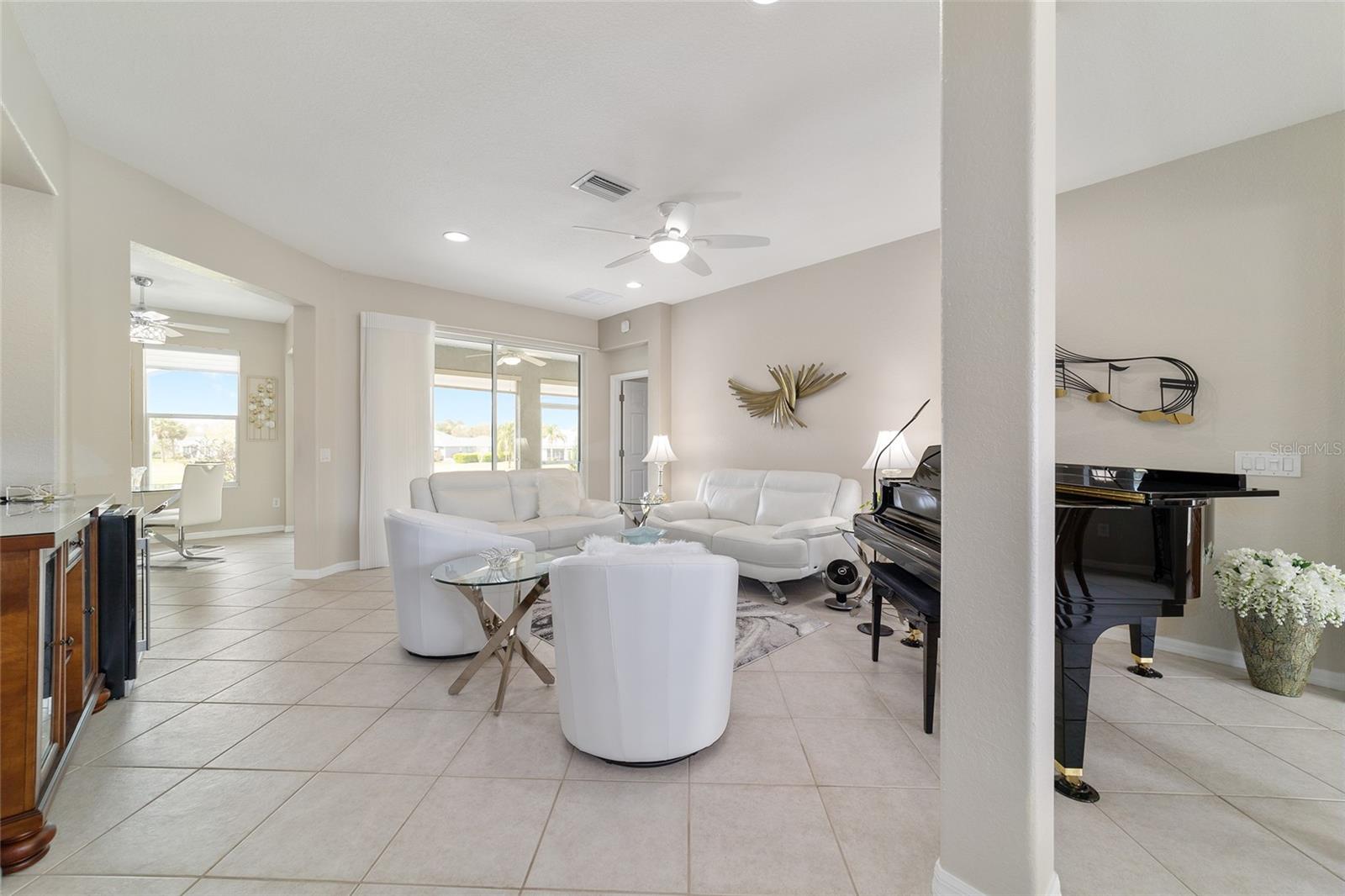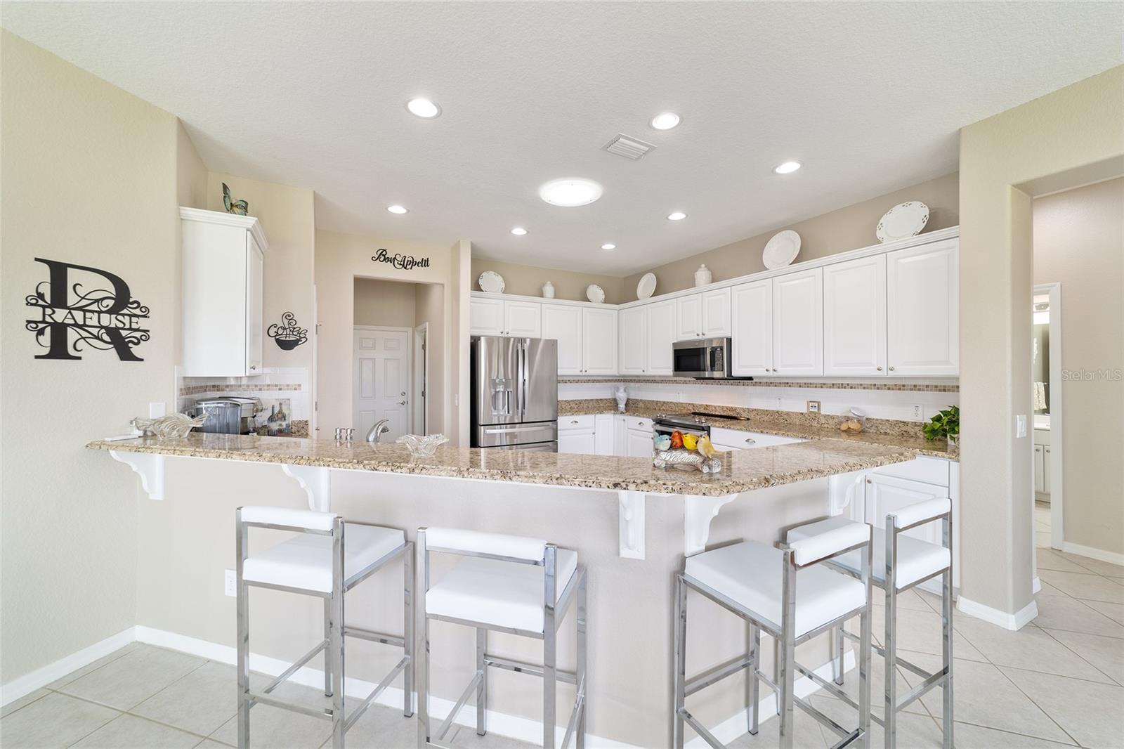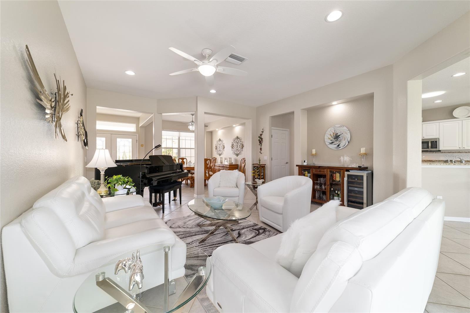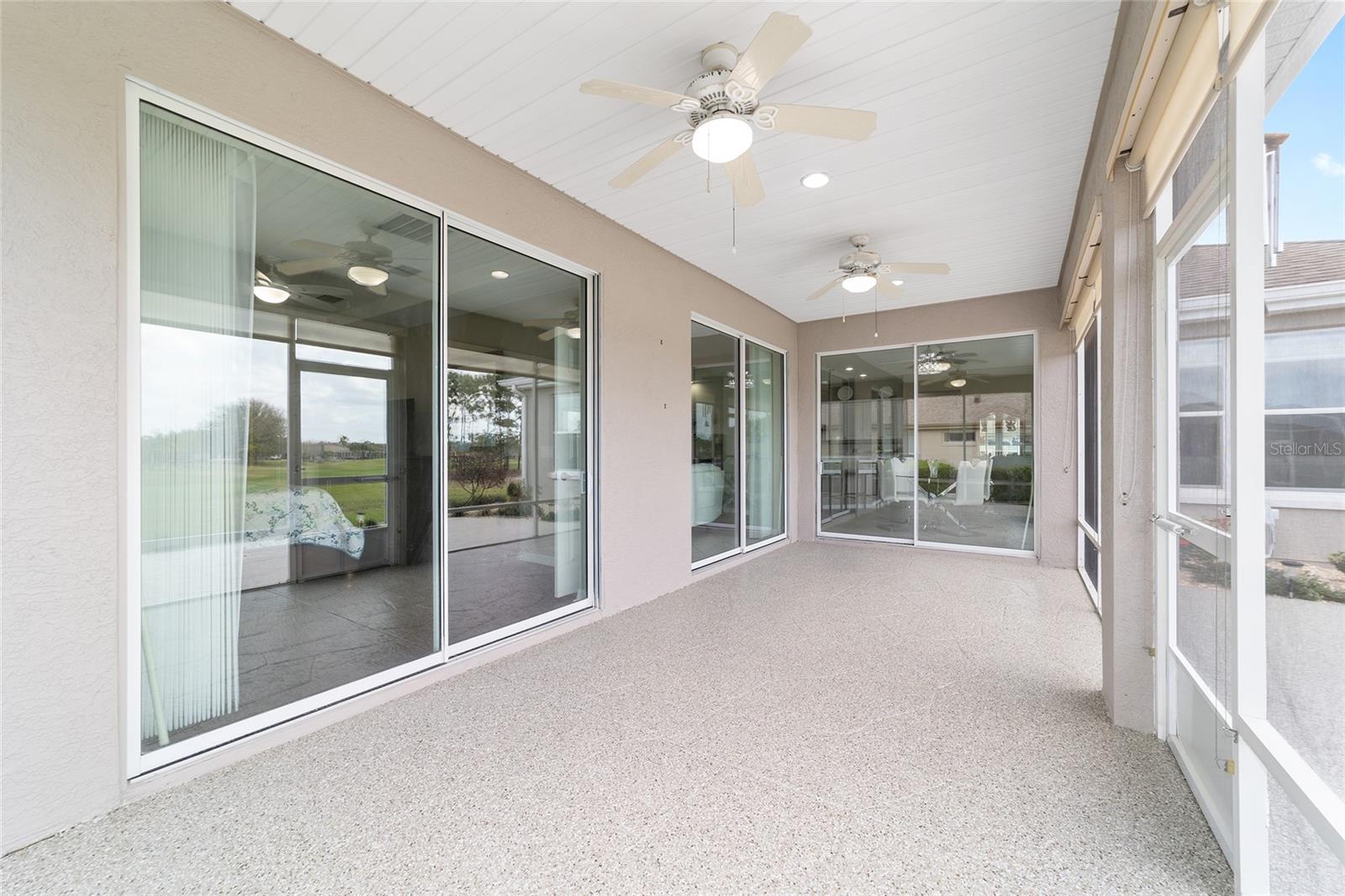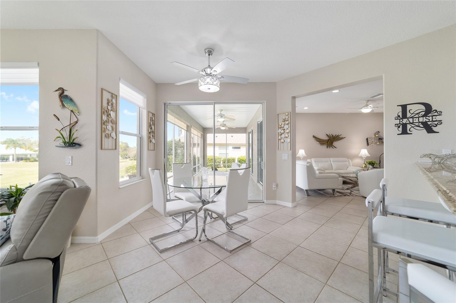 Some homes truly have it all, and this Kingston 3-bedroom, 2-bath home is one of them! A unique property with an unbeatable location just off the 5th green of the Memorial Golf Course, this home offers both stunning views and exceptional privacy. From the moment you step through the leaded glass front doors, the breathtaking golf course vista immediately captures your attention. The interior is equally impressive, featuring ceramic tile throughout, except for the three bedrooms, which boast engineered wood flooring.The dream kitchen is designed for both style and functionality, showcasing granite countertops, a tiled backsplash, top-of-the-line stainless steel appliances, white cabinets with double-rollout drawers, ample recessed lighting, and a solar tube for natural light. The kitchen flows effortlessly into the family room, a perfect spot to relax or enjoy golf course views. The living and dining rooms are enhanced by elegant silhouetted shades, while the family room, living room, and all bedrooms are equipped with fans featuring light packages.The primary suite is a showstopper, extending the entire length of the home and leading to a spacious primary bath with a large separate shower, an oval soaking tub, and raised double vanities. Outdoor living is just as spectacular, with a screened lanai opening to a designer concrete patio, ideal for grilling, soaking up the sun, or watching golfers up close. Recently, the lanai floor and patio received a fresh coat of paint, matching the newly painted designer driveway.The landscaping is professionally designed and meticulously maintained, complementing the home's pristine curb appeal. The garage, extended by 4 feet, also includes a separate golf cart garage. Both the garage and driveway feature a durable epoxy finish. Additional updates include a 5-year-old HVAC system, and to top it off, a brand-new roof was installed April 2025. Don’t miss out on this beautiful, move-in-ready home in a sought-after location! Call today to schedule your private showing.