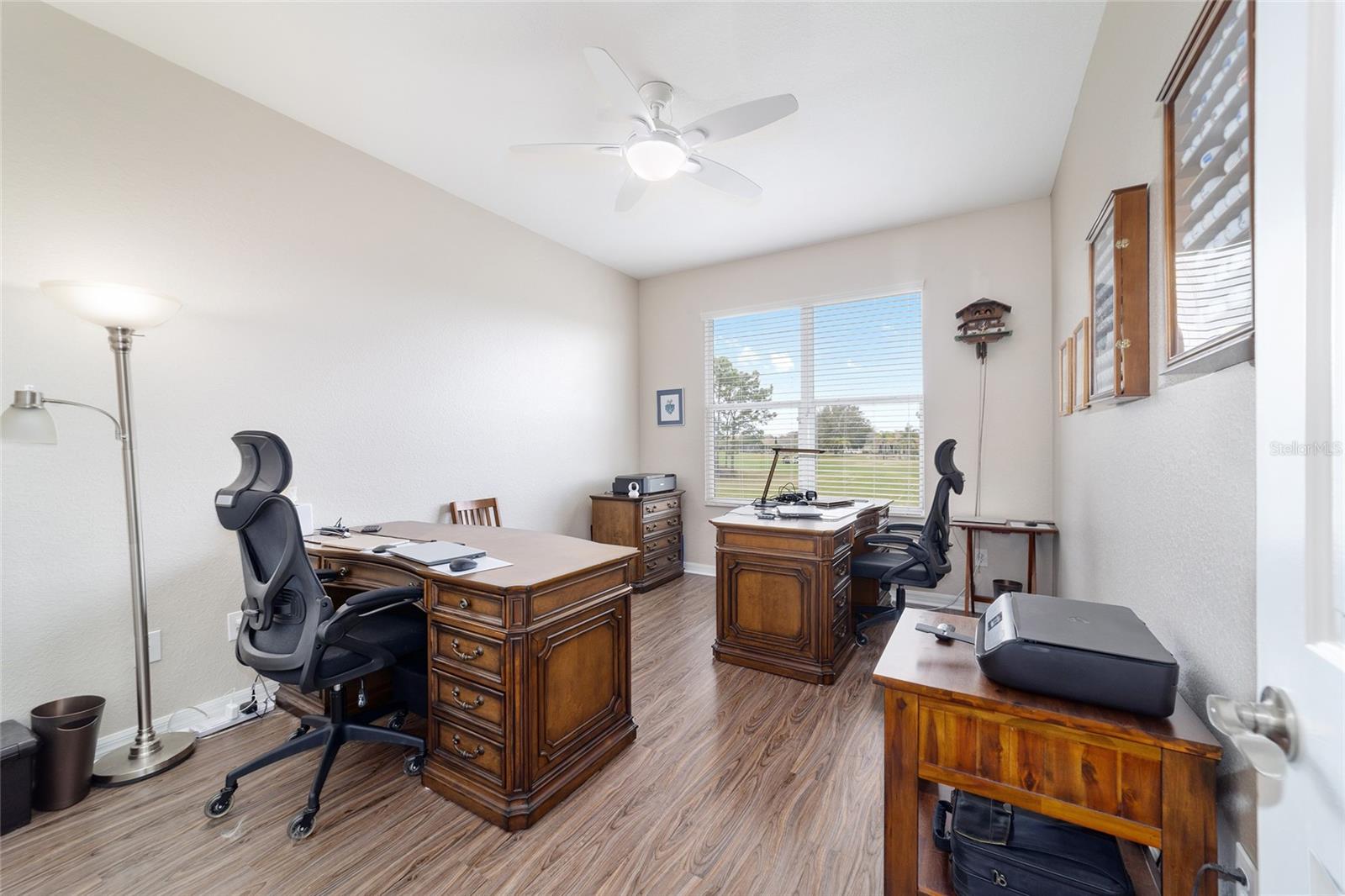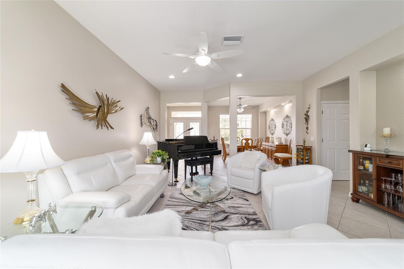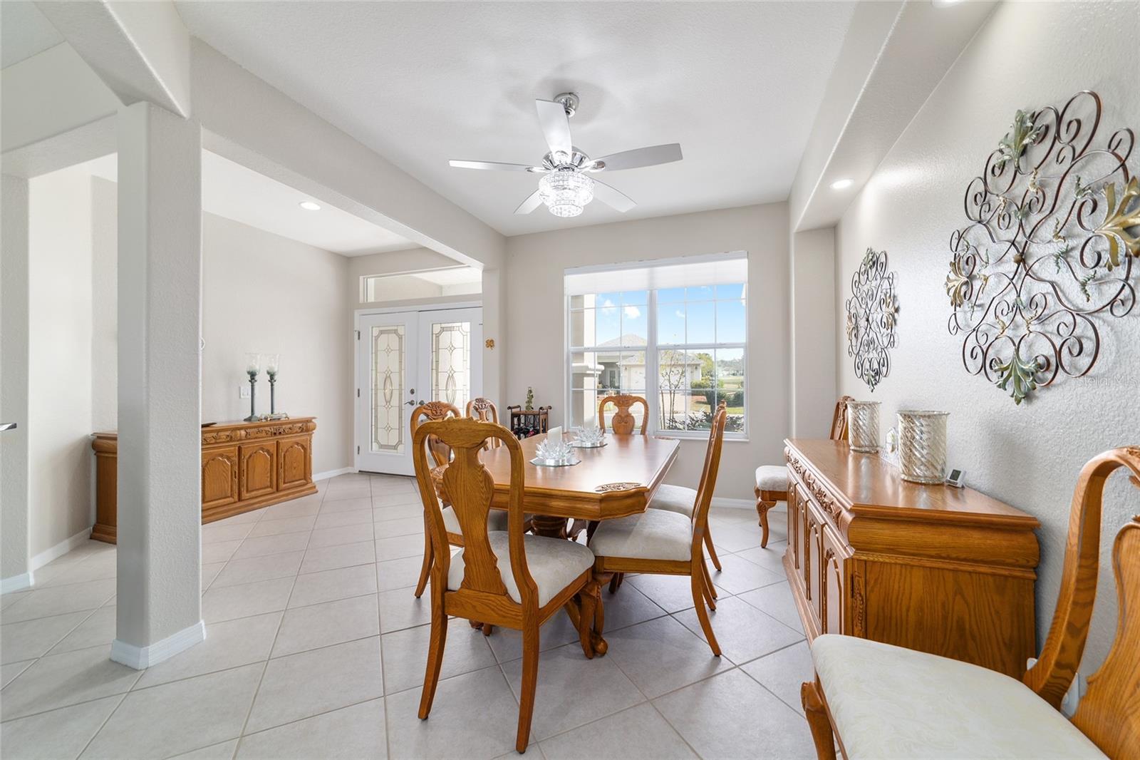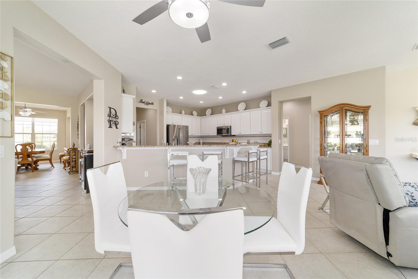 Some homes truly have it all, and this Kingston 3-bedroom, 2-bath home is one of them! A unique property with an unbeatable location just off the 5th green of the Memorial Golf Course, this home offers both stunning views and exceptional privacy. From the moment you step through the leaded glass front doors, the breathtaking golf course vista immediately captures your attention. The interior is equally impressive, featuring ceramic tile throughout, except for the three bedrooms, which boast engineered wood flooring.The dream kitchen is designed for both style and functionality, showcasing granite countertops, a tiled backsplash, top-of-the-line stainless steel appliances, white cabinets with double-rollout drawers, ample recessed lighting, and a solar tube for natural light. The kitchen flows effortlessly into the family room, a perfect spot to relax or enjoy golf course views. The living and dining rooms are enhanced by elegant silhouetted shades, while the family room, living room, and all bedrooms are equipped with fans featuring light packages.The primary suite is a showstopper, extending the entire length of the home and leading to a spacious primary bath with a large separate shower, an oval soaking tub, and raised double vanities. Outdoor living is just as spectacular, with a screened lanai opening to a designer concrete patio, ideal for grilling, soaking up the sun, or watching golfers up close. Recently, the lanai floor and patio received a fresh coat of paint, matching the newly painted designer driveway.The landscaping is professionally designed and meticulously maintained, complementing the home's pristine curb appeal. The garage, extended by 4 feet, also includes a separate golf cart garage. Both the garage and driveway feature a durable epoxy finish. Additional updates include a 5-year-old HVAC system, and to top it off, a brand-new roof was installed April 2025. Don’t miss out on this beautiful, move-in-ready home in a sought-after location! Call today to schedule your private showing.
