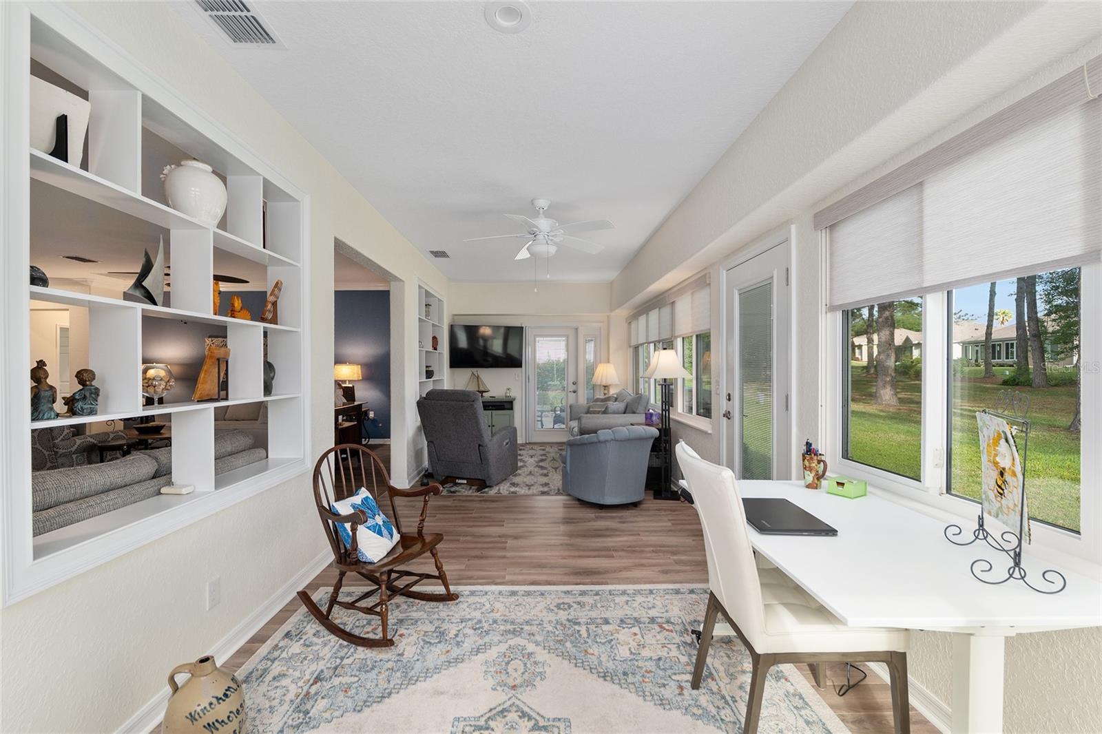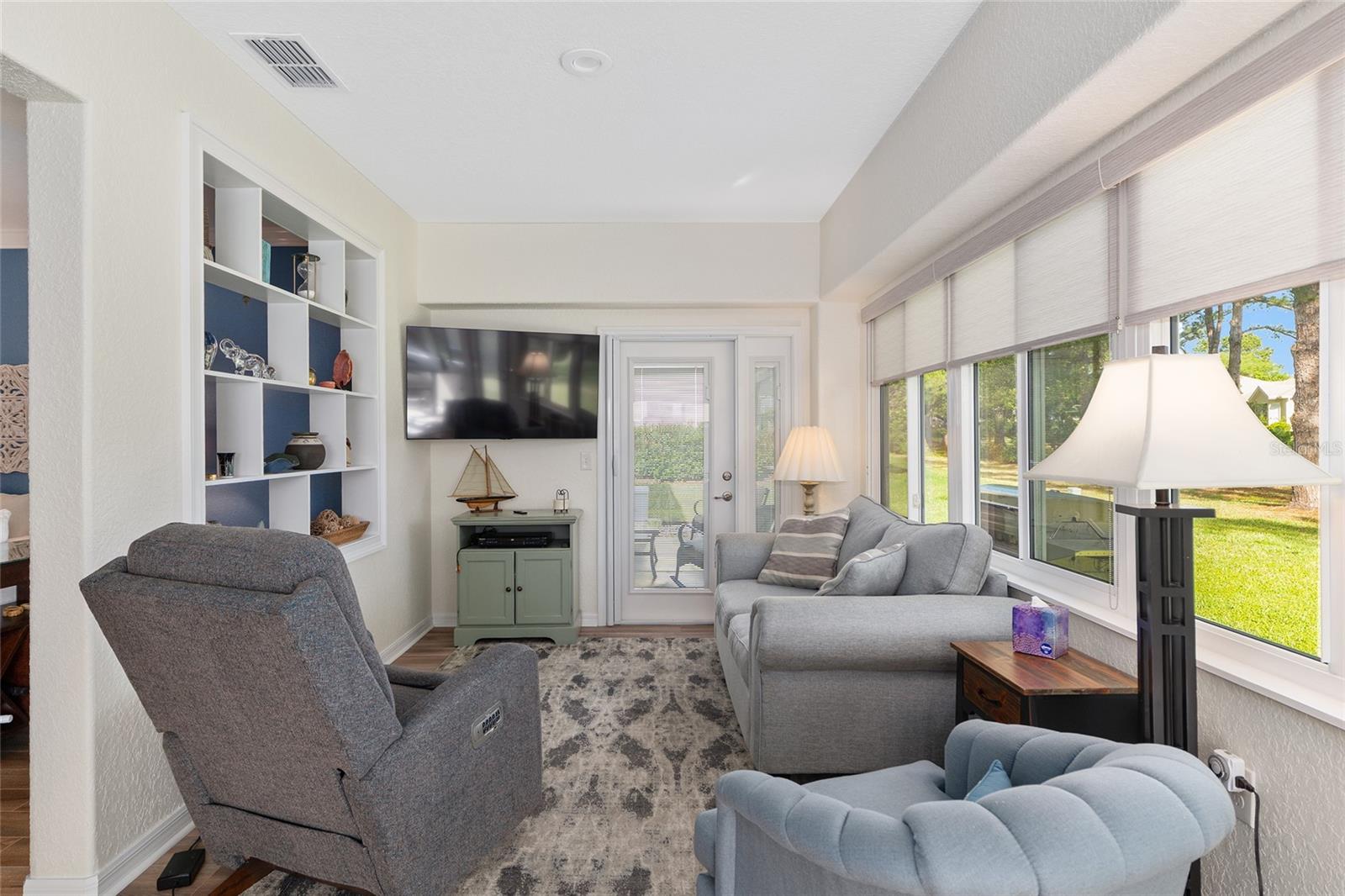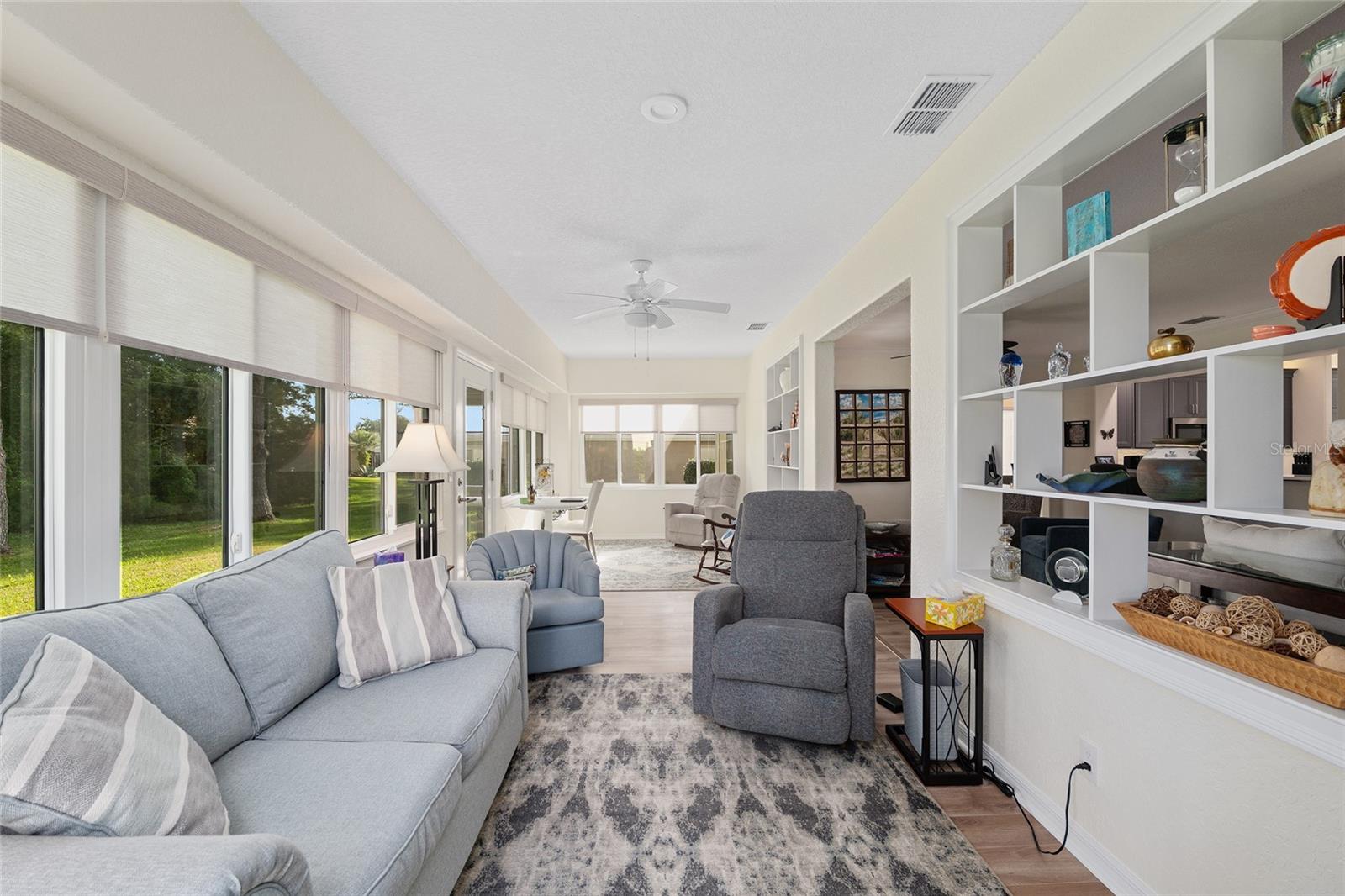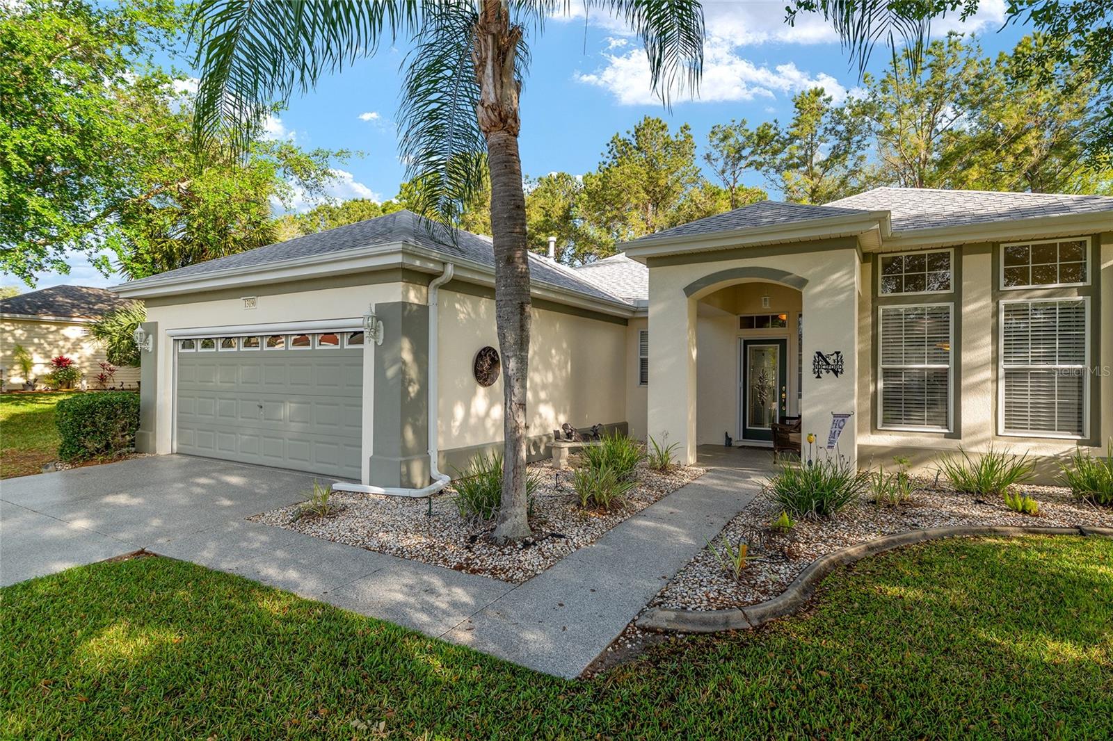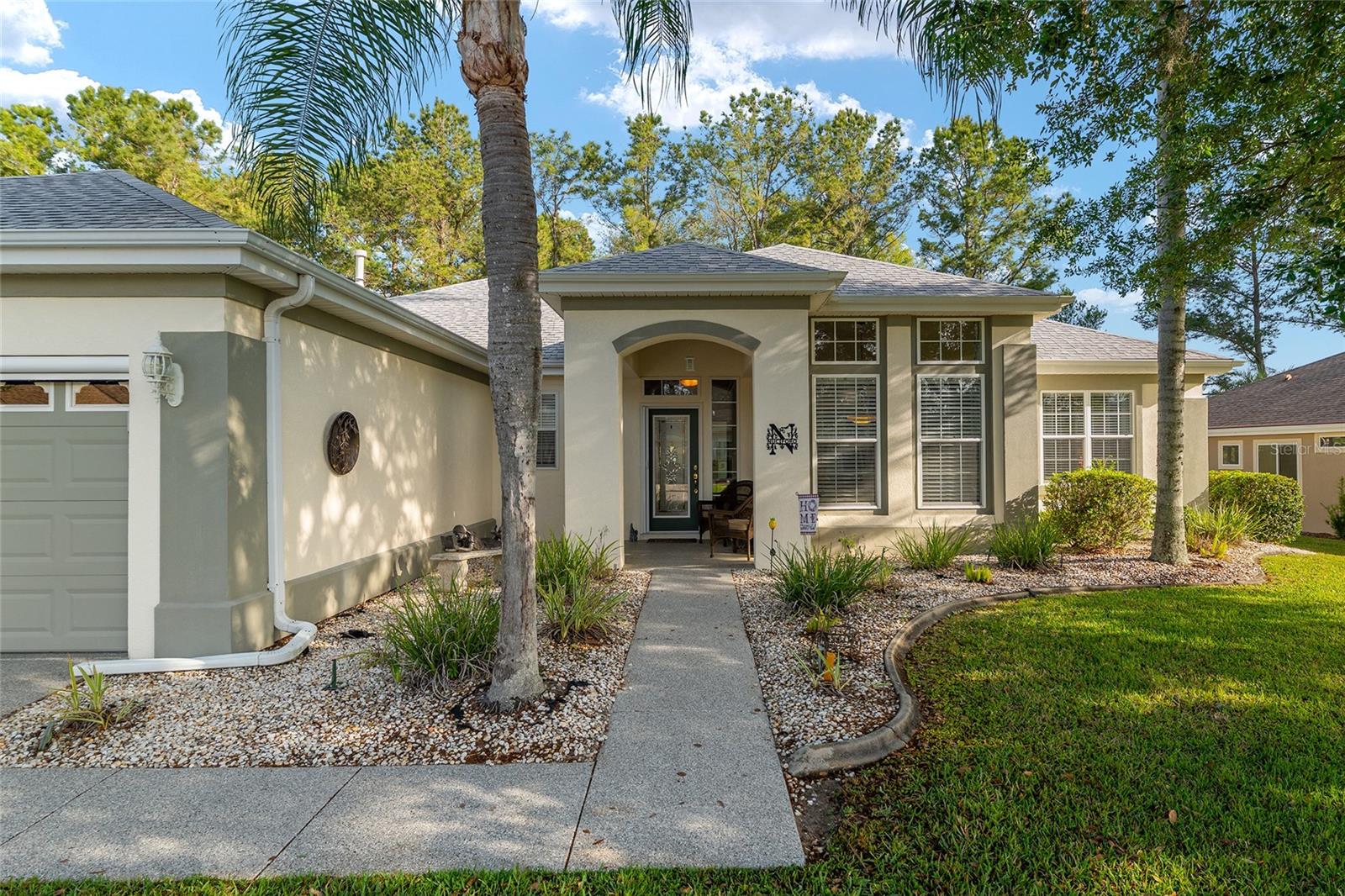 One-of-a-Kind Sanibel Model on Private Greenbelt – Must See! Welcome to this beautifully updated Sanibel model, perfectly situated on a serene greenbelt lot in the sought-after community of Del Webb Spruce Creek. This 2-bedroom, 2-bath home with a den has been thoughtfully remodeled with high-end finishes and a designer's touch. Step inside to find engineered wood flooring throughout, with custom tile in the bathrooms. The heart of the home is a gourmet kitchen, boasting quartz countertops, custom cabinetry with upgraded hardware, stainless steel appliances, and a stunning tile floor. Crown molding highlights the spacious living and dining area, which opens into a reimagined Florida Room—now under heat and air—with glass windows, a raised engineered wood floor that seamlessly flows from the great room, see-through walls, and a wide opening created by the removal of the former sliding glass doors. It’s the perfect space to relax or entertain year-roundThe den/studio features a custom Murphy bed with built-in shelving, providing flexible guest space when needed. The guest bathroom has been fully remodeled with a new custom vanity and flooring, ideally positioned between the second bedroom and den for privacy. The primary suite is located on the opposite side of the home, offering bay windows that frame tranquil views of the tall pines and greenbelt beyond. The utility room includes custom cabinets and a workspace, perfect for hobbies or organization. Enjoy a 27-foot extended garage with a remote-controlled screen, allowing fresh air to circulate while maintaining privacy. Outdoors, a large patio invites you to unwind, grill, enjoy cocktails, or read—all while soaking in peaceful greenbelt views. Recent updates include a new roof (2018) and HVAC system (2020). Del Webb Spruce Creek offers resort-style amenities including 36 holes of golf, 10 pickleball courts, tennis courts, three pools (including one indoors), and countless clubs and activities to suit every interest. This one-of-a-kind home won’t last long—schedule your private tour today!