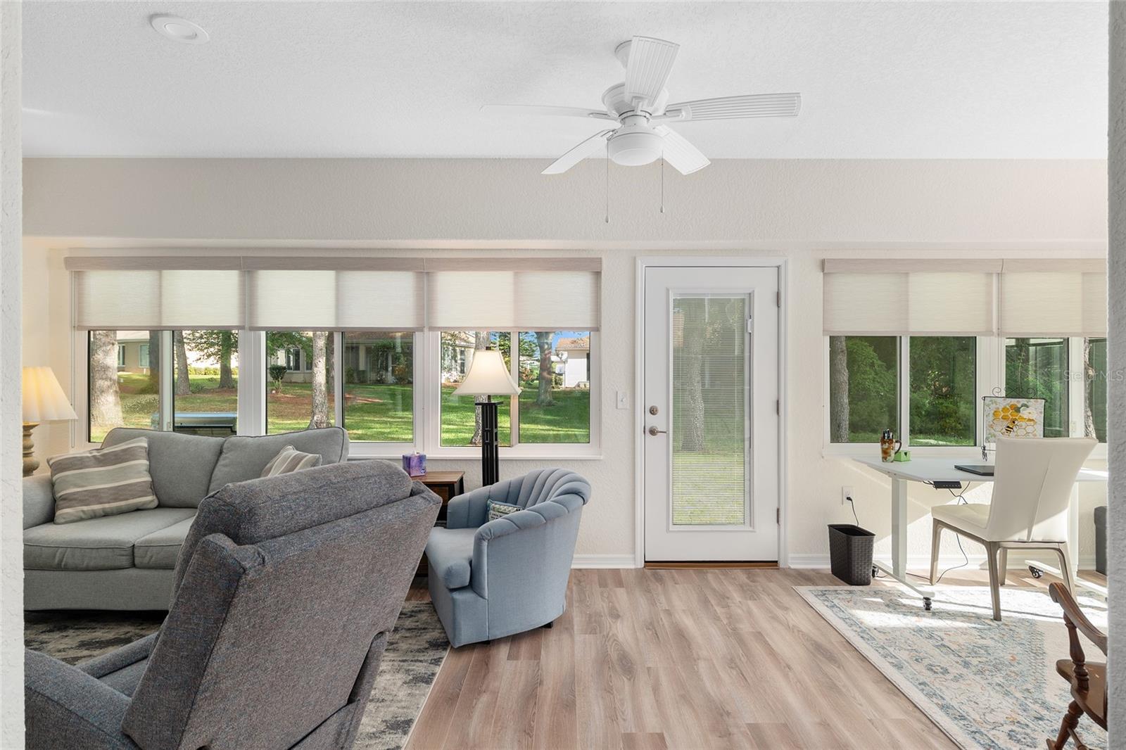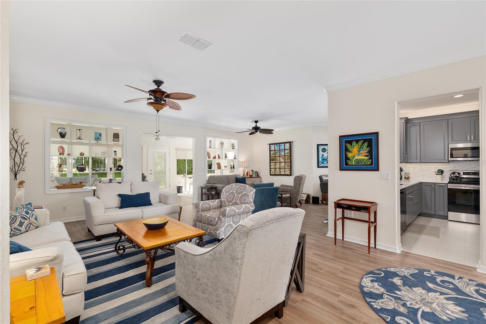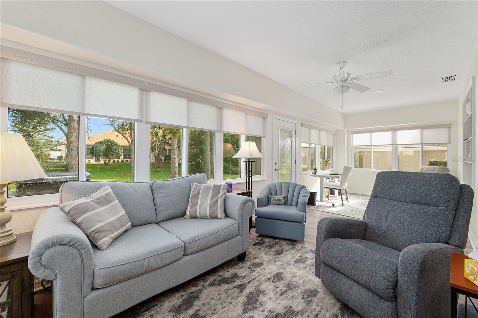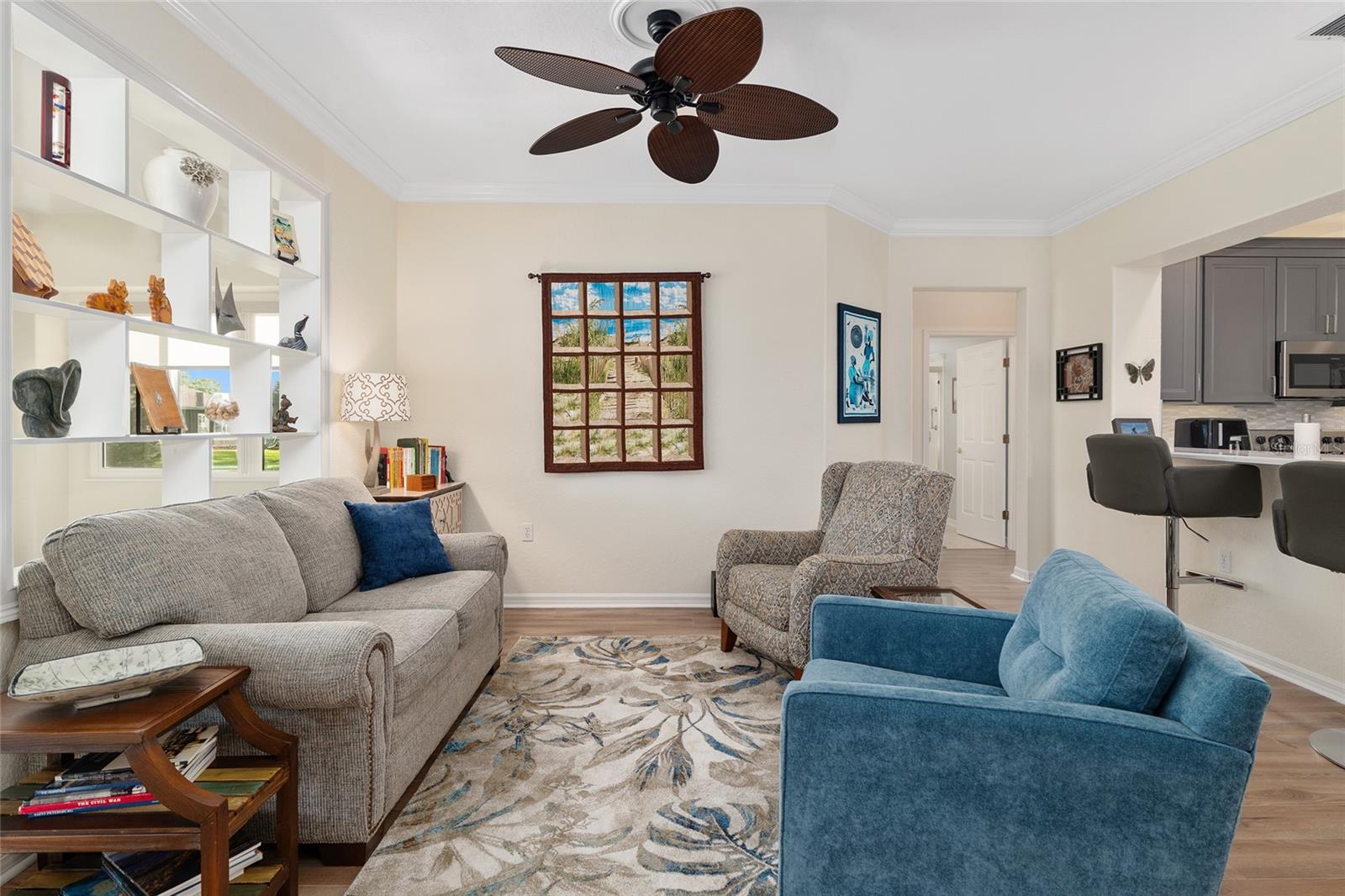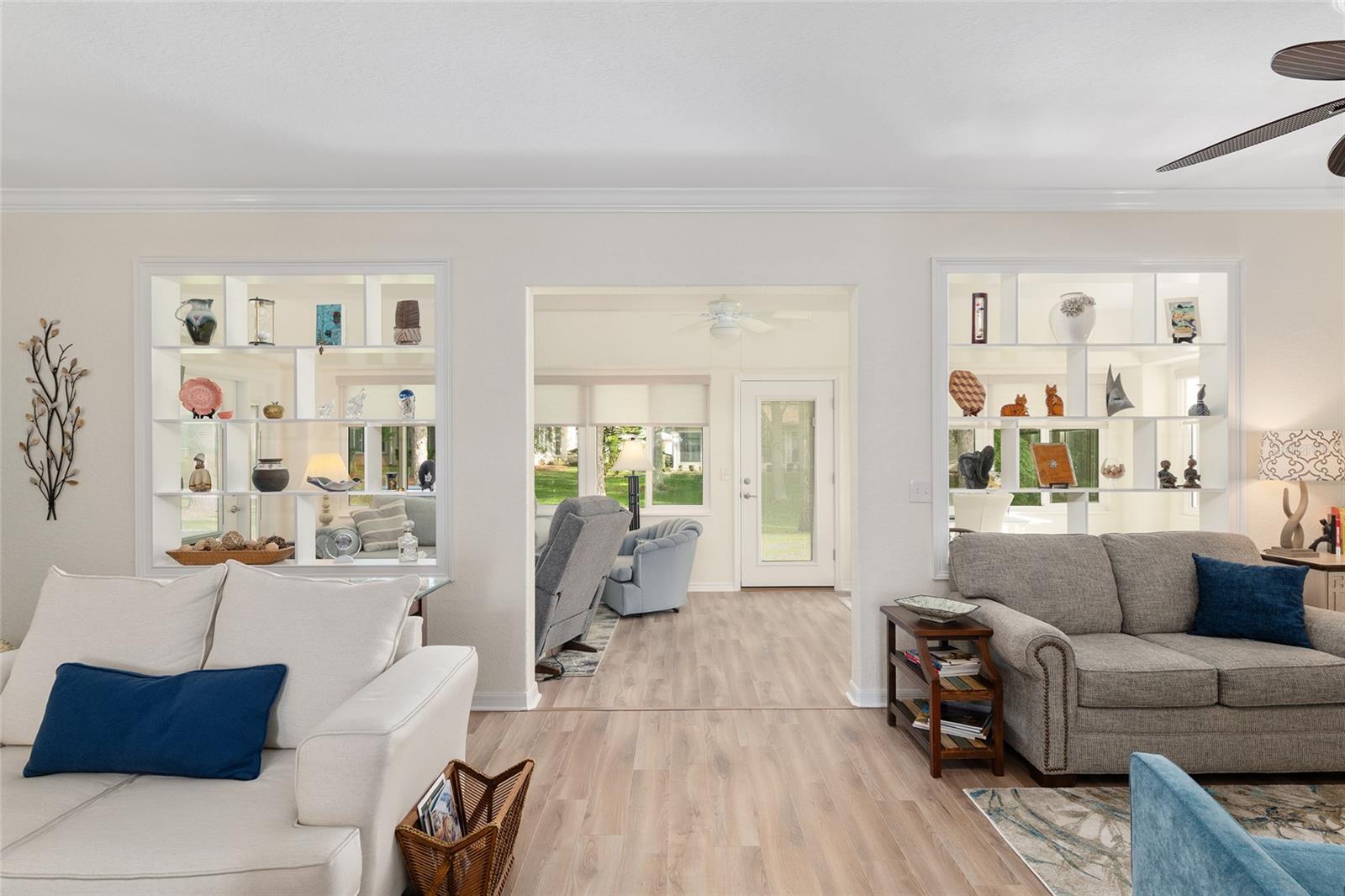 One-of-a-Kind Sanibel Model on Private Greenbelt – Must See! Welcome to this beautifully updated Sanibel model, perfectly situated on a serene greenbelt lot in the sought-after community of Del Webb Spruce Creek. This 2-bedroom, 2-bath home with a den has been thoughtfully remodeled with high-end finishes and a designer's touch. Step inside to find engineered wood flooring throughout, with custom tile in the bathrooms. The heart of the home is a gourmet kitchen, boasting quartz countertops, custom cabinetry with upgraded hardware, stainless steel appliances, and a stunning tile floor. Crown molding highlights the spacious living and dining area, which opens into a reimagined Florida Room—now under heat and air—with glass windows, a raised engineered wood floor that seamlessly flows from the great room, see-through walls, and a wide opening created by the removal of the former sliding glass doors. It’s the perfect space to relax or entertain year-roundThe den/studio features a custom Murphy bed with built-in shelving, providing flexible guest space when needed. The guest bathroom has been fully remodeled with a new custom vanity and flooring, ideally positioned between the second bedroom and den for privacy. The primary suite is located on the opposite side of the home, offering bay windows that frame tranquil views of the tall pines and greenbelt beyond. The utility room includes custom cabinets and a workspace, perfect for hobbies or organization. Enjoy a 27-foot extended garage with a remote-controlled screen, allowing fresh air to circulate while maintaining privacy. Outdoors, a large patio invites you to unwind, grill, enjoy cocktails, or read—all while soaking in peaceful greenbelt views. Recent updates include a new roof (2018) and HVAC system (2020). Del Webb Spruce Creek offers resort-style amenities including 36 holes of golf, 10 pickleball courts, tennis courts, three pools (including one indoors), and countless clubs and activities to suit every interest. This one-of-a-kind home won’t last long—schedule your private tour today!