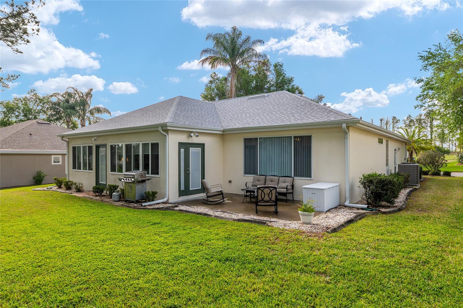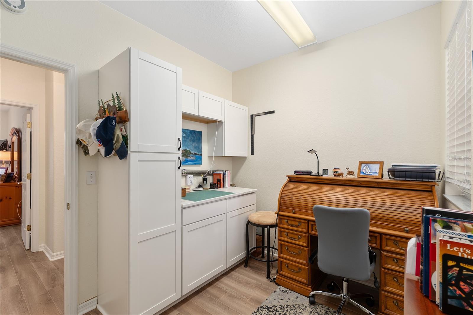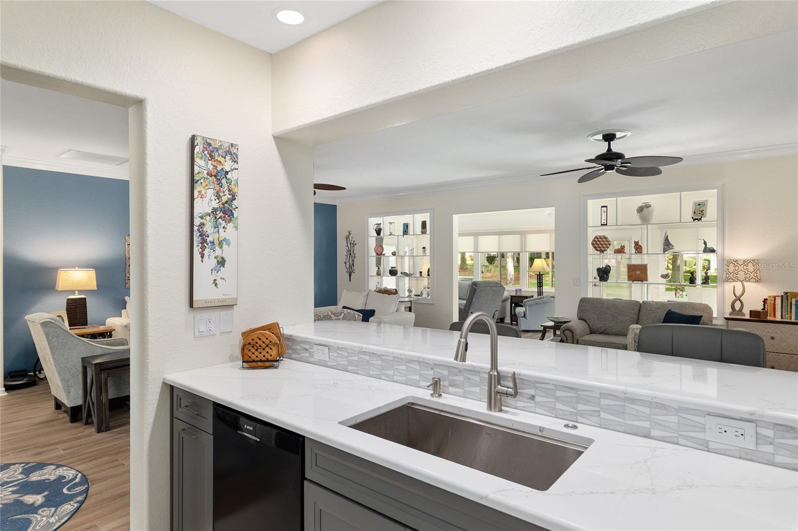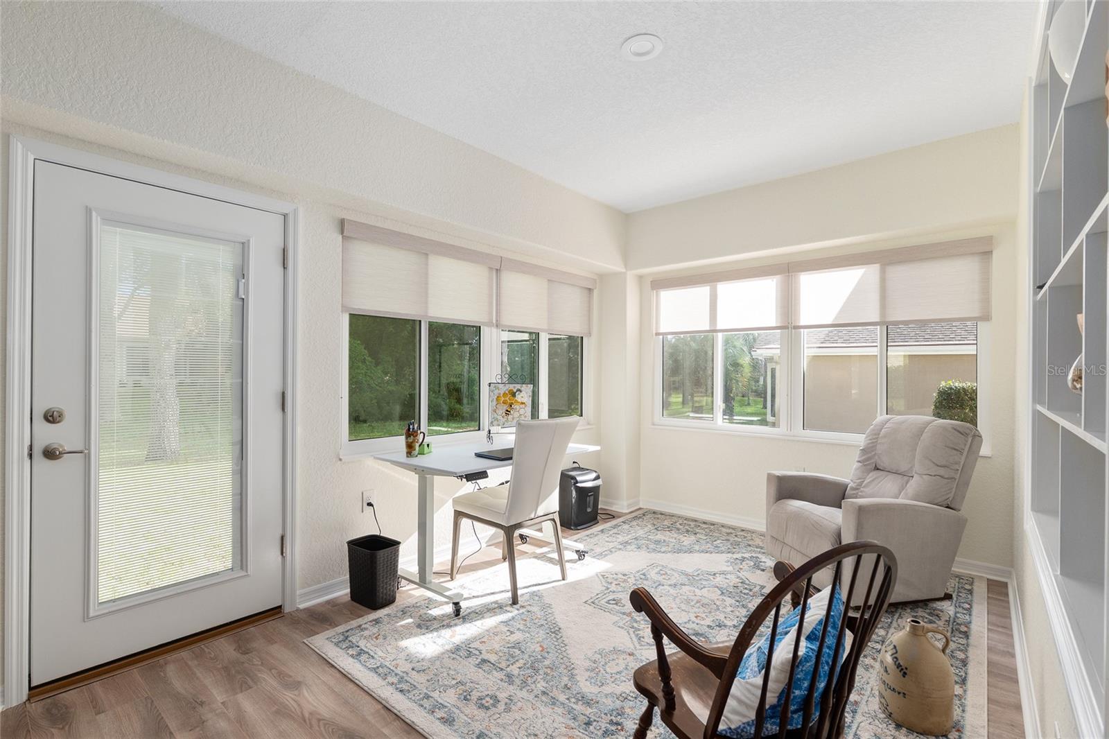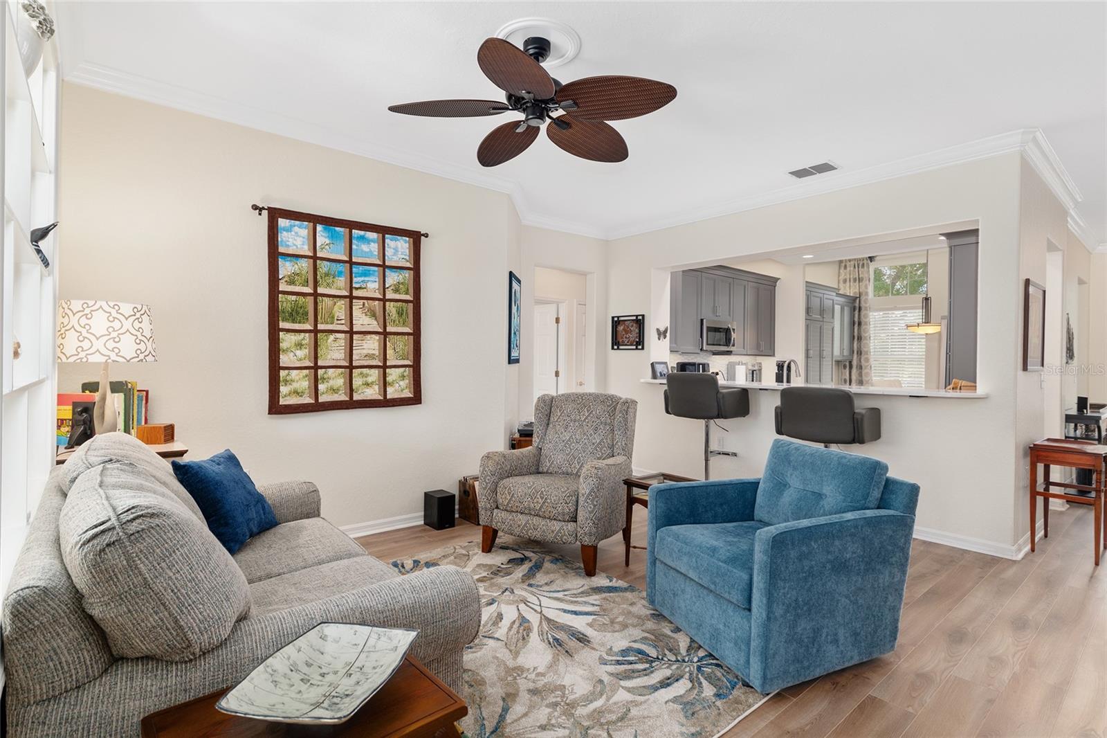 One-of-a-Kind Sanibel Model on Private Greenbelt – Must See! Welcome to this beautifully updated Sanibel model, perfectly situated on a serene greenbelt lot in the sought-after community of Del Webb Spruce Creek. This 2-bedroom, 2-bath home with a den has been thoughtfully remodeled with high-end finishes and a designer's touch. Step inside to find engineered wood flooring throughout, with custom tile in the bathrooms. The heart of the home is a gourmet kitchen, boasting quartz countertops, custom cabinetry with upgraded hardware, stainless steel appliances, and a stunning tile floor. Crown molding highlights the spacious living and dining area, which opens into a reimagined Florida Room—now under heat and air—with glass windows, a raised engineered wood floor that seamlessly flows from the great room, see-through walls, and a wide opening created by the removal of the former sliding glass doors. It’s the perfect space to relax or entertain year-roundThe den/studio features a custom Murphy bed with built-in shelving, providing flexible guest space when needed. The guest bathroom has been fully remodeled with a new custom vanity and flooring, ideally positioned between the second bedroom and den for privacy. The primary suite is located on the opposite side of the home, offering bay windows that frame tranquil views of the tall pines and greenbelt beyond. The utility room includes custom cabinets and a workspace, perfect for hobbies or organization. Enjoy a 27-foot extended garage with a remote-controlled screen, allowing fresh air to circulate while maintaining privacy. Outdoors, a large patio invites you to unwind, grill, enjoy cocktails, or read—all while soaking in peaceful greenbelt views. Recent updates include a new roof (2018) and HVAC system (2020). Del Webb Spruce Creek offers resort-style amenities including 36 holes of golf, 10 pickleball courts, tennis courts, three pools (including one indoors), and countless clubs and activities to suit every interest. This one-of-a-kind home won’t last long—schedule your private tour today!