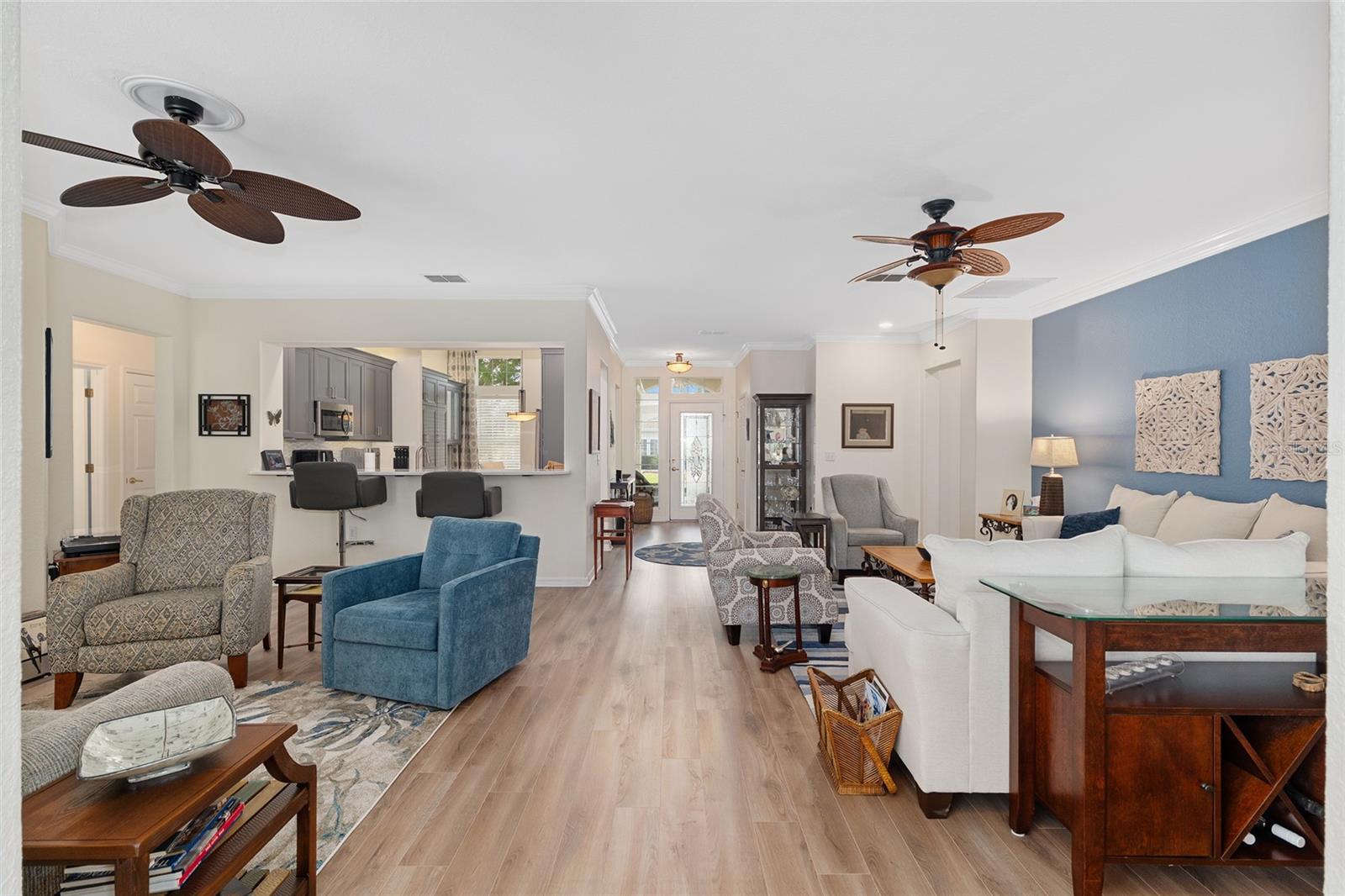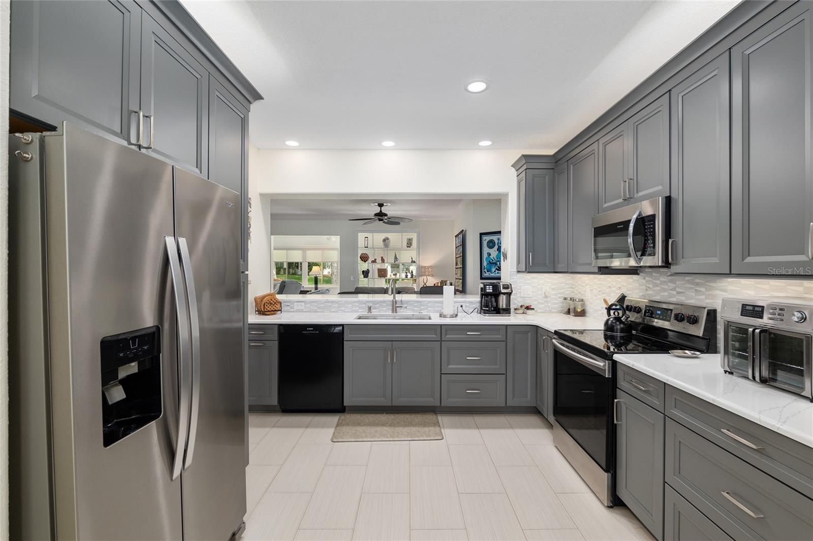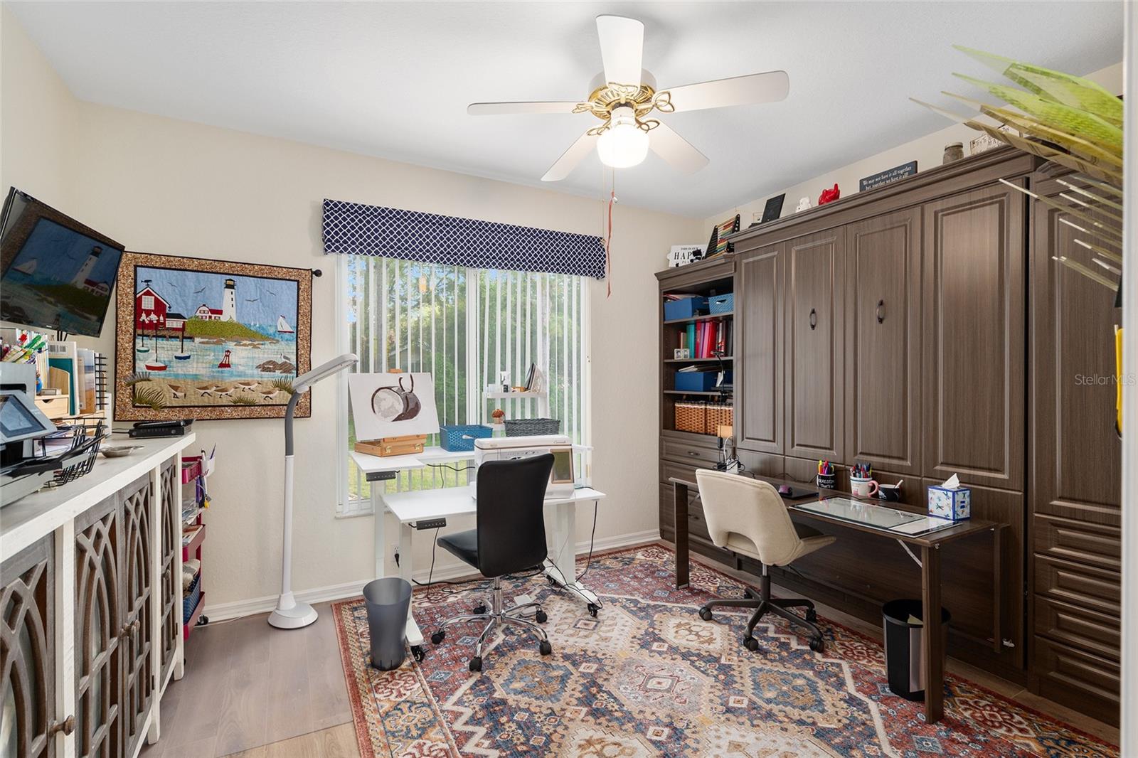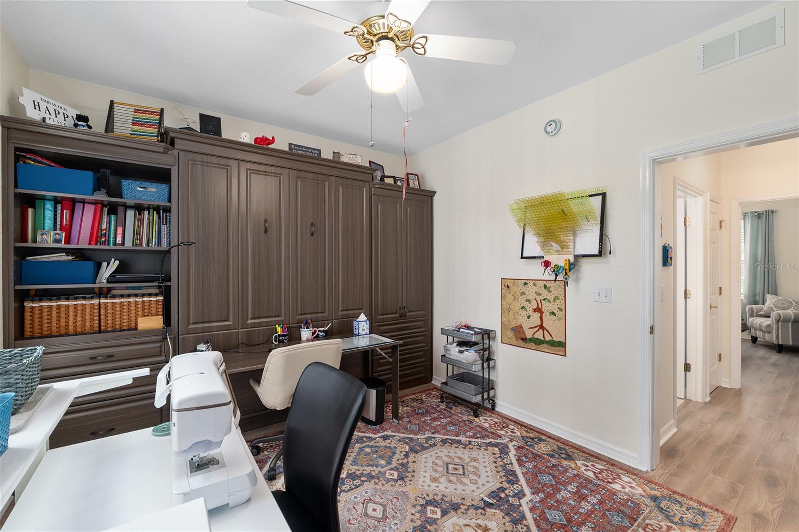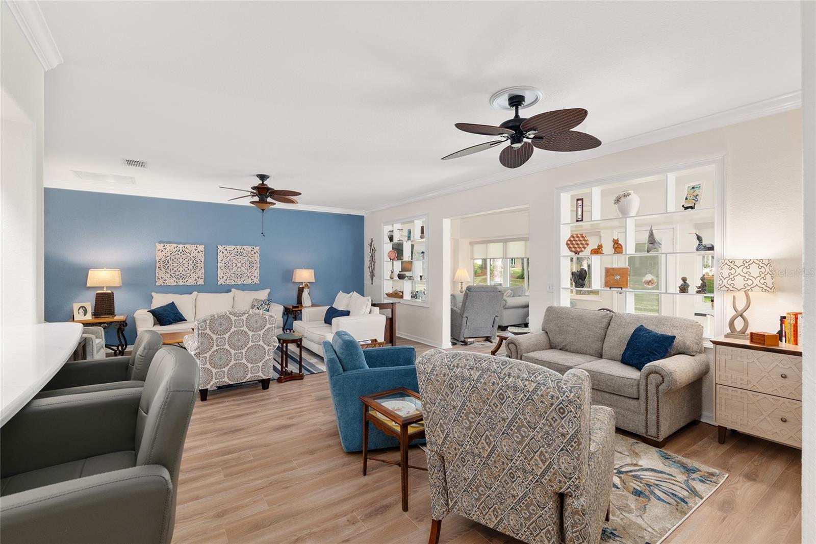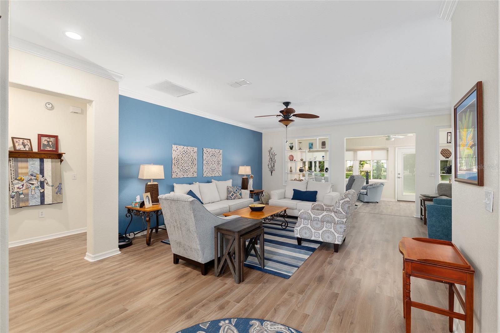 One-of-a-Kind Sanibel Model on Private Greenbelt – Must See! Welcome to this beautifully updated Sanibel model, perfectly situated on a serene greenbelt lot in the sought-after community of Del Webb Spruce Creek. This 2-bedroom, 2-bath home with a den has been thoughtfully remodeled with high-end finishes and a designer's touch. Step inside to find engineered wood flooring throughout, with custom tile in the bathrooms. The heart of the home is a gourmet kitchen, boasting quartz countertops, custom cabinetry with upgraded hardware, stainless steel appliances, and a stunning tile floor. Crown molding highlights the spacious living and dining area, which opens into a reimagined Florida Room—now under heat and air—with glass windows, a raised engineered wood floor that seamlessly flows from the great room, see-through walls, and a wide opening created by the removal of the former sliding glass doors. It’s the perfect space to relax or entertain year-roundThe den/studio features a custom Murphy bed with built-in shelving, providing flexible guest space when needed. The guest bathroom has been fully remodeled with a new custom vanity and flooring, ideally positioned between the second bedroom and den for privacy. The primary suite is located on the opposite side of the home, offering bay windows that frame tranquil views of the tall pines and greenbelt beyond. The utility room includes custom cabinets and a workspace, perfect for hobbies or organization. Enjoy a 27-foot extended garage with a remote-controlled screen, allowing fresh air to circulate while maintaining privacy. Outdoors, a large patio invites you to unwind, grill, enjoy cocktails, or read—all while soaking in peaceful greenbelt views. Recent updates include a new roof (2018) and HVAC system (2020). Del Webb Spruce Creek offers resort-style amenities including 36 holes of golf, 10 pickleball courts, tennis courts, three pools (including one indoors), and countless clubs and activities to suit every interest. This one-of-a-kind home won’t last long—schedule your private tour today!