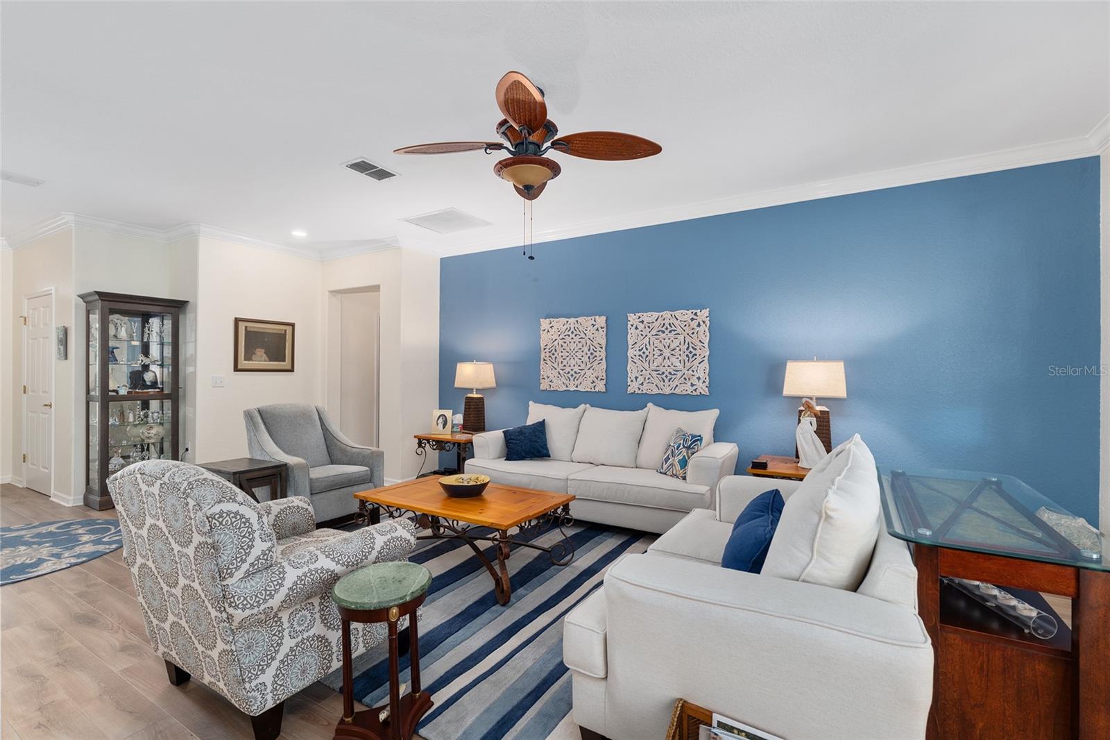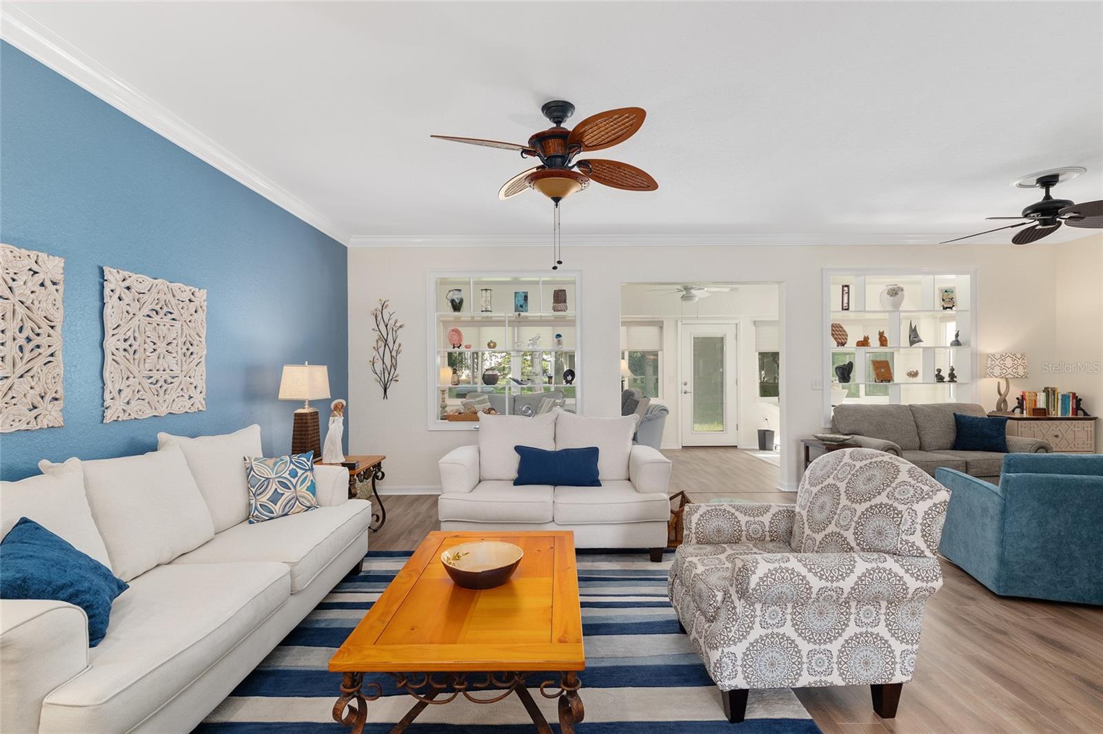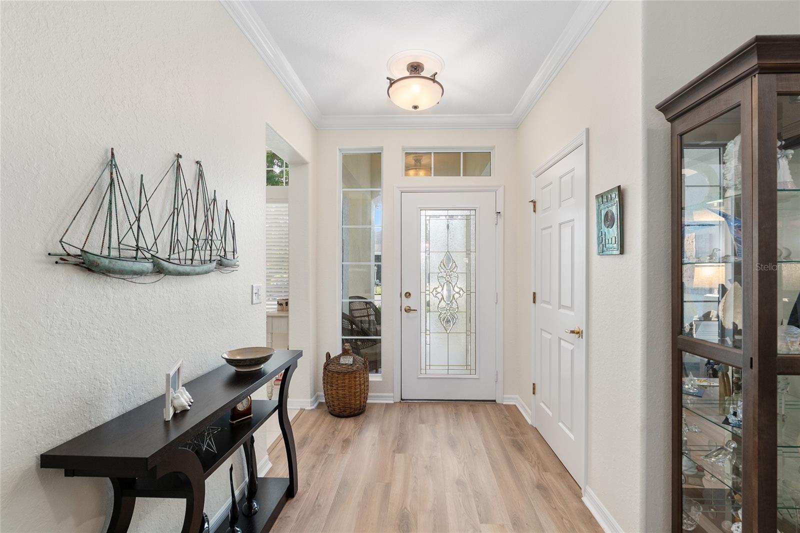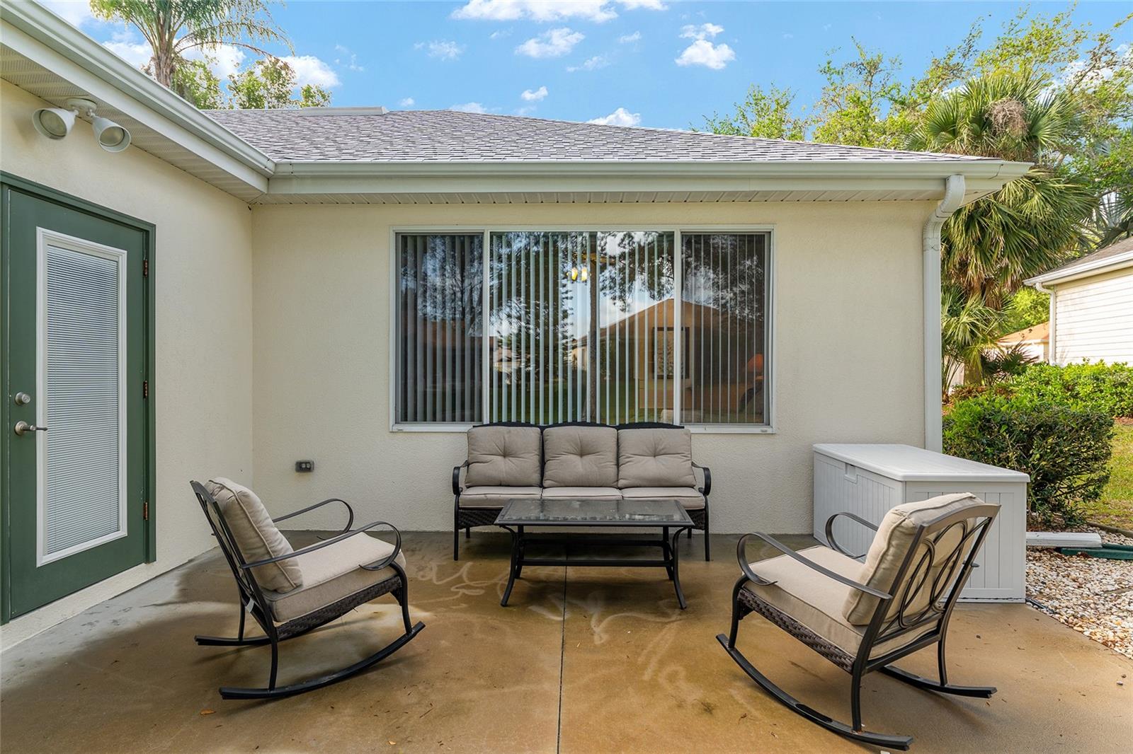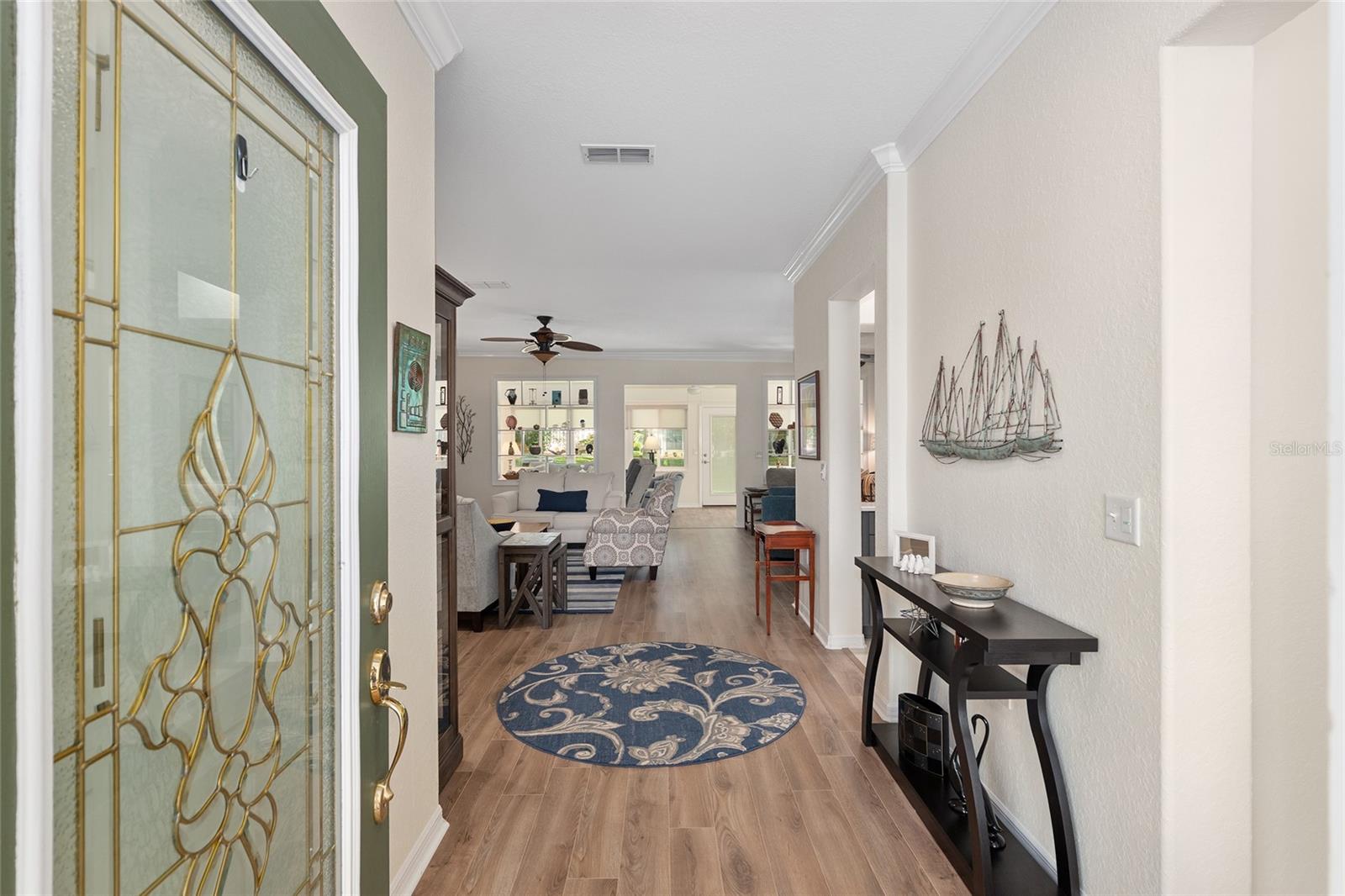 One-of-a-Kind Sanibel Model on Private Greenbelt – Must See! Welcome to this beautifully updated Sanibel model, perfectly situated on a serene greenbelt lot in the sought-after community of Del Webb Spruce Creek. This 2-bedroom, 2-bath home with a den has been thoughtfully remodeled with high-end finishes and a designer's touch. Step inside to find engineered wood flooring throughout, with custom tile in the bathrooms. The heart of the home is a gourmet kitchen, boasting quartz countertops, custom cabinetry with upgraded hardware, stainless steel appliances, and a stunning tile floor. Crown molding highlights the spacious living and dining area, which opens into a reimagined Florida Room—now under heat and air—with glass windows, a raised engineered wood floor that seamlessly flows from the great room, see-through walls, and a wide opening created by the removal of the former sliding glass doors. It’s the perfect space to relax or entertain year-roundThe den/studio features a custom Murphy bed with built-in shelving, providing flexible guest space when needed. The guest bathroom has been fully remodeled with a new custom vanity and flooring, ideally positioned between the second bedroom and den for privacy. The primary suite is located on the opposite side of the home, offering bay windows that frame tranquil views of the tall pines and greenbelt beyond. The utility room includes custom cabinets and a workspace, perfect for hobbies or organization. Enjoy a 27-foot extended garage with a remote-controlled screen, allowing fresh air to circulate while maintaining privacy. Outdoors, a large patio invites you to unwind, grill, enjoy cocktails, or read—all while soaking in peaceful greenbelt views. Recent updates include a new roof (2018) and HVAC system (2020). Del Webb Spruce Creek offers resort-style amenities including 36 holes of golf, 10 pickleball courts, tennis courts, three pools (including one indoors), and countless clubs and activities to suit every interest. This one-of-a-kind home won’t last long—schedule your private tour today!