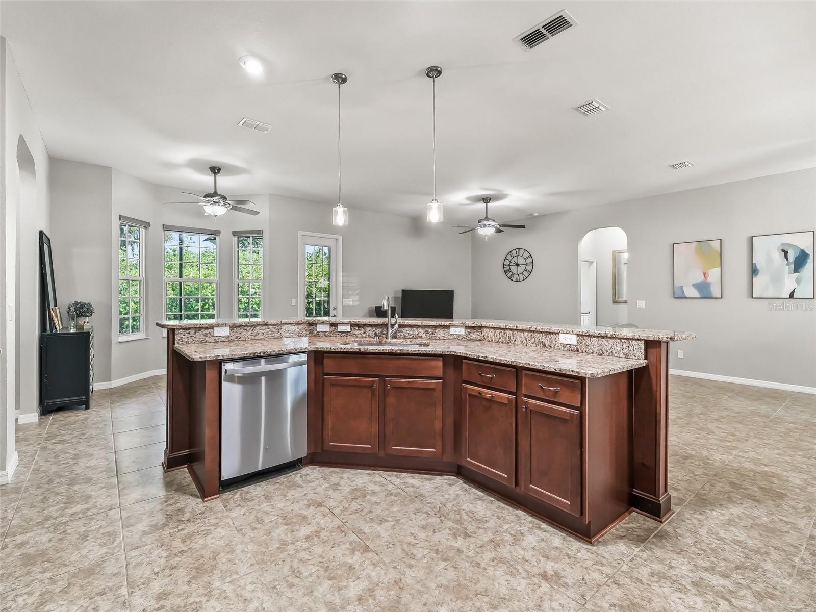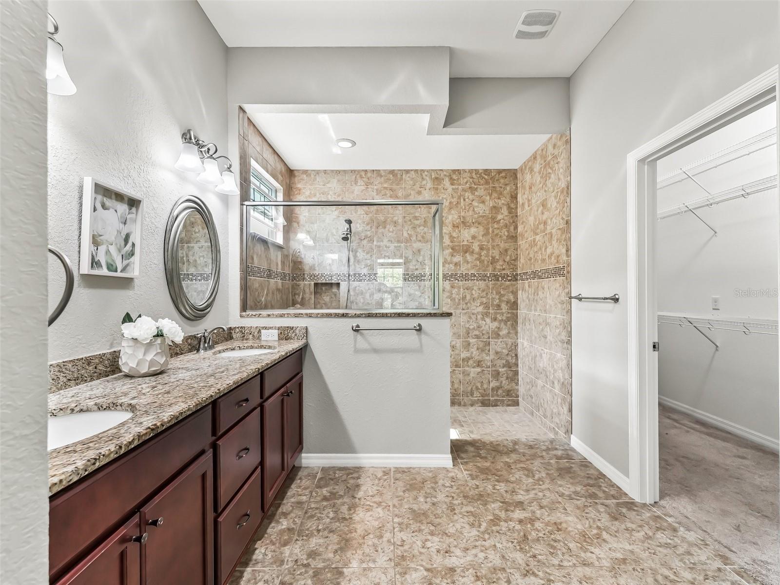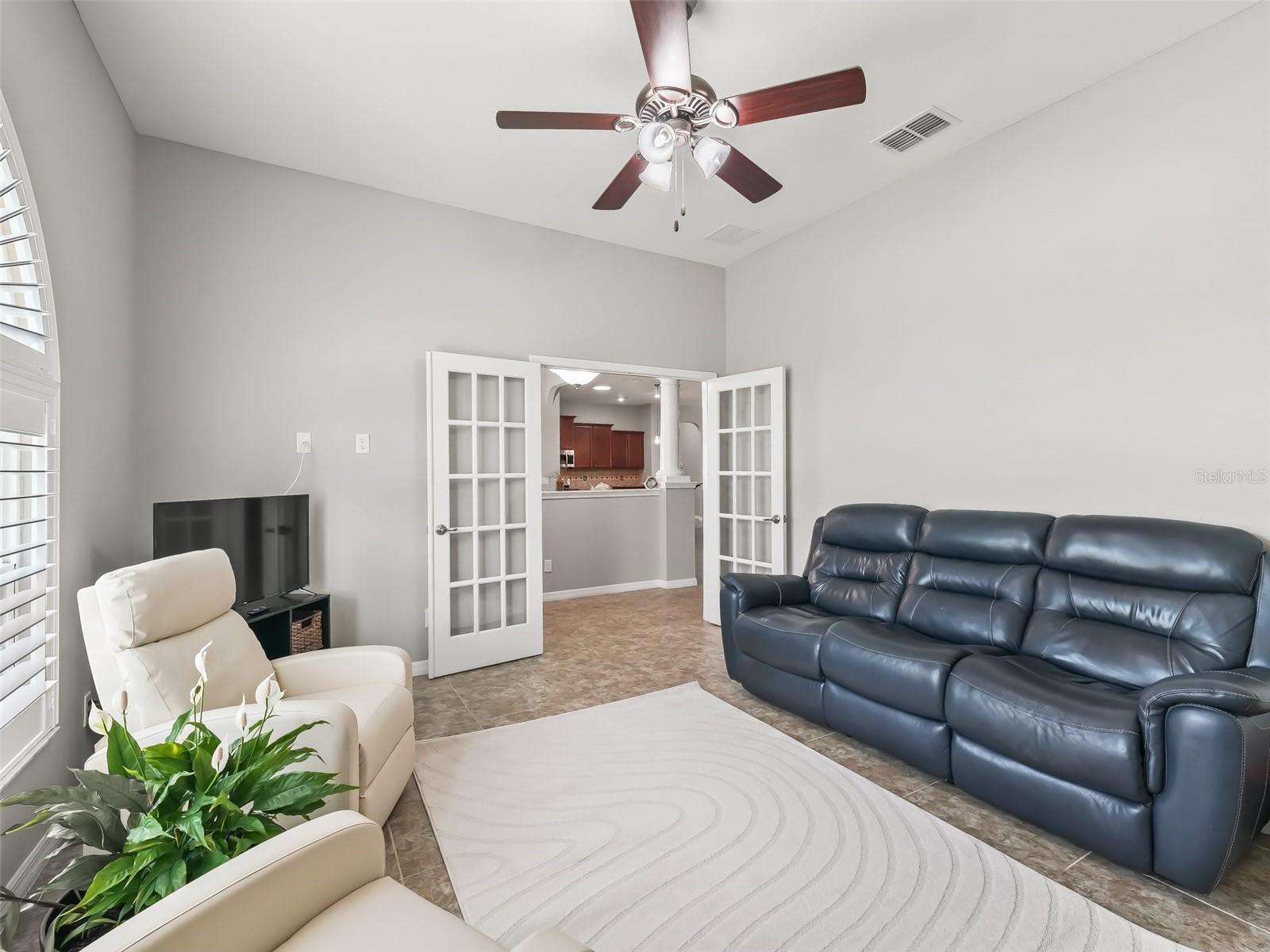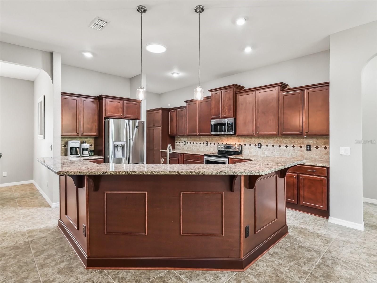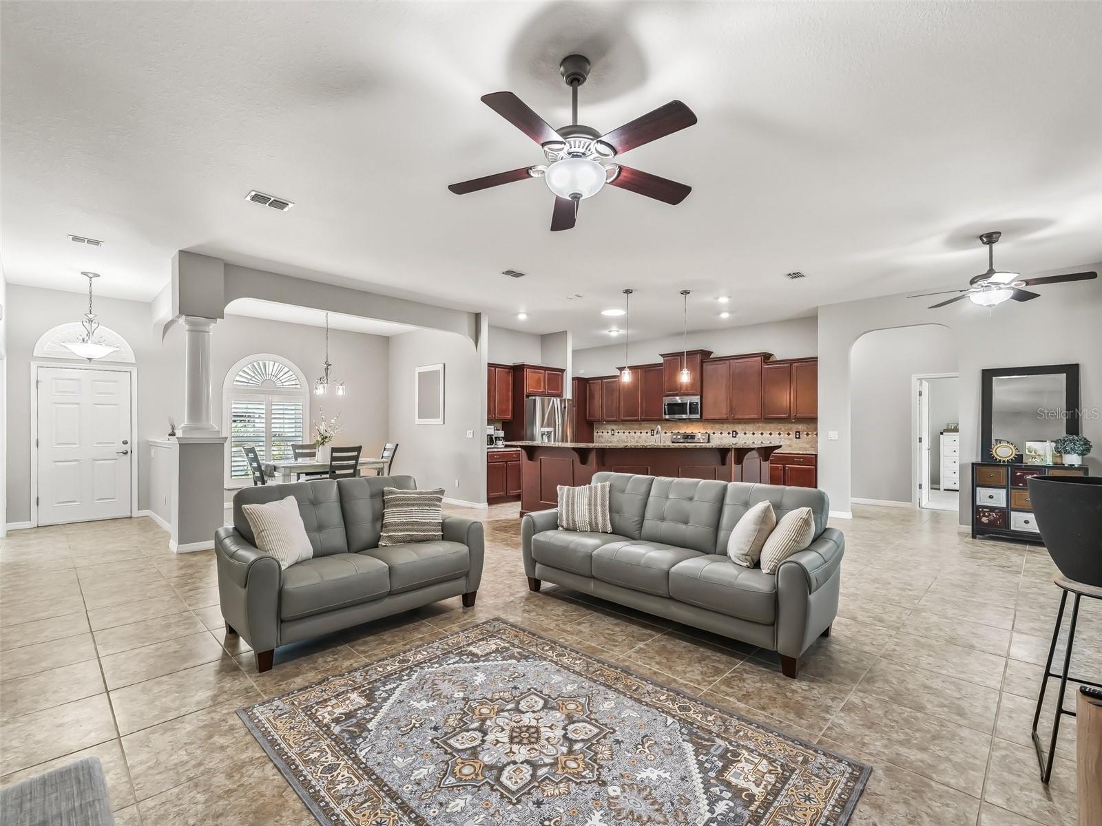 Welcome to Stonecrest – where neighbors become lifelong friends in a vibrant, active adult community! Please be aware of the entry/exit gate as you stop at the guard station and enter and exit the community. This beautifully upgraded CEDAR model home offers 3 bedrooms, 2 bathrooms, and a spacious den, ideally located in the sought-after NV II neighborhood. From the moment you arrive, the curb appeal and attention to detail will impress—this is one of the newer homes in the area and it shows. Step inside and fall in love with the open floor plan designed for both comfort and entertaining. Guests and extended family will appreciate the second primary suite complete with a walk-in closet, and your furry friends will enjoy the partially fenced backyard play area. The chef’s kitchen is a dream, featuring tall cabinets with roll-out shelves, pot drawers, a garbage receptacle cabinet, full-extension drawers, and a large granite breakfast bar—perfect for buffet-style serving. Recessed lighting and extra outlets add even more function to this beautiful space. This home is packed with energy-efficient features, including: Two solar, thermostat-controlled attic fans, Extra attic insulation throughout (including garage), Double-pane tinted windows, Solar tubes in kitchen and owner's suite, Tankless on-demand water heater with remote, Insulated garage doors. Additional upgrades include: Exterior painted 5/2025, Plantation shutters, water softener, gutters, utility sink, sealed/painted garage floor, and stone landscaping with a privacy hedgerow. The extended screened lanai (24.9’ x 9.3’) and 8’ x 12’ grilling patio make outdoor living a pleasure. Even the front post light is on a convenient wall timer. There is an active ring camera/video at the frt. door which will not convey at closing. Enjoy the oversized 2-car garage with golf cart bay, ideal for storage for all your things. Notice the extra storage racks. This gated, deed-restricted, golf community includes: 4 swimming pools (including an indoor saltwater pool & spa), Fitness center, Clubhouse with casual dining and entertainment, 18-hole championship golf course, Over 90 clubs & activities, Pickleball courts and softball field, Golf cart access to shopping and more. Today could be the start of your best chapter yet. If you’re seeking a luxury, energy-efficient home in a private, amenity-rich community, welcome to your new lifestyle—welcome to Stonecrest!