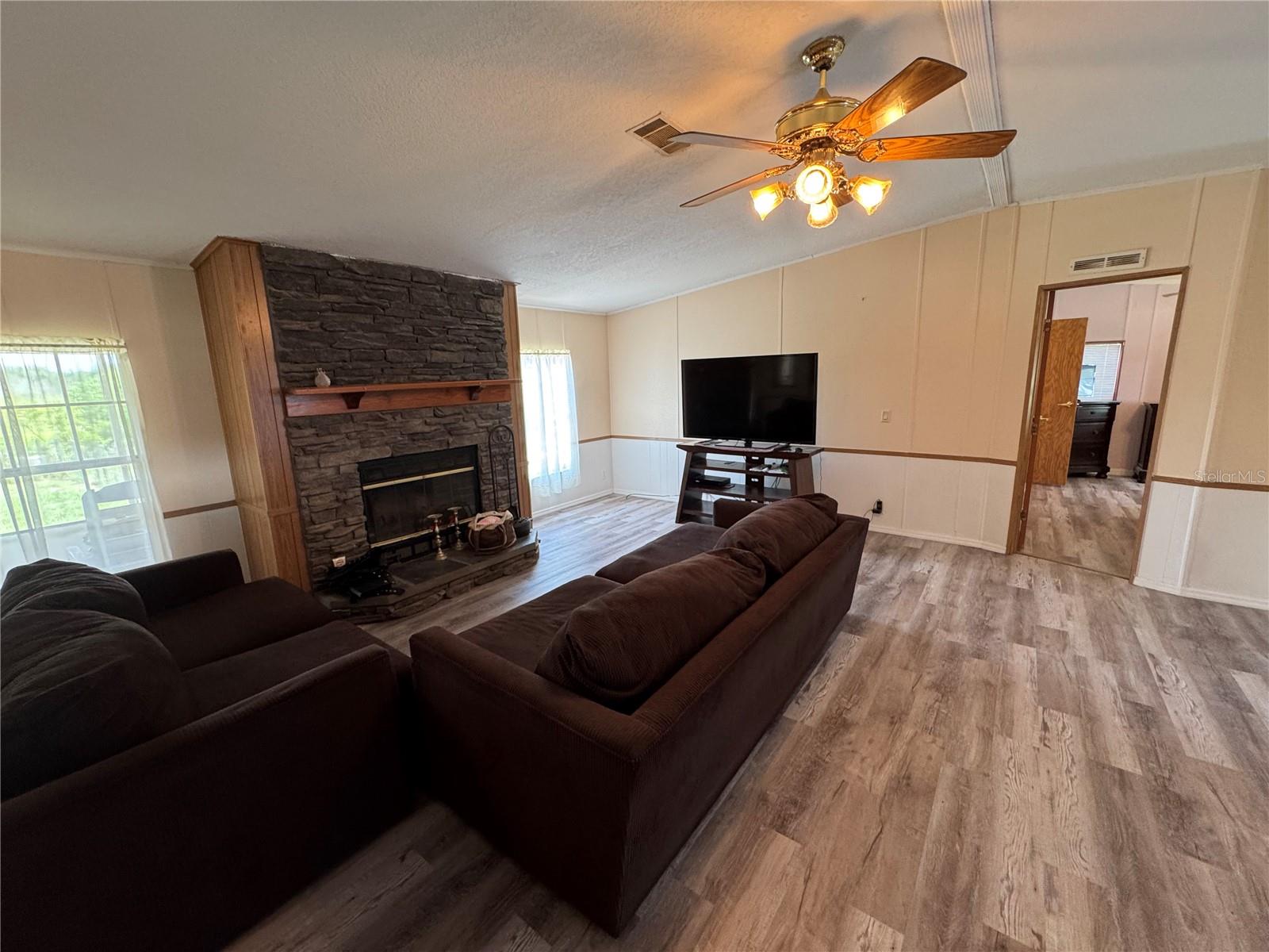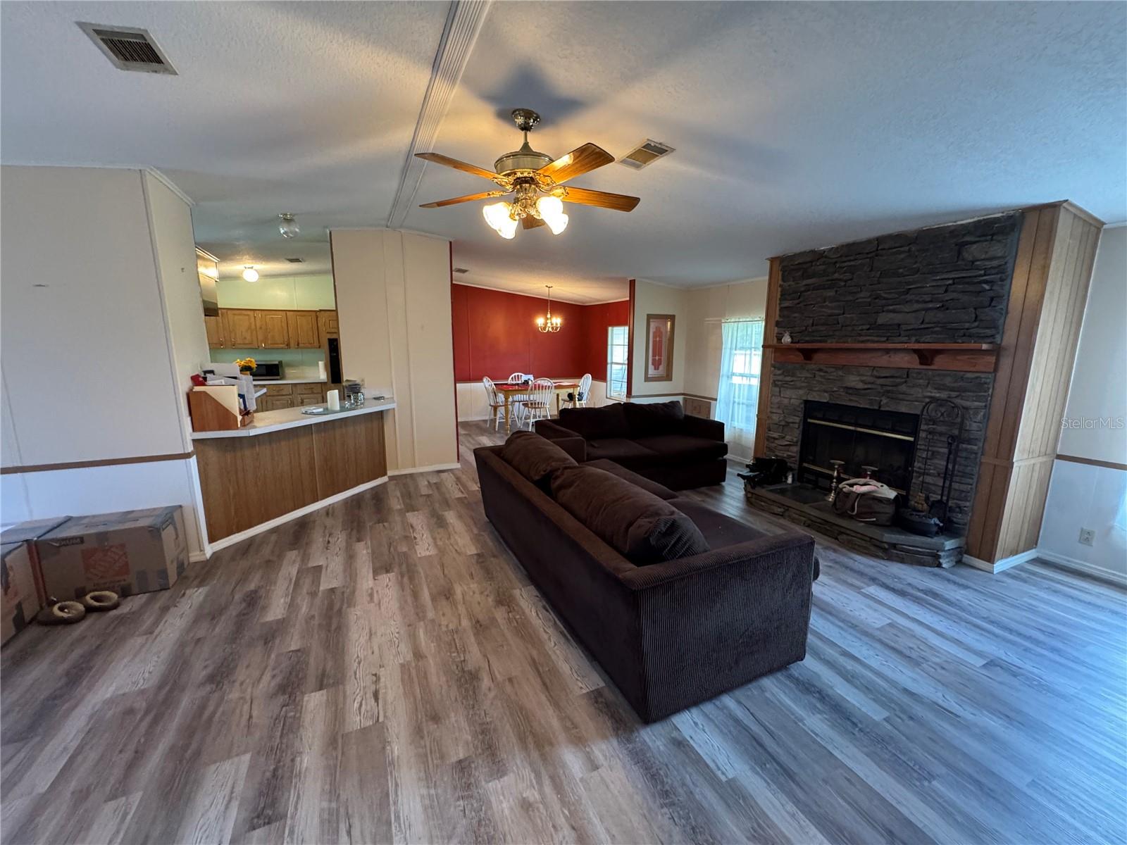 Experience the ultimate in waterfront living and discover all that Lake Weir has to offer. Presenting a spacious 3/2 split floor plan mobile home with 1835 living SF, wood burning fireplace, and a expansive screened-in Florida room providing breathtaking views of the lake, serene sounds of nature and stunning sunsets. Recent upgrades include a full roof replacement, new subfloors, luxury vinyl plank flooring and up to date tiedowns. The primary bedroom boasts a large walk-in closet, dual sinks, garden tub, and standalone shower. Bedroom 2 features an additional 12x10 bonus room with spectacular views of the lake, ideal for a workspace or playroom. The boat dock, although in need of repair, offers endless possibilities. Lake Weir provides two public boat ramps and two waterfront restaurants. Schedule your private showing today.