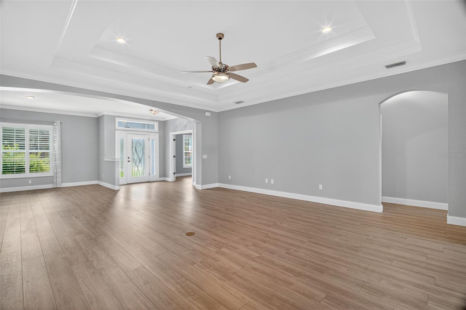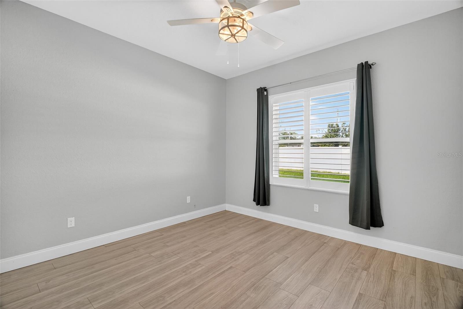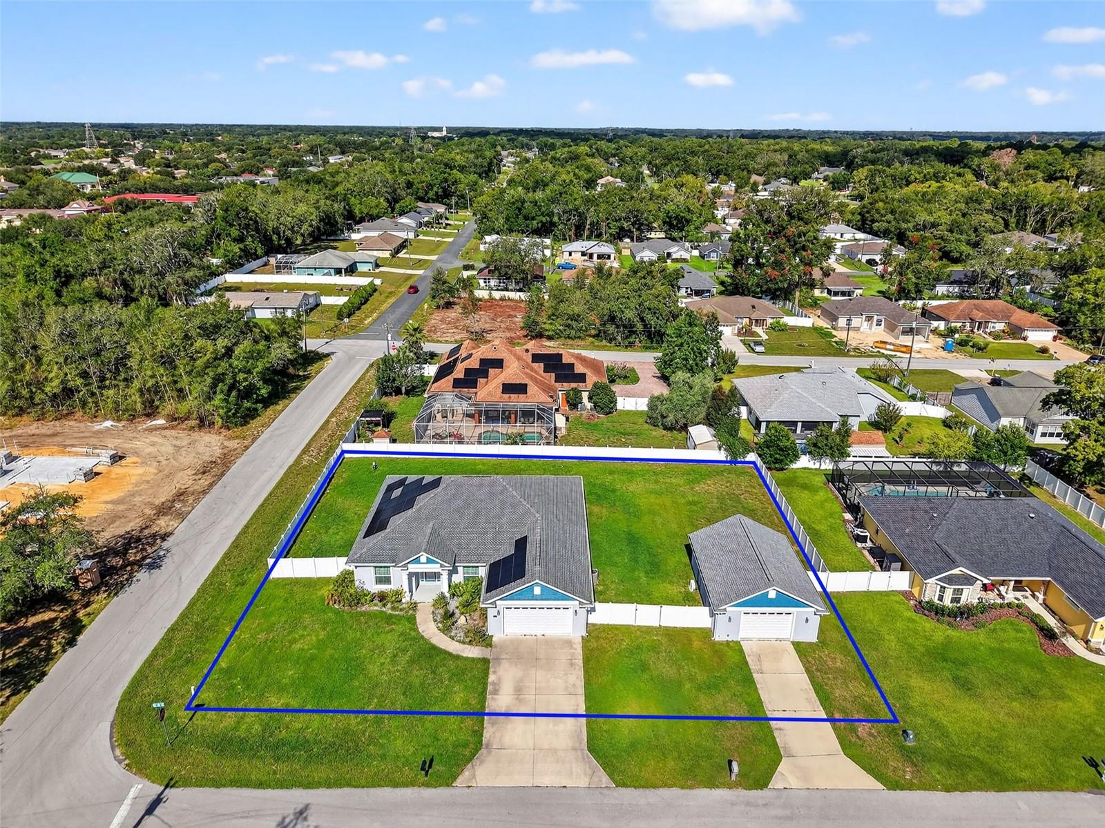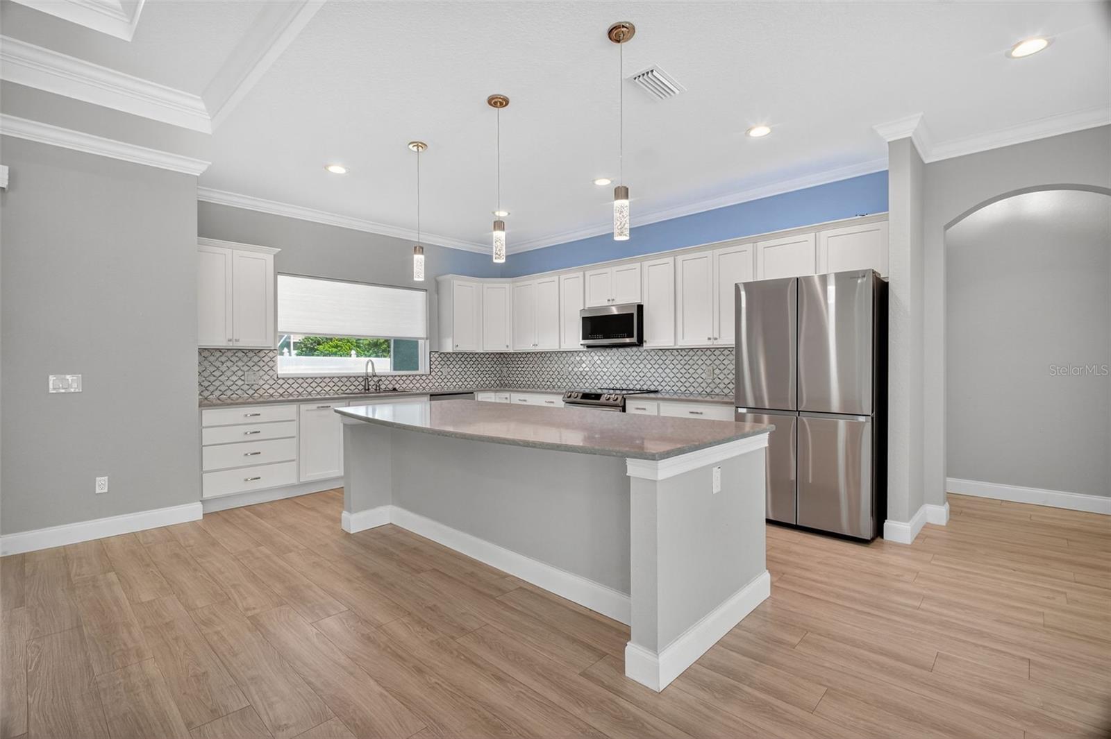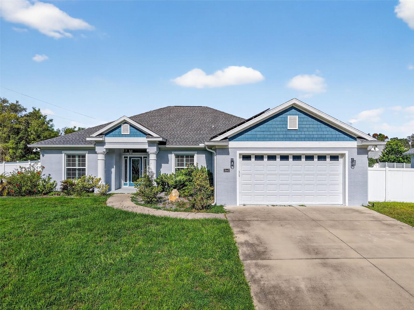 The property features a spacious 3-bedroom, 2-bathroom layout with a 2-car attached garage and an impressive air-conditioned 4-car detached garage and workshop. High ceilings, crown molding, and plantation shutters set a tone of sophistication throughout. The open-concept living, dining, and kitchen areas are ideal for entertaining, while the split-bedroom floor plan ensures privacy. In addition to the three bedrooms, there is a dedicated office, perfect for remote work or a quiet space to focus.The gourmet kitchen boasts quartz countertops, a large island, and an elegant backsplash with Carrera marble and mother-of-pearl accents. Modern laminate plank floors flow throughout the home, and the serene main suite features custom mermaid detailing in the bath, highlighting the property's unique charm. The spacious indoor laundry room adds convenience and ample storage. For hobbyists or those in need of a serious workspace, the detached 4-car garage is a dream come true, with air conditioning and 100-amp service. This home also includes recently added solar panels, providing significant energy efficiency and savings.The main house has 200-amp service, with an additional 50-amp service available for a future pool or other projects. The back of the home features a dedicated 20-amp service for patio or pool lights, perfect for evening gatherings. The expansive yard is fully fenced with vinyl fencing. This home is located in a quiet neighborhood with no HOA, just minutes from The Villages, local restaurants, and shopping. With its extensive list of custom upgrades, this property truly stands out. Schedule a private tour today and experience the quality and elegance this home has to offer.