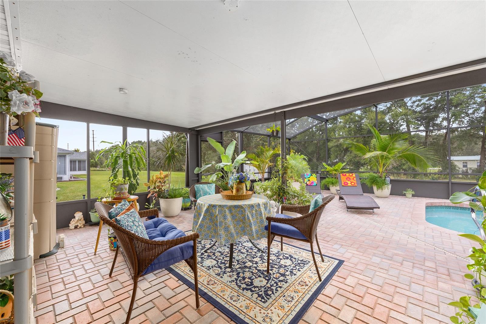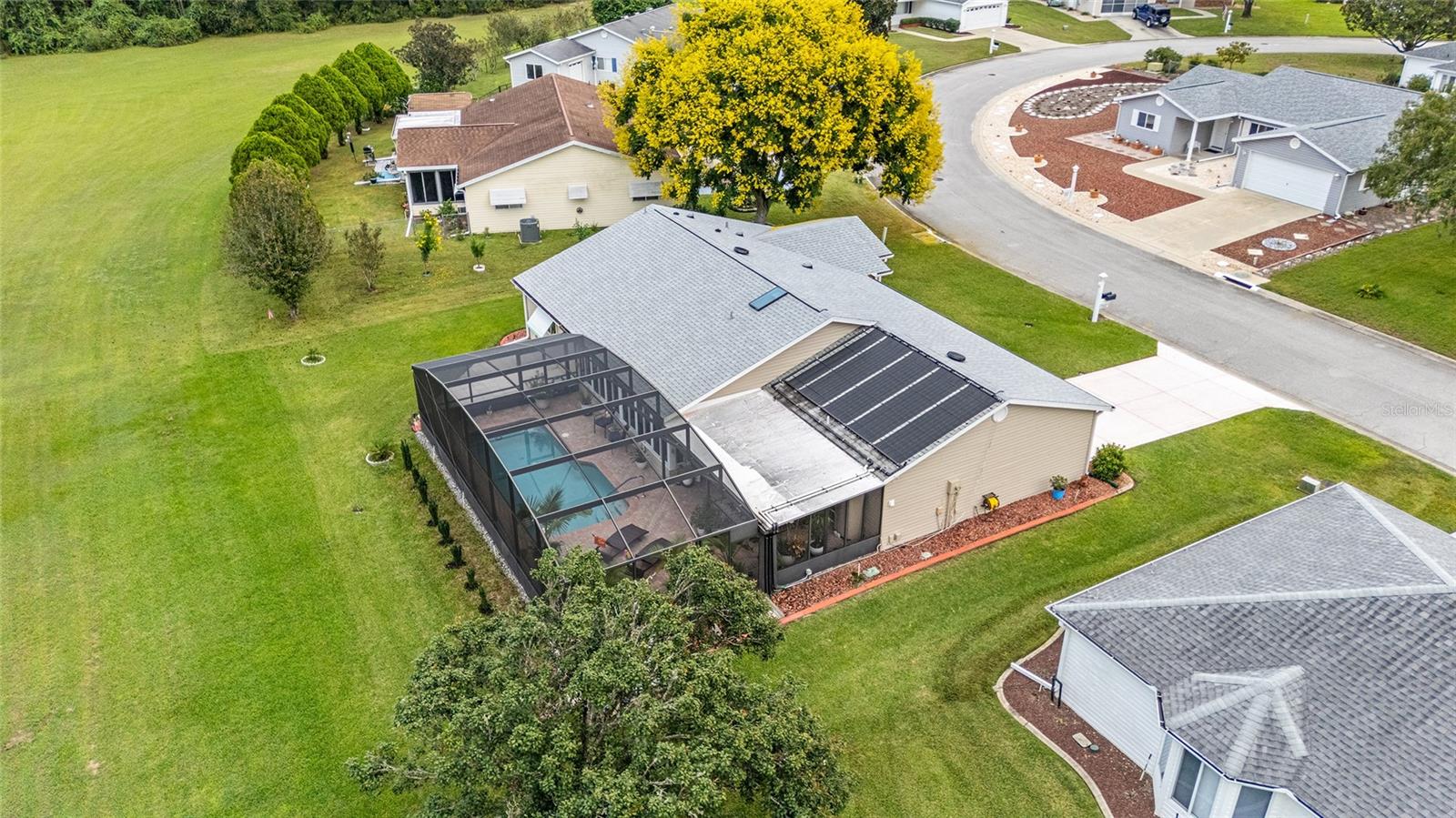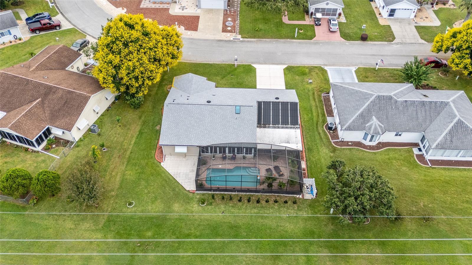 FLORIDA PARADISE AT ITS BEST! THIS 2-BEDROOM, 2-BATHROOM, SALTWATER POOL HOME WELCOMES YOU! Located just 1 mile from The Villages ®, in the sought-after 55+ Spruce Creek South community offers perfect blend of comfort, convenience & Florida living. The elegant crystal windowed Front Door invites you into the Entry Area showcasing luxury vinyl floors that flow seamlessly throughout the home. The Entry opens into a spacious Living room with vaulted ceiling, ample space to accommodate large furniture, oversized window brings in ample light with a 4-light ceiling fan adds to extra comfort. The living room flows into a specious Dining room with ample wall space, vaulted ceiling and bright 6-1-light chandelier. Beautiful Eat-in Kitchen has generous counter space and cabinets, custom pantry with pull-out drawers, Whirlpool appliances, double sink, skylight with ceiling fan and light. The Florida room opens to a stunning outdoor retreat with a large covered Lanai, Birdcage, and a SOLAR HEATED, SALTWATER IN-GROUND POOL overlooking a private backyard with no rear neighbor. The pool area is paved with beautiful pink bricks. The Florida room under air, with acrylic windows, and tile flooring, perfect for relaxing with your morning coffee, or as game room, or accommodate guests. The bright 2-fan lights may easily convert it into an art-crafts room. The speciose Primary Suite features a window to the backyard, large shirt closet, ceiling fan, en-suite bathroom (Resurfaced in December 2025) with step-in tiled shower with double rain glass doors (2025), solar tube/exhaust fan (2024), single sink with large mirror, and 2-walk-in closets (clothing/utility). The Guest bedroom is also nice size with 2 windows, ceiling fan, and walk-in closet. Both bathrooms completely resurfaced. Guest Bathroom features 1 sink with large mirror, walk-in resurfaced shower (2025) with double rain glass doors (2025), solar tube (2024), and exhaust fan (2025). The Garage houses the Washer and Dryer (2025), Sink, Water Heater, Wall Cabinets and Shelves, Overhead Storage Rack, Attic has R38 sprayed insulation, attic pulldown for extra storage, and 2-Ceiling Fans with Lights. The Garage Door (2025) has 2-remote openers, and screen outside doors. The Outside has long Custom Painted Driveway, Street Light, house lights (2024) and the Mailbox. The landscaping has been meticulously maintained all around the house. New double pane windows installed by Window World, New awnings and shutters by Whyte Aluminum, 25 commercial white roof above the lanai. This beautifully updated home offers Country Club living with the convenience of nearby shopping, dining, VA and medical facilities, all accessible by golf cart. Spruce Creek South offers resort style amenities, including: 24/7 guard house, Restaurant, Clubhouse with fitness center, RV Storage, his/her sauna, card game room, art/crafts room, library, billiard room, kitchen, entertainment center with stage, outdoor picnic area with pool and jacuzzi, 18-hole golf course, Volleyball/Pickleball/Tennis courts, Shuffle Board, Softball field, Gated storage for RVs and extra vehicles (at low cost), Dog park, Dozens of Clubs and Social events, and more to enjoy year-round. Roof(2024), Vinyl Siding (2024), Gutters, Leafguard & Downspouts(2024). All Pool equipment including solar heat panel(2023), Birdcage(2022), additional insulation (2024).