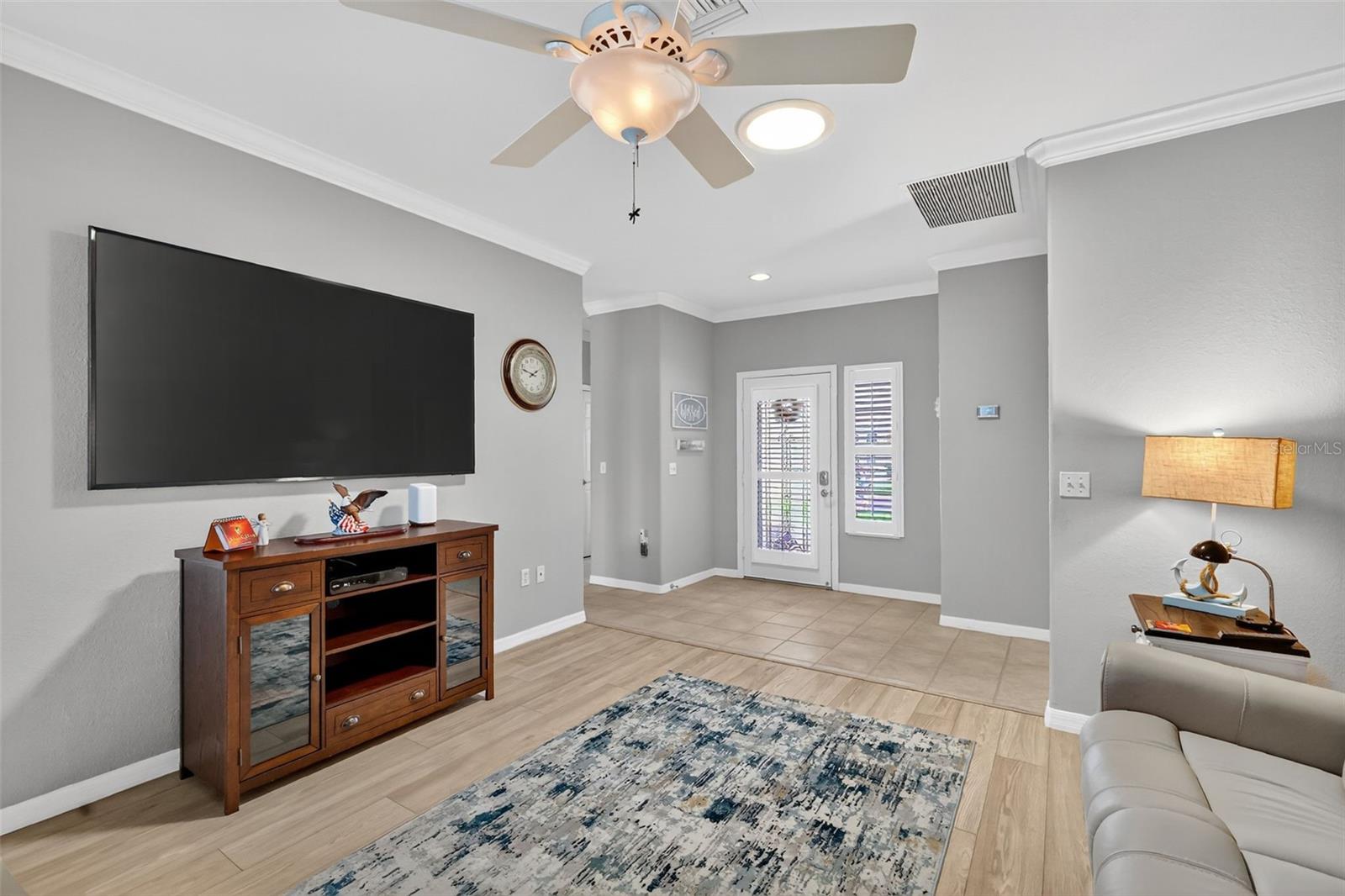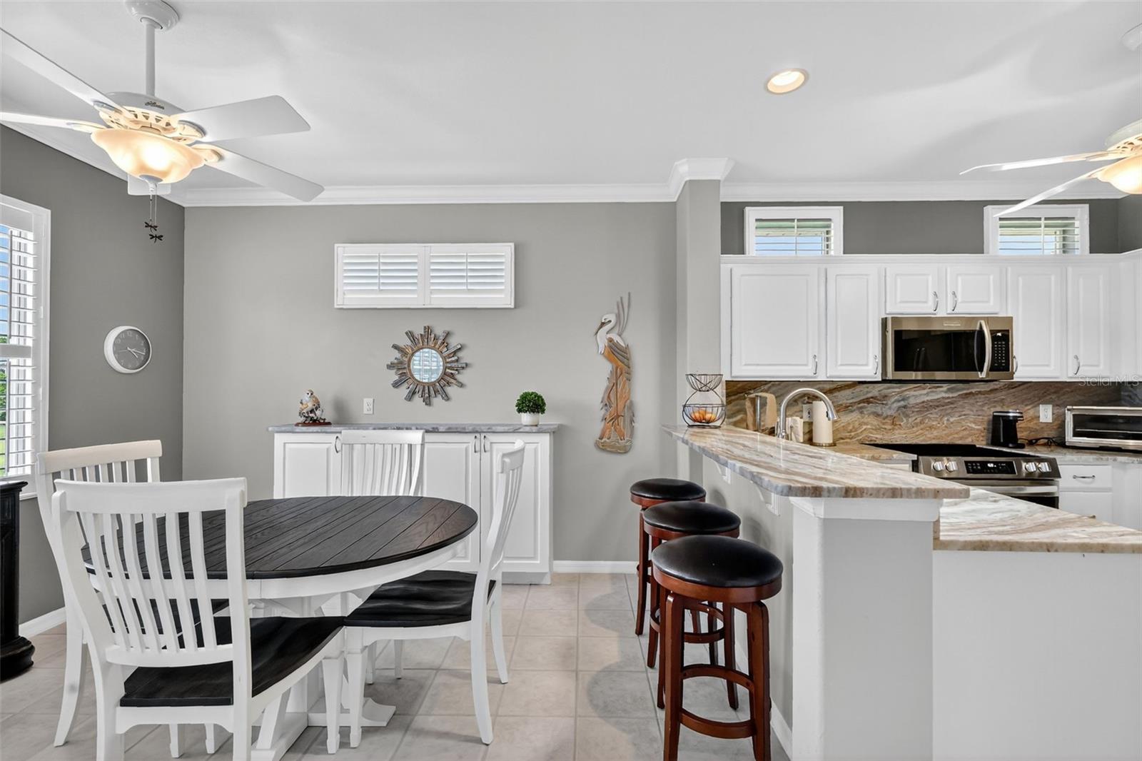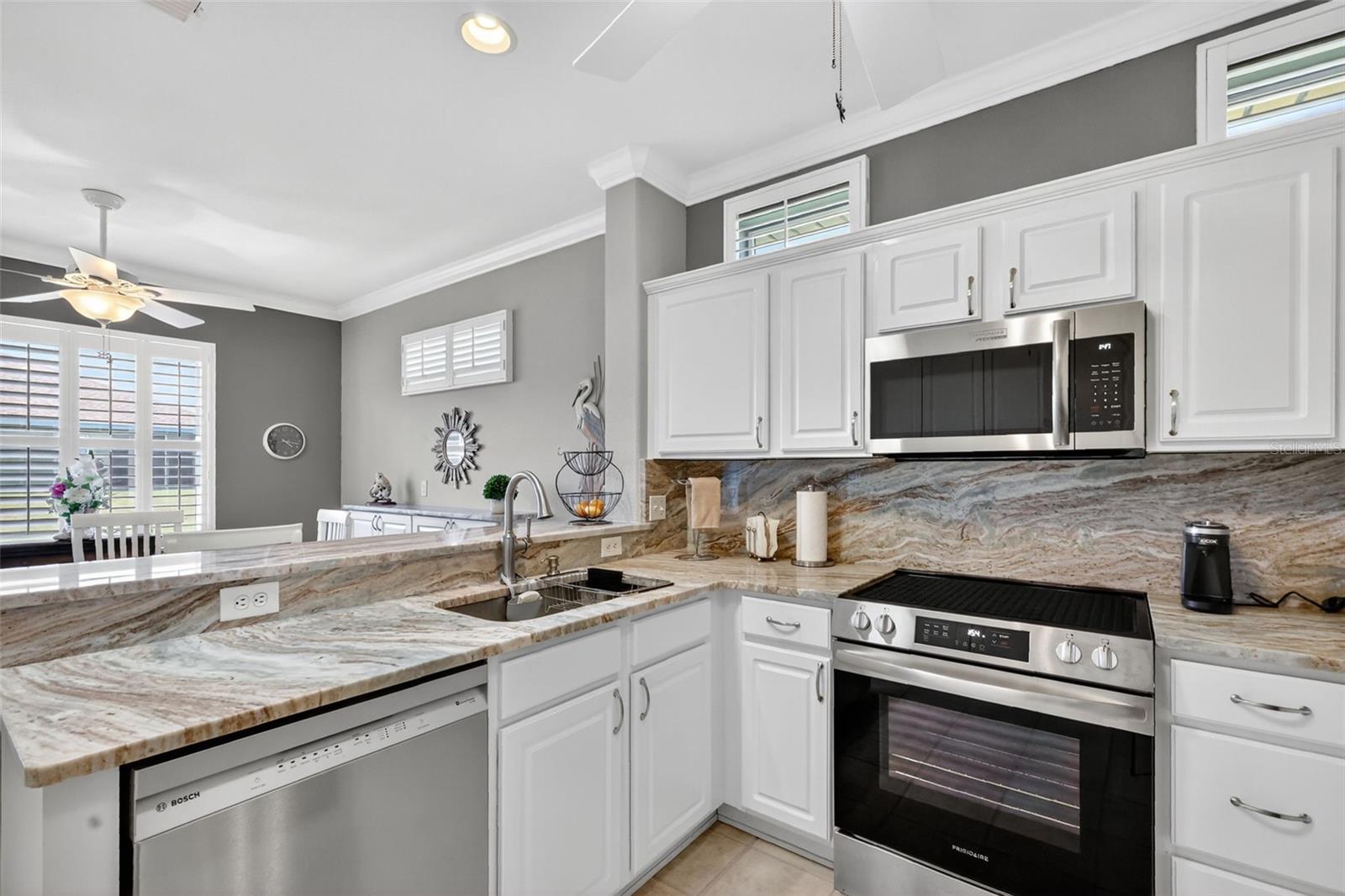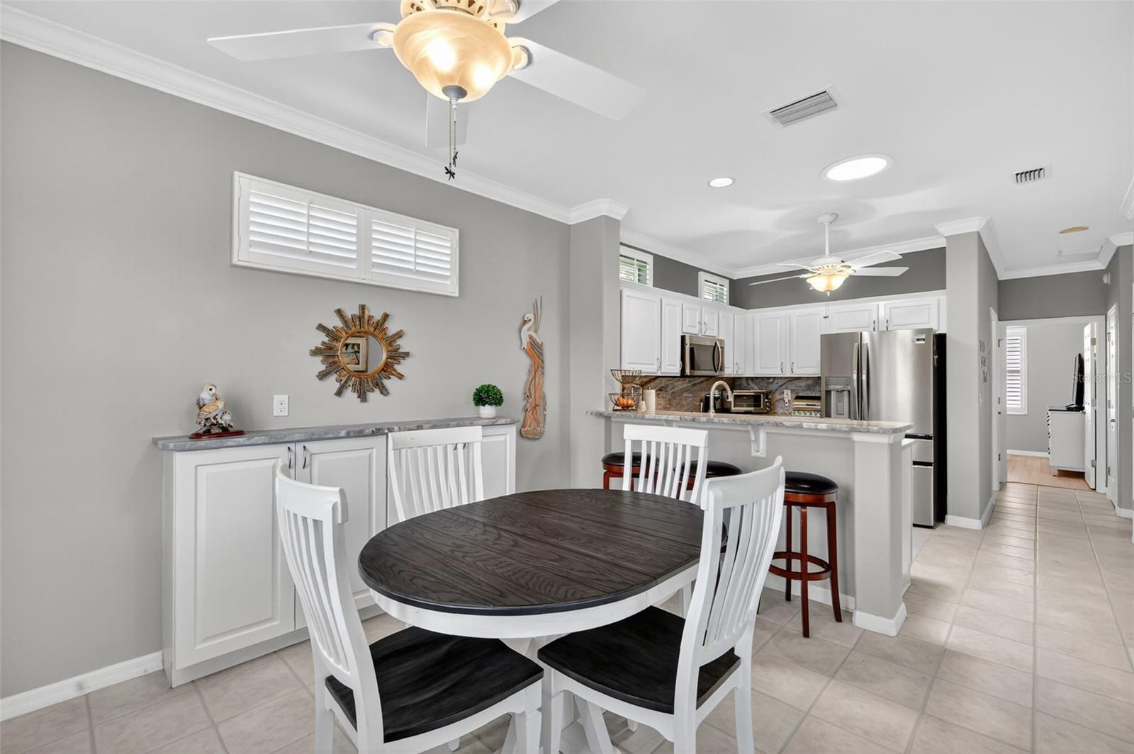 This TURNKEY updated, furnished 2-bedroom, 2-bathroom home is truly inviting. As you approach the residence, you will appreciate the mature landscaping, epoxy driveway and walkway, as well as the landscape curbing complemented by rock beds. Upon entering the home, you will be captivated by its modern charm, highlighted by the glass front door leading to a tiled entryway. The living room is filled with natural light from the windows, a solar tube, and a fan/light combination, connecting to the updated kitchen. This kitchen boasts granite countertops, newer stainless-steel appliances, recessed cabinets, and a pantry. The dining area provides an excellent space for entertaining guests. The owner's suite is a welcoming retreat featuring LVP flooring, a walk-in closet, and an ensuite bathroom equipped with custom mirrors, double sinks, and glass doors leading to a step-in shower with a seat. The guest bedroom also offers a spacious layout with LVP flooring and a fan/light combination with convenient access to updated guest bathroom. The glass enclosed lanai, complete with air conditioning, serves as a versatile space for various uses. The backyard is equally impressive, featuring a pavered sitting area adorned with an umbrella and outdoor furniture, creating an ideal setting for relaxation and enjoyment. Several additional enhancements have been made, including crown molding, plantation shutters, an upgraded air conditioning controller, a new irrigation system that provides control over the B Hive sprinkler, and the installation of more economical sprinkler heads. Del Webb Spruce Creek is a gated 55+ community offering an active lifestyle. Community offers clubhouse with recreation including a swimming pool, fitness room, billiards, pickleball courts, softball clubs, and more. Whether you’re looking for a winter retreat or a home to enjoy year-round, this could be the perfect fit! Quick close possible—ask how to make this home yours today!