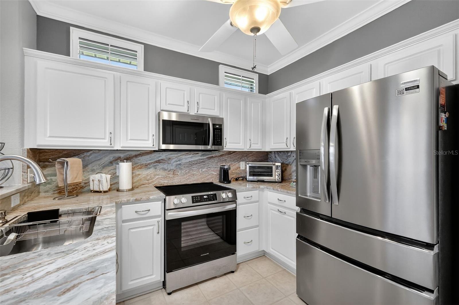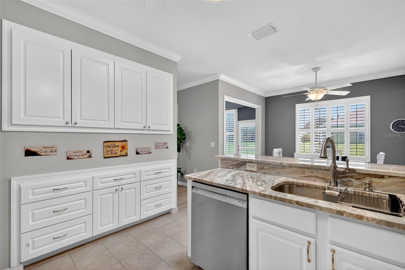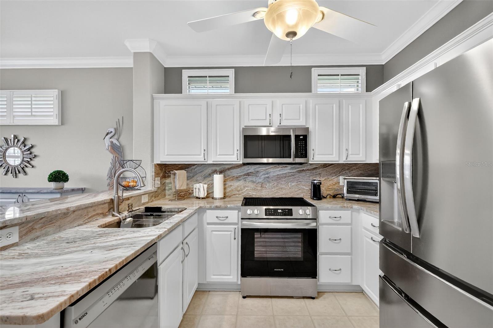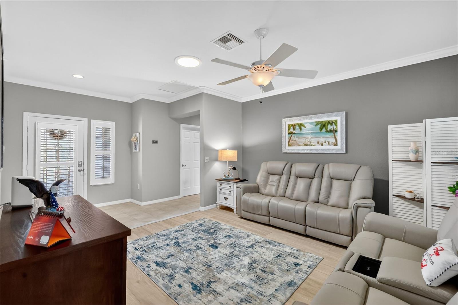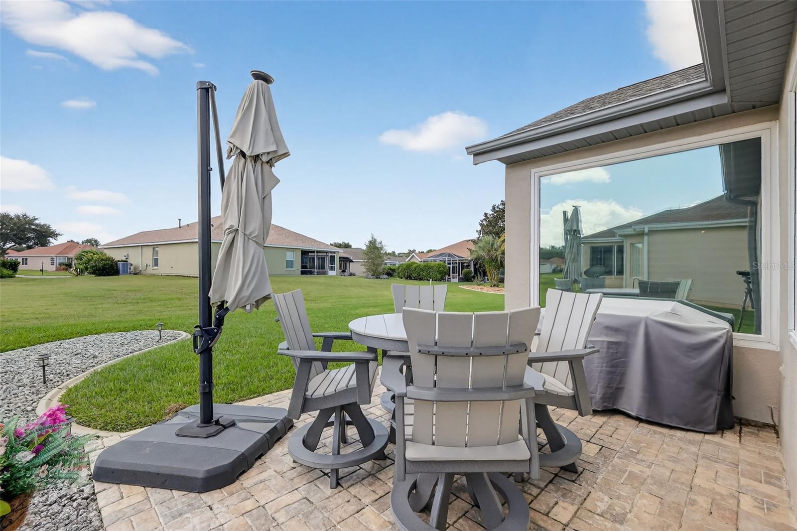 This TURNKEY updated, furnished 2-bedroom, 2-bathroom home is truly inviting. As you approach the residence, you will appreciate the mature landscaping, epoxy driveway and walkway, as well as the landscape curbing complemented by rock beds. Upon entering the home, you will be captivated by its modern charm, highlighted by the glass front door leading to a tiled entryway. The living room is filled with natural light from the windows, a solar tube, and a fan/light combination, connecting to the updated kitchen. This kitchen boasts granite countertops, newer stainless-steel appliances, recessed cabinets, and a pantry. The dining area provides an excellent space for entertaining guests. The owner's suite is a welcoming retreat featuring LVP flooring, a walk-in closet, and an ensuite bathroom equipped with custom mirrors, double sinks, and glass doors leading to a step-in shower with a seat. The guest bedroom also offers a spacious layout with LVP flooring and a fan/light combination with convenient access to updated guest bathroom. The glass enclosed lanai, complete with air conditioning, serves as a versatile space for various uses. The backyard is equally impressive, featuring a pavered sitting area adorned with an umbrella and outdoor furniture, creating an ideal setting for relaxation and enjoyment. Several additional enhancements have been made, including crown molding, plantation shutters, an upgraded air conditioning controller, a new irrigation system that provides control over the B Hive sprinkler, and the installation of more economical sprinkler heads. Del Webb Spruce Creek is a gated 55+ community offering an active lifestyle. Community offers clubhouse with recreation including a swimming pool, fitness room, billiards, pickleball courts, softball clubs, and more. Whether you’re looking for a winter retreat or a home to enjoy year-round, this could be the perfect fit! Quick close possible—ask how to make this home yours today!