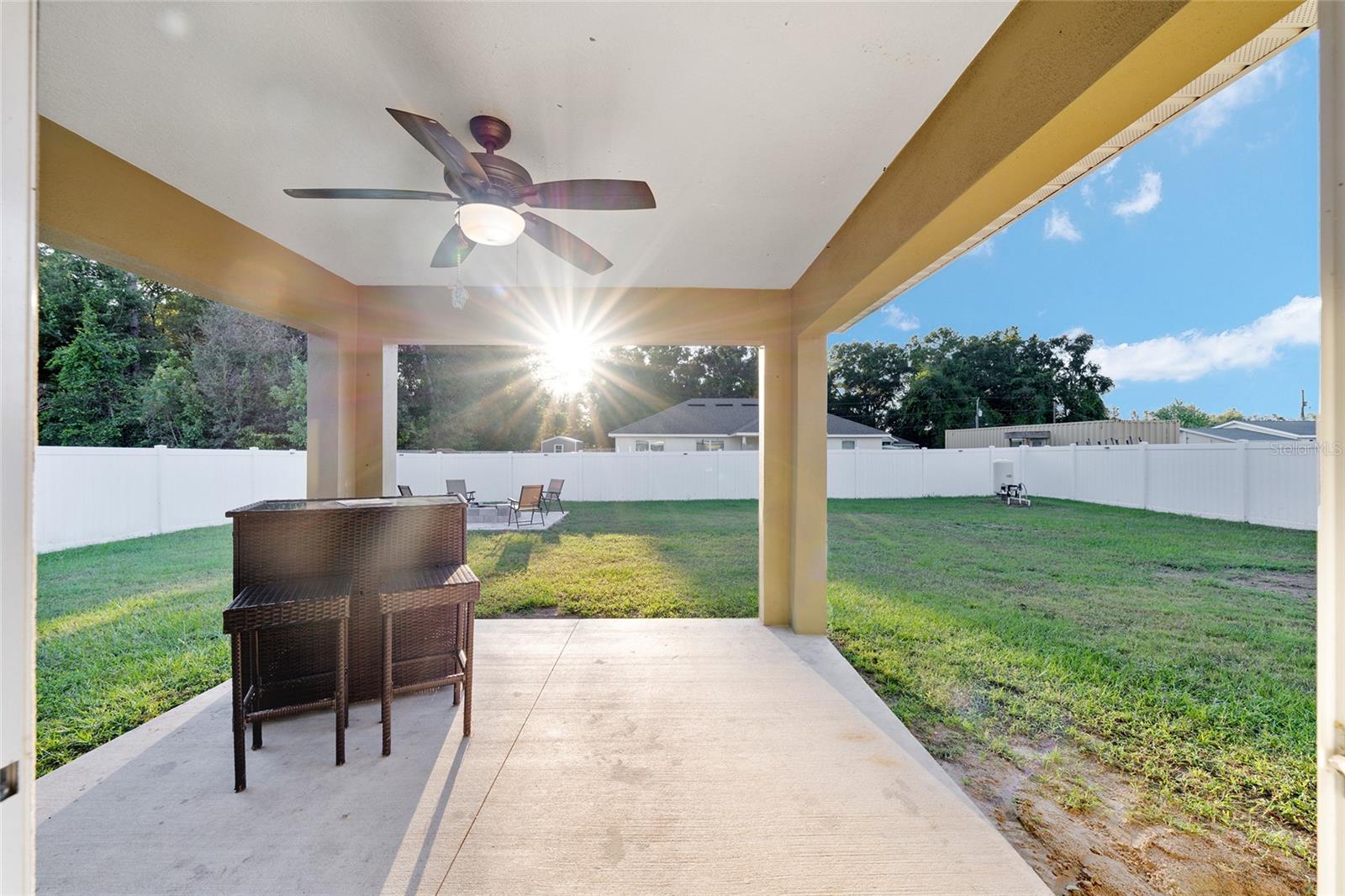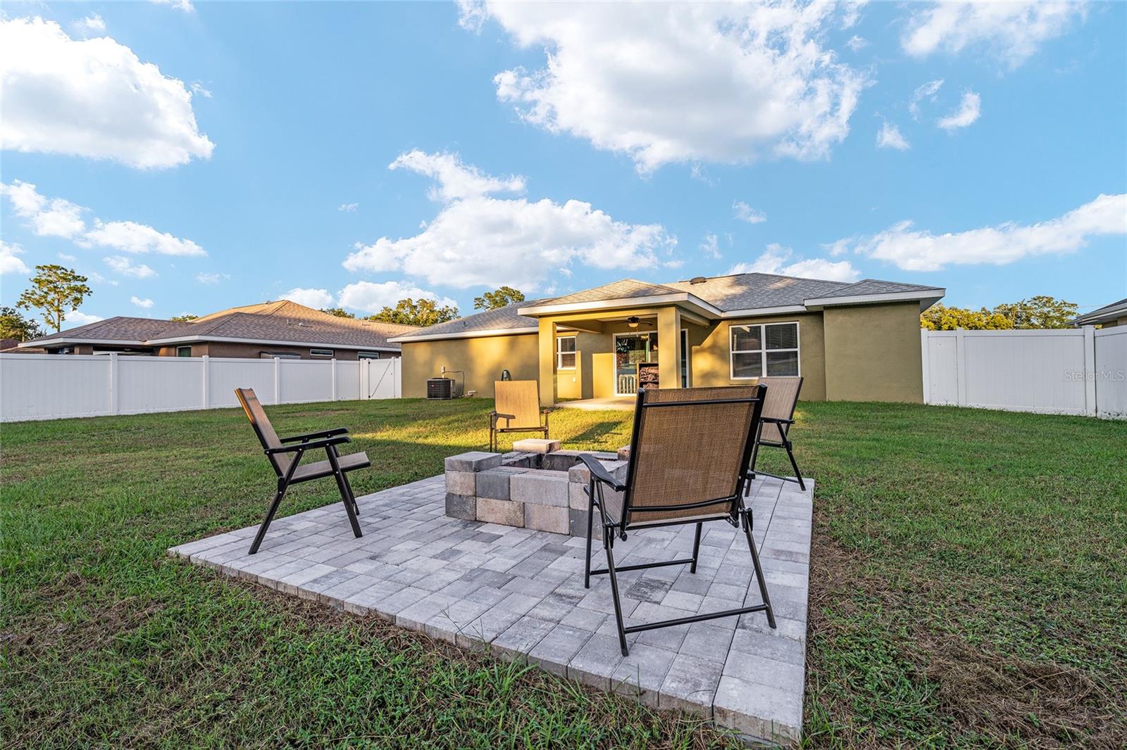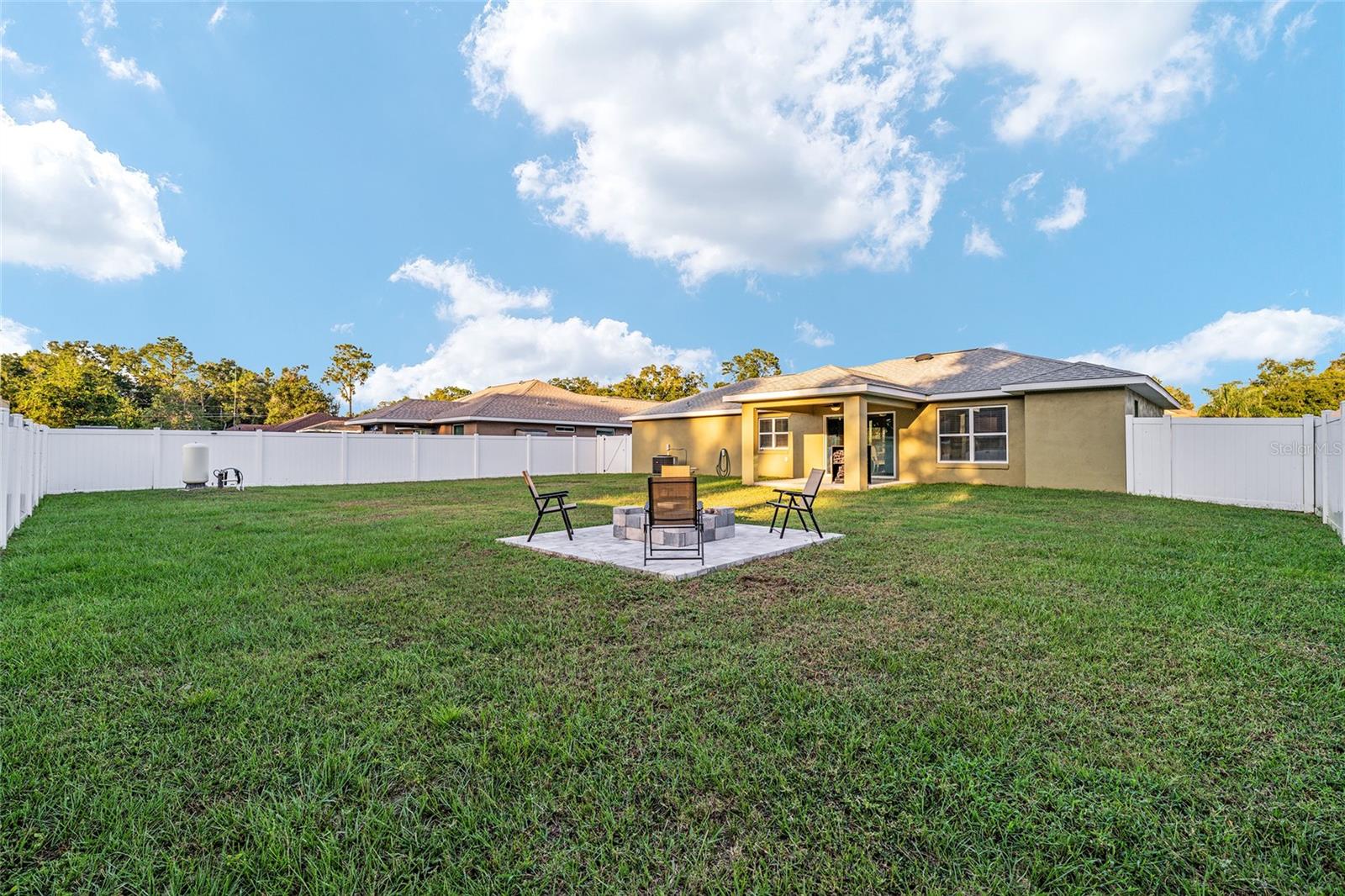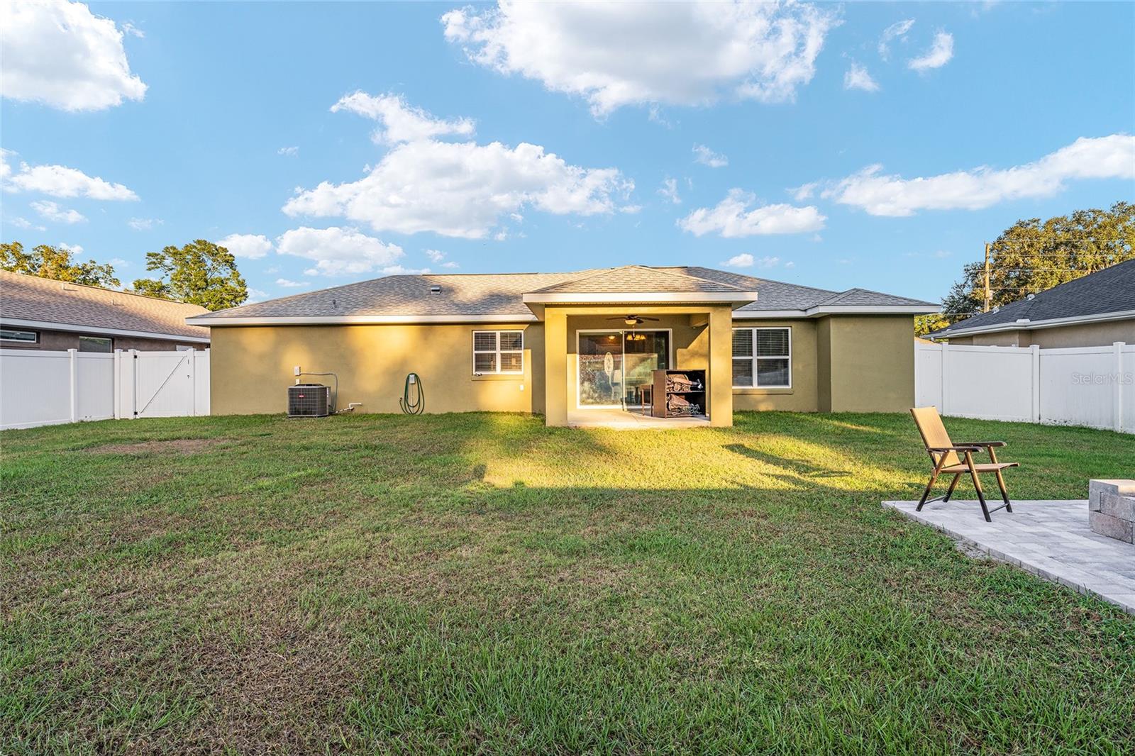 BETTER THAN NEW! This stunning 3-bedroom, 2-bath home built in 2021 offers an OPEN FLOOR PLAN with thoughtful upgrades throughout. Inside, you’ll find DESIGNER CERAMIC TILE in the main living areas and bathrooms paired with WATERPROOF LUXURY VINYL PLANK in the bedrooms—NO CARPET ANYWHERE! The interior has been FRESHLY PAINTED in a neutral palette and features UPDATED DORRS AND LIGHTING that give the home a clean, modern feel. The kitchen is a showpiece with SOFT-CLOSE CABINETRY, UNDER-CABINET LIGHTING, and a spacious bar for casual dining and entertaining. The primary suite includes a WALK-IN CLOSET with modernized sliding barn door, while both guest bedrooms offer large BUILT-IN CLOSETS, giving everyone plenty of storage. Soaring VAULTED CEILINGS enhance the main living area, and a TRAY CEILING in the primary suite adds an elegant touch. Outside, enjoy your covered back porch, NEW VINYL PRIVACY FENCING, and CUSTOM FIREPIT area—perfect for gatherings or quiet evenings. Additional highlights include a 2-car garage, convenient location near The Villages and Lake Weir, and the freedom of no HOA fees.