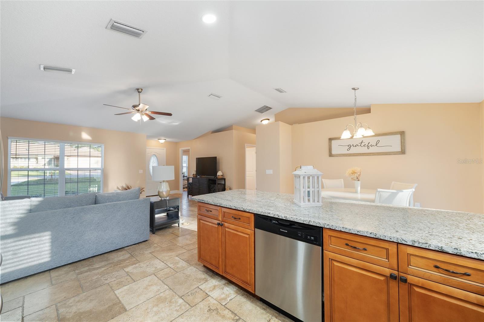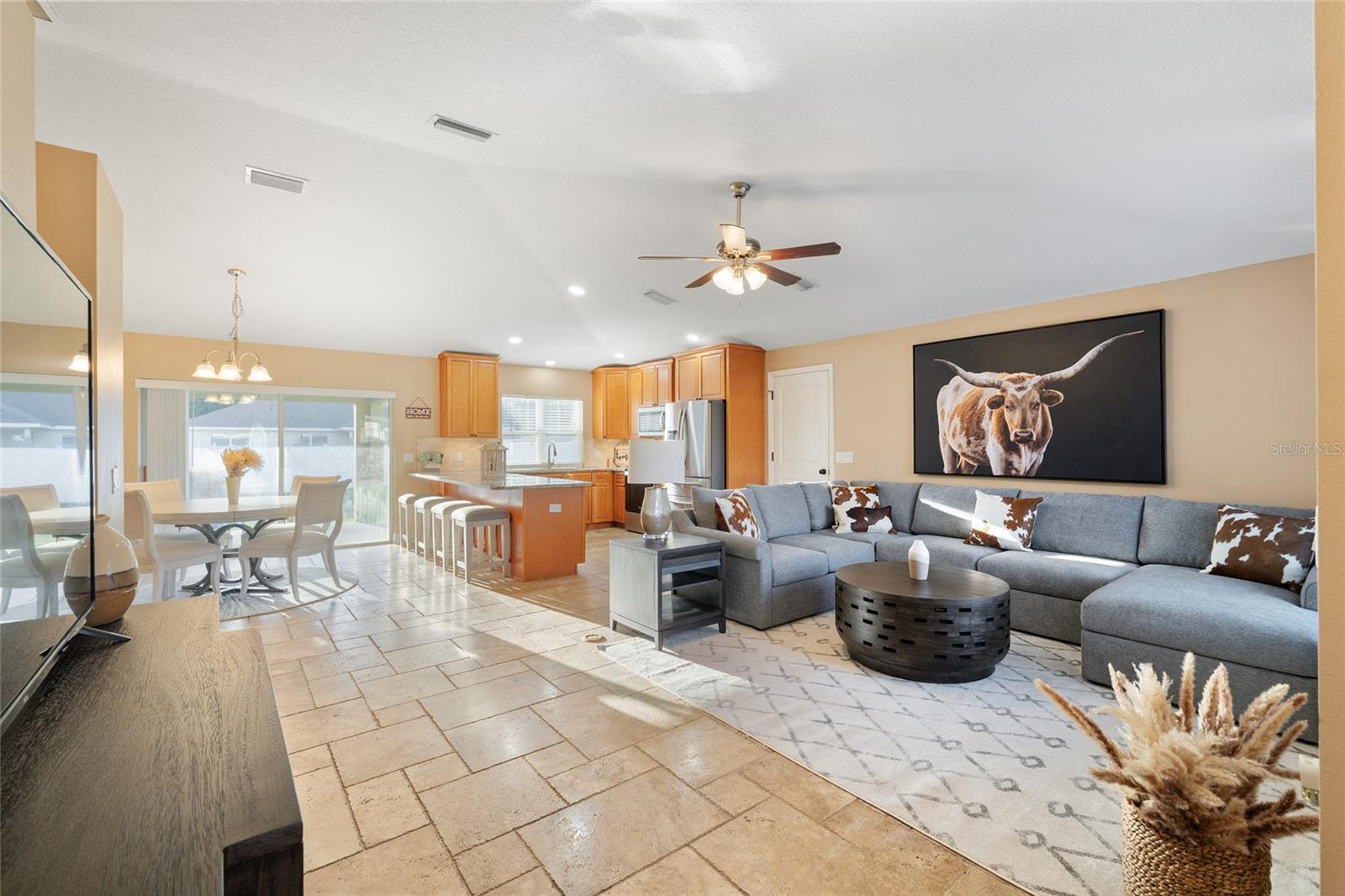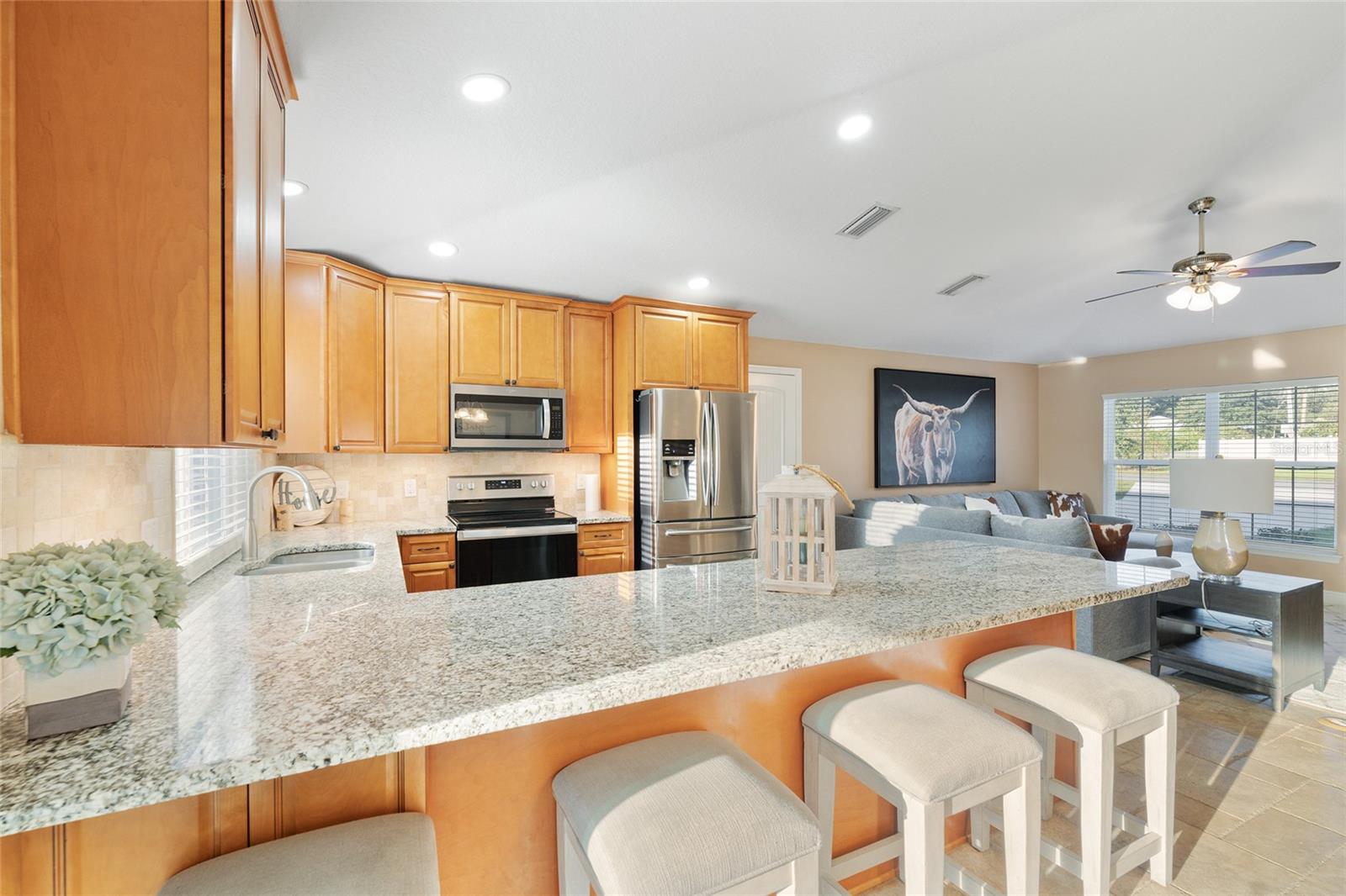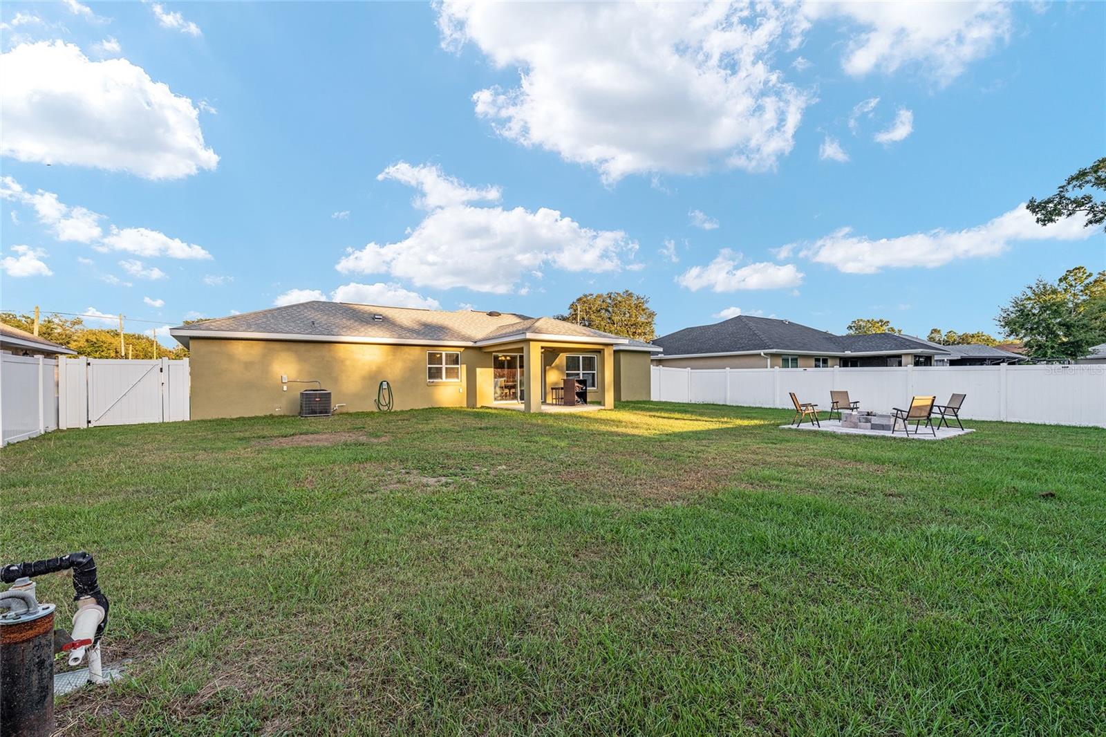 BETTER THAN NEW! This stunning 3-bedroom, 2-bath home built in 2021 offers an OPEN FLOOR PLAN with thoughtful upgrades throughout. Inside, you’ll find DESIGNER CERAMIC TILE in the main living areas and bathrooms paired with WATERPROOF LUXURY VINYL PLANK in the bedrooms—NO CARPET ANYWHERE! The interior has been FRESHLY PAINTED in a neutral palette and features UPDATED DORRS AND LIGHTING that give the home a clean, modern feel. The kitchen is a showpiece with SOFT-CLOSE CABINETRY, UNDER-CABINET LIGHTING, and a spacious bar for casual dining and entertaining. The primary suite includes a WALK-IN CLOSET with modernized sliding barn door, while both guest bedrooms offer large BUILT-IN CLOSETS, giving everyone plenty of storage. Soaring VAULTED CEILINGS enhance the main living area, and a TRAY CEILING in the primary suite adds an elegant touch. Outside, enjoy your covered back porch, NEW VINYL PRIVACY FENCING, and CUSTOM FIREPIT area—perfect for gatherings or quiet evenings. Additional highlights include a 2-car garage, convenient location near The Villages and Lake Weir, and the freedom of no HOA fees.