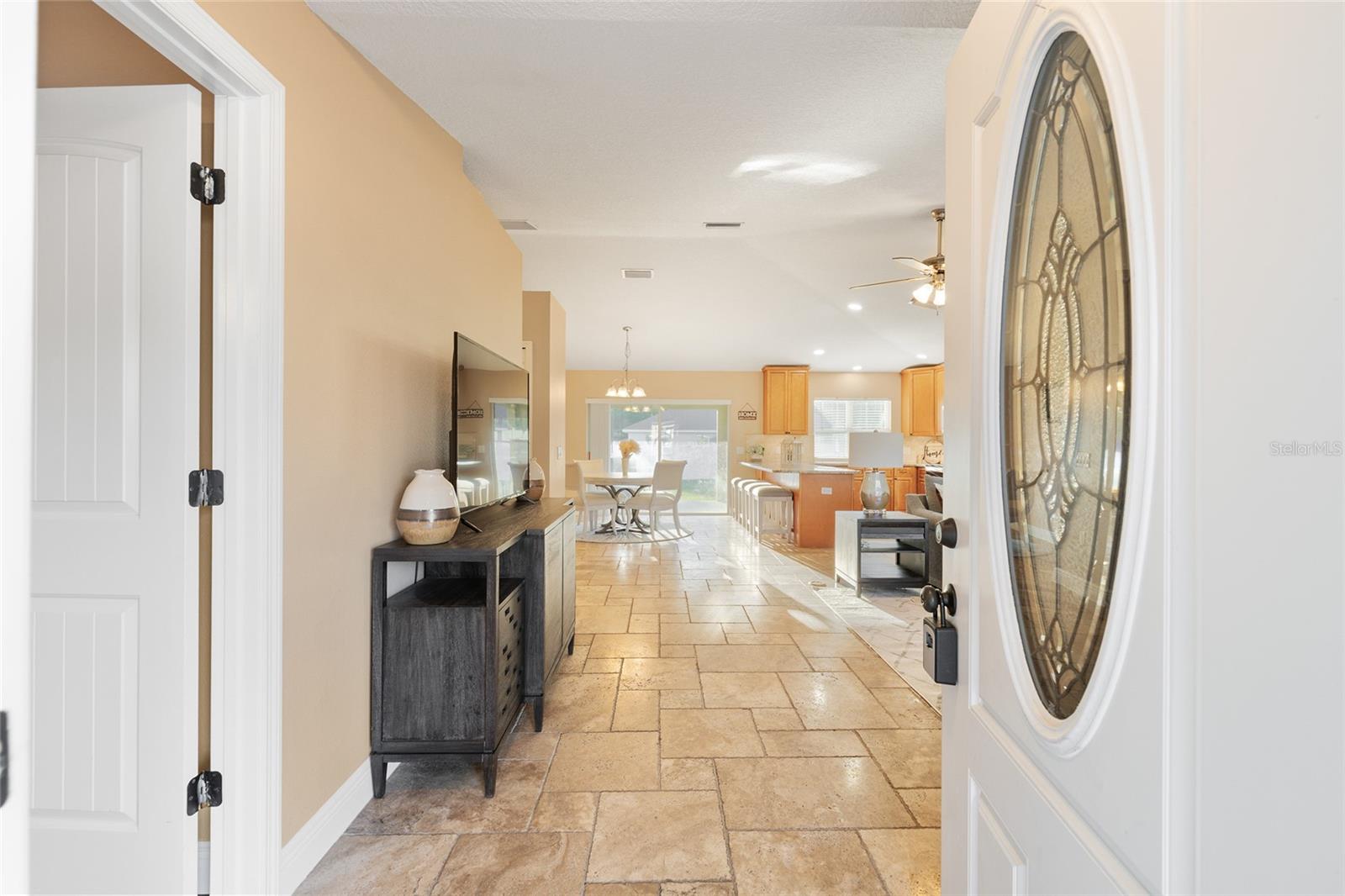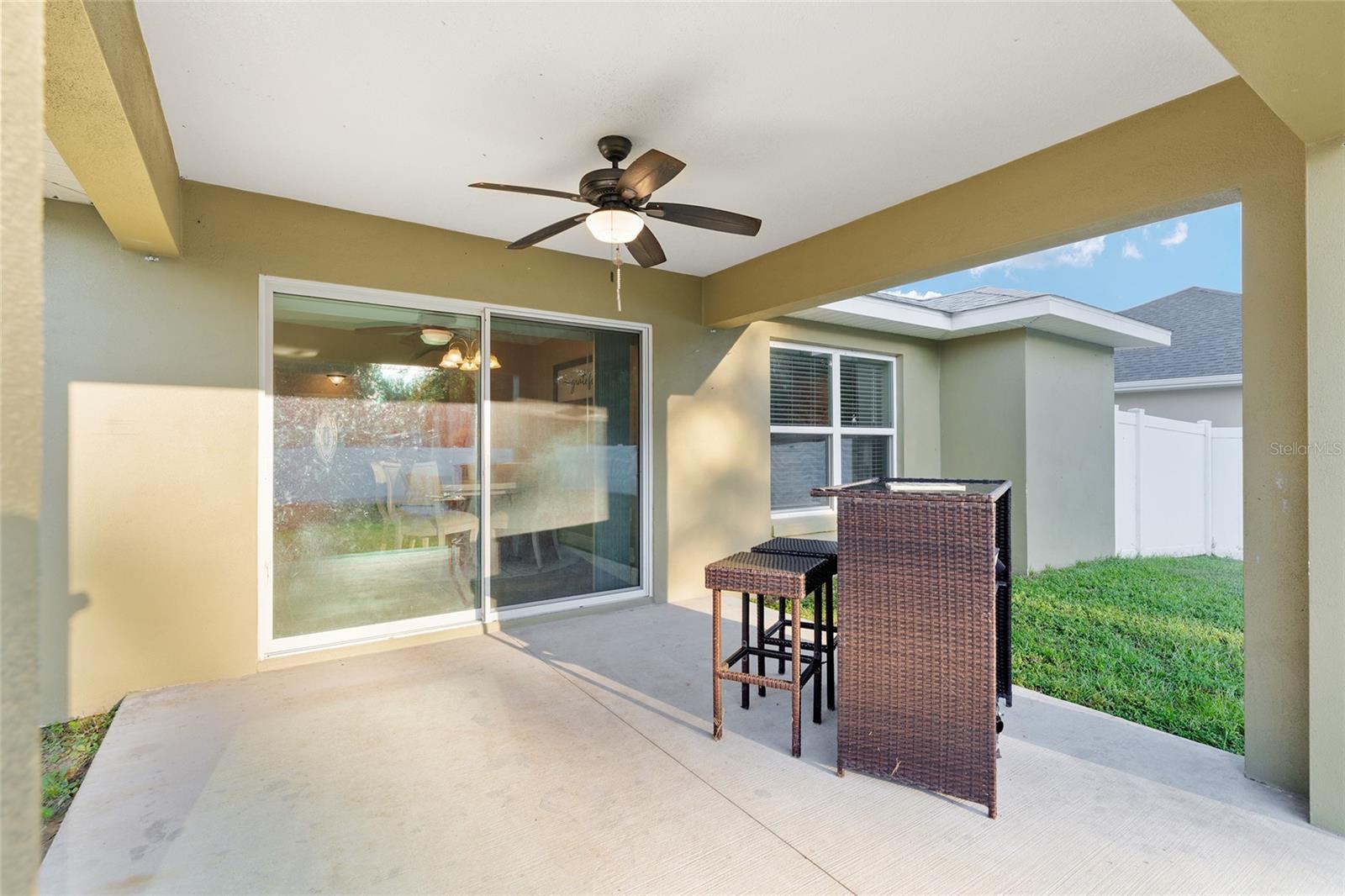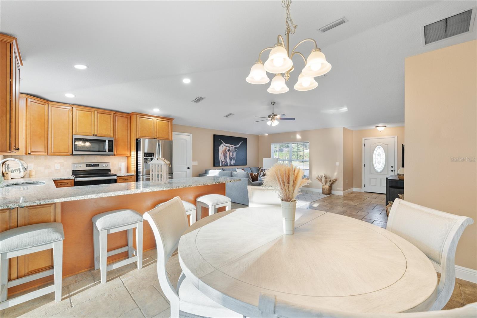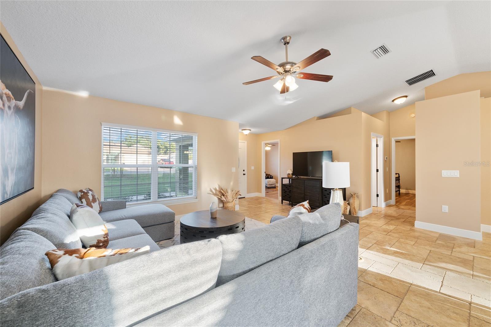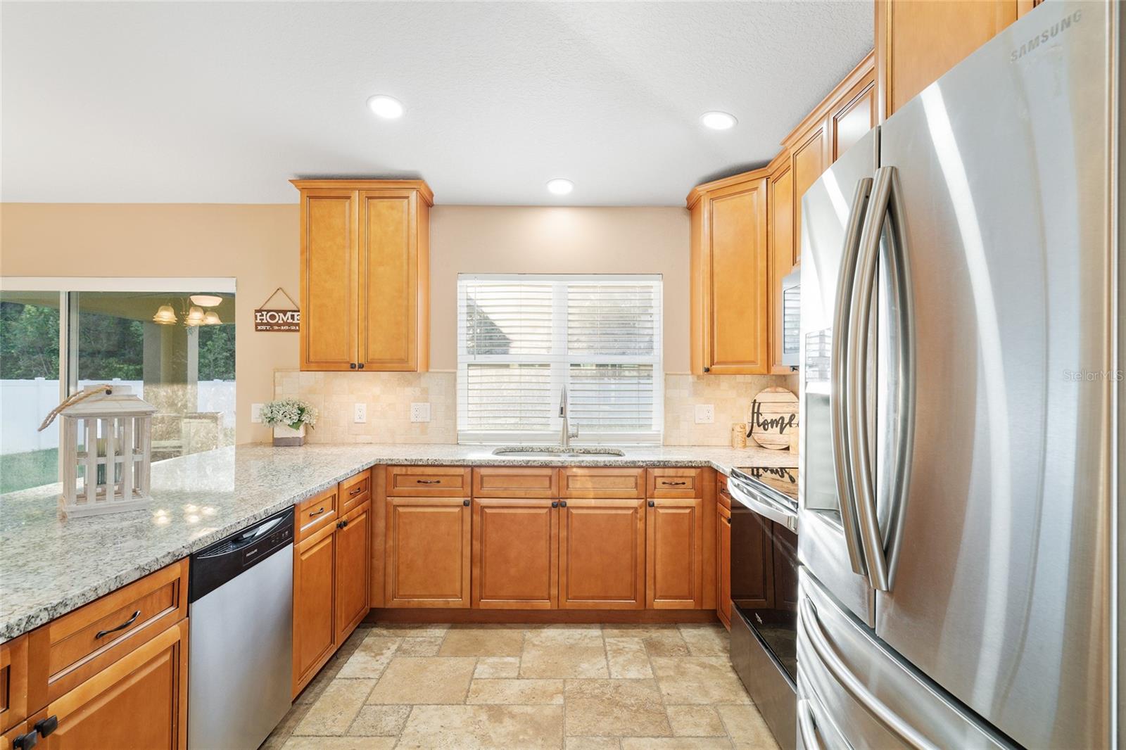 BETTER THAN NEW! This stunning 3-bedroom, 2-bath home built in 2021 offers an OPEN FLOOR PLAN with thoughtful upgrades throughout. Inside, you’ll find DESIGNER CERAMIC TILE in the main living areas and bathrooms paired with WATERPROOF LUXURY VINYL PLANK in the bedrooms—NO CARPET ANYWHERE! The interior has been FRESHLY PAINTED in a neutral palette and features UPDATED DORRS AND LIGHTING that give the home a clean, modern feel. The kitchen is a showpiece with SOFT-CLOSE CABINETRY, UNDER-CABINET LIGHTING, and a spacious bar for casual dining and entertaining. The primary suite includes a WALK-IN CLOSET with modernized sliding barn door, while both guest bedrooms offer large BUILT-IN CLOSETS, giving everyone plenty of storage. Soaring VAULTED CEILINGS enhance the main living area, and a TRAY CEILING in the primary suite adds an elegant touch. Outside, enjoy your covered back porch, NEW VINYL PRIVACY FENCING, and CUSTOM FIREPIT area—perfect for gatherings or quiet evenings. Additional highlights include a 2-car garage, convenient location near The Villages and Lake Weir, and the freedom of no HOA fees.