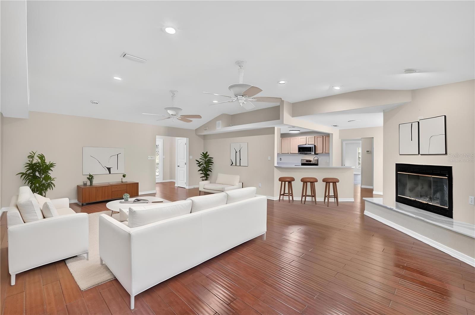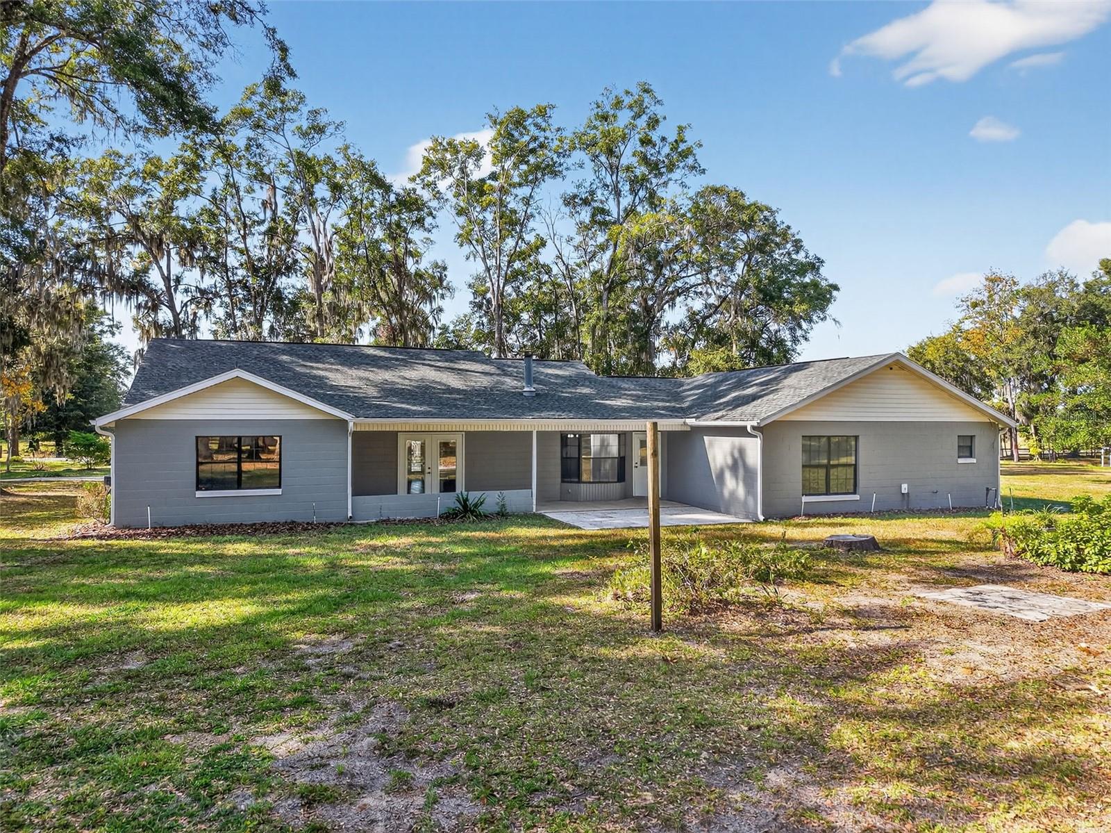 One or more photo(s) has been virtually staged. Discover this expansive, beautifully updated 4-bedroom, 3.5-bath retreat set on 3.38 peaceful acres—offering the privacy of country living with room to grow, garden, keep animals, or simply enjoy the land. With nearly 3,200 square feet under air, a massive 23’x22’ family room with in-law potential, a rear lanai and extended patio, and two storage sheds, this property provides remarkable versatility and space. Best of all, there are no HOA restrictions. Conveniently located near CR484 and The Villages, this home combines tranquility with accessibility. A quaint front porch with slate tile flooring welcomes you into a warm, thoughtfully designed interior. The stunning leaded-glass front door with double sidelights opens to a generous foyer featuring two entry closets and striking engineered hardwood flooring that continues throughout the main living areas. Just ahead, the spacious living room offers a cozy corner fireplace, creating an inviting space to unwind. A formal dining room is positioned just off the kitchen, ideal for gatherings and entertaining. The well-appointed kitchen showcases light wood cabinetry, stainless steel appliances, an eat-in counter, and a generous walk-in pantry. Adjacent to the kitchen, a charming dinette features a bay window with a built-in seat and additional storage, creating a perfect spot for casual meals. The luxurious primary suite is designed for comfort with tile flooring, two walk-in closets, and a beautifully designed bathroom that features dual gray vanities and a tiled, walk-in Roman-style shower. The split floor plan provides added privacy, creating a separate family or guest wing with three additional bedrooms and two full bathrooms. Bedrooms two and three include built-in closets and share a Jack-and-Jill-style bathroom with an alabaster shaker vanity topped with quartz and a tiled tub-and-shower combination. The fourth bedroom has its own adjoining full bath, also featuring an alabaster shaker vanity with quartz, a tiled tub-and-shower combo, a linen closet, and a second entry from the hallway. One of the most impressive spaces in the home is the massive 23’x22’ family room. Complete with an updated half bath, a built-in closet, and a separate side entrance, this flexible area is ideal as an in-law suite, guest quarters, recreation space, studio, or even a home business. Near the foyer, a bonus room with built-in bookcases and pocket doors on each side provides an excellent option for a home office or library. A centrally located interior laundry room with white cabinetry, a hanging rod, and a utility sink adds everyday convenience. At the rear of the home, French doors from the living room and an exterior door near the primary suite open to a fabulous outdoor haven. The 33’x9’ lanai and extended patio create a tranquil, private setting for grilling, dining outdoors, or entertaining guests. Outside, two storage sheds offer additional utility for tools and equipment, and a dedicated bonfire pad provides a perfect spot for evening gatherings under the stars. With abundant living space, thoughtful updates, and peaceful acreage, this property offers limitless potential for gardening, animals, outdoor activities, or future enhancements. Don’t miss the opportunity to make this incredible retreat your own. Be sure to watch the walkthrough video and call today to schedule your private showing or virtual tour.
