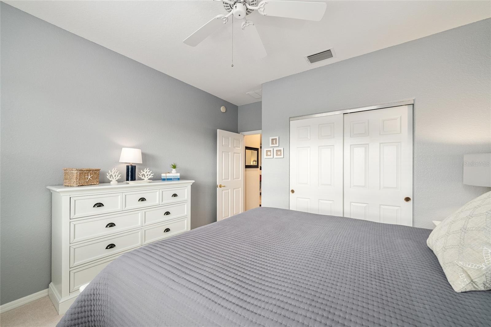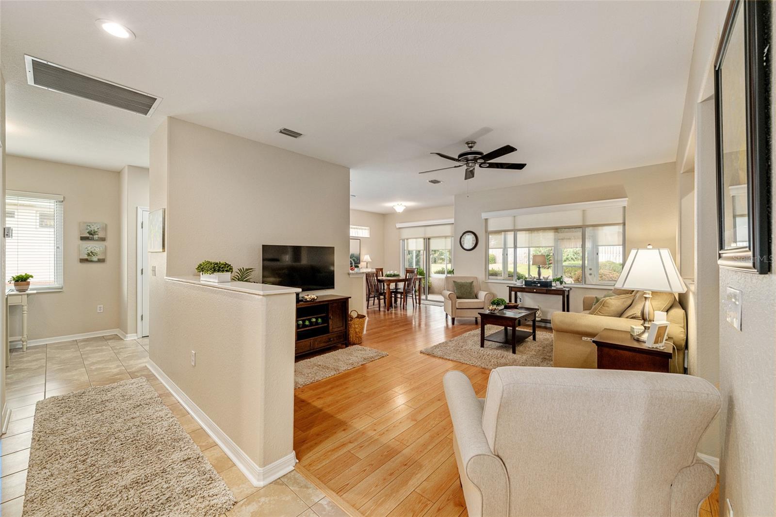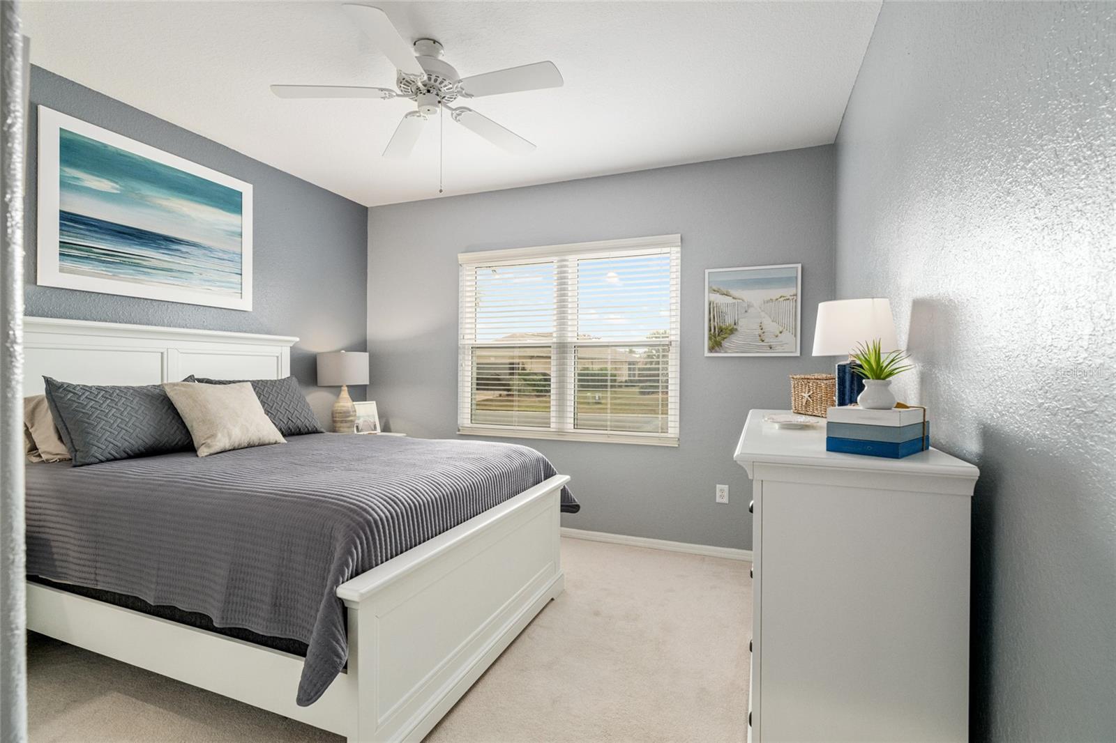 One of Del Webb’s most popular models is now available and truly a must-see. Situated on a very private lot with room for a pool, this beautifully upgraded home offers exceptional indoor and outdoor living. From the moment you review the description, photos, and video, you’ll want to schedule a personal tour. The upgraded kitchen features tall white refaced cabinets with custom hardware, granite countertops, stainless steel appliances, recessed lighting, and ceramic tile flooring. The spacious primary suite includes bay windows, a ceiling fan, carpeted flooring, and a completely renovated ensuite with a large walk-in shower, skylight, and tile flooring. The guest bedroom, located at the front of the home, offers carpeted flooring, wood valances, and a ceiling fan. The fully remodeled guest bath features tile flooring. A versatile study/den with engineered wood flooring is positioned between the bedrooms and provides ample space for an office, seating area, and even a hide-a-bed. The living and dining areas feature engineered wood flooring, mini blinds, and white wood valances. The enclosed lanai is under heat and air with acrylic windows and sunshades, overlooking a private fenced area just inside the boundary lines. An adjacent outdoor patio provides the perfect spot for grilling and enjoying the Florida sunshine. Additional highlights include beautifully manicured landscaping, a designer concrete driveway and walkway, fresh interior paint, and recently painted exterior. Major updates provide peace of mind with a new roof in 2021 and a new HVAC system and electric hot water heater installed in 2025 (converted from gas). Some furniture is available. Termite Bond with Massey is assumable. This move-in-ready home has been thoughtfully maintained with no major expenses anticipated. Call today to schedule your private showing.