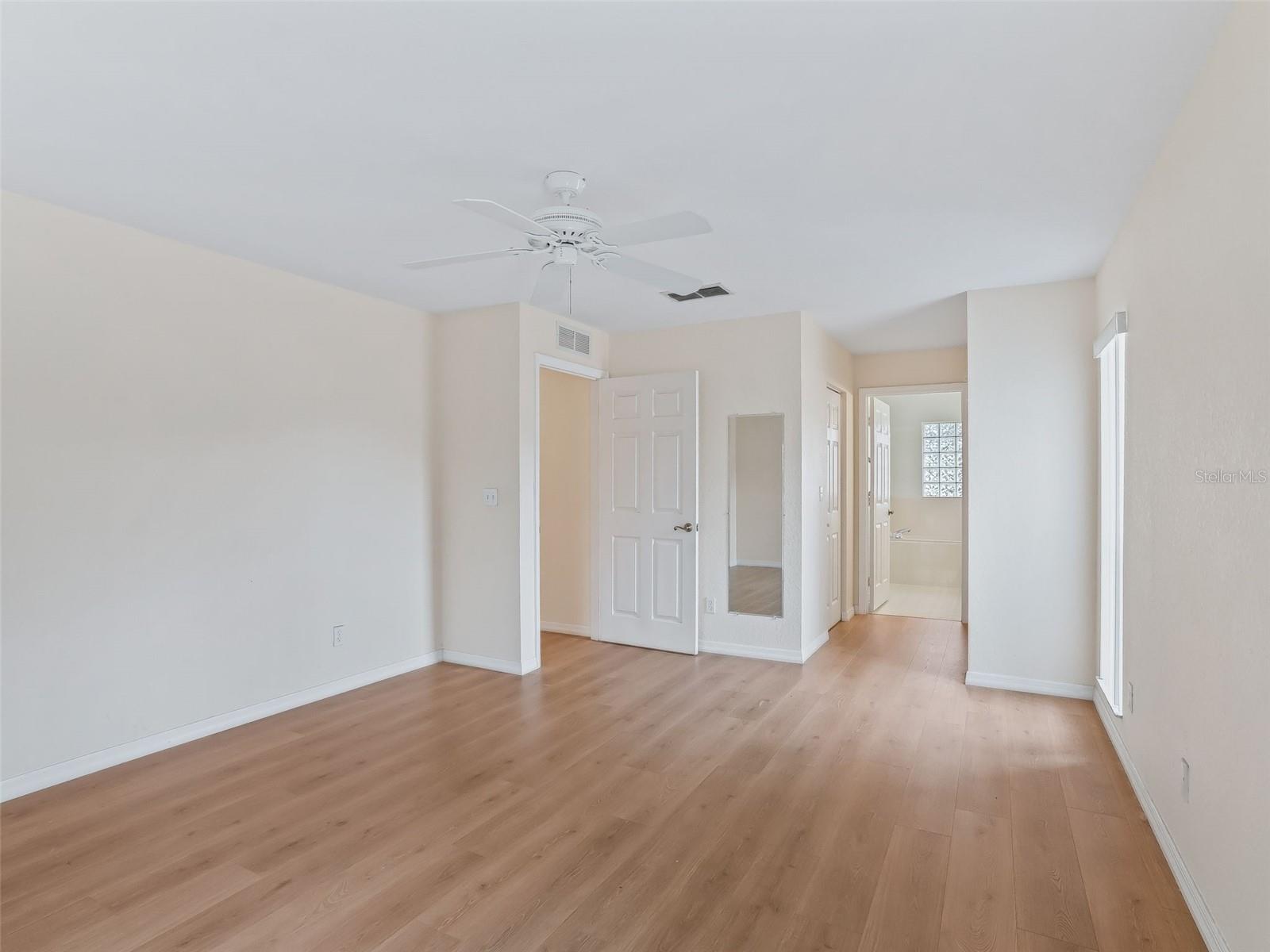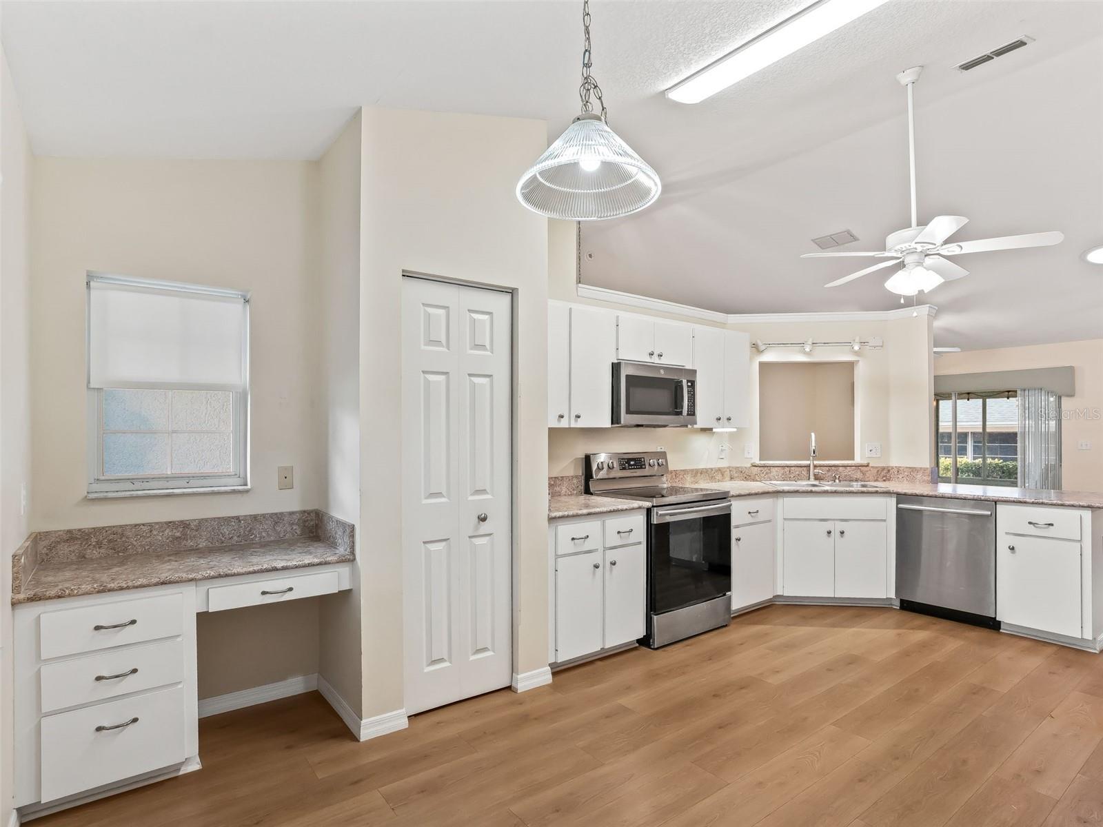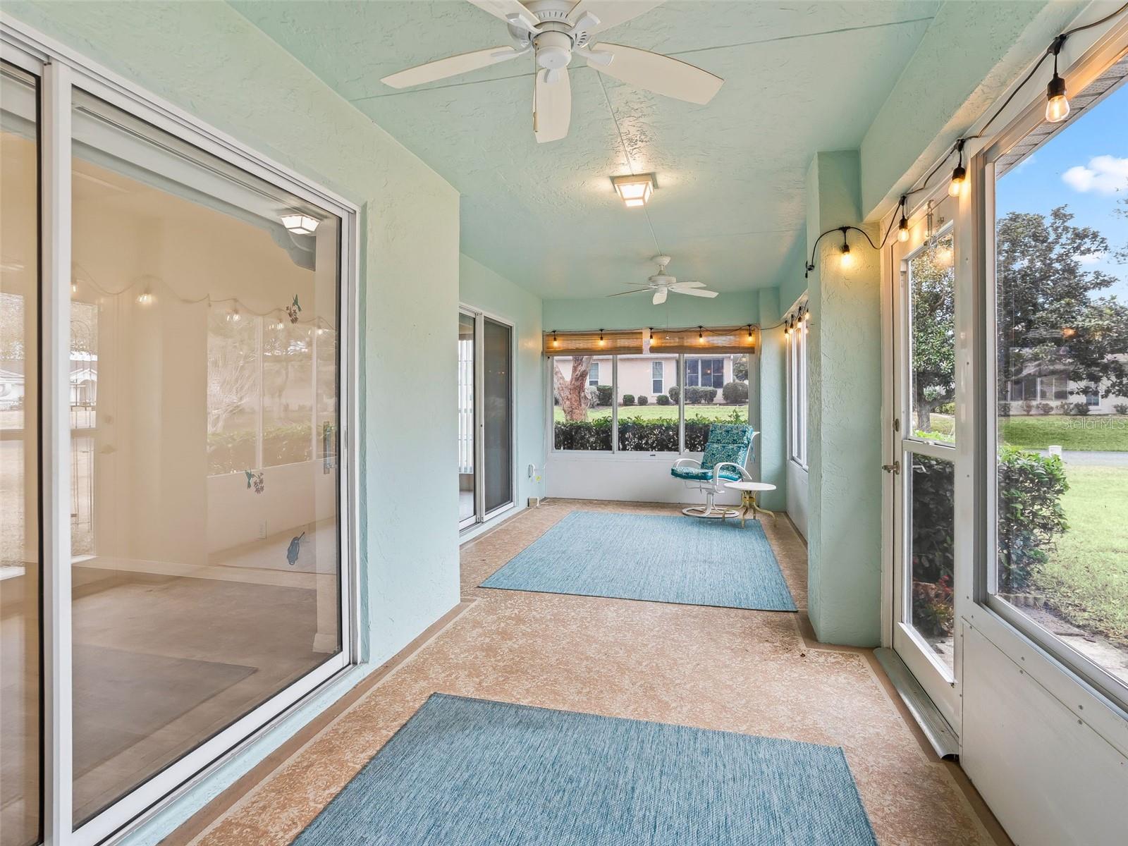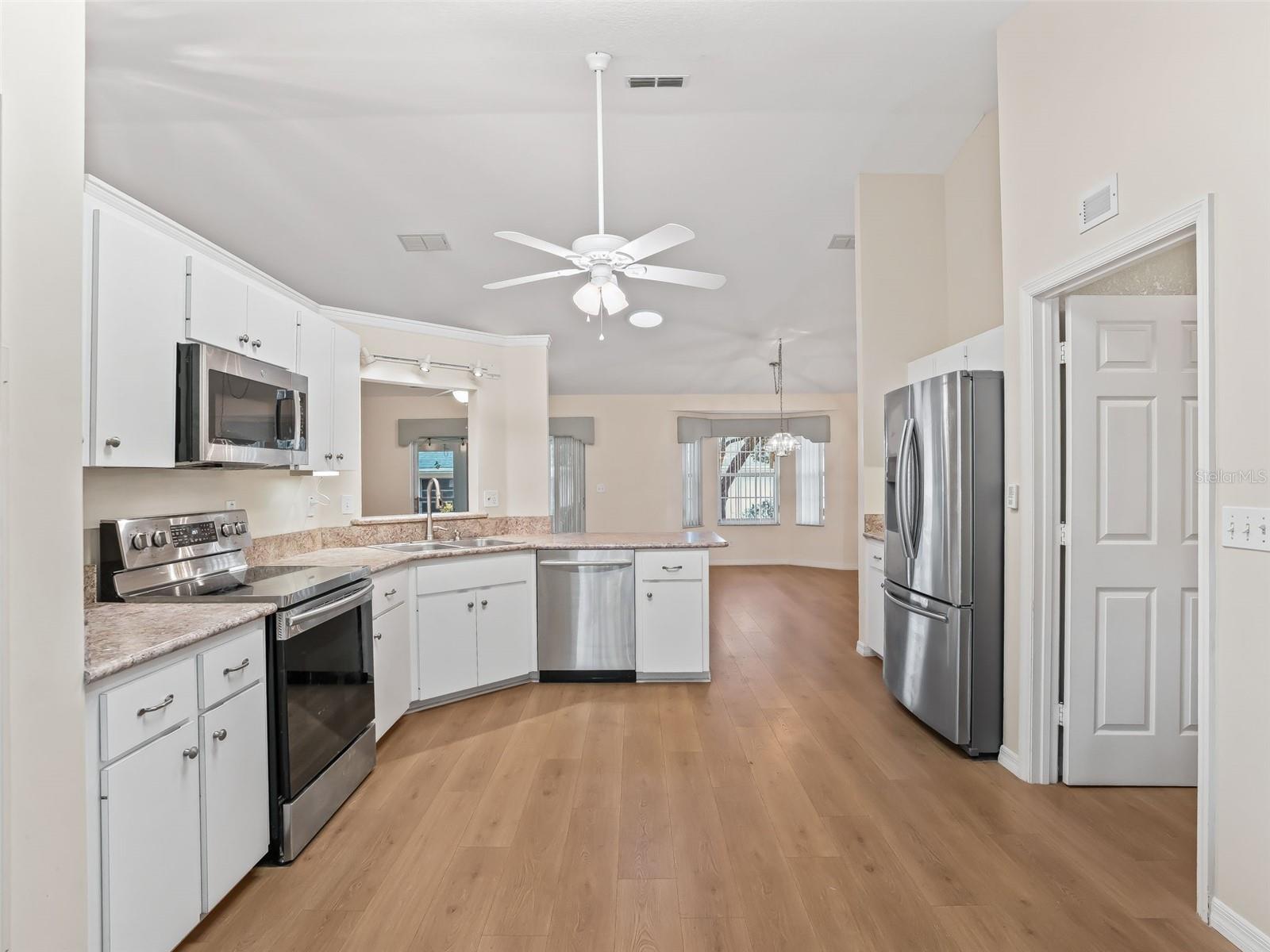 One or more photo(s) has been virtually staged. Stonecrest is a 55+ gated golf course community with all the amenities and 4 pools (one indoor), and just a Bridge Away By Golf Cart To The Villages! Come See this Beautiful 3/2 Concrete Block and Stucco Monterey with a 2 Car Garage on a Corner Lot with Great Curb Appeal featuring Low Maintenance Professional Landscaping, Paver Driveway and Walkway, and a Covered Front Entrance with an Elegant Front door! The Open and Split Floor Plan is Spacious, Light, and Bright, just perfect for Entertaining Friends and Family! This well appointed home boasts Gorgeous Laminate Flooring, Vaulted Ceilings, and Upgraded Light Fixtures. As you enter into the foyer you are greeted by an Impressive Designer Light Fixture, and the Living and Dining area combination featuring Vaulted Ceilings, Stunning Laminate Flooring, and Sliding Glass Doors to the Lanai, making it effortless to enjoy relaxing evenings soaking in the Spectacular View as the Sun Sets! Take advantage of the Fantastic Florida weather by enjoying the additional Living Space on the 25 x 20 Screened Lanai! The Spacious Eat in Kitchen showcases a Built In Pantry Closet, Plenty of counter space, Beautiful Stainless Appliances, Plenty of White Wood cabinets, and Built in Desk! The Split Floor Plan affords the Utmost Privacy for both the owners and their guests, as the Primary Suite is located at the opposite side of the home from the guest bedrooms and guest bathroom. The Luxurious Primary Suite boasts a Private Entry to the Lanai, 2 Closets (1 Walk in & 1 Double), and En Suite Bathroom, featuring a Two Sink Vanity, Linen Closet, Generously Sized Soaking Tub, and Walk in Shower. The two additional bedrooms feature nice closets, Bedroom 2 with a Double Closet, & Bedroom 3 with a Walk in Closet, and provides plenty of space, and convenience for your guests. You will have plenty of room for storage in the 2 Car Garage! Stonecrest is a 55+ Gated Golf Course Community with All the Amenities, pools, pickleball courts, softball, 18 hole championship golf course, Broad Stripes Golf & Social Club and over 80 different clubs to join! As a private gated golf course community with Private Roads, you can expect a high level of privacy and security. Overall, this home offers a combination of a Well Designed Floor Plan, Luxurious Features, a Desirable Location, and a Secure Community Setting. A WONDERFUL LIFESTYLE AWAITS YOU IN STONECREST!