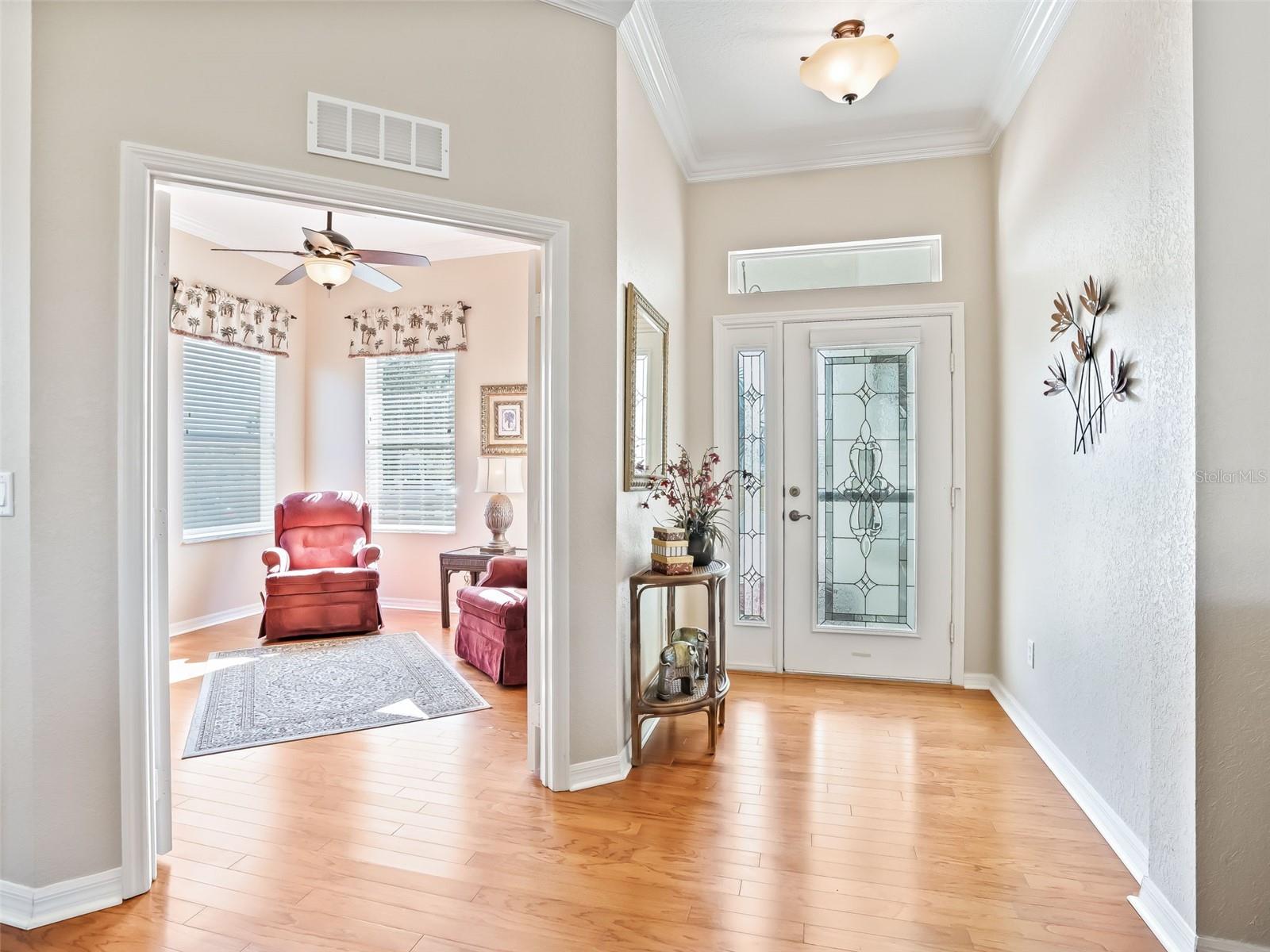 STONECREST-WHETHER YOUR RETIRED OR WORKING FROM HOME YOU WILL HAVE THE BENEFITS OF AN ACTIVE LIFESTYLE, NO SNOW, TAX ADVANTAGES, BEAUTIFUL OUTDOOR SPACES TO ENJOY, AND A HOME OFFICE WITH SERVICES AT YOUR FINGERTIPS. INSTANT HOME OPPORTUNITY AWAITS YOU IN THE SUNSHINE STATE LOCATED ON ONE OF THE LARGEST CUL DE SACS IN THE COMMUNITY SURROUNDED BY THE PRISTINE GOLF COURSE! Welcome home to this BEAUTIFUL, QUITE, LOW TRAFFIC, TURNKEY, GOLF-FRONT St. Johns model on the 7th fairway in the sought-after Stonecrest gated golf community. Your NEW LIFESTYLE will be enhanced by the 1,768 SF under heat and air, plus a MAGNIFICANT additional 178 SF Florida room with view of the course, bringing even more space,(1946 SF) to enjoy the Florida lifestyle. Recent improvements include a 2023 roof, 2 solar fans on the roof, 2018 HVAC, 2021 water heater, water softener AND AN ANTENNA WHICH BRINGS IN ABOUT 50 CHANNELS. Beautifully landscaped with Palm trees, stone accents at the foundation, gutters, exterior lighting, private mailbox, and an inviting covered entry. A leaded glass front door with sidelight and transom window that opens to a foyer, along with a storm door, creates a stunning first impression. Inside, you’ll find tall ceilings, crown molding, hardwood floors, newer carpeting in the bedrooms, lever handles throughout, ceiling fans, and an open floor plan designed for both comfort and entertaining. The front foyer leads to a Den with French doors, followed by a spacious open dining area. The kitchen features a FULL VIEW OF THE GOLF COURSE, granite countertops, stainless steel appliances, recessed LED lighting, tall cabinetry, breakfast bar, a center island w/ storage, a closet pantry, and a casual dining nook with three bay windows. THE GREAT ROOM HAS VIEW VIEWS OF THE GOLF COURSE THROUGH 3 PANES OF SLIDING GLASS DOORS which makes for a very inviting space! An inside laundry room with cabinets adds convenience and right off the garage and kitchen. The guest bath includes a tall vanity with granite countertops, a tub/shower combination, and a large privacy window. This is a split floor plan so the spacious owner’s suite is privately located and separated by French doors, and showcases a three-bay window with golf course views, a large walk-in closet with custom shelving, and a luxurious ensuite bath with a large soaking tub, a pvt. water closet, a second large closet, a large privacy window, a linen closet, tall vanities with granite, and a built in gender-neutral artistry station. Enjoy outdoor living in the 12x15 full-view Florida room featuring PORCELAIN plank flooring, roll-down shades, and a remote-controlled ceiling fan, which opens to a 24x18 open patio complete with a newer LED fire pit, gas grill, tables, and chairs, creating the BEST outdoor space for relaxation. The garage offers cabinets, A WATER SOFTENER,an external key pad, workbenches, and an attic shuttle. A GAS GOLF CART is available for purchase or negotiation. The Seller will remove some select personal items prior to closing. Stonecrest is a deed-restricted, active golf community offering 18 holes of championship golf, four pools including an indoor pool and spa, a fully equipped fitness center, lighted pickleball courts, softball, and a vibrant social calendar. Golf cart access to nearby shopping adds to the convenience. The community clubhouse features a popular casual dining restaurant and pro shop and serves as the heart of social life. Welcome Home.