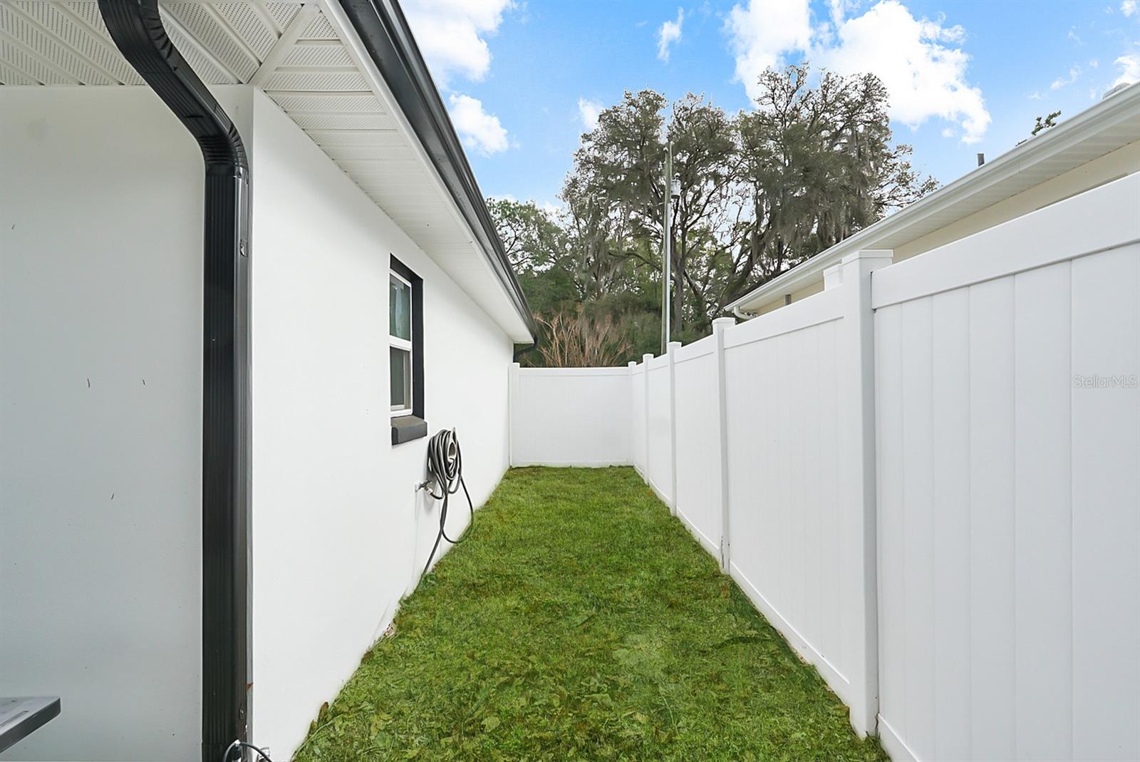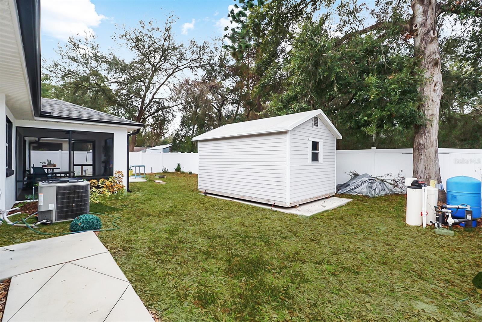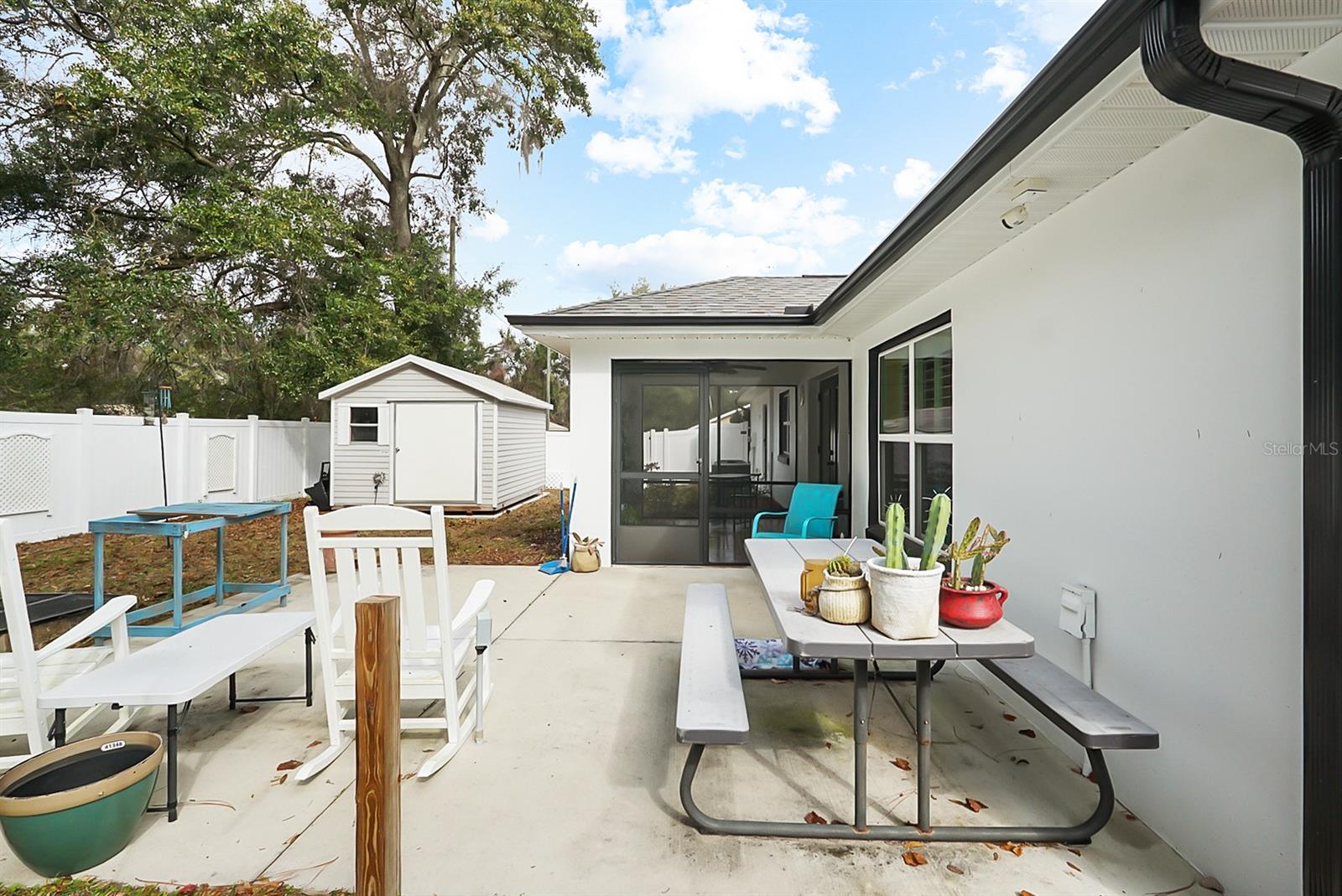 Charming 3-bedroom, 2-bath home with 1,214 sq ft, built in 2018, featuring durable block and stucco construction and elegant ceramic/porcelain tile flooring throughout. Enjoy the freedom of NO HOA on this desirable corner lot with a fully fenced yard. This move-in ready home offers a 20x16 prefabricated storage shed with electricity, installed 3/13/2024, and a brand-new rain guard gutter system. Shutters adorn every window, and matching tile in the bedrooms creates a seamless, cohesive look. Well-maintained and thoughtfully designed, the functional layout is perfect for first-time buyers, downsizers, or investors. Ideally located near shopping, dining, schools, and major roadways, this home combines comfort, convenience, and style. Schedule your private showing today! Furniture available separately. 3rd Bedroom does not contain a closet!