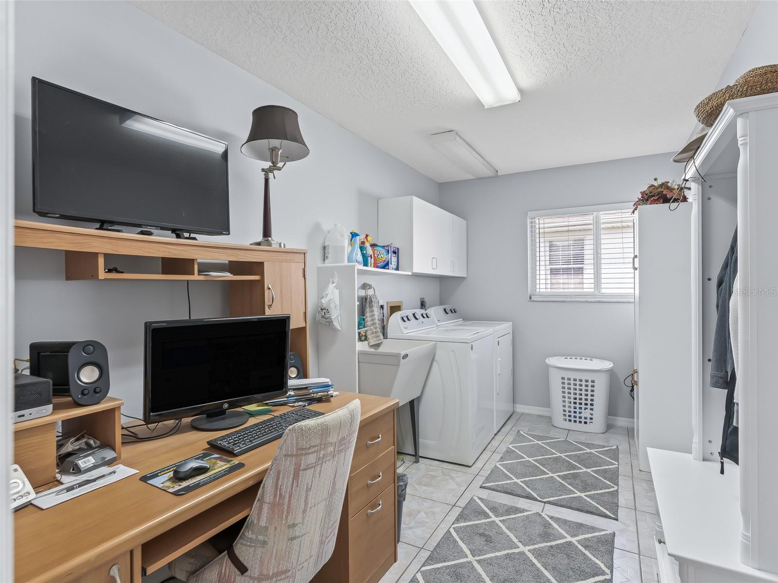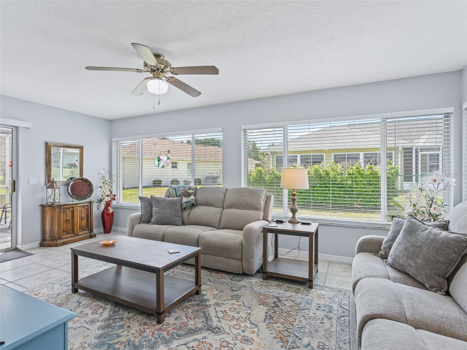 Stonecrest is a 55+ gated golf course community with all the amenities and 4 pools (one indoor), and just a Bridge Away By Golf Cart To The Villages! Charming 2 bedroom/2 bath +DEN AND LIVING ROOM. CUSTOM BUILT BLOCK AND STUCCO CUSTOM HOME, with a 2 Car Garage, AND workshop (13X5)! ROOF 2026, A/C 2014, WATER HEATER 2014, The white appliances are newer w/ MICROWAVE HOOD (2020), REFRIGERATOR (2021), & RANGE (2017), WASHER (2017), and DRYER (2017). NEWER LV FLOORING adds a wow to this home upon entry. You will Love This Open Concept Floor Plan which is Spacious, Light and Bright, just perfect for Gatherings of Friends and Family! This well appointed home boasts a Paver Driveway and Walkway, Professional Landscaping, Covered Front Porch with a delightful sitting area, Vaulted ceilings, an Open Concept Floor Plan, and a Birdcage Enclosed Back Patio with Paver flooring! The Kitchen showcases a Large Skylight, Formica Countertops, White cabinetry, and a Butler's Window the the Florida room, making Entertaining Effortless! A Stunning Chandelier Adorns the spacious Dining Area which flows seamlessly to the 15x14 Living area which offers access to the Florida room, Vaulted ceilings, AND NEWLY PAINTED INTERIOR. The spacious Primary Suite features a Walk in Closet, and En Suite bathroom with sky light, Tub and Shower Combination, Nice Size Granite Vanity, and a Linen Closet. Bedroom Two offers a Double Closet providing your guests with Convenience, a new granite vanity and sky light that filters in abundant light! Retreat to your own Private Outdoor Oasis, on the 16 x 12 Birdcage Enclosed Back Patio with Paver Flooring, and Privacy Landscaping, Enhancing the Outdoor Living Experience! Enjoy outdoor BBQ's, Sunset Dinners, and the beautiful Florida weather! A Fantastic additional feature is the Large 13 x 7 Inside Laundry room with a Utility Sink, and Extra Cabinet Space! You will have plenty of room for storage in the nice size 2 Car (room for a truck), and Pull down attic stairs. Stonecrest is a 55+community with private roads, all the amenities, pools, pickleball courts, softball, 18 hole championship golf course, Broad Stripes Golf & So If you are looking for a Well Designed Custom Concrete Block & Stucco home with a Fantastic Open Concept Floor Plan, in a Fabulous Location with Great Outdoor Space in a Secure Community Setting, then This is the Home for You! A WONDERFUL LIFESTYLE AWAITS YOU IN STONECREST! SOME FURNISHINGS AVAILABLE SEPARATELY.