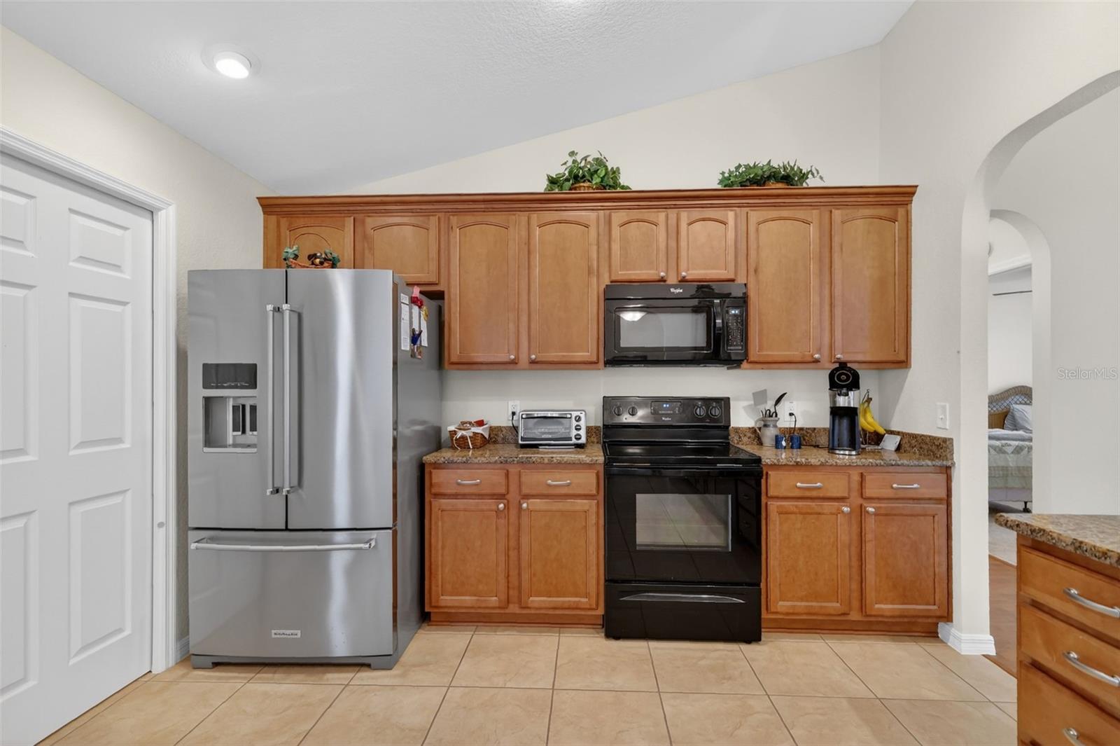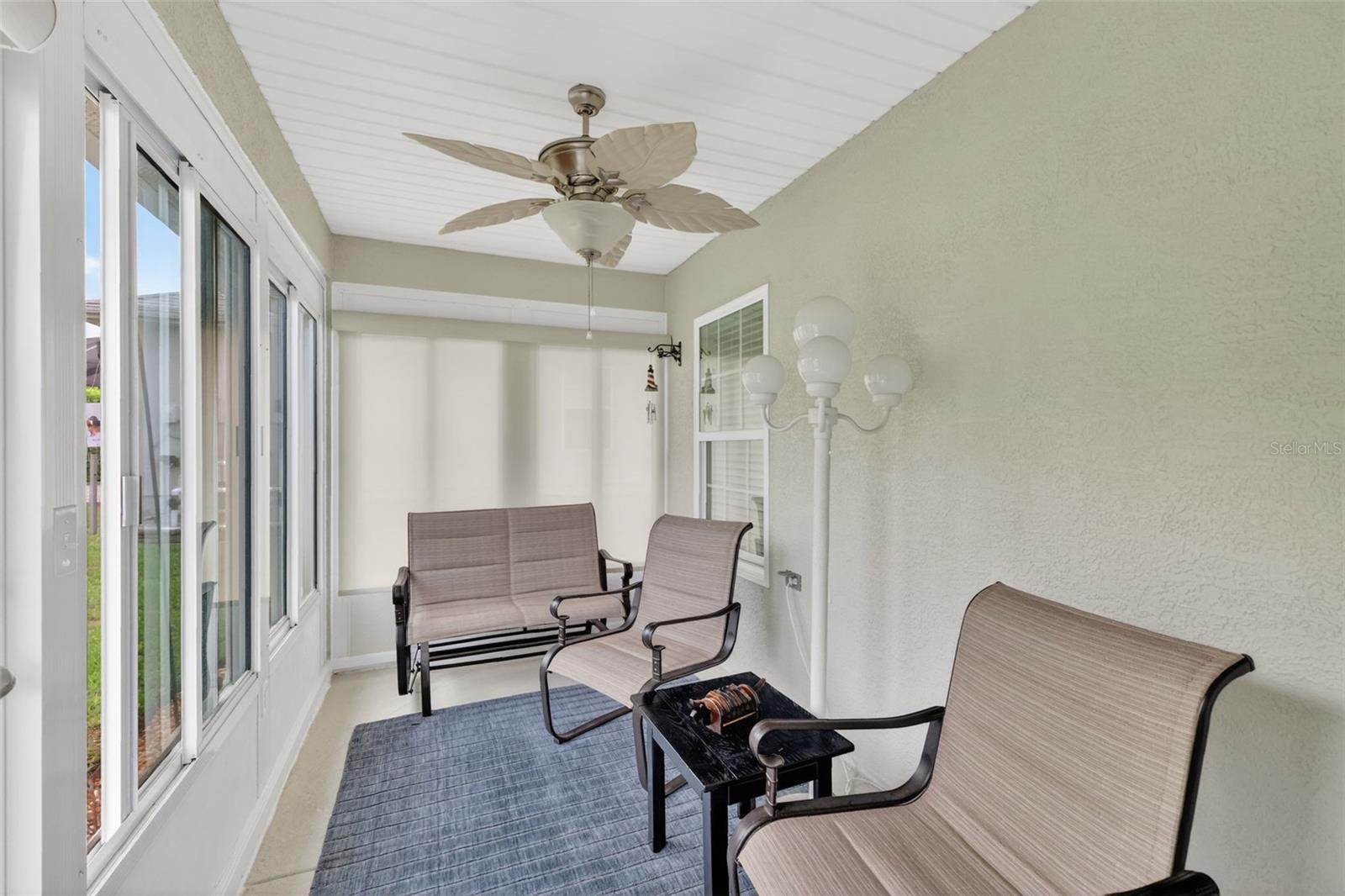 Welcome to this beautifully upgraded Sycamore model located in the highly desirable 55+ golf course community of Stonecrest. With private roads and secure gated access, this vibrant neighborhood offers resort-style living in a peaceful, well-maintained setting. This 3/2 offers 1,472 square feet of thoughtfully designed living space with quality upgrades throughout. Inside, the home showcases upgraded flooring, granite countertops, ceiling fans, and a new storm door for added comfort and efficiency, while a solar tube brightens the laundry room with natural light. The spacious primary suite features a completely renovated walk-in shower and new flooring, offering a modern, spa-like retreat. One of the standout features of this home is the enclosed lanai, complete with heat and air, glass windows with screens, tile flooring, and solar shades—providing a comfortable year-round space to relax or entertain. The garage has been expanded by three feet in length, offering extra room for storage or larger vehicles, and includes convenient attic pull-down stairs for additional storage access. This move-in-ready home, is offered turnkey with an electric golf cart as well. Enjoy golf, security, and the lifestyle you’ve been waiting for — all in beautiful Stonecrest.