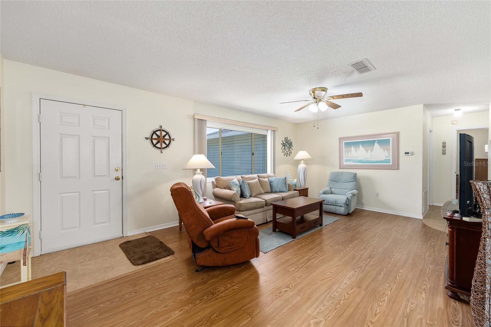 Welcome to this delightful, WELL-MAINTAINED 3/2 HOLLY MODEL in SPRUCE CREEK SOUTH, 55+, GATED GOLF COURSE COMMUNITY. This home is FLORIDA RETIREMENT AT ITS BEST just 2 miles from The Villages, FL — featuring LAMINATE & TILE throughout, SPACIOUS SPLIT FLOOR PLAN, epoxy-finished GARAGE floor, indoor laundry w/ washer & dryer; PRIVATE SETTING with native foliage, CURBING, FENCED YARD & utility easement for EXTRA GREENSPACE; SCREENED TILE LANAI overlooking peaceful landscaping; LARGE LOT in a PROTECTED GRID; pride of ownership shines; community offers WALKING TRAILS, GOLF, RESTAURANT, COMMUNITY CENTER, FITNESS, POOL, HOT TUB, SAUNA, PICKLEBALL, TENNIS, BOCCE, SHUFFLEBOARD, BILLIARDS, BALLROOM, LIBRARY & MORE plus clubs for DANCE, EXERCISE, CARDS, SOCIAL, BOOMERS, SOFTBALL; EASY ACCESS to WALMART, ALDI, LOWES, BJs, CVS, DOCTORS, PHARMACIES, RESTAURANTS & BINGO; Water Heater(2022) - Roof(2023) - HVAC(2024) - Washer(2025) - Range(2020) - Fridge is newer. COME SEE BEFORE ITS GONE!