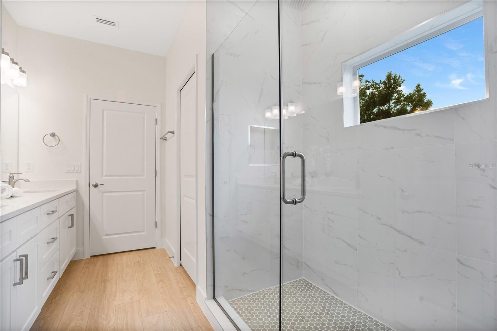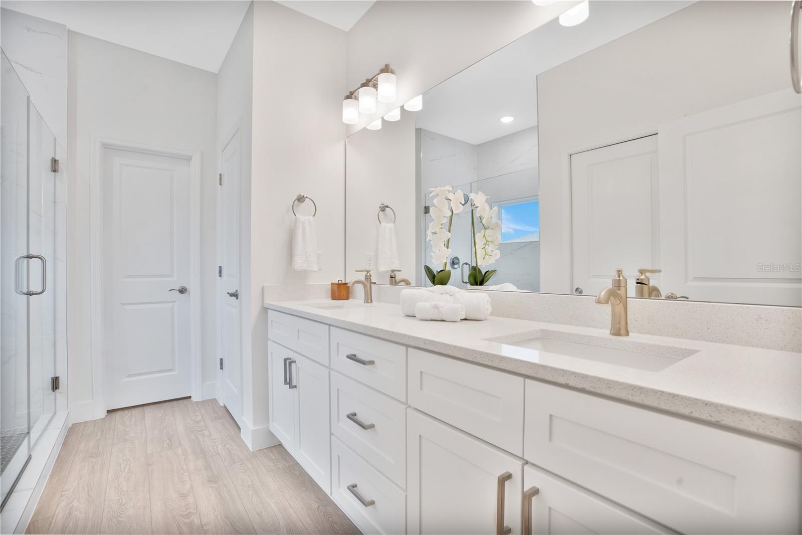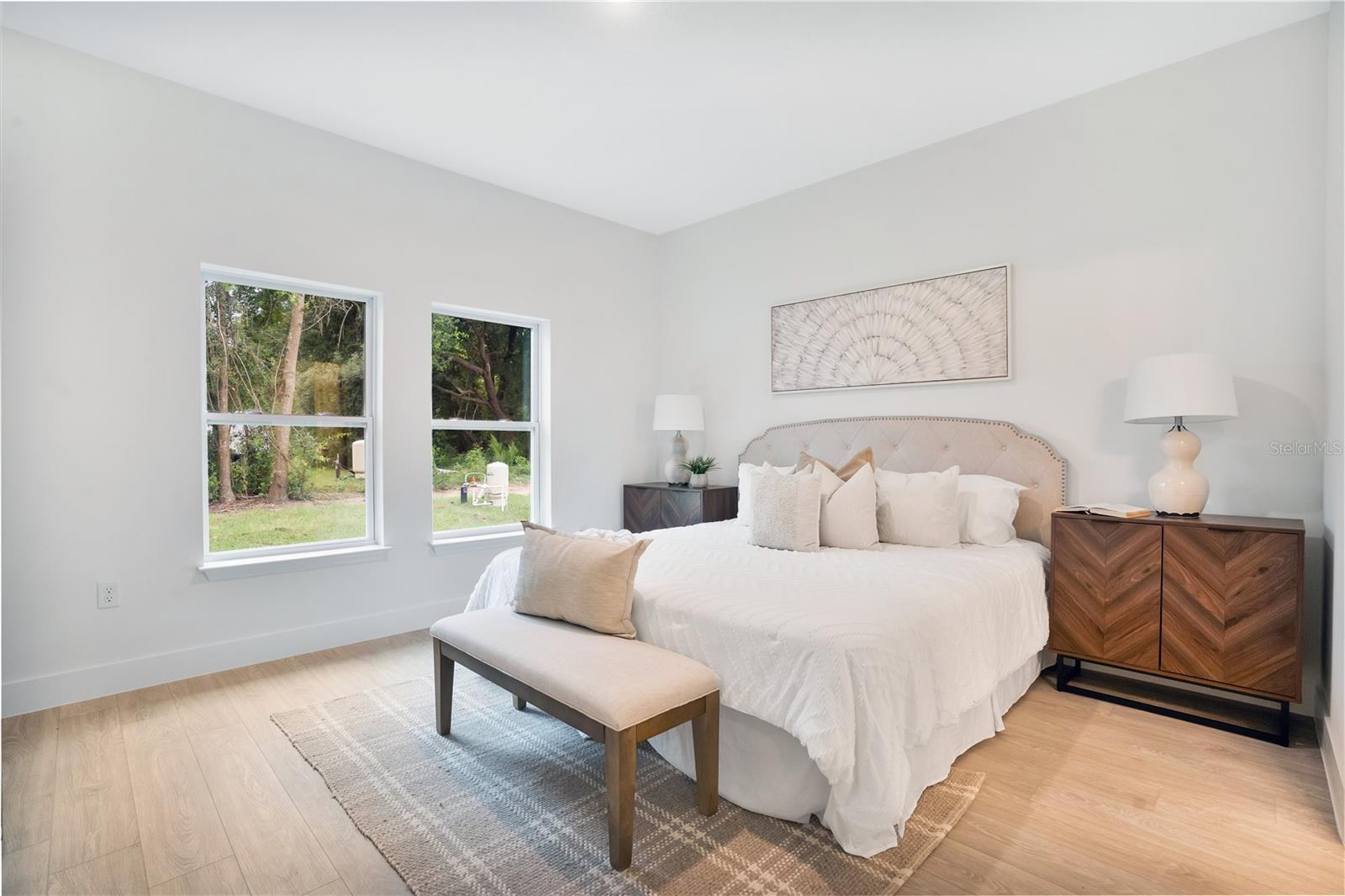 Captivating newly built 3-bedroom, 2-bathroom home on an oversized corner lot.Featuring an open floor plan, the home is filled with numerous upgrades throughout, including premium 20-mil luxury vinyl plank flooring, 5 1/4 baseboards, and impressive 10-foot ceilings. The spotless kitchen is equipped with stainless steel appliances, quartz countertops, a glass liner mosaic backsplash, and 42-inch soft-close shaker cabinets. The large island includes built-in seating, perfect for casual meals. Flowing seamlessly from the kitchen, the impeccably designed living and dining areas boast large windows and sliding glass doors, allowing natural light to flood the space, making it ideal for entertaining or relaxing. The split floor plan provides a perfect balance of space and privacy. The primary bedroom, located at the rear of the home, features luxurious finishes, a beautiful bathroom with dual sinks, quartz countertops, and a stunning shower adorned with floor-to-ceiling tile. The expansive, impressive walk-in closet provides not only ample storage but also a thoughtfully organized space for clothing, accessories, and personal items, making it as functional as it is spacious. The secondary bedrooms are situated at the front of the home, offering additional room and versatility. Nestled in a highly desirable, non-HOA neighborhood, the property features a spacious lot, perfect for RV or boat parking. Located just a short golf cart ride from the world-class restaurants, golf courses, and entertainment options of The Villages, this home combines convenience with luxury. With a builder’s warranty, energy-efficient appliances, double-pane windows, and R-5 foam-board insulation, this home offers true peace of mind and effortless living.