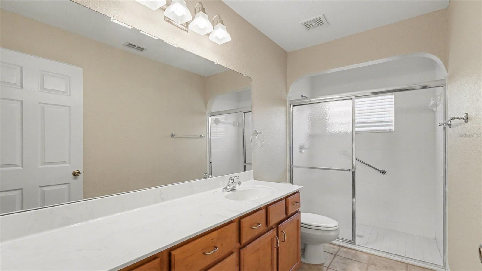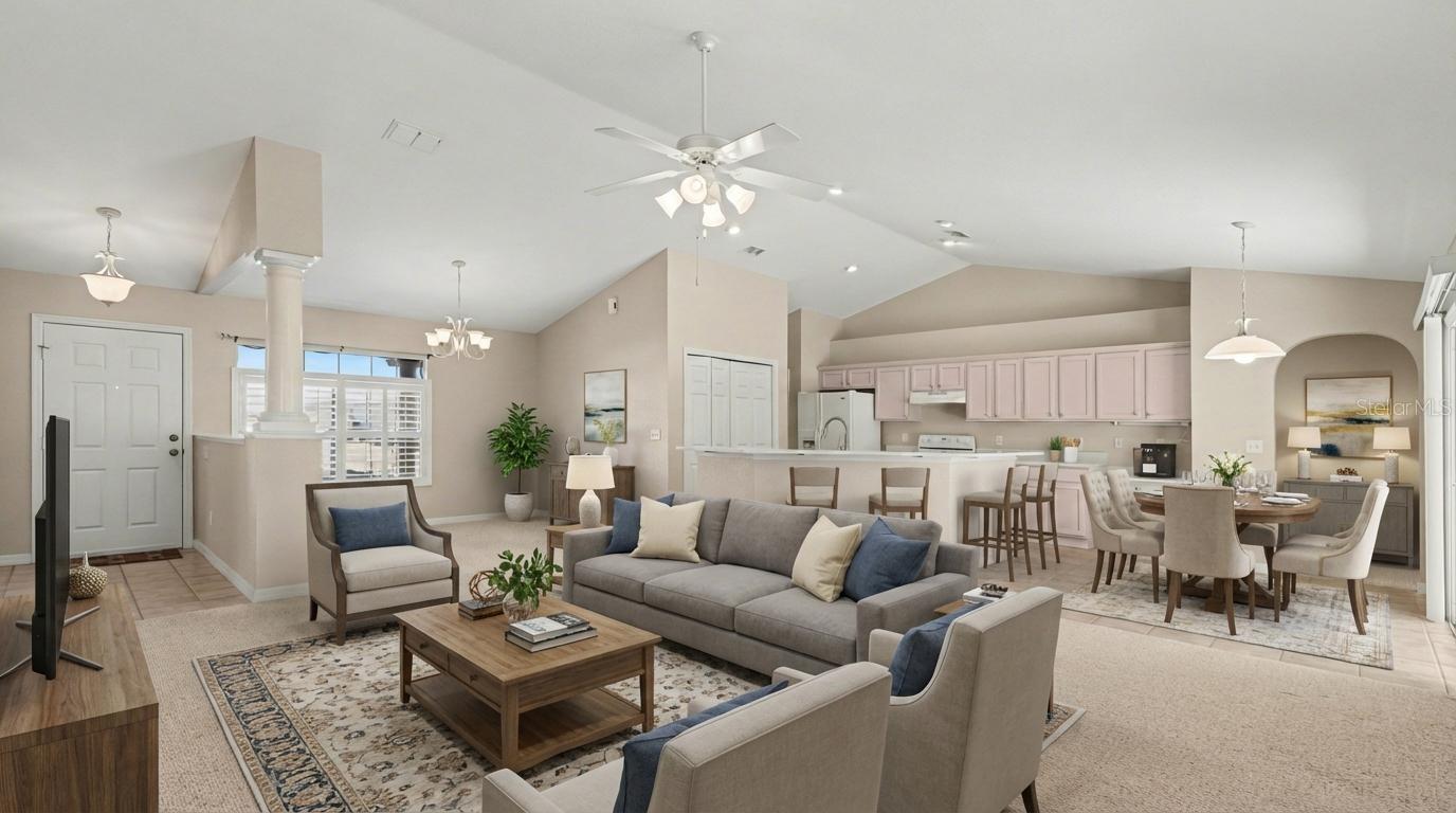 Private gated STONECREST golf & active adult community. Spacious 3 BEDROOMS / 3 FULL BATHS home on desirable QUARTER ACRE CORNER LOT. Open floor plan with CATHEDRAL CEILINGS, SPLIT BEDROOM LAYOUT, TWO PRIMARY SUITES, DEN / FLEX SPACE, inside laundry with utility sink, and lanai. PLANTATION SHUTTERS and ample storage throughout. Oversized GOLF CART GARAGE (543 SF) with shelving, attic access, utility door, keypad entry and workshop potential. UPDATED 4-TON TRANE HVAC (2021) and NEW ROOF (2025) provide peace of mind. Enjoy 18-HOLE CHAMPIONSHIP GOLF, FITNESS CENTER, INDOOR SALTWATER POOL & SPA, four community pools, clubhouse dining, PICKLEBALL & TENNIS COURTS, and 90+ CLUBS & ACTIVITIES. Ideal for an ACTIVE LIFESTYLE in central Florida. Welcome to your new home in Summerfield!