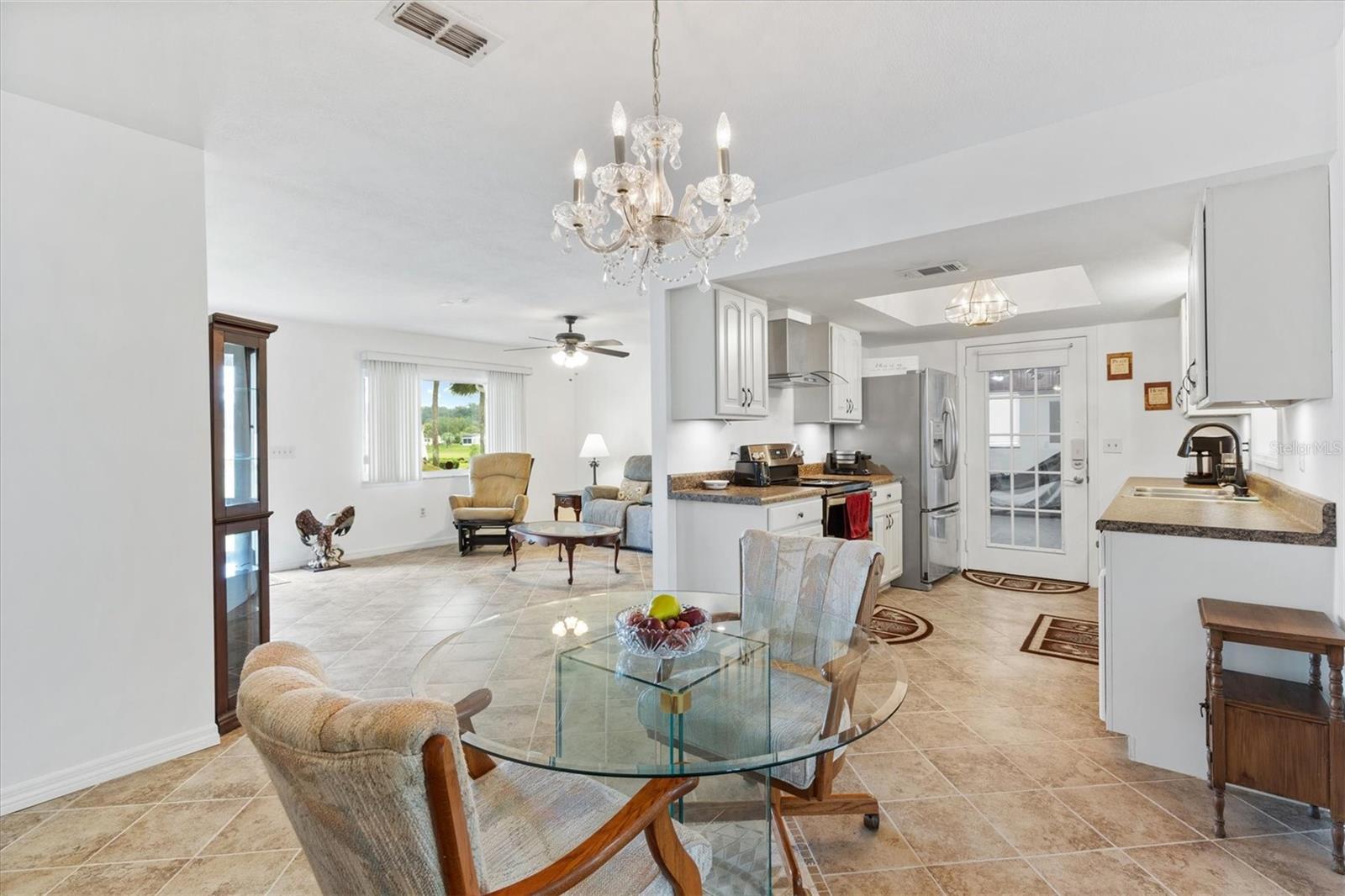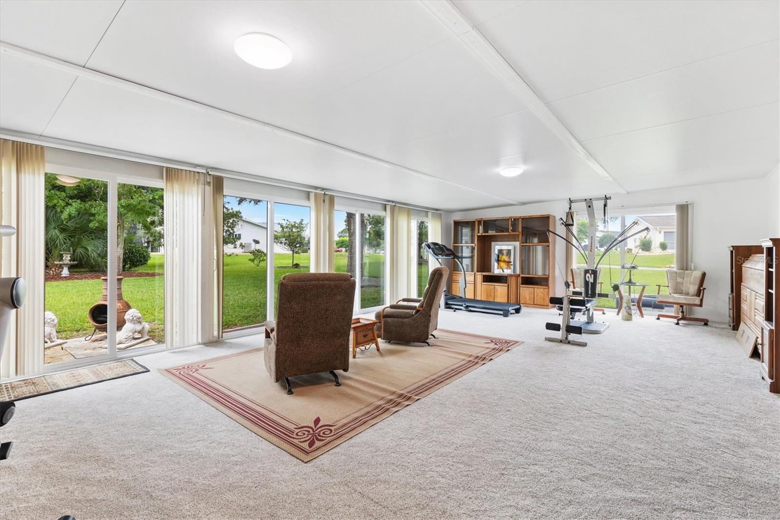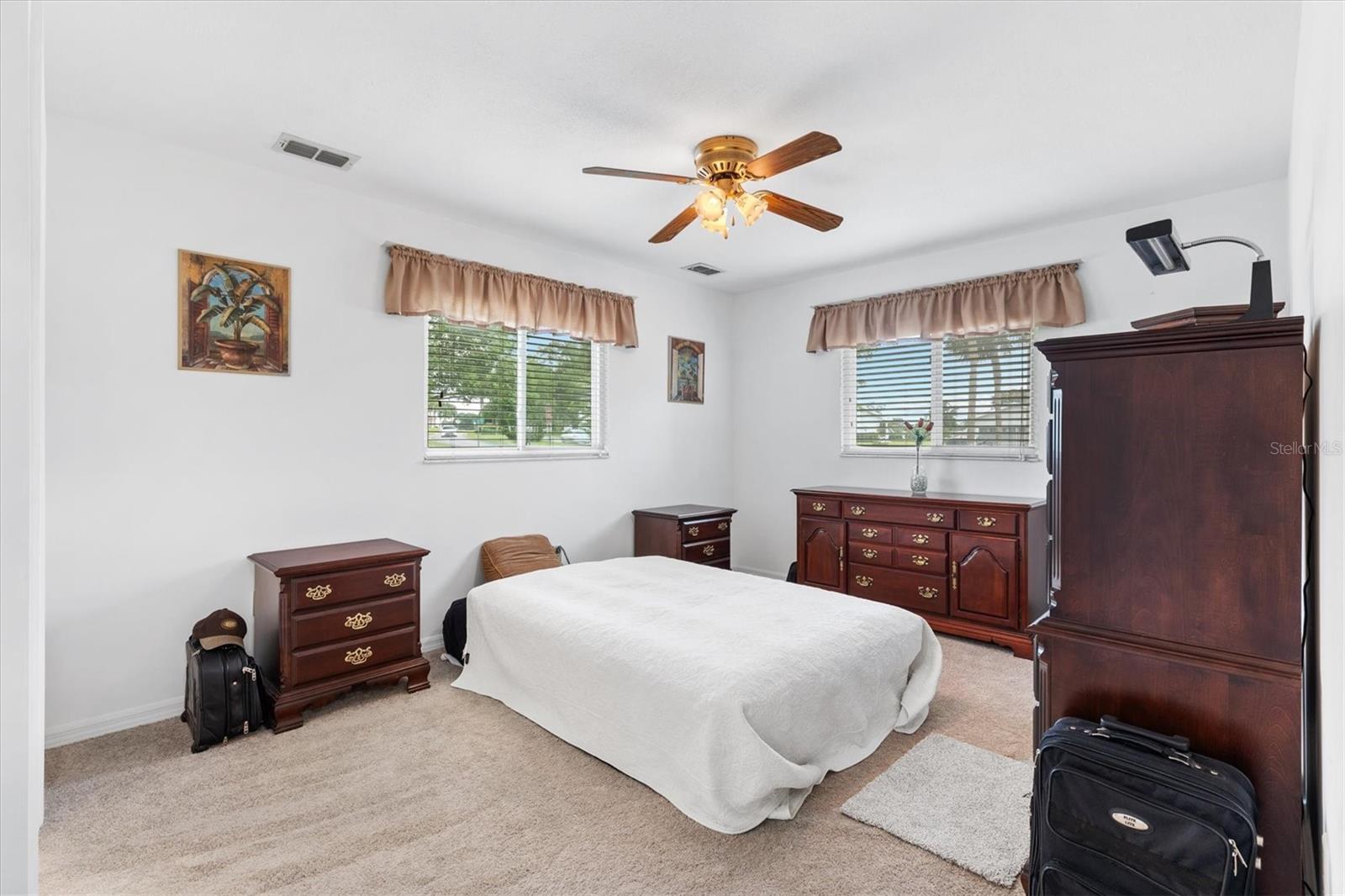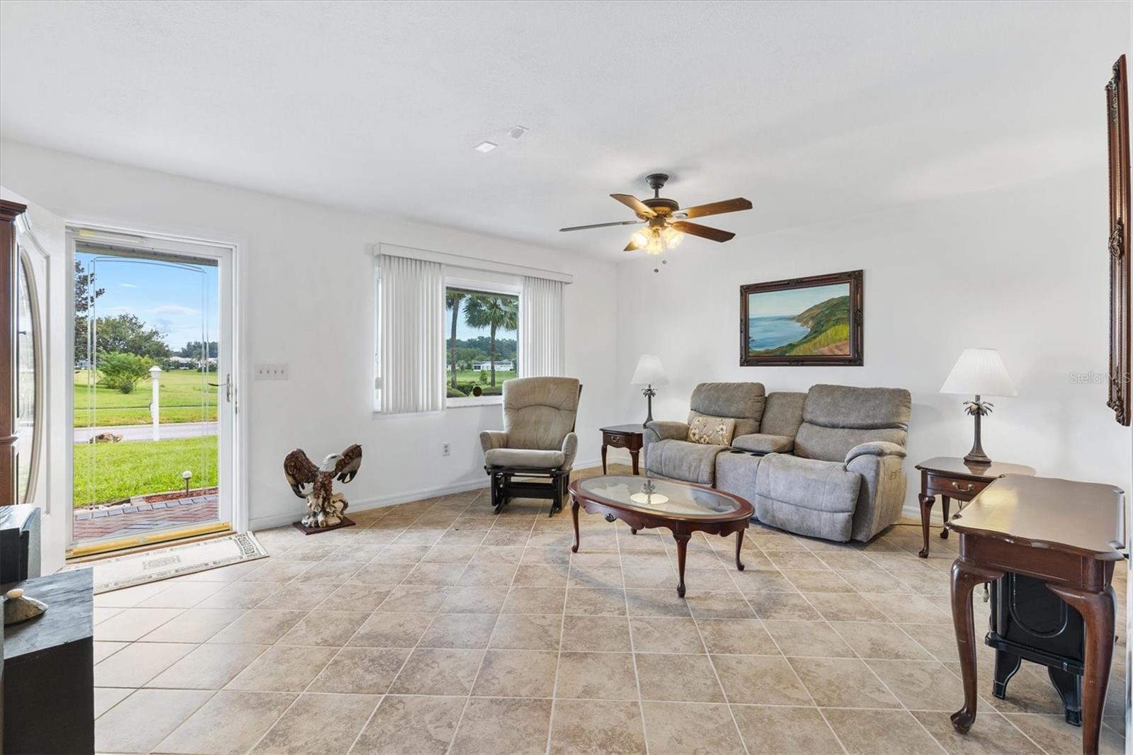 Golf course view! Every man’s dream workshop/garage/mancave! As you approach the home you will notice the beautiful curb appeal. Situated on a large corner with new vinyl siding, an extended brick-paved driveway and covered front porch. You will enjoy sitting out front and taking in the view of the ponds, lighthouse and golf course. When you enter the home, you will be greeted by a lovely lead glass entry door. You can see straight through the dining room to the 19x32 Florida room open to the rest of the home with heat and air. This lovely 2/2 pecan has been extended and very well cared for. The kitchen and both bathrooms have been updated. Beautiful, Italian ceramic tiled floors through the kitchen, living room, dining room, hallway & main bath. The master bedroom & Florida room both have new carpet. The 2nd bedroom, master bath and master walk-in closet all have new vinyl plank flooring. All of the furnishings will stay with the home. The added 22x40 garage with room for up to 4 vehicles or a boat and any of your toys. There is a golf cart area with a garage door for easy access. There are also built-in cabinets for more storage. This area has so much potential. The current owner finished the interior of the added garage with everything but heat & air. He replaced the HVAC in 2016 with a 3-ton unit to be able to heat & cool the entire area. The original 2 car garage has screen enclosure. The roof on the addition was completed in 2013, the roof on the original structure was replaced in 2007. NEW ROOF COMING IN NOVEMBER 2024!! Newer vinyl double pane windows were added in 2013. The siding was replaced in 2023. Conveniently located just 1 block from the pool & community center. Spruce Creek South, a 55+ Gated Golf Course Community just 2 miles north of The Villages. Community Center offering exercise facilities, saunas, dance and exercise classes, social activities, billiards, library and more! Golf cart access to shopping, physicians, pharmacies, and restaurants! DON’T MISS THIS HOME, CALL FOR YOU PRIVATE SHOWING TODAY.