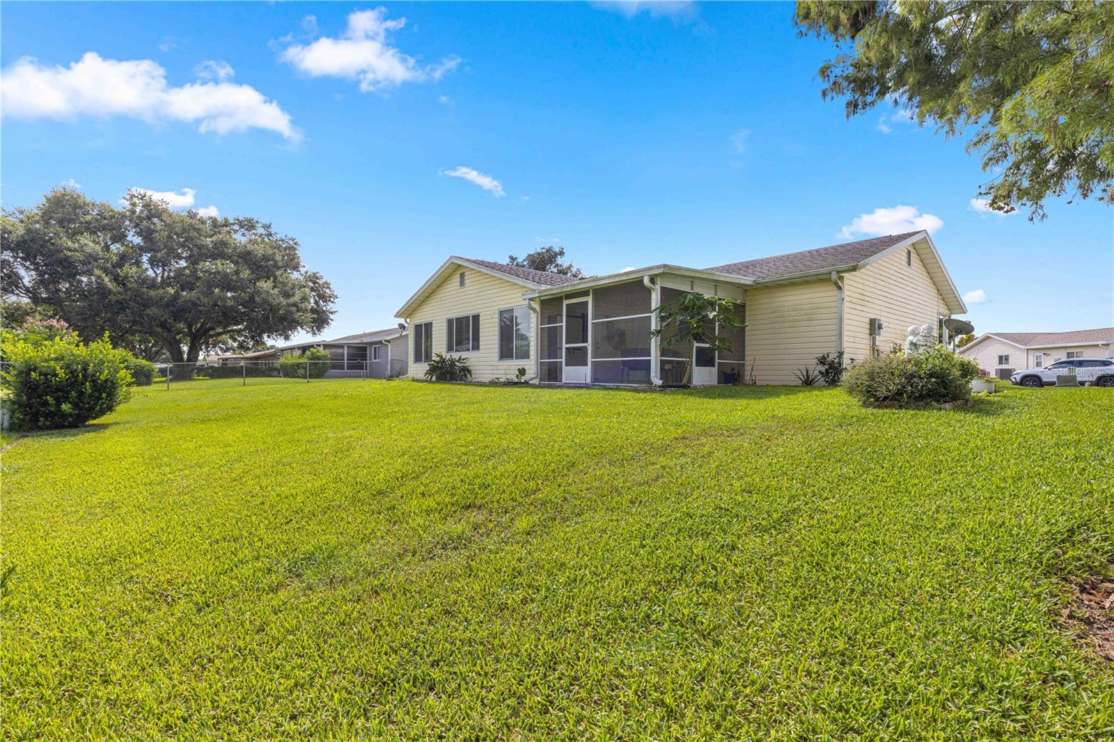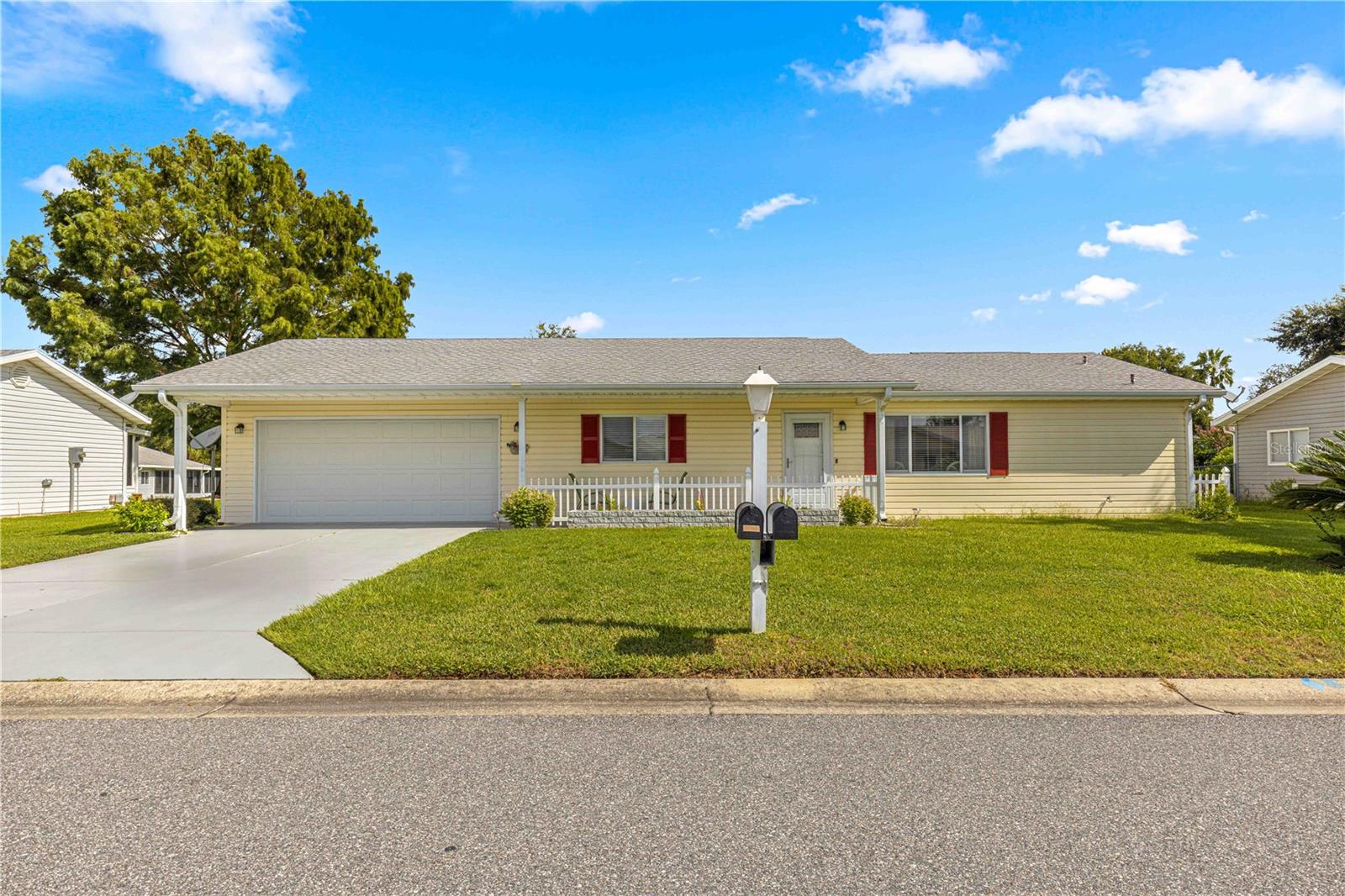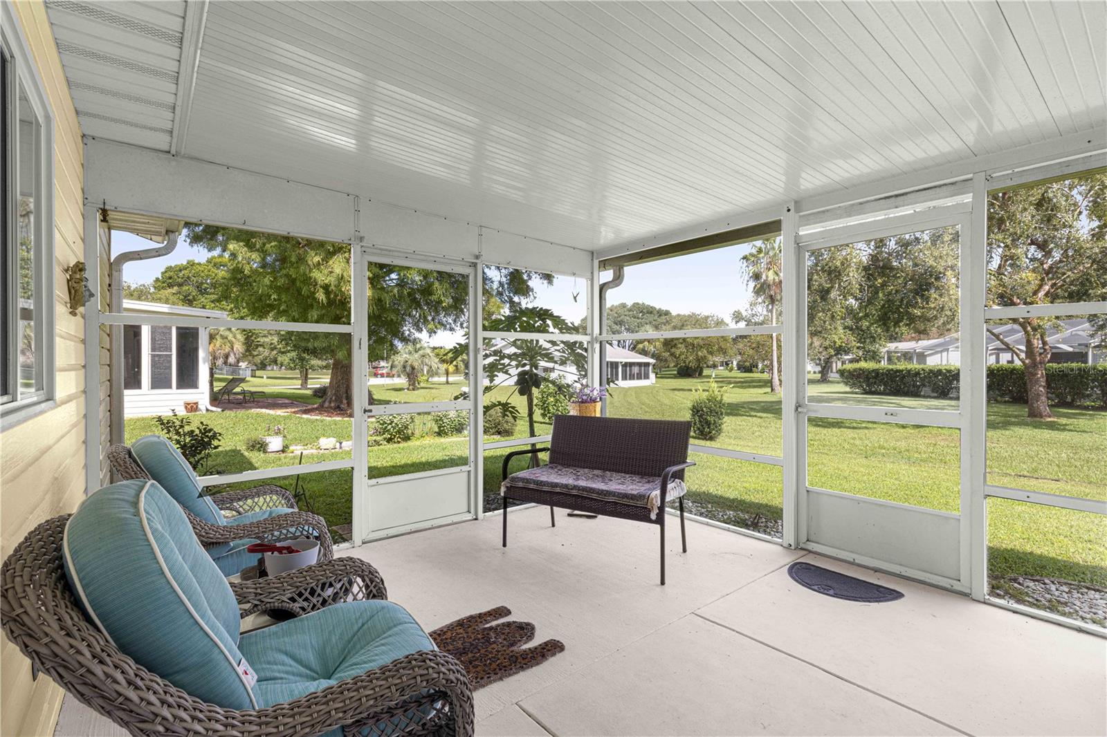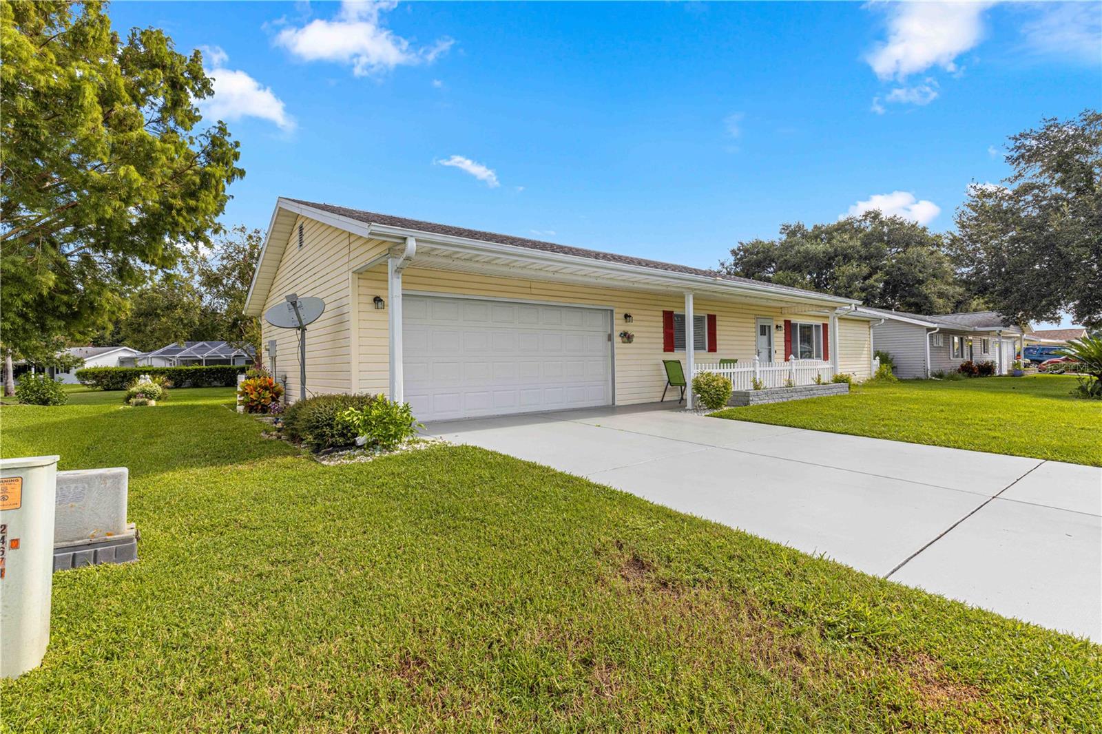 Discover the perfect blend of comfort and convenience in this well maintained two bedroom, two bath expanded fir. Located in the desirable 55 plus community of Spruce Creek south in Central Florida. This inviting residence features tile flooring throughout and boasts an extra large Florida room, seamlessly integrated with central air and adorned with glass windows, offering a serene space to relax year around. The galley kitchen is equipped with newer appliances including a refrigerator, range, and microwave. Enjoy casual meals in the cozy breakfast nook, or the covered outdoor patio The master bedroom is situated towards the back of the home and the master bath features a walk in shower for easy accessibility, while the second bathroom offers a luxurious custom walk in, sit down tub combo with water jet, and lights. Perfect for unwinding after a long day. Additional highlights include a two-car garage, painted driveway, a small covered front porch, spacious backyard with a large grassy area, and an electric on demand water heater for energy efficiency. All this a short golf cart ride away from The Villages, offering entertainment, shopping, medical facilities, and more. Seller giving a $10,000 credit at closing to replace roof.