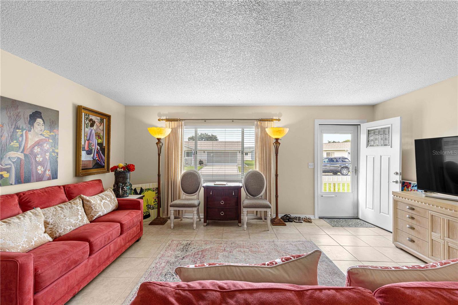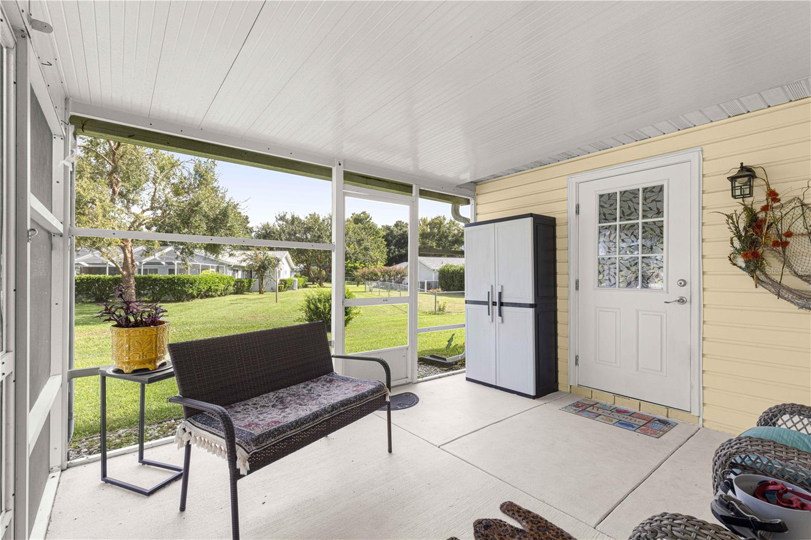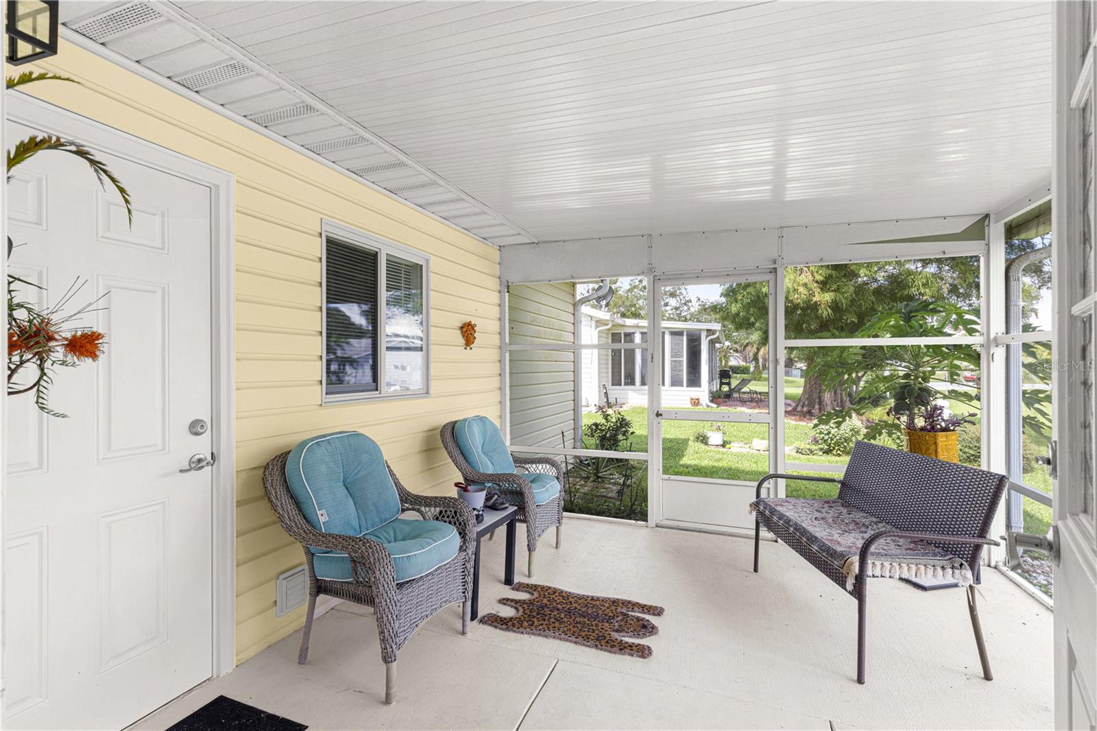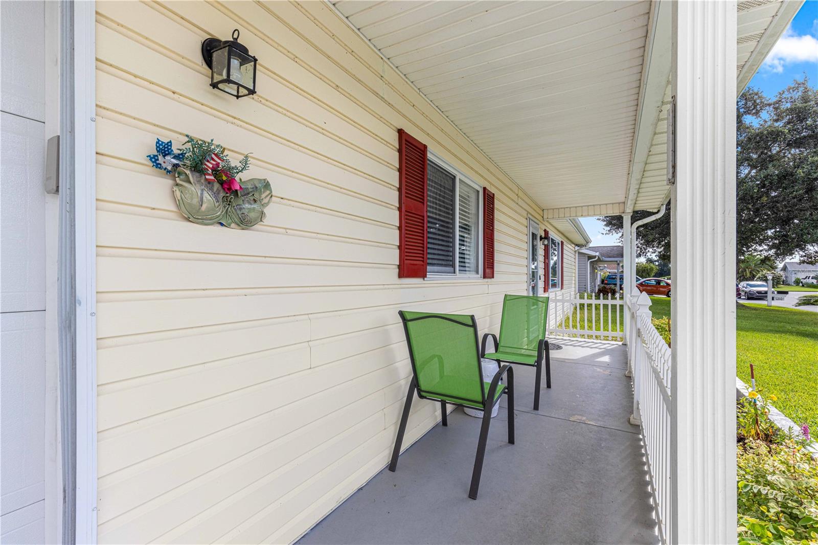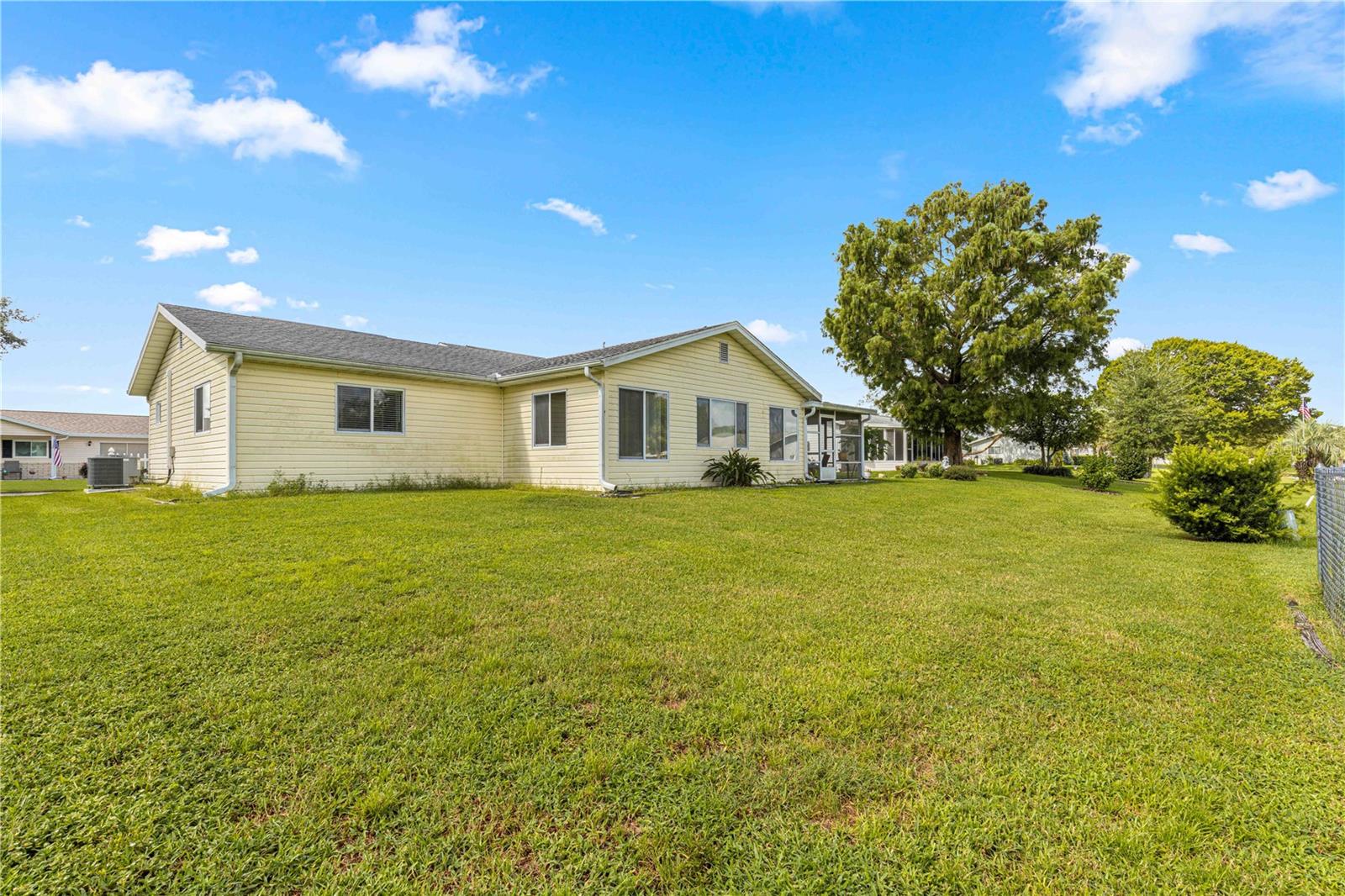 Discover the perfect blend of comfort and convenience in this well maintained two bedroom, two bath expanded fir. Located in the desirable 55 plus community of Spruce Creek south in Central Florida. This inviting residence features tile flooring throughout and boasts an extra large Florida room, seamlessly integrated with central air and adorned with glass windows, offering a serene space to relax year around. The galley kitchen is equipped with newer appliances including a refrigerator, range, and microwave. Enjoy casual meals in the cozy breakfast nook, or the covered outdoor patio The master bedroom is situated towards the back of the home and the master bath features a walk in shower for easy accessibility, while the second bathroom offers a luxurious custom walk in, sit down tub combo with water jet, and lights. Perfect for unwinding after a long day. Additional highlights include a two-car garage, painted driveway, a small covered front porch, spacious backyard with a large grassy area, and an electric on demand water heater for energy efficiency. All this a short golf cart ride away from The Villages, offering entertainment, shopping, medical facilities, and more. Seller giving a $10,000 credit at closing to replace roof.