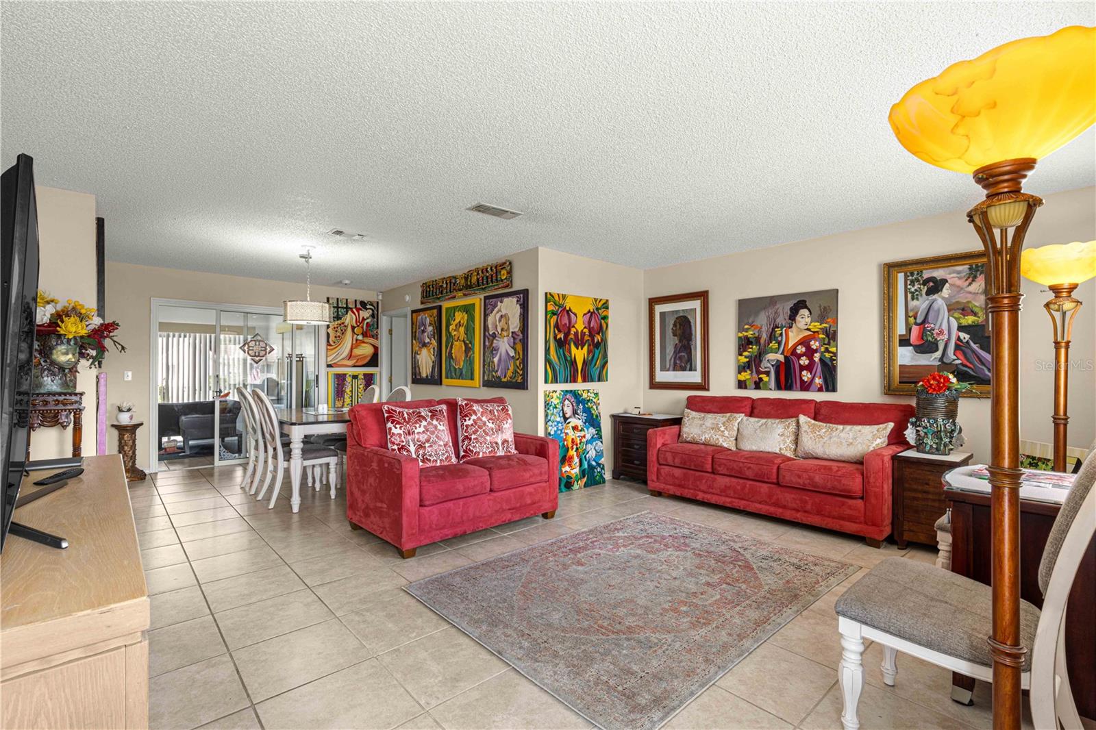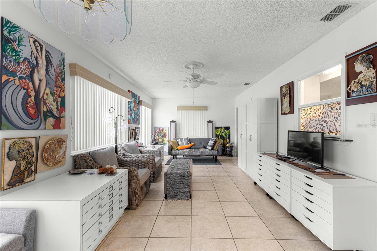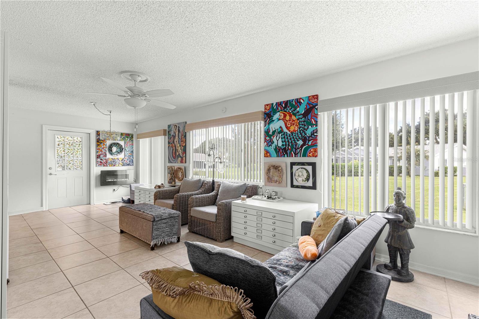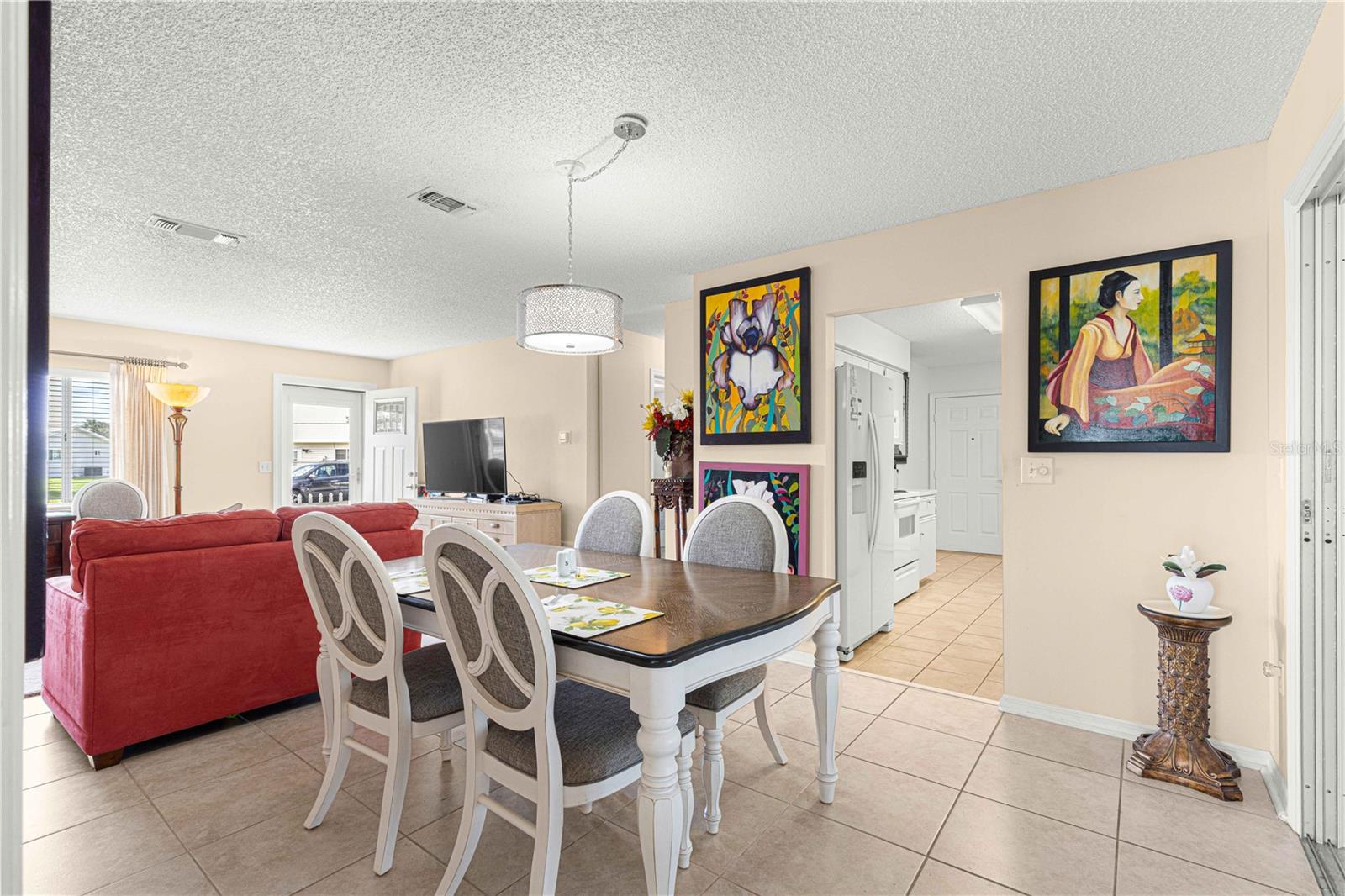 Discover the perfect blend of comfort and convenience in this well maintained two bedroom, two bath expanded fir. Located in the desirable 55 plus community of Spruce Creek south in Central Florida. This inviting residence features tile flooring throughout and boasts an extra large Florida room, seamlessly integrated with central air and adorned with glass windows, offering a serene space to relax year around. The galley kitchen is equipped with newer appliances including a refrigerator, range, and microwave. Enjoy casual meals in the cozy breakfast nook, or the covered outdoor patio The master bedroom is situated towards the back of the home and the master bath features a walk in shower for easy accessibility, while the second bathroom offers a luxurious custom walk in, sit down tub combo with water jet, and lights. Perfect for unwinding after a long day. Additional highlights include a two-car garage, painted driveway, a small covered front porch, spacious backyard with a large grassy area, and an electric on demand water heater for energy efficiency. All this a short golf cart ride away from The Villages, offering entertainment, shopping, medical facilities, and more. Seller giving a $10,000 credit at closing to replace roof.