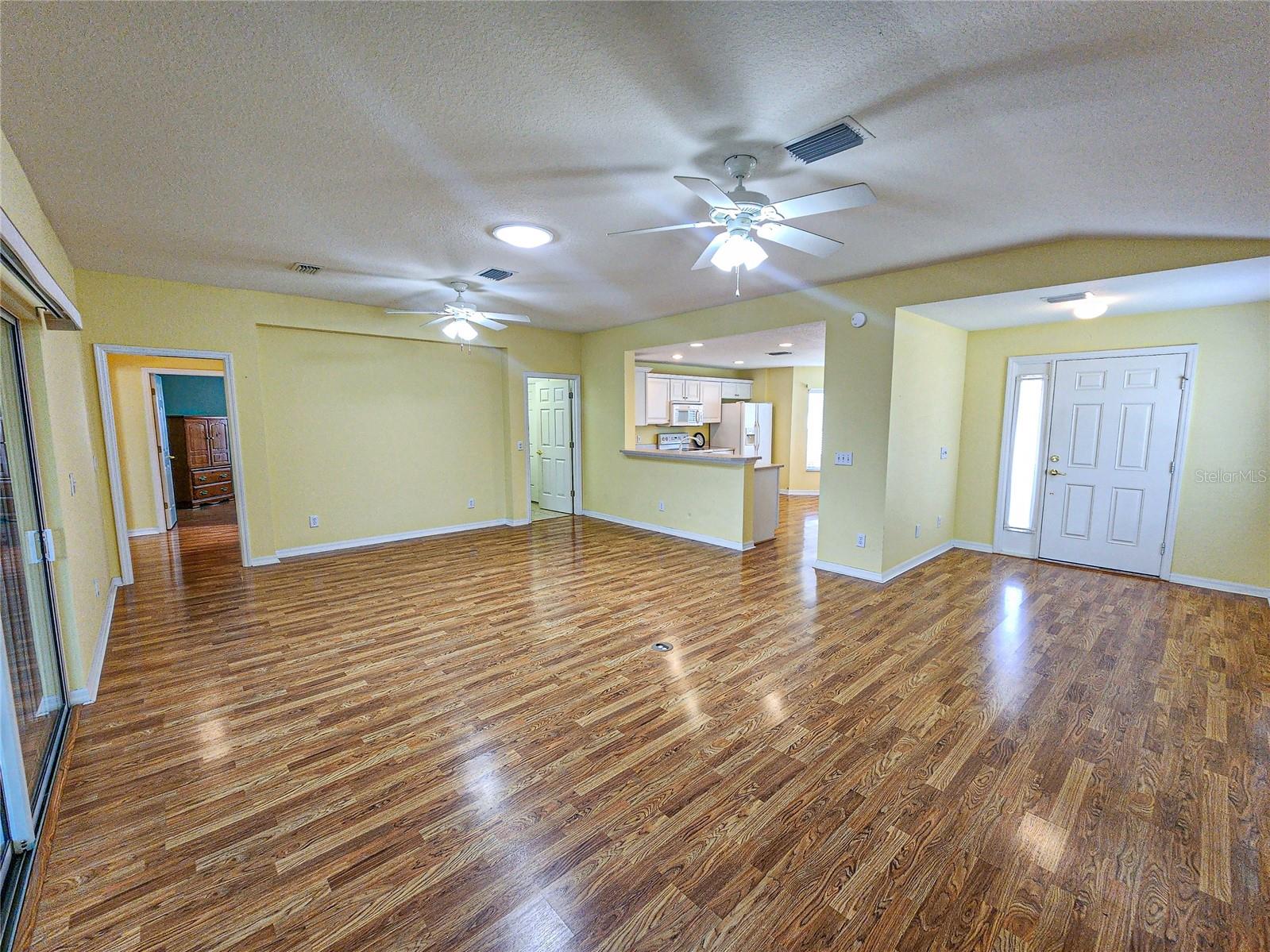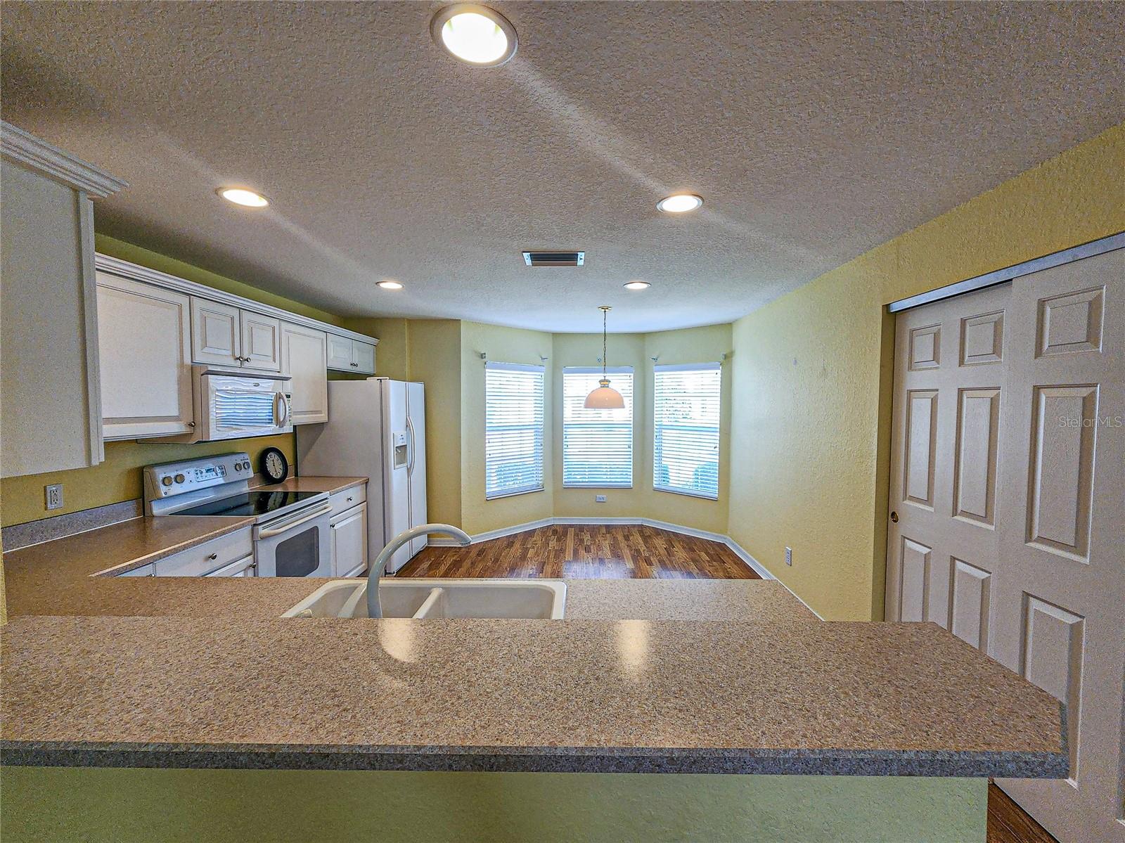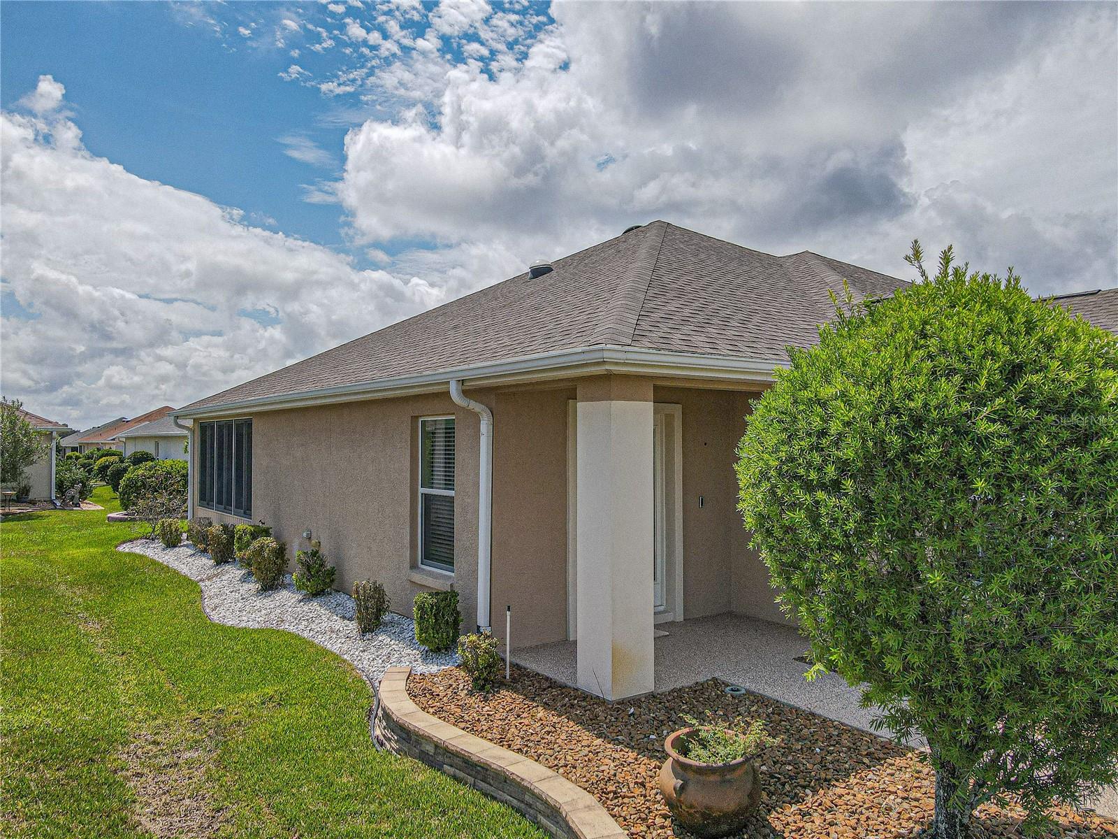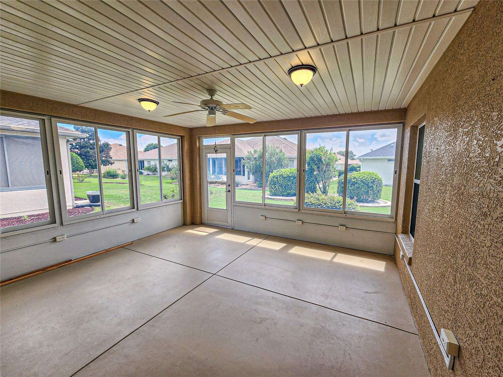 Welcome to this charming Challedon model home, nestled in the highly sought-after 55+ Del Webb Golf & Country Club Community. This meticulously maintained home offers fantastic curb appeal with textured driveway, sidewalk, hacienda landscape wall, and screen door on the garage. Step inside to a bright and inviting living room with combined dining area and easy to maintain laminate flooring. The front and inviting kitchen, is enhanced by a beautiful bow window that floods the space with natural light into the eat in area. The kitchen cabinets feature convenient pull-outs, a large pantry, and a breakfast bar, perfect for casual meals. The formal dining and living room combo are ideal for entertaining. The primary suite is spacious, with easy to maintain laminate floor, while the primary bath boasts double sinks, walk-in shower, tile floor, and plenty of storage. The guest bedroom and bath are equally comfortable for your guests. Enjoy the benefits of a private irrigation well, designed to help save on water costs. The garage comes with an epoxy paint finish for easy clean up, while the HVAC was replaced in 2020, re-shingled in 2014, and the home has been re-piped for peace of mind. Enjoy the acrylic window enclosed Lania year round with its beautiful view of the tranquil Florida oasis with landscaped islands. Don't miss this opportunity to enjoy resort-style living in a vibrant 55+ community!