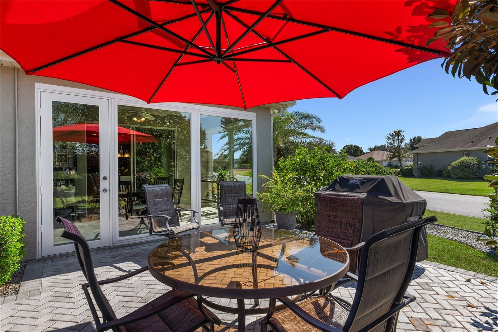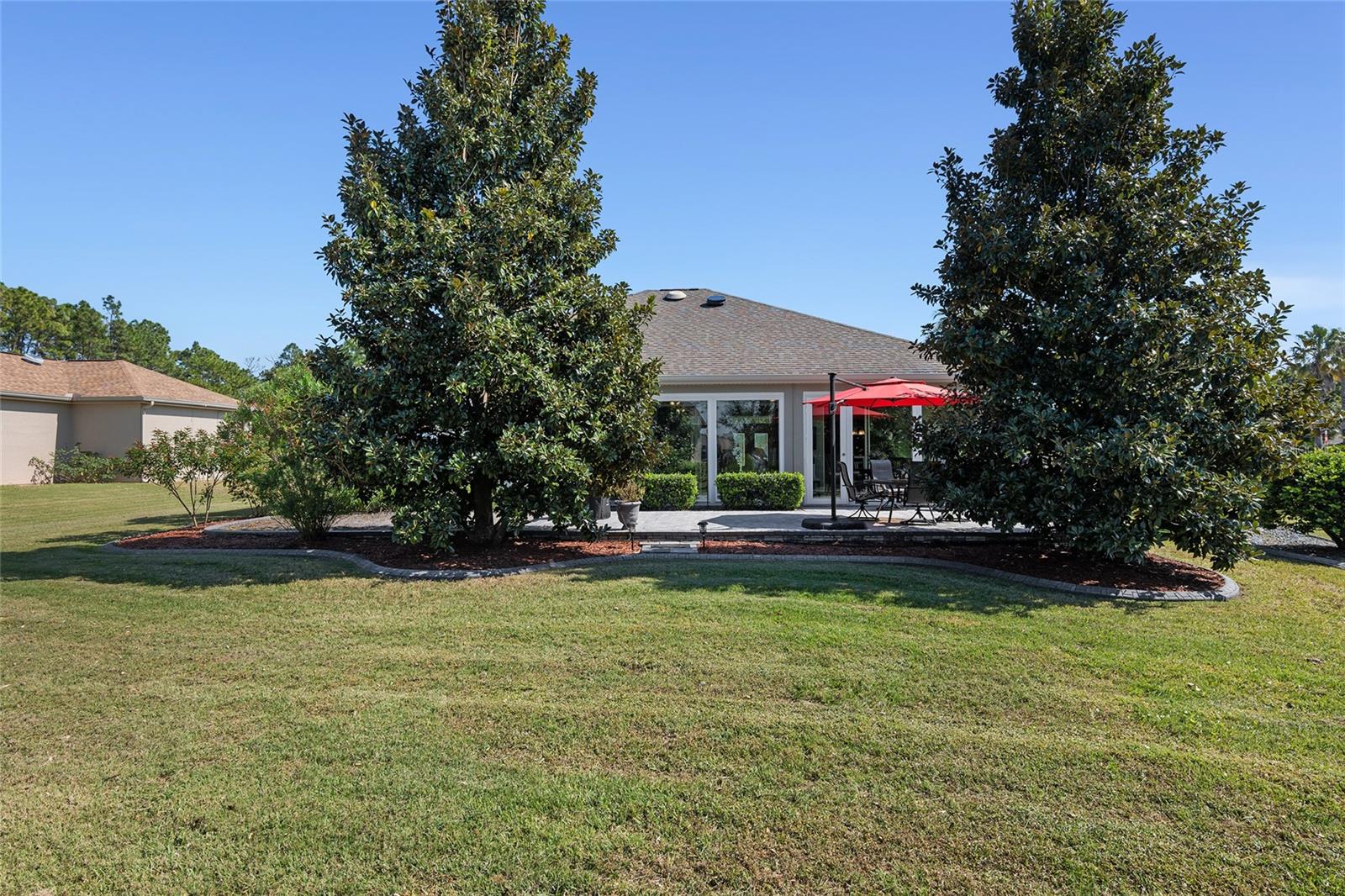 Right out of a magazine, this stunning HANOVER sits on a 1/3 acre oasis in the neighborhood of SHERWOOD. This extremely well maintained 3/2 boasts Concrete Block Stucco Construction, beautiful leaded glass double door entry. This spacious floor plan offers a large dining room as well as an eat-in kitchen. The Kitchen has upgraded tall oak cabinets with roll-out drawers along with Quartz Countertops and tile backsplash, plus additional cabinets with desk space. The primary bath has a tub and a large glassed shower along with taller vanities. Flooring is 18” Tile in main areas and bedroom floors of carpet & engineered wood. The comfortable 10'x32' Lanai has been converted to climate controlled additional living space and has large Argon filled glass windows with remote controlled power solar shades overlooking the elevated 28’x18’ resort-like brick paver patio, an 18’x18’ garden area and the private park-like landscaped back yard. You will find plantation shutters, large crown molding, a private irrigation well, lots of extra insulation, an extended garage with extensive built-in shelving, AND A 20’ DEEP GOLF CART GARAGE. Pipes were replaced in 2021, Exterior Painted in 2024, all new Kitchen Appliances in 2022, New roof 2018, New HVAC 2017…AN SO MUCH MORE. PHOTOS CANNOT CONVEY THE COMFORT OF THIS HOME AND ENJOYMENT OF RELAXING & ENTERTAINING ON THIS OUTSTANDING LANAI AND PATIO. Note: With the lanai opened to the home, this home actually has AN ADDITIONAL 320 SQUARE FEET OF LIVING SPACE MAKING THE TOTAL UNDER GLASS, ROOF, AND AIR CONDITIONING 2,278 SQUARE FEET . AWARD-WINNING Del Webb Spruce Creek Golf & Country Club is a GATED, 3,250 home, +55 Community with over 70 clubs, 3 pools, 3 spas, a Clubhouse, a Fitness Center, Bocce Ball, Shuffleboard, 12 Pickle ball Courts, 7 Tennis Courts, Sand Volleyball, Water Volleyball, Lake Vista Gazebo, Pavilions, Walking Paths and so much more! Come see this beautiful community with a GORGEOUS Tree Canopy on the Boulevard and its Restaurant, Liberty Grille. Come, enjoy the four (4) 9-hole Golf Courses today and begin living your BEST LIFE! IF YOU ARE LOOKING FOR THAT OVER-THE-TOP 3-BEDROOM HOME THAT FEELS LIKE IT IS IN ITS OWN PRIVATE WORLD....YOU MUST SEE THIS HOME!!