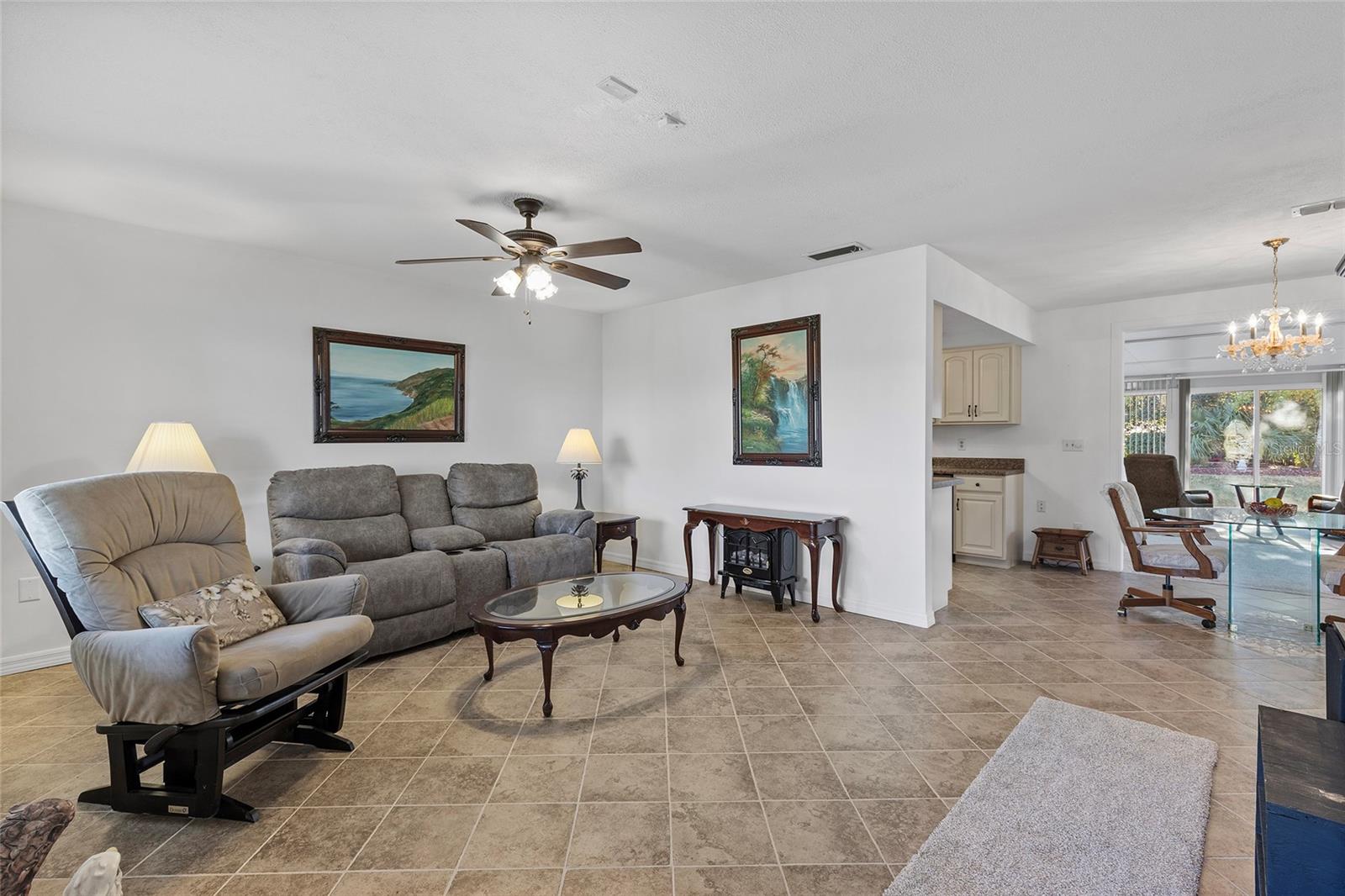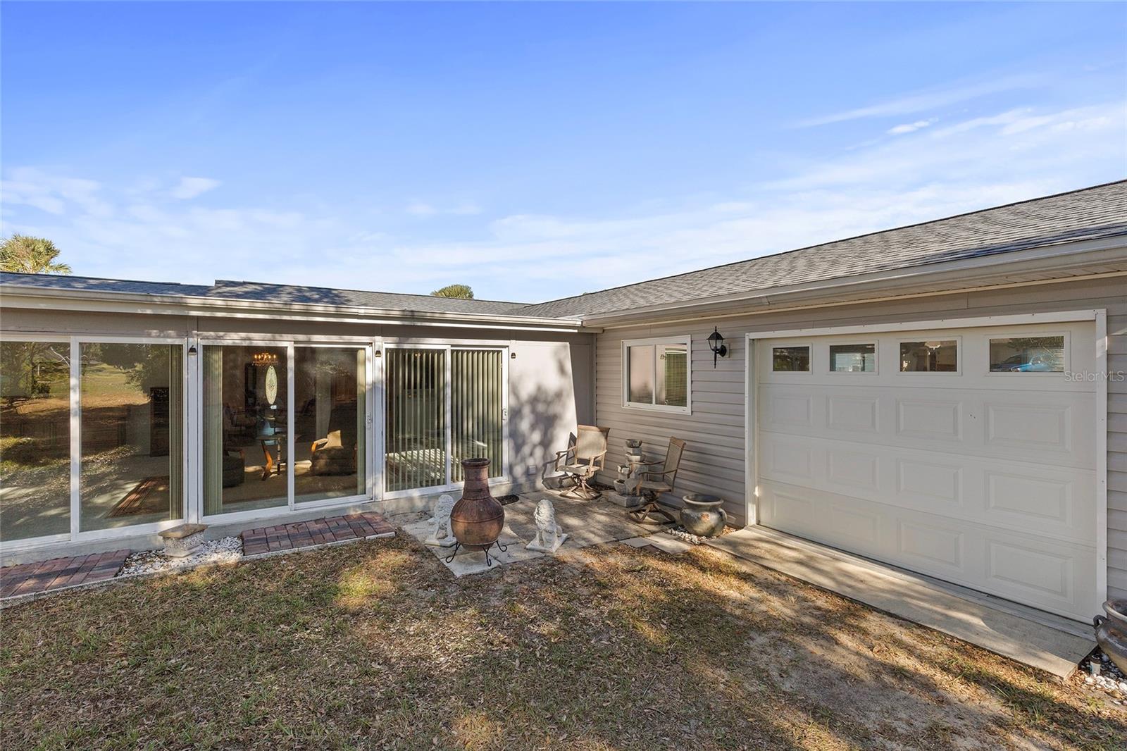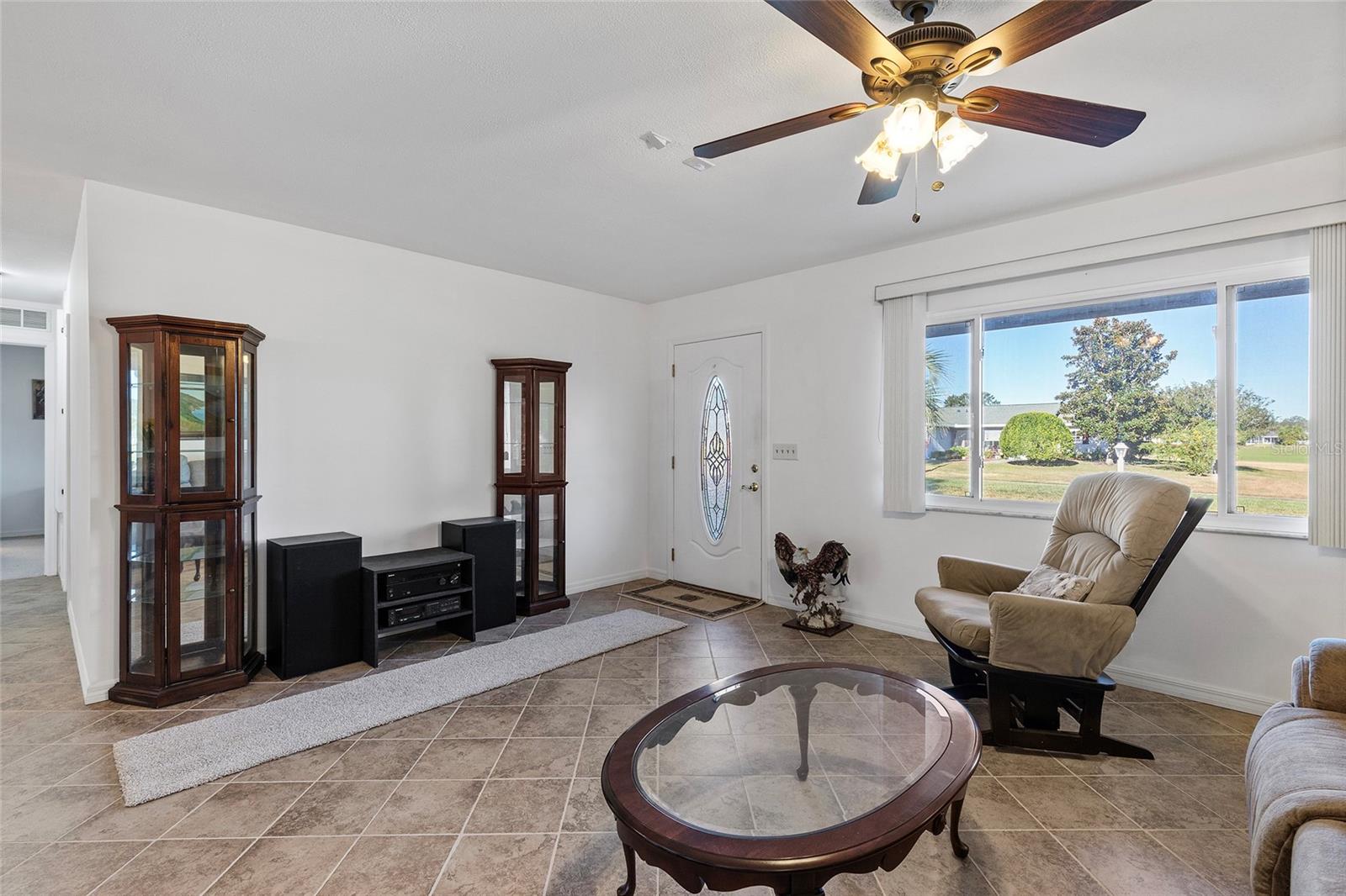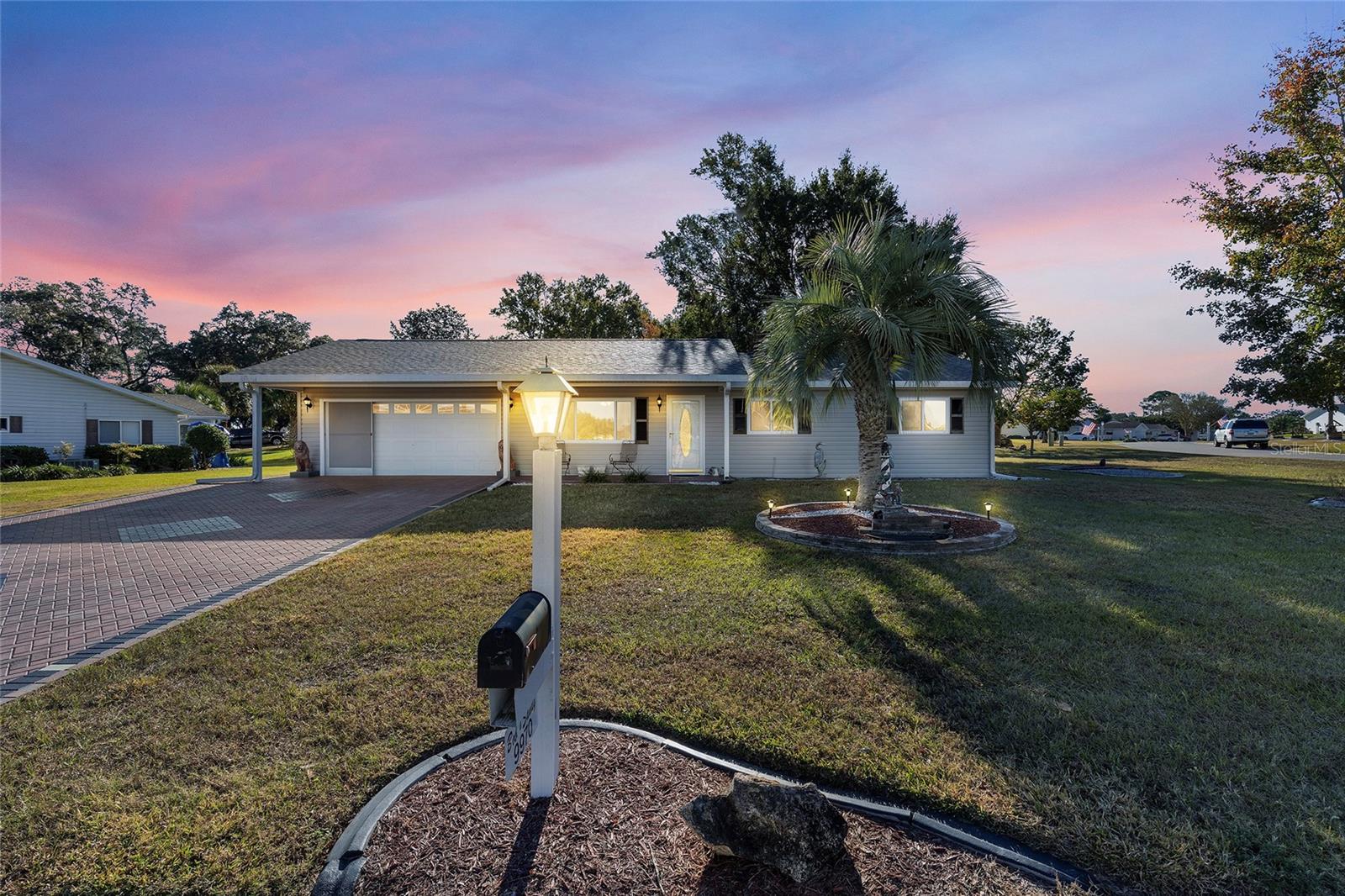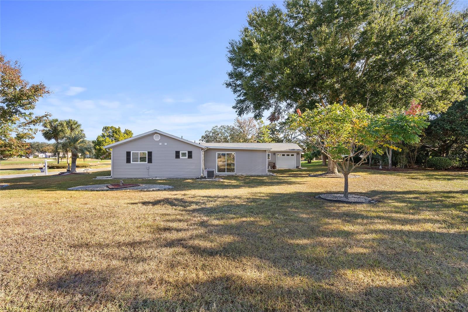 EXCEPTIONAL GARAGE AND WORKSHOP SPACE IDEAL FOR HOBBYISTS OR COLLECTORS.***NEW ROOF 2024, HVAC SYSTEM 2016, NEW VINYL SIDING 2023*** Meticulously maintained home in the sought after 55+ Gated Golf Community of SPRUCE CREEK SOUTH, with all the amenities, adjacent to The Villages, Florida. This home offers the perfect combination of charm, comfort, and functionality. SET ON A SPACIOUS CORNER LOT, the home’s exterior immediately catches the eye with its recent VINYL SIDING updated in (2023), extended brick paved driveway, and a welcoming covered front porch. THE OUTDOOR SPACE IS PERFECT FOR ENJOYING SERENE VIEWS OF THE NEARBY PONDS, A PICTURESQUE LIGHTHOUSE ON THE SIGNATURE HOLE OF THE LINKS GOLF COURSE. Stepping inside, the home opens with a welcoming lead glass entry door that leads into a thoughtfully extended and updated interior. A highlight of the home is the expansive Florida room, measuring 19 x 32 feet, which seamlessly connects to the main living space and is equipped with heat and air for year round comfort. The interior features Italian ceramic tile flooring through the kitchen, living and dining areas, hallway, and main bath, while the master bedroom and Florida room feature newly installed carpet. Updates to the second bedroom, master bath, and walk-in closet include new stylish and durable vinyl plank flooring. Both the kitchen and bathrooms have been tastefully updated, blending modern style with practicality. Vinyl double pane windows, installed in (2013), provide energy efficiency while allowing plenty of natural light. For added convenience, all furnishings will remain with the home, making it truly move-in ready. One of the standout features of this property is the oversized 22 x 40 foot garage. Designed to accommodate up to four vehicles or a boat, this space includes a dedicated golf cart area with its own garage door, as well as built-in cabinets for organized storage. The space is ready for a variety of uses and has been finished with care, though it is not yet heated or cooled. A 3-ton HVAC system, installed in (2016), is capable of extending climate control to this area if desired. The original two car garage also features a convenient screen enclosure. This home has seen numerous updates, including a NEW ROOF (2024). Its location within Spruce Creek South places it just a block from the community pool and center, ensuring convenient access to the neighborhood’s many amenities. Residents of Spruce Creek South enjoy a vibrant lifestyle with amenities like fitness facilities, saunas, organized classes, a library, and social activities. Golf cart access provides easy travel to local shopping, dining, medical offices, and more. This home offers a rare opportunity to enjoy the best of Florida living in an exceptional community. Schedule your private showing today to experience this unique property.