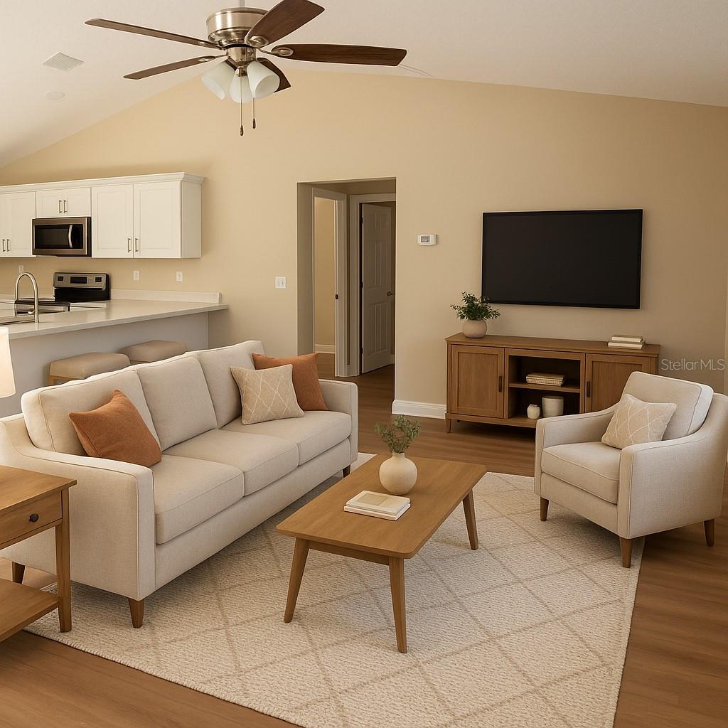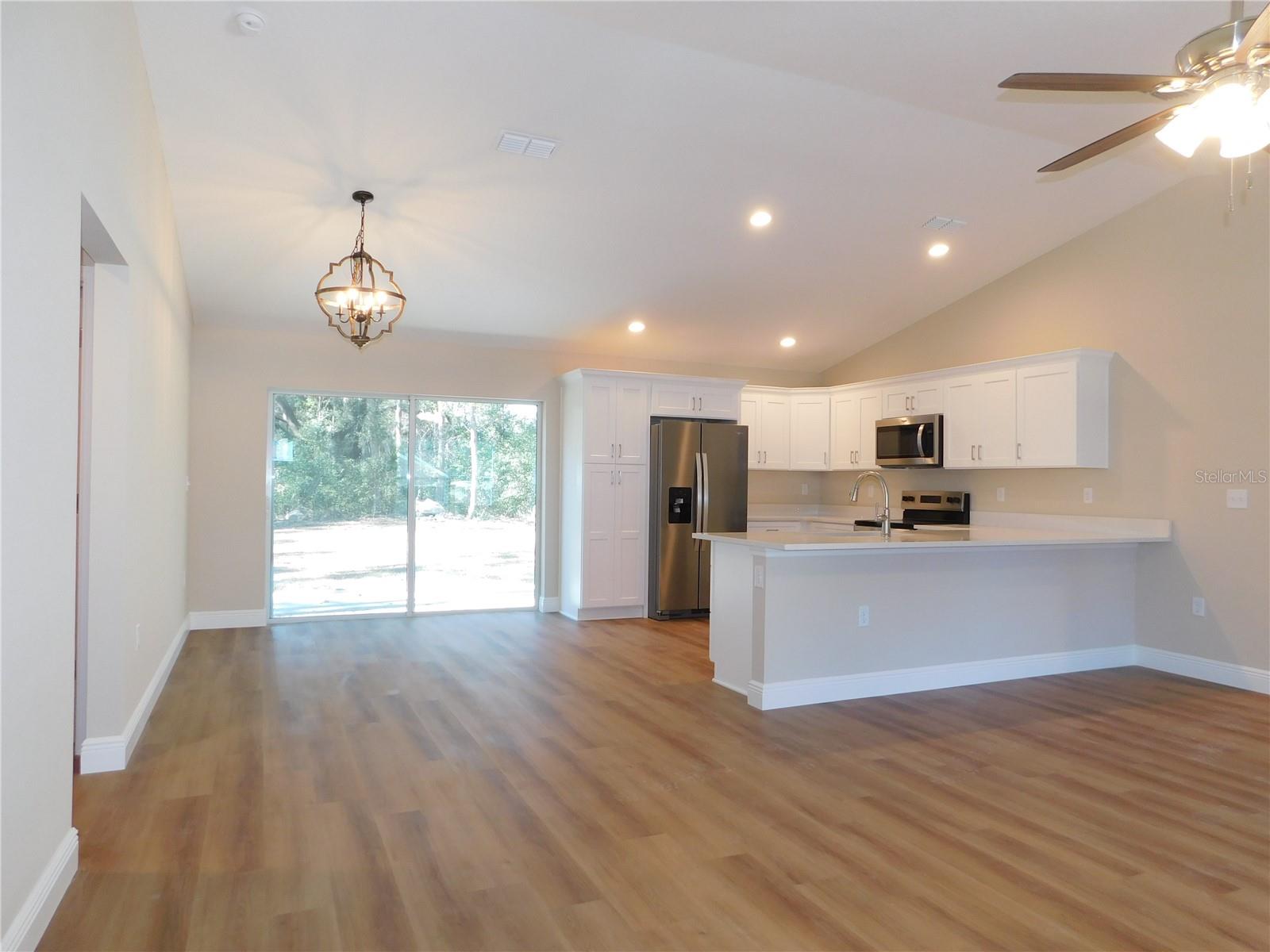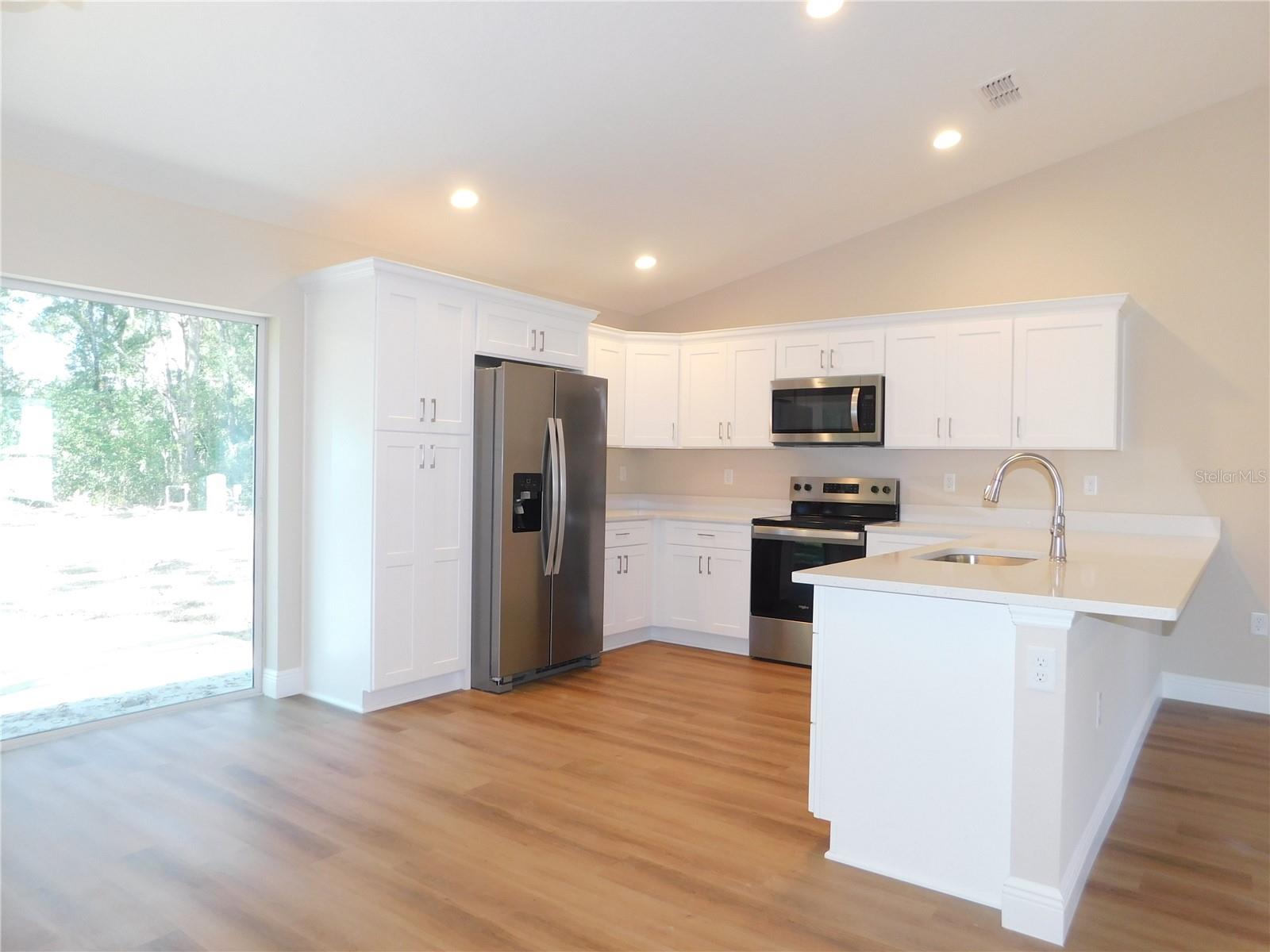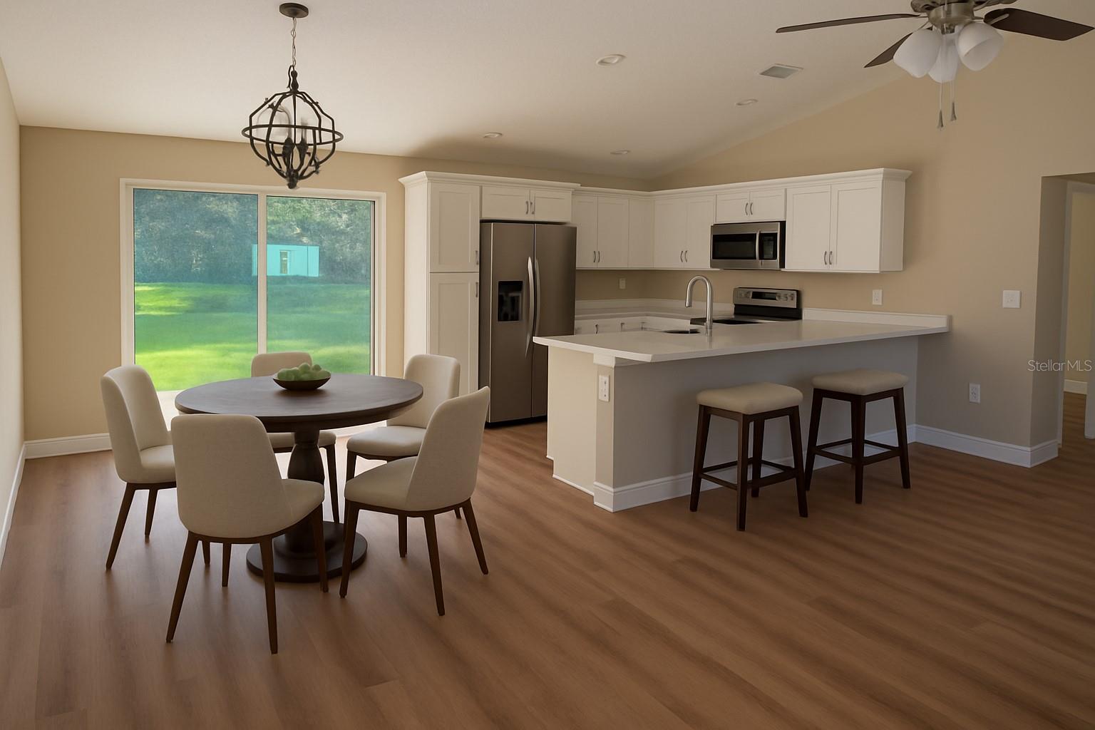 One or more photo(s) has been virtually staged. NEW CONSTUCTION! Take a look at this bright, new open concept, living home. Open kitchen with gorgeous center island. Stainless appliances. All the luxuries of entertainment style living! Spa like master bath, with very nice fixtures. Luxury vinyl plank flooring throughout the home. Beautiful white quartz countertops in the kitchen and baths. Ceramic tile surround in the guest bath. Builder's warranty. Fully sodded lot with irrigation. Builder has provided side yard access to park an RV or a metal building. No deed restrictions. Split bedroom floorplan, sliding doors to the quiet backyard. Enjoy the lifestyle of the Villages to your south and Ocala to your north. Great location and nothing to do but move right in!