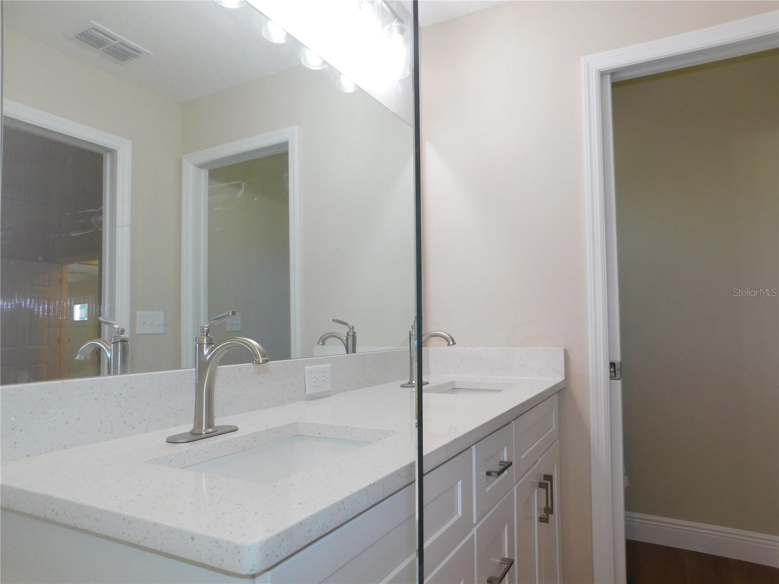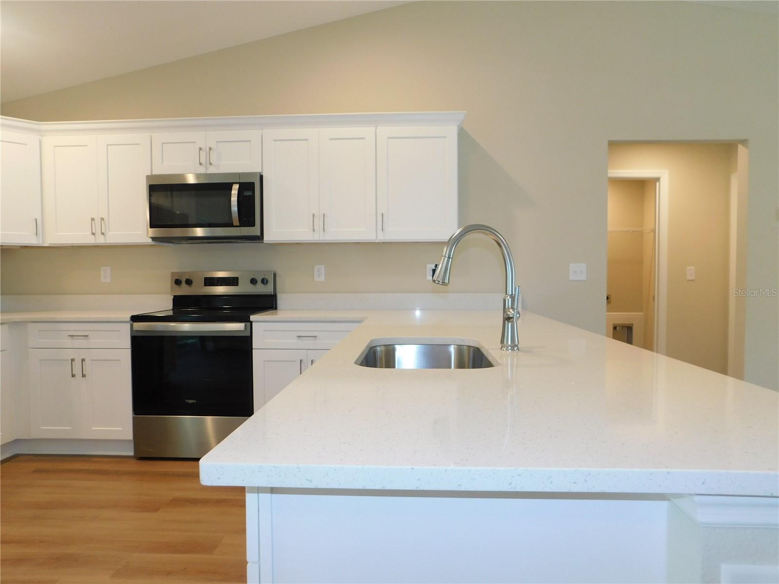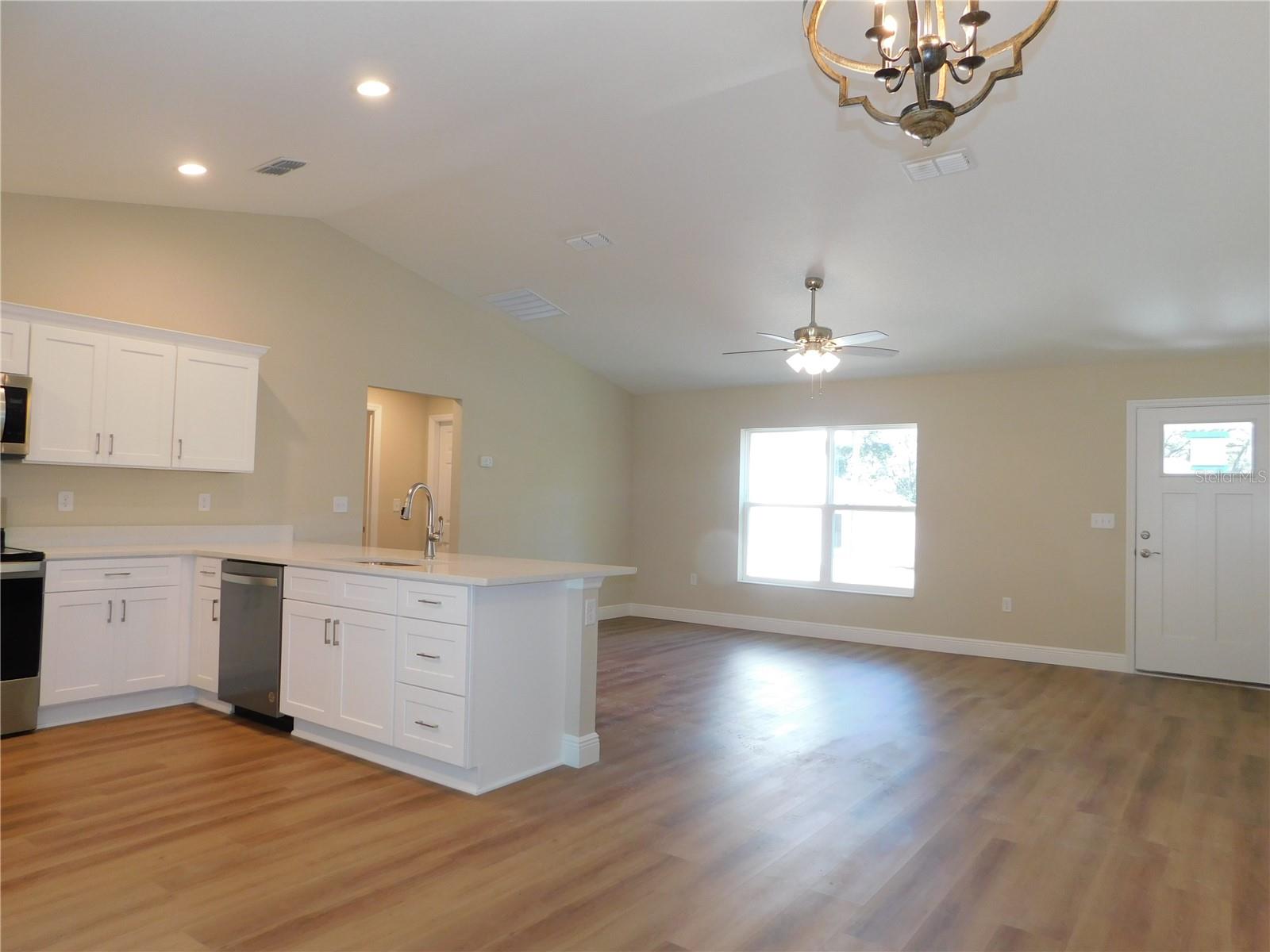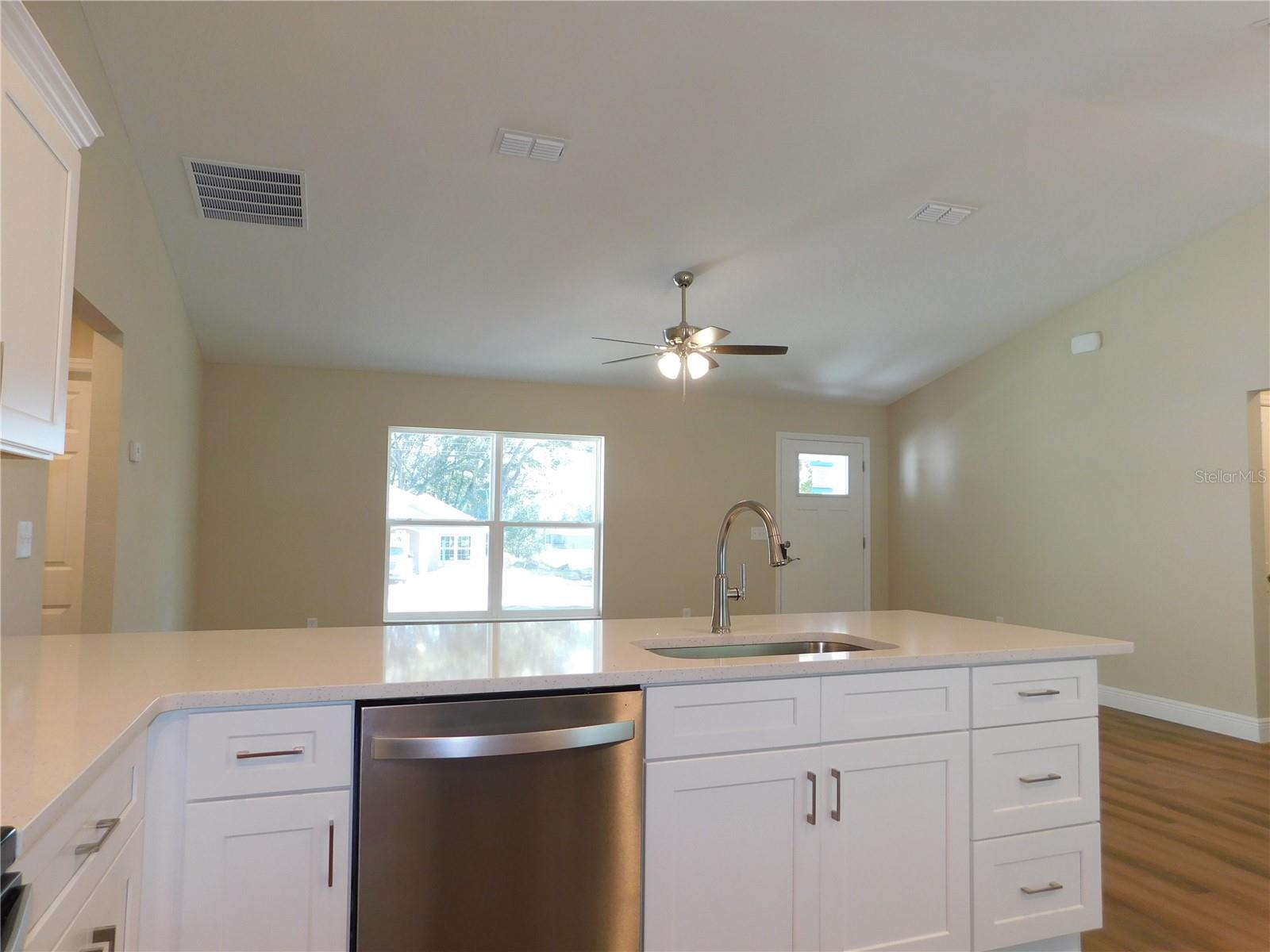 One or more photo(s) has been virtually staged. NEW CONSTUCTION! Take a look at this bright, new open concept, living home. Open kitchen with gorgeous center island. Stainless appliances. All the luxuries of entertainment style living! Spa like master bath, with very nice fixtures. Luxury vinyl plank flooring throughout the home. Beautiful white quartz countertops in the kitchen and baths. Ceramic tile surround in the guest bath. Builder's warranty. Fully sodded lot with irrigation. Builder has provided side yard access to park an RV or a metal building. No deed restrictions. Split bedroom floorplan, sliding doors to the quiet backyard. Enjoy the lifestyle of the Villages to your south and Ocala to your north. Great location and nothing to do but move right in!