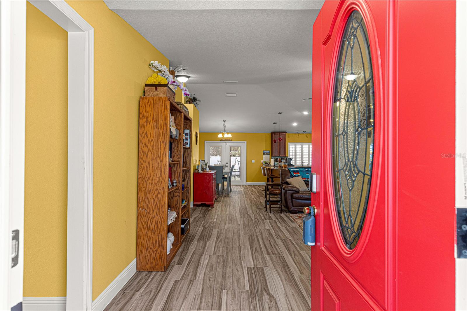 Bright, bold and brimming with charm this 2-bedroom, 2-bathroom home with an office/den that could easily be converted into a 3rd bedroom features tons of new updates including: all new paint inside & out, gutter guards, wood look tile flooring throughout, plantation shutters, filtration system, & much more! A step inside and you'll be greeted with an open concept plan with cathedral ceilings offering a large living room with plant shelves; eat-in kitchen with breakfast bar, granite countertops, & stainless steel appliances; spacious dining area; master with walk-in closet and en-suite bathroom with walk-in tiled shower; guest bedroom; guest bathroom; office/den which could easily be converted into a 3rd bedroom; a beautiful, sunny screen enclosed porch; large patio oasis for outdoor entertaining; and a lovely private vinyl fenced backyard complete with a shed perfect for a workshop/storage with existing electric in shed and for a hot tub! This home is absolutely immaculate, move in ready, and sits in a wonderful peacful community close to The Villages and Belleview offering a quick commute to tons of amenities! (No HOA or HOA fees.)