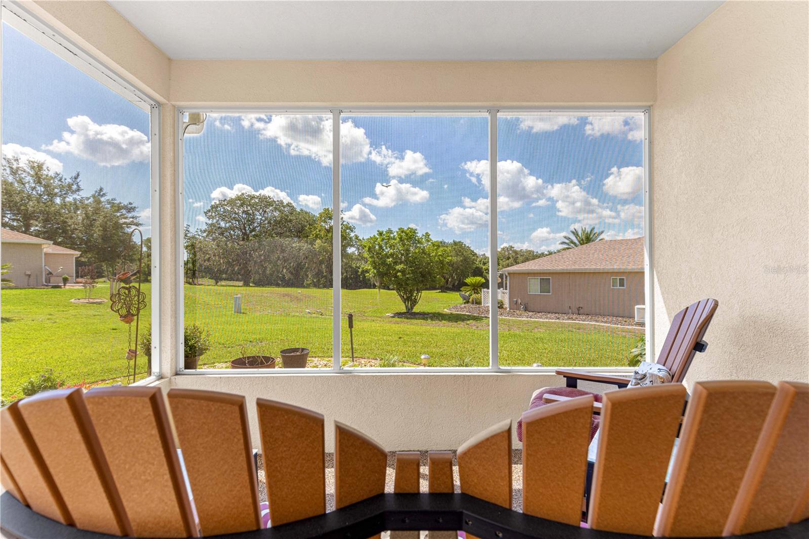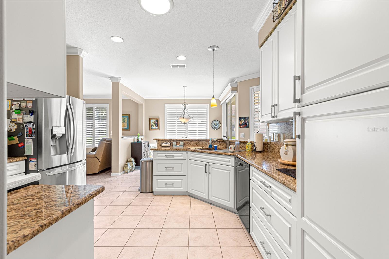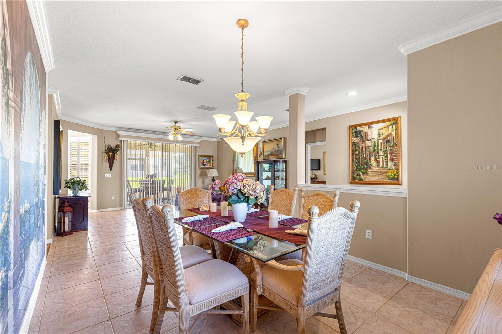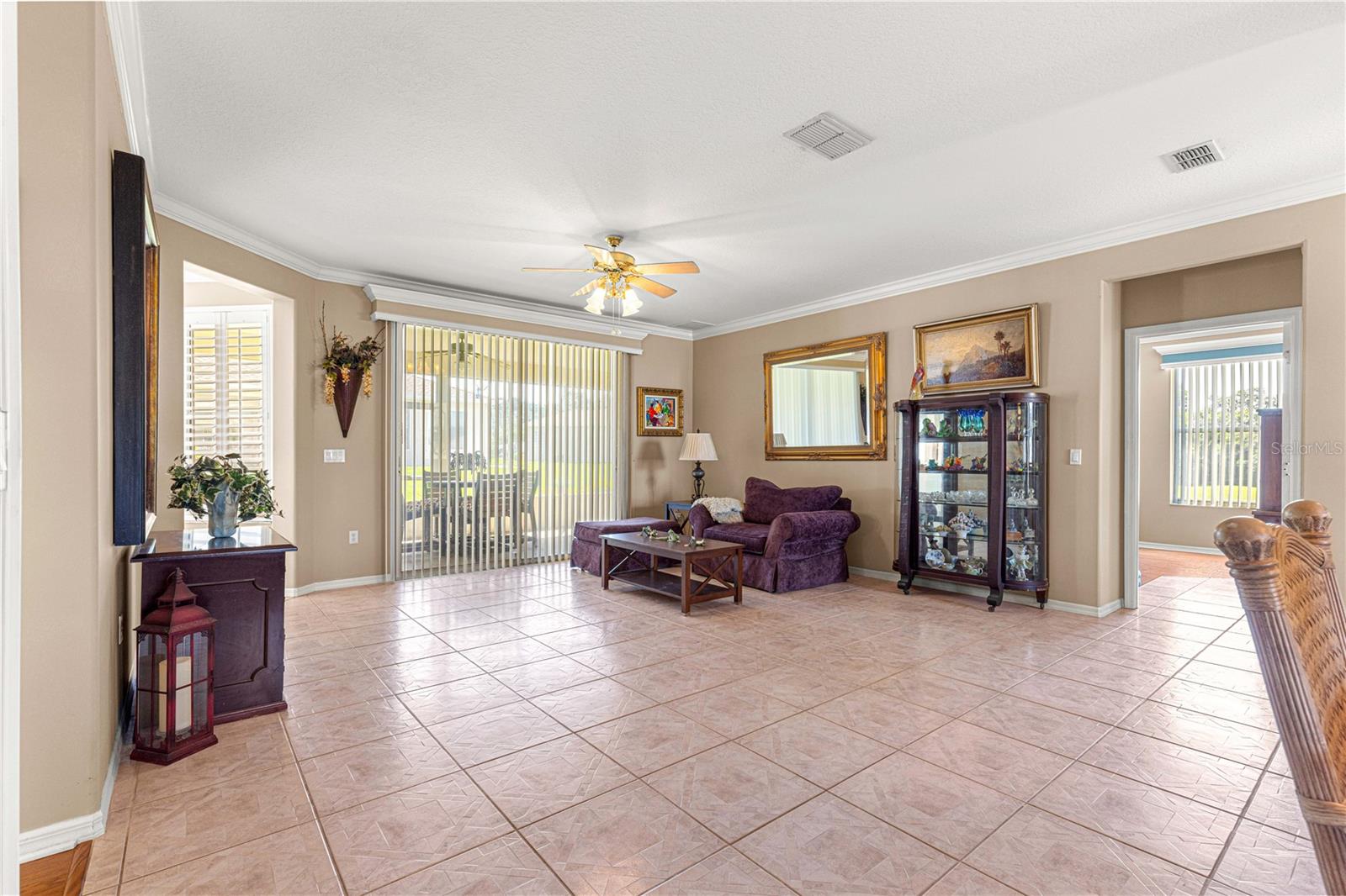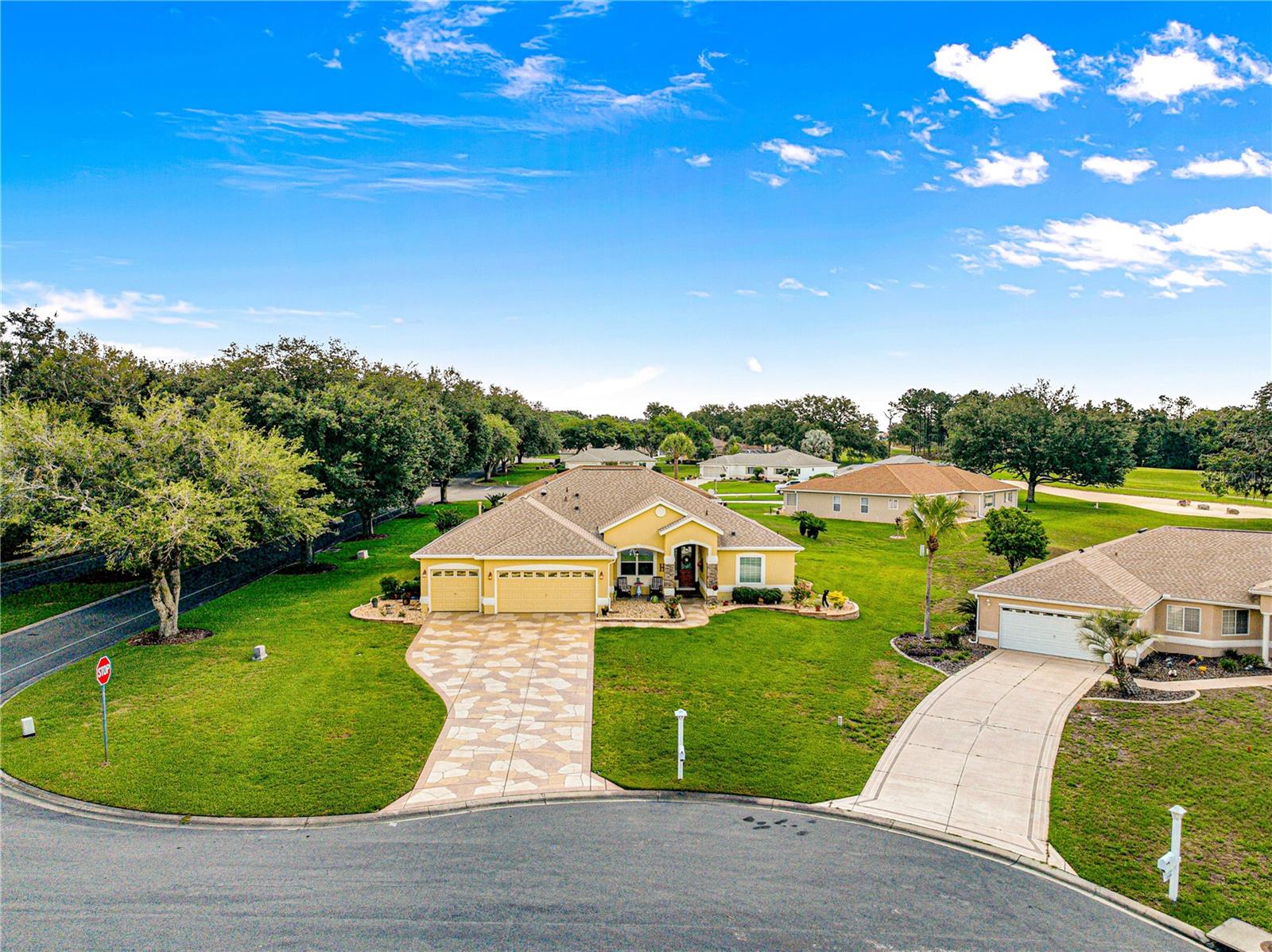 Stunning rare Galleria Floor plan with Golf Course Views in Del Webb Spruce Creek Golf & Country Club! Don’t miss this rare opportunity to own a highly sought-after Galleria model nestled on a cul-de-sac corner lot. This meticulously maintained home offers a true 3 car garage and showcases golf course views. Curb appeal abounds with a stamped driveway and walkway, stone façade pillars, professionally designed landscaping with stacked stone edging, and a leaded glass front door. Inside, elegant upgrades include no carpet and added touches such as tile flooring, crown molding, an open formal living room and dinning room with a custom wall mural, perfect for entertaining in style. The spacious primary suite features laminate flooring, dual walk-in closets, crown molding, a sliding glass door to the lanai, and a designer accent wall. The luxurious en-suite bath includes a soaking tub, quartz countertops, raised dual vanities, and a large tiled shower with clear view glass and built-in seat. Two additional bedrooms feature crown molding and laminate flooring, with the guest bath offering tile flooring, onyx countertops, shower with seating, raised vanity, and a solar tube for natural light. The gourmet kitchen boasts newly faced 42-inch soft close cabinets, with pull outs, granite countertops, stainless steel appliances, gas hook up for oven options, solar tube, and a charming breakfast bar. Adjacent, the spacious great room includes built-in cabinetry, plantation shutters, and 18-inch tile, while the eat-in nook is bright and welcoming with matching shutters and elegant cornices throughout the home. Enjoy Florida living in the screened Lanai with pebble flooring, overlooking serene views. Additional features include a roof (2017), HVAC(2015) solar attic fan, leaf filter system with lifetime warranty, new duct work 2025, new wi-fi garage door opener smart unit with a one yr warranty thru Master Touch Garage Door Service and a lifetime warranty thru Lift Master, and an irrigation well. A truly exceptional home offering luxury, privacy, and comfort in a resort-style community-schedule your private tour today!