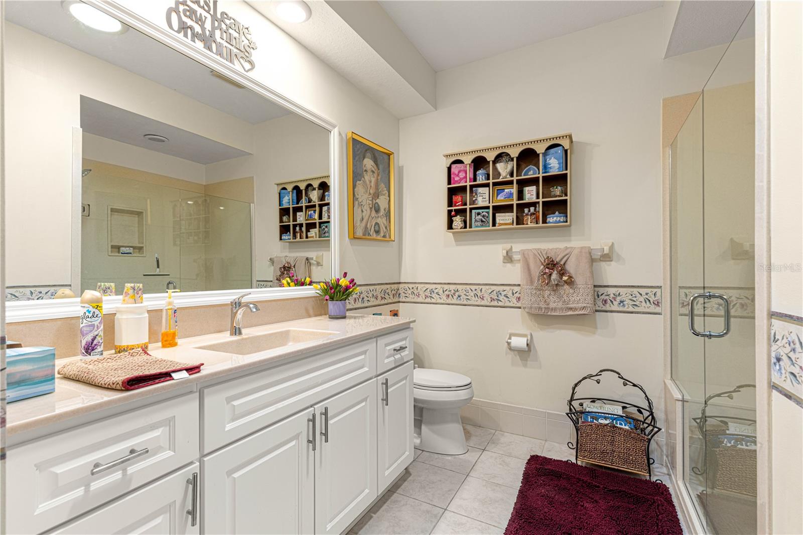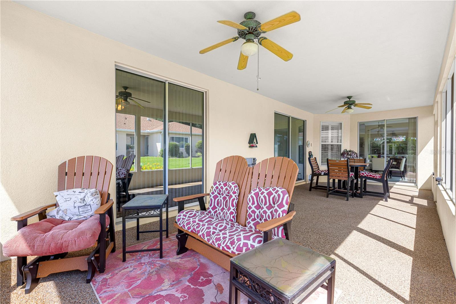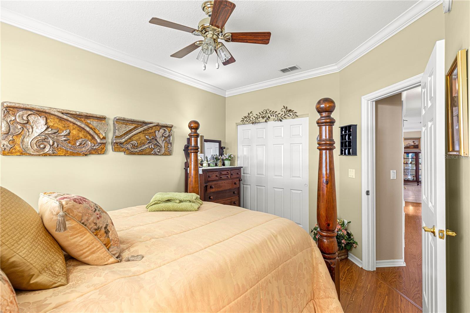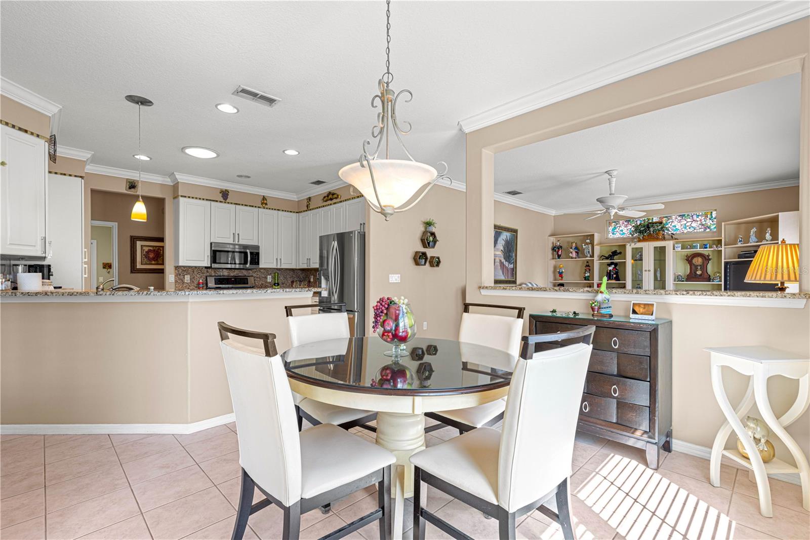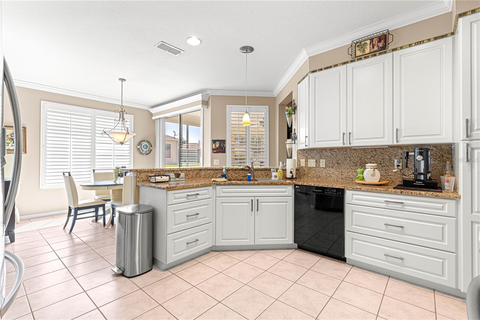 Stunning rare Galleria Floor plan with Golf Course Views in Del Webb Spruce Creek Golf & Country Club! Don’t miss this rare opportunity to own a highly sought-after Galleria model nestled on a cul-de-sac corner lot. This meticulously maintained home offers a true 3 car garage and showcases golf course views. Curb appeal abounds with a stamped driveway and walkway, stone façade pillars, professionally designed landscaping with stacked stone edging, and a leaded glass front door. Inside, elegant upgrades include no carpet and added touches such as tile flooring, crown molding, an open formal living room and dinning room with a custom wall mural, perfect for entertaining in style. The spacious primary suite features laminate flooring, dual walk-in closets, crown molding, a sliding glass door to the lanai, and a designer accent wall. The luxurious en-suite bath includes a soaking tub, quartz countertops, raised dual vanities, and a large tiled shower with clear view glass and built-in seat. Two additional bedrooms feature crown molding and laminate flooring, with the guest bath offering tile flooring, onyx countertops, shower with seating, raised vanity, and a solar tube for natural light. The gourmet kitchen boasts newly faced 42-inch soft close cabinets, with pull outs, granite countertops, stainless steel appliances, gas hook up for oven options, solar tube, and a charming breakfast bar. Adjacent, the spacious great room includes built-in cabinetry, plantation shutters, and 18-inch tile, while the eat-in nook is bright and welcoming with matching shutters and elegant cornices throughout the home. Enjoy Florida living in the screened Lanai with pebble flooring, overlooking serene views. Additional features include a roof (2017), HVAC(2015) solar attic fan, leaf filter system with lifetime warranty, new duct work 2025, new wi-fi garage door opener smart unit with a one yr warranty thru Master Touch Garage Door Service and a lifetime warranty thru Lift Master, and an irrigation well. A truly exceptional home offering luxury, privacy, and comfort in a resort-style community-schedule your private tour today!