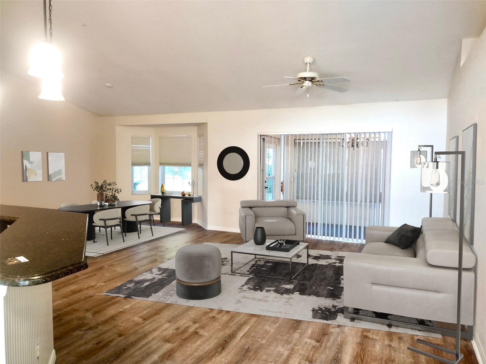 One or more photo(s) has been virtually staged. ROOF installed in 2015, HVAC system 2017, Water heater 2019, INTERIOR painted Nov 2025, which do not reflect in photos! Welcome to your forever home in the Beautiful 55+ Gated Golf Community of STONECREST, with all the amenities, adjacent to THE VILLAGES, FLORIDA! 3 Bedroom, 2 Bath CONCRETE/BLOCK/STUCCO home offers privacy, space, and an inviting atmosphere that makes it feel like home the moment you walk through the door. Vaulted ceilings create an airy, open feel in the main living areas, which feature LAMINATE Flooring throughout the Kitchen, Living, and Dining spaces. The Kitchen is a chef’s delight, complete with GRANITE countertops, Stainless Steel appliances, pendant lighting over the Breakfast Bar, and custom-built Cabinetry with convenient pull-out shelving. The thoughtfully designed split floor plan ensures comfort and privacy, with a spacious Primary suite that boasts dual closets, an updated walk-in shower, dual vanities, and a dressing table. Sliding glass doors provide direct access to the ENCLOSED LANAI, offering a peaceful retreat where you can relax and unwind. One of the additional bedrooms is currently set up as an office. Step outside to an oversized TILED patio with a PERGOLA, perfect for entertaining or enjoying your morning coffee in your tranquil backyard setting. Additional features include tile in one bathroom, carpet in two bedrooms, and durable indoor/outdoor carpet in the lanai. With a ROOF installed in 2015, HVAC system 2017, Water heater 2019, this home is priced to sell. Stonecrest offers an array of amenities from golf and pools to clubs and community events making every day feel like a vacation. Don’t miss your chance to experience it all. Schedule your private showing today and make this exceptional home yours.