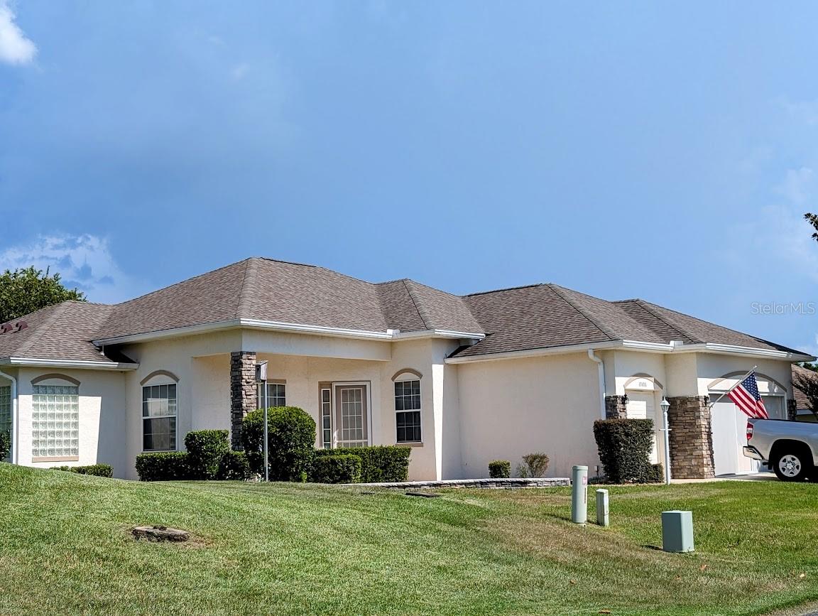 No Bond in this development. This Home has many updates inside and out, from the elegance of 14' high ceilings and 3 way sliding glass doors to a private screen room and back yard paradise to a GOLF CART GARAGE (no, a golf cart is not included), plus an oversized 2 car garage with over head door and screen slider doors. New Lenox Central A/C in 2025, a 5 years new roof. New hot water heater in 2025! The Back yard Screen lanai looks out to a very private professionally landscaped yard. 3 bedrooms provide a Split arrangement with the primary bedroom and ensuite bath being located privatly at the back of the home. Another bonus is an office set up, that could be converted to a formal dining room. The laundry room is off the open chef's kitchen and has a breakfast bar, wall pantry, and open arched window to living area. Keep the conversation going even when you're cooking or entertaining. There's a pet door from house to the garage. Off the kitchen, is a casual dining area that looks out to the private back yard through sliding glass doors on all sides of the screened Lanai. 14' ceilings and the many windows provide ample natural light to this quality Stucco home. This home has been meticiously cared for inside and out! Smooth ceilings and newer luxury flooring. Tall windows with treatment accents, bring natural light to every room. The primary bedroom has a walk in closet and luxury primary ensuite bath with separate corner tub and walk-in Roman ceramic tiled shower, separate double sinks, a makeup table and lastly ensuite linen storage closet and a water closet that makes the luxury ensuite bath complete. Walk in closet in the primary bedroom has added double shelving storage. A sliding glass door from the primary bedroom to the screened in lanai has room for a hot tub and enjoy the space outside on the concrete patio with a mobile 'riser' garden. Custom window blinds sets the character of each room. The triple sliding glass doors to the lanai brings Mother Nature's charms in to the coolness of the indoors. You won't want to miss this gorgeous home setting! Medical facility, grocery and shopping is a golf cart ride away.