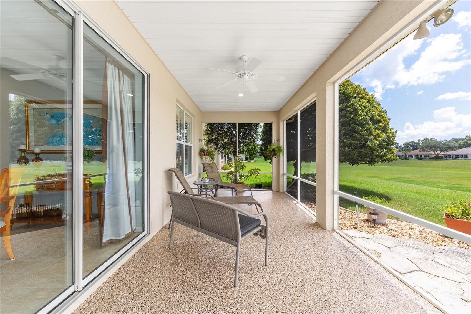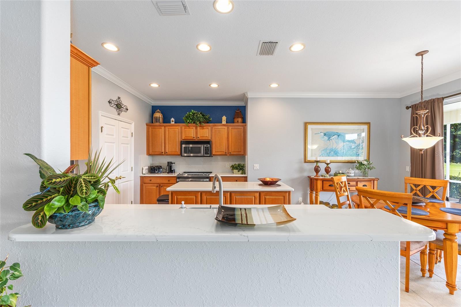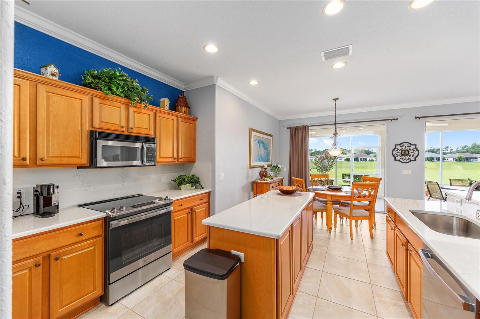 PRICE REDUCED $10,000!!!! How about a 10-acre backyard that is maintenance free, you do not have to care for?? This beautiful Johnstown model has been freshly painted interior and exterior, and boasts many added improvements, including crown molding throughout, easy-care luxury vinyl plank wood look flooring in bedrooms and den, 20-inch stone-look ceramic tile in main living area (no carpet in this home) and, Wow!, plantation shutters throughout the home. Beautiful leaded glass double entry doors open to 2,120 square feet featuring 3 spacious bedrooms and a den, the home sits on a lot that overlooks a dry retention area which is beautifully maintained and groomed, providing you with a gorgeous view from the main living area. A split-bedroom layout provides comfort for guests, with secondary bedrooms located opposite the private primary suite. The kitchen has an island and features and a dining area, and Quartz countertops and backsplash. Upgraded maple cabinets and newer GE stainless steel appliances. Laundry room features new Maytag Washer/dryer and lots of counter and cabinet space! There's a laundry sink in the garage. New Shark Epoxy Coating applied to Driveway, Walkway, and Garage Floor. the Air handler, which was originally located in an inside closet next to the kitchen, has been moved to the garage, creating an extra storage space and eliminating the sound of a running a/c. HVAC 2014. Roof 2017. See the community website for more details and updates. The HOA fee is only $211/ month, making it a excellent value for access to such a wide range of recreational activities and services within a gated, golf- cart friendly community, conveniently located within 4 miles of the Villages. This home has been meticulously maintained and tastefully updated. It looks like a brand new home! AWARD-WINNING Del Webb Spruce Creek Golf & Country Club is a GATED, 3,250 home, +55 Community with over 70 clubs, 3 pools, 3 spas, a Clubhouse, a Fitness Center, Bocce Ball, Shuffleboard, 12 Pickle ball Courts, 7 Tennis Courts, Sand Volleyball, Water Volleyball, Lake Vista Gazebo, Pavilions, Walking Paths and so much more! Come see this beautiful community with a GORGEOUS Tree Canopy on the Boulevard and its Restaurant, Liberty Grille. Come, enjoy the four (4) 9-hole Golf Courses today and begin living your BEST LIFE! DON'T WAIT TO SEE THIS BEAUTIFUL HOME