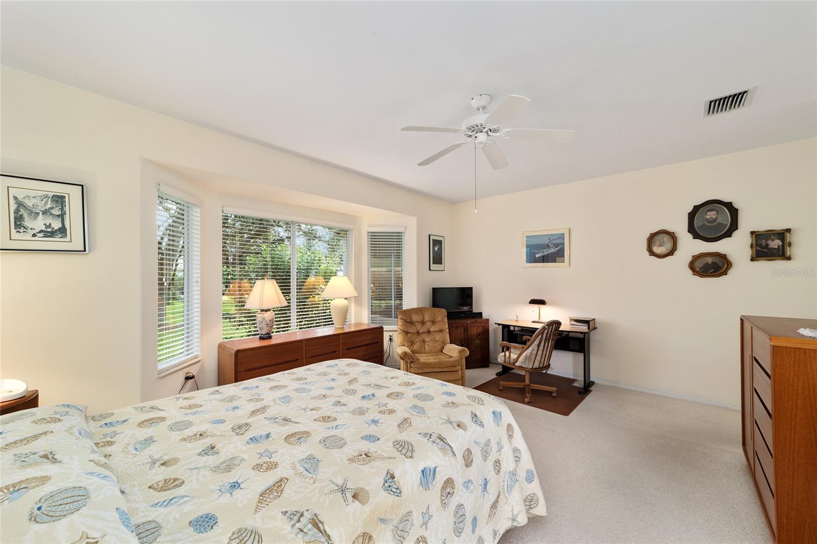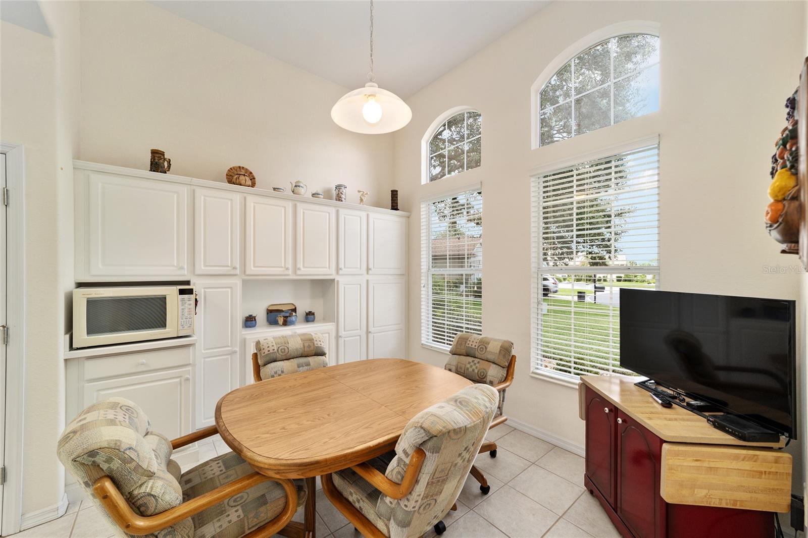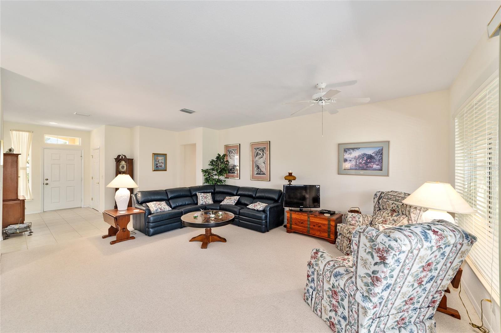 Situated on a quiet cul-de-sac with views of the golf course, this Sanibel residence has had a single owner and includes an additional third bedroom. The roof was replaced in 2021, and a new HVAC system is scheduled for installation in December 2025. The kitchen features Corian countertops and a full wall of built-in cabinets in the breakfast nook. The screened lanai was re-screened in 2018. The interior laundry room currently serves as an office, while the laundry area has been moved to the garage. Additional amenities include a tandem Golf Cart Garage, screens installed on both the main garage and the Golf Cart Garage, and an extended garage space. The property also offers a designer driveway, walkway, and front porch. The spacious backyard provides ample opportunity for a pool or outdoor recreation. An irrigation well is shared with neighboring properties. Located within Del Webb Spruce Creek Golf & Country Club, residents have access to four 9-hole golf courses, a restaurant, pro shop, three pools and hot tubs, a softball field, fitness center, and more. The home is protected by a transferrable termite bond, and the seller is offering a one-year Broward Factory Service Home Warranty. Appointments for viewing are available upon request.