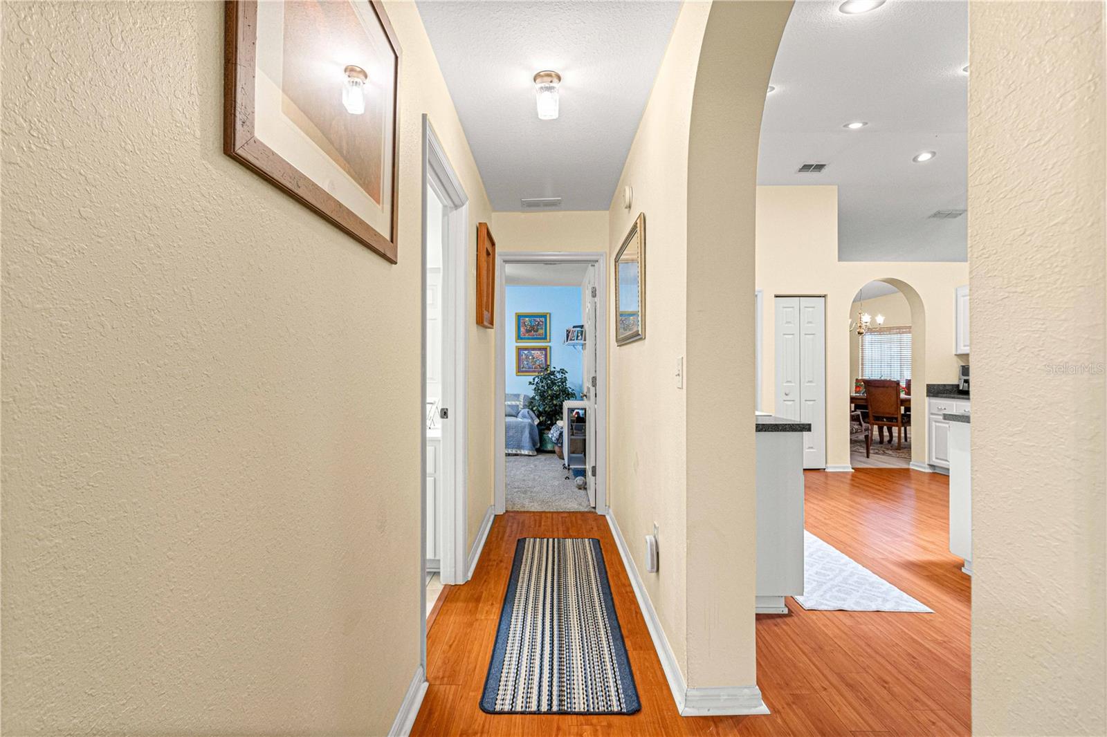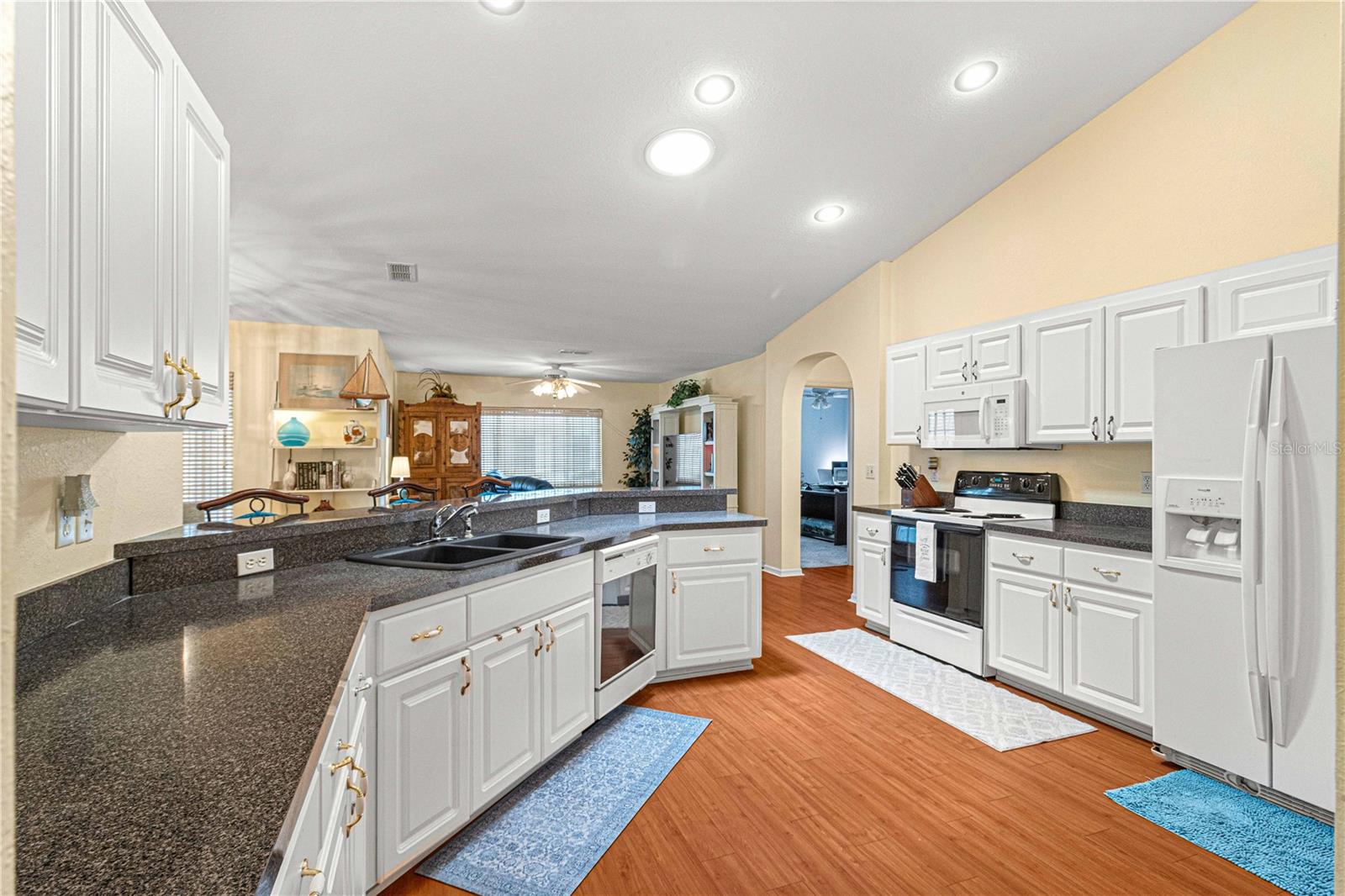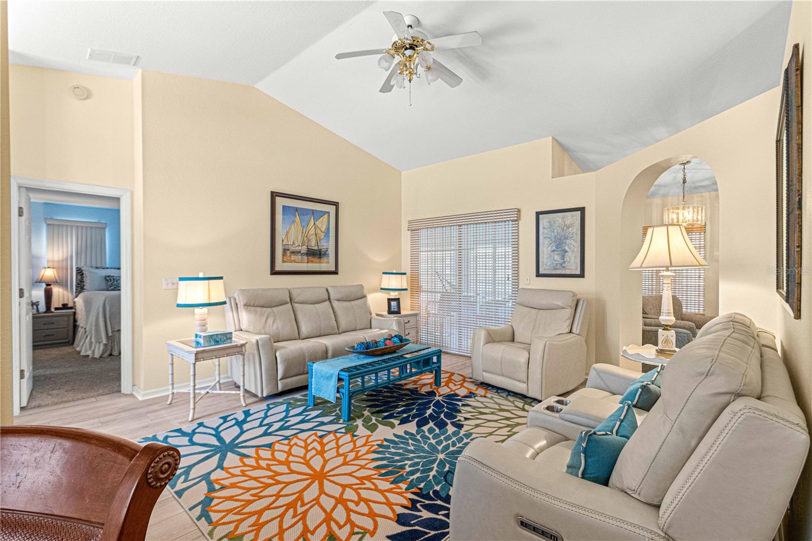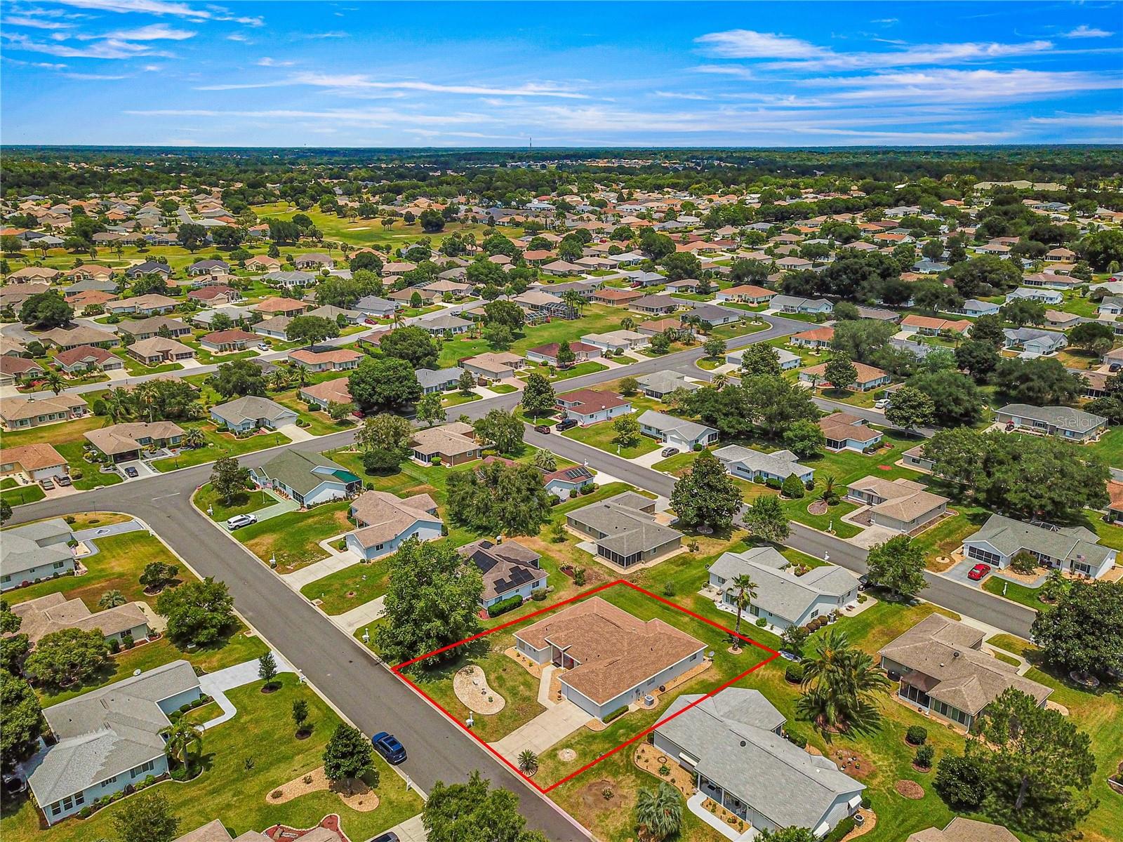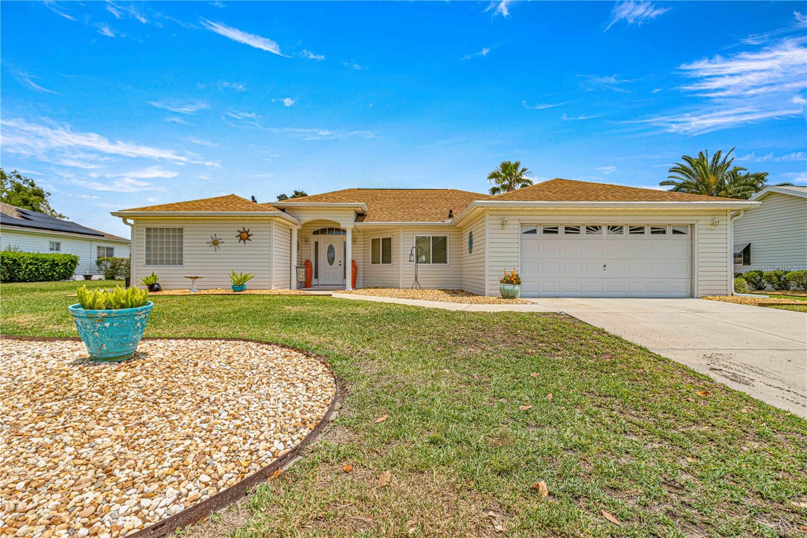 Here is your opportunity to purchase this meticulously maintained 3 bedroom, 2 bath Aspen floor plan in Del Webb Spruce Creek Golf & Country Club, a premier 55 plus community nestled in the heart of Summerfield, Fl. Just a short 10-15 minute drive to The Villages. This Aspen floor plan spans 2,342 sq ft under heat and air. The home exudes curb appeal with its easy to maintain vinyl siding, leaded glass entry door, and completely refreshed landscape. As you step inside, you will discover the heart of the home is an expansive open floor plan with both a formal living and dinning room, as well as a great room which is open to the kitchen and great for entertaining. The kitchen is ideal for hosting gathering with its bright white cabinets, and well-placed solar tube, enhancing the airy ambiance. The primary suite is a sanctuary, featuring an en-suite with double closets, a generous soaking tub, and updated walk in shower with direct access to the heated and cooled Lanai. Updates include some newer windows, full leaf guard gutter system, roof re-shingled in 2014, HVAC (2013), new stainless steel microwave, and refrigerator, and newer warm carpeting in the bedrooms. Both guest bedrooms are of ample size to allow privacy for guests. The vaulted ceilings amplify the sense of space throughout the main living area, while the split floor plan ensures privacy. The highlight of outdoor living is the enclosed, heated, and cooled lania with access from both the great room, and primary suite, providing the perfect setting for year round enjoyment.