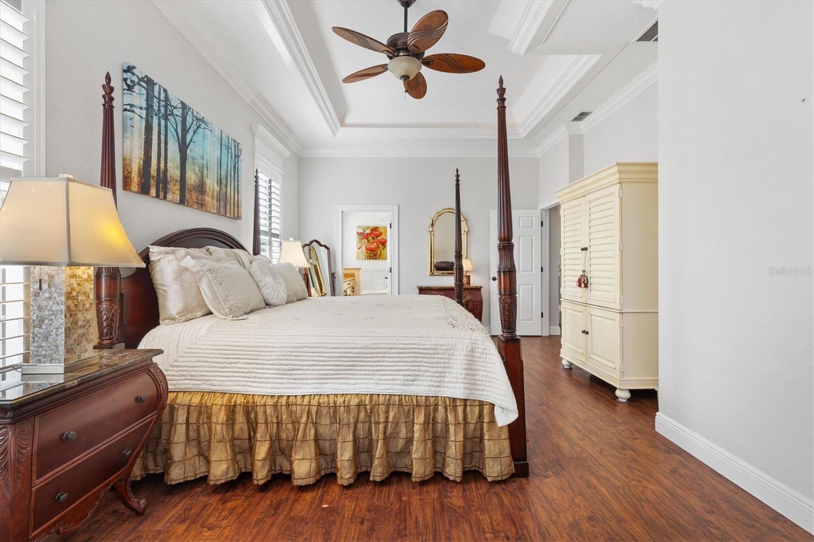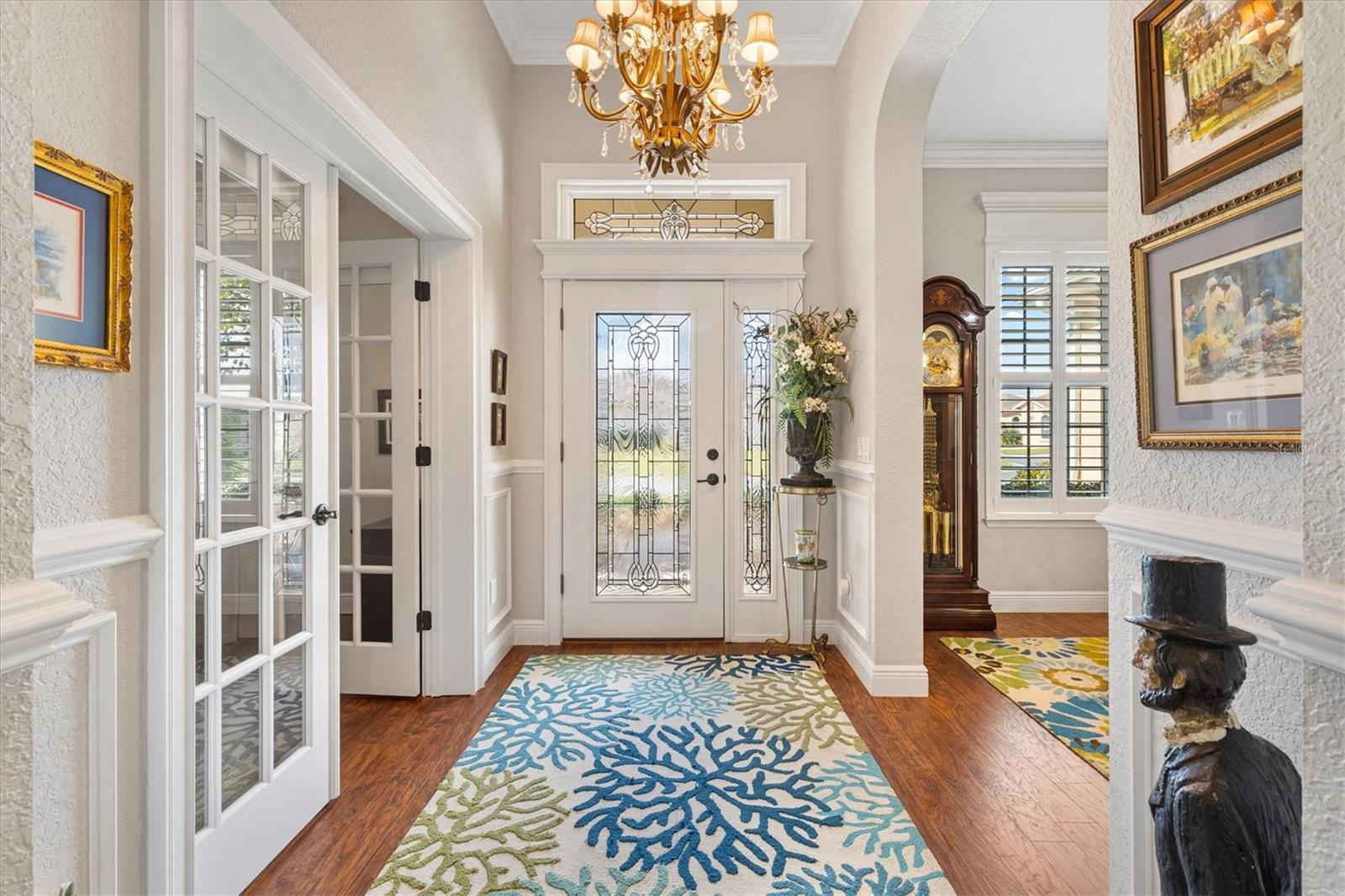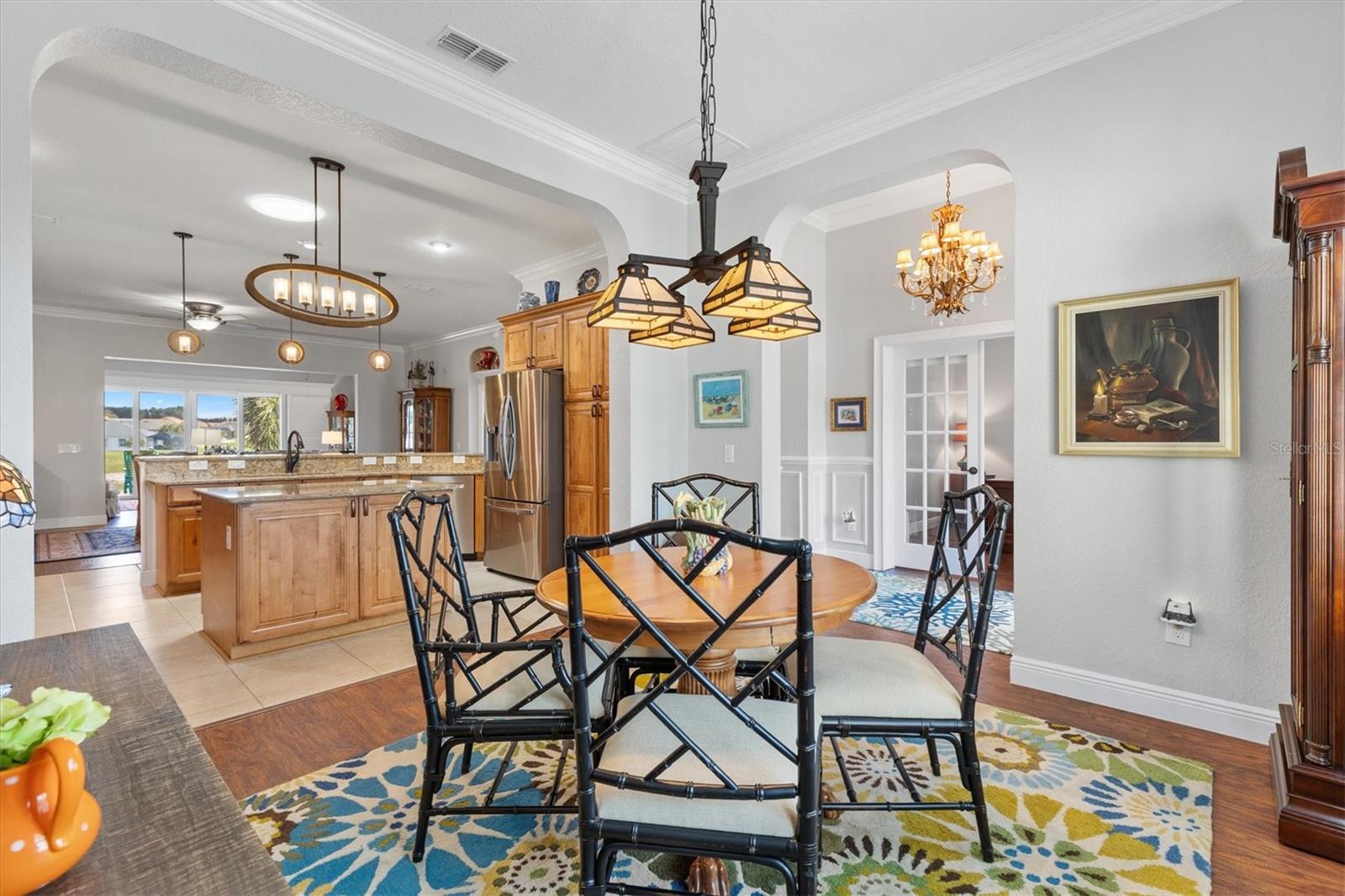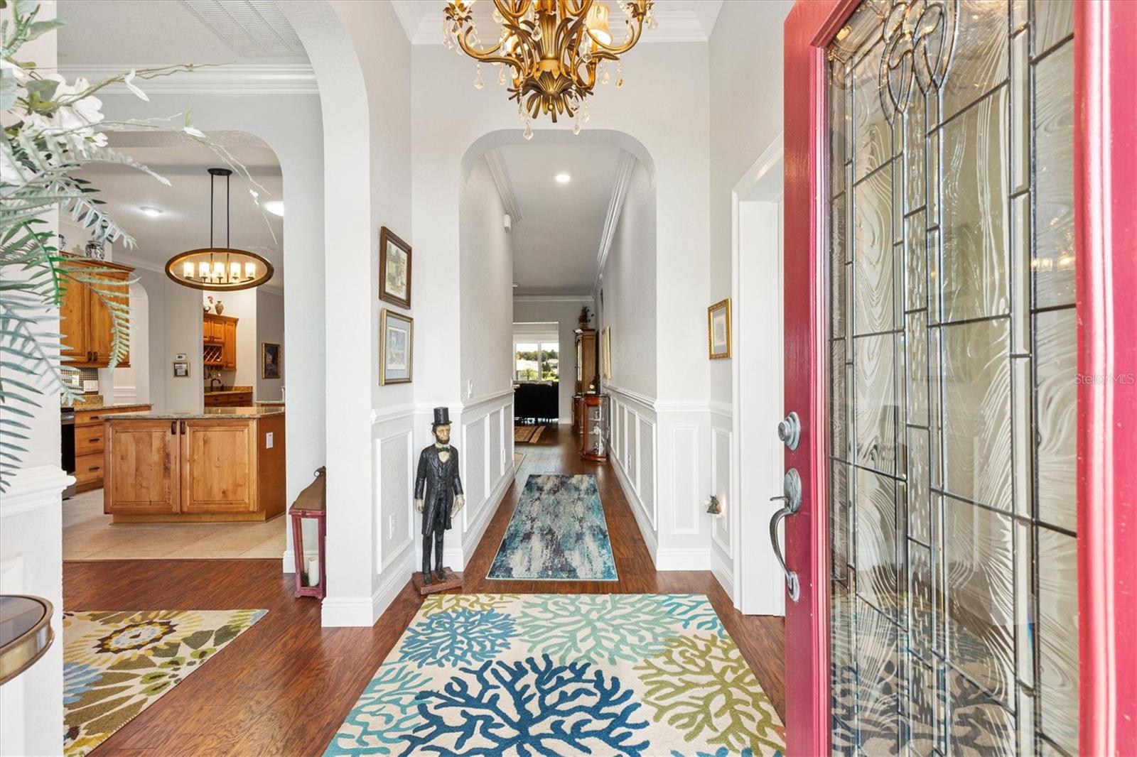 Welcome to your dream home in the Exclusive 55+ Gated Golf Community of STONECREST, where luxury, lifestyle, and location unite in perfect harmony! Ideally situated adjacent to THE VILLAGES, FLORIDA, this custom-built premier residence captures a spectacular WATER VIEW and offers the kind of peaceful sophistication you simply can’t live without. Wake each morning to breathtaking sunrises shimmering across the tranquil water, surrounded by a professionally landscaped yard adorned with elegant rock islands and stone accents that enhance the home’s remarkable curb appeal. Step through the etched-glass front door and be instantly captivated as your gaze flows effortlessly from the spacious living and family rooms to the magnificent lake view beyond. Inside, every detail showcases craftsmanship and comfort. Gorgeous LAMINATE and CERAMIC TILE Flooring, 10-FOOT CEILINGS, and a chef inspired Kitchen designed for both style and function. The kitchen Features rich Hickory cabinetry with self closing drawers, QUARTZ countertops, crushed GRANITE deep sink, STAINLESS STEEL Appliances, DRY BAR, Breakfast bar, and Kitchen island, all beautifully enhanced by exquisite lighting, solar tubes, recessed fixtures, and under-cabinet illumination that brings the glass stone backsplash to life. The outdoor living area is a true extension of the home’s elegance, Featuring BRICK PAVERS under a screened BIRDCAGE enclosure, and a covered OUTDOOR KITCHEN perfectly positioned to enjoy unobstructed water views, a space designed for both relaxation and entertaining, where every sunset feels like a private show! With a NEWER ROOF and HVAC system (both 2015), this home offers not just beauty, but confidence and peace of mind. Come experience the perfect blend of elegance, ease, and energy in a vibrant golf community brimming with amenities. This isn’t just a home...it’s the lifestyle you’ve been dreaming of.