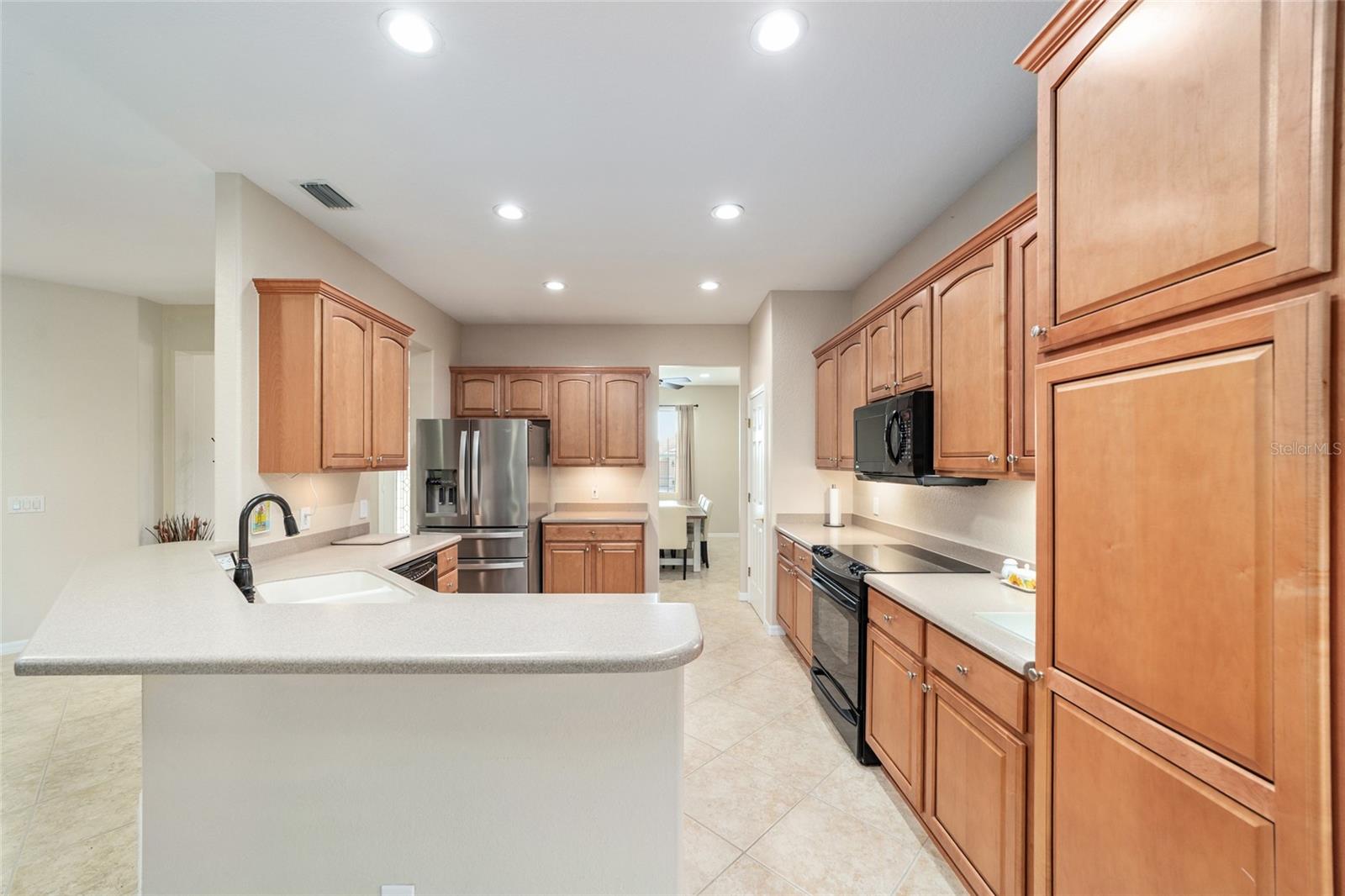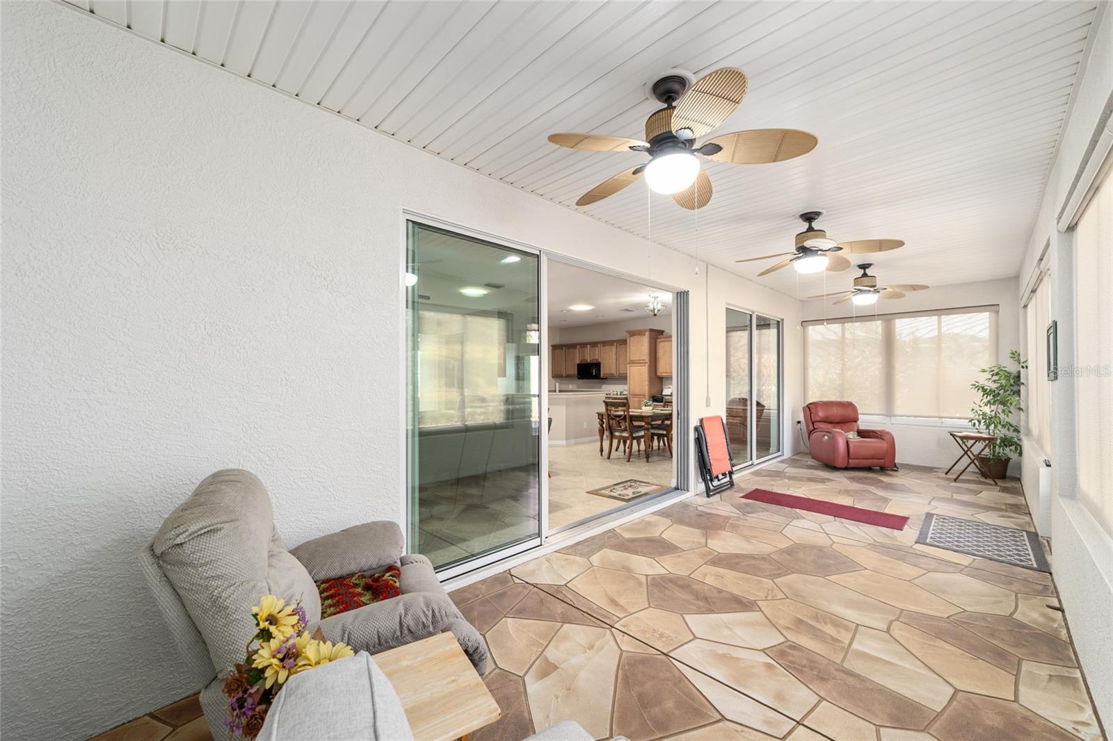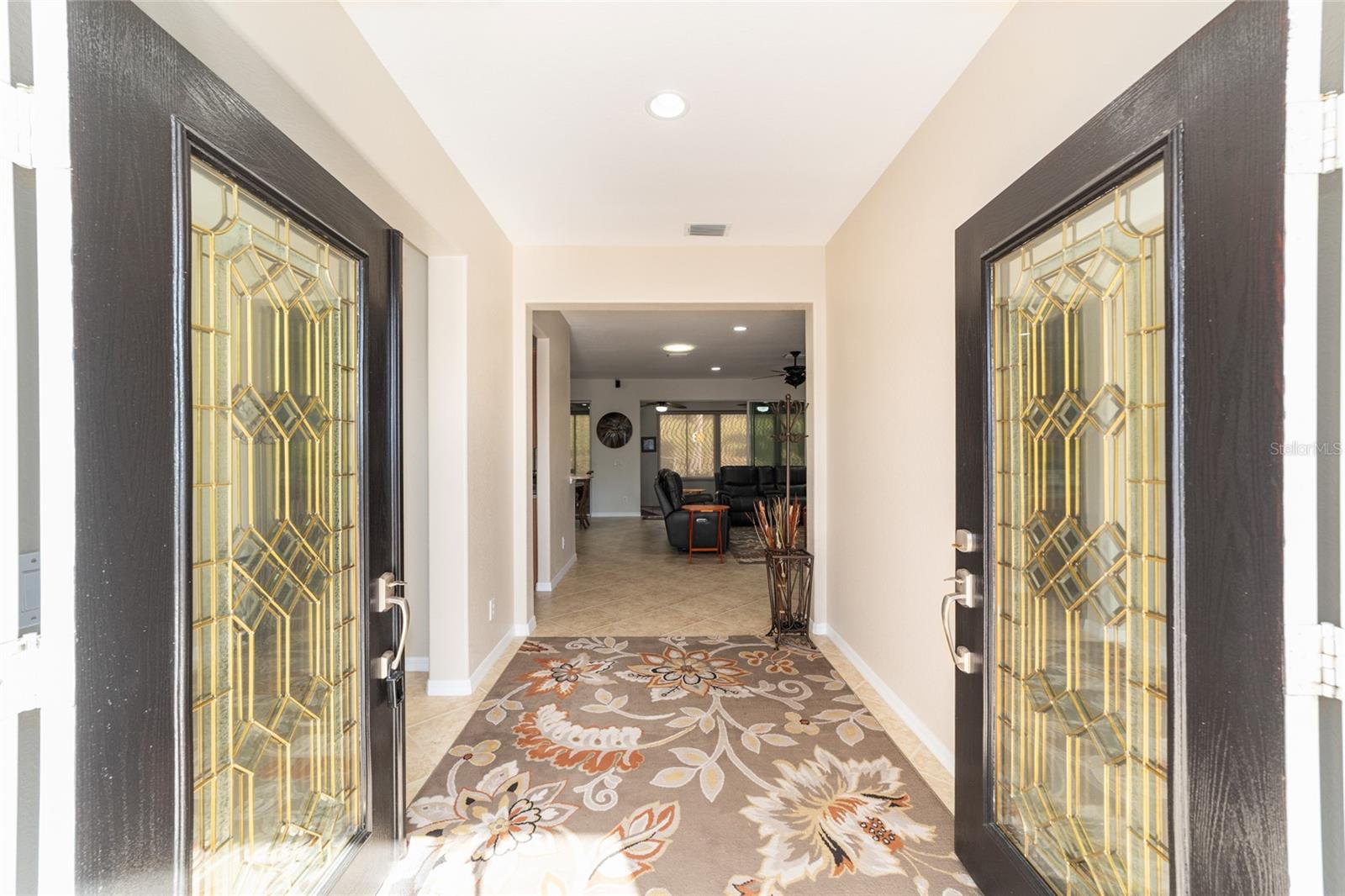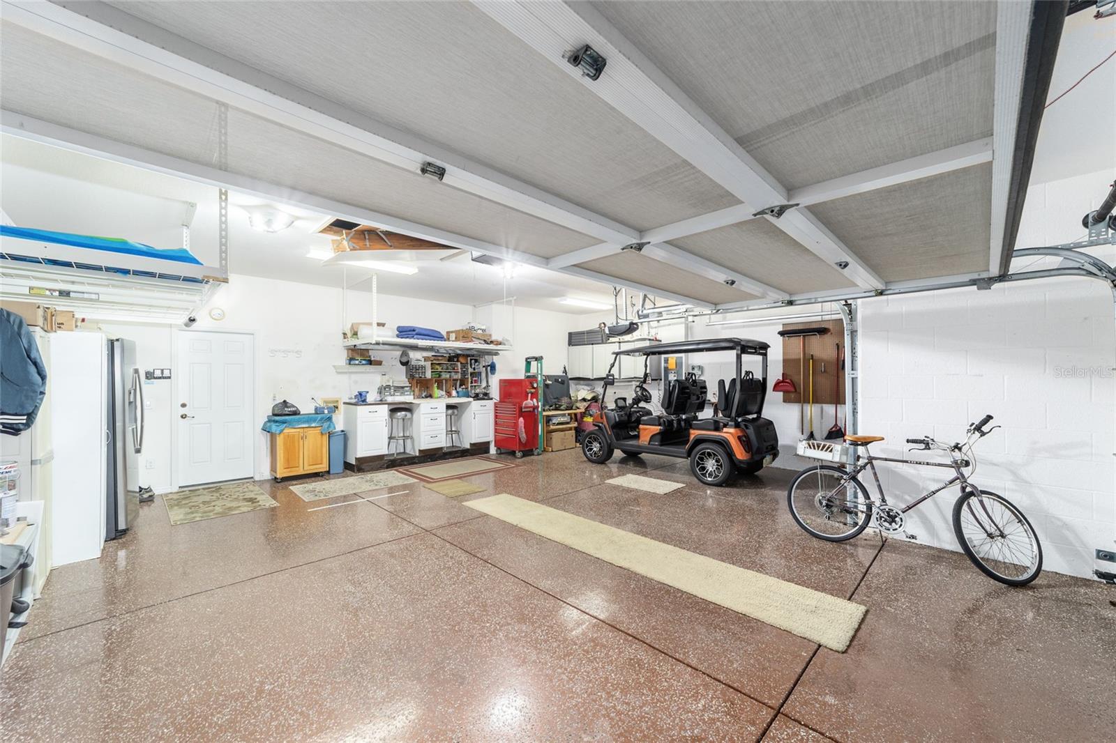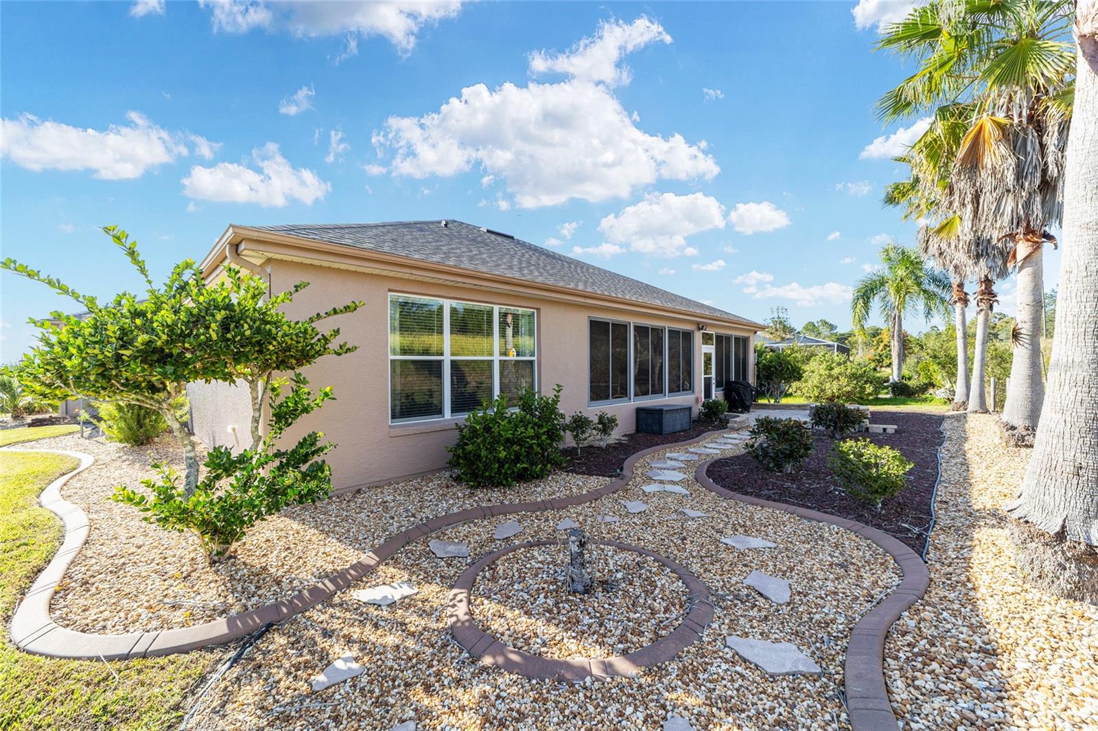 LOCATION FOR PRIVACY: Situated on a premium lot, the back yard of this home backs up to the 125 acre nature preserve for tranquility and privacy. You are greeted by the professionally landscaped front yard with hacienda walls and the unique stamped concrete designer driveway and walkway (has been recently sealed) Beautiful leaded glass double doors welcome you. Once inside, Large 16” tiles adorn the main areas with Vinyl plank in bedrooms, tile in baths and laundry. Upgraded kitchen cabinetry that extends into the breakfast nook. Corian counters with molded sink, upgraded faucet and appliances; double pantries, breakfast bar and built-in desk area. Large primary suite; bath features custom double shower with benches and clear glass enclosure, double sinks. Inside laundry room with both upper/lower cabinetry plus sink; The over-sized extended double car garage (26’x20’) plus golf cart garage (20’x8’) has a premium expoxy . Lots of storage; attic, cabinetry and two hanging racks. Key-less entry. Remote controlled roll-up garage screen. Attic fan. Attic re-piped. NEW ROOF 2024, HVAC replaced 2023, NEW WATER HEATER 2022. Freshly painted inside and out. The 32’x10’ enclosed lanai also has the stamped designer concrete floor along with a knee-wall, acrylic windows, rollers privacy shades and ceiling fans. Enjoy nature at its best and grilling on the flagstone patio in the evening. AWARD-WINNING Del Webb Spruce Creek Golf & Country Club is a GATED, 3,250 home, +55 Community with over 70 clubs, 3 pools, 3 spas, a Clubhouse, a Fitness Center, Bocce Ball, Shuffleboard, 12 Pickle ball Courts, 7 Tennis Courts, Sand Volleyball, Water Volleyball, Lake Vista Gazebo, Pavilions, Walking Paths and so much more! Come see this beautiful community with a GORGEOUS Tree Canopy on the Boulevard and its Restaurant, Liberty Grille. Come, enjoy the four (4) 9-hole Golf Courses today and begin living your BEST LIFE! IF YOU ARE LOOKING FOR THAT FINE 3-BEDROOM HOME THAT FEELS LIKE IT IS IN ITS OWN PRIVATE COUNTRY SETTING....YOU MUST SEE THIS HOME!!