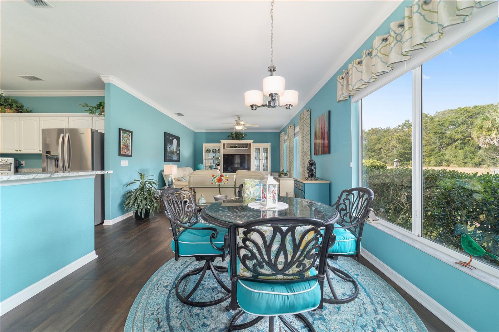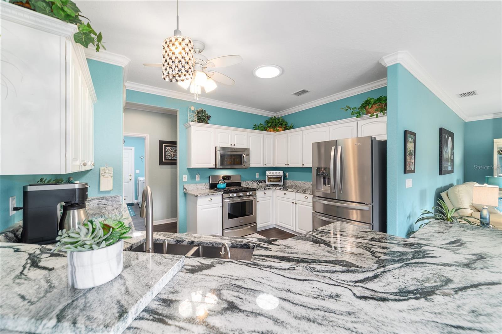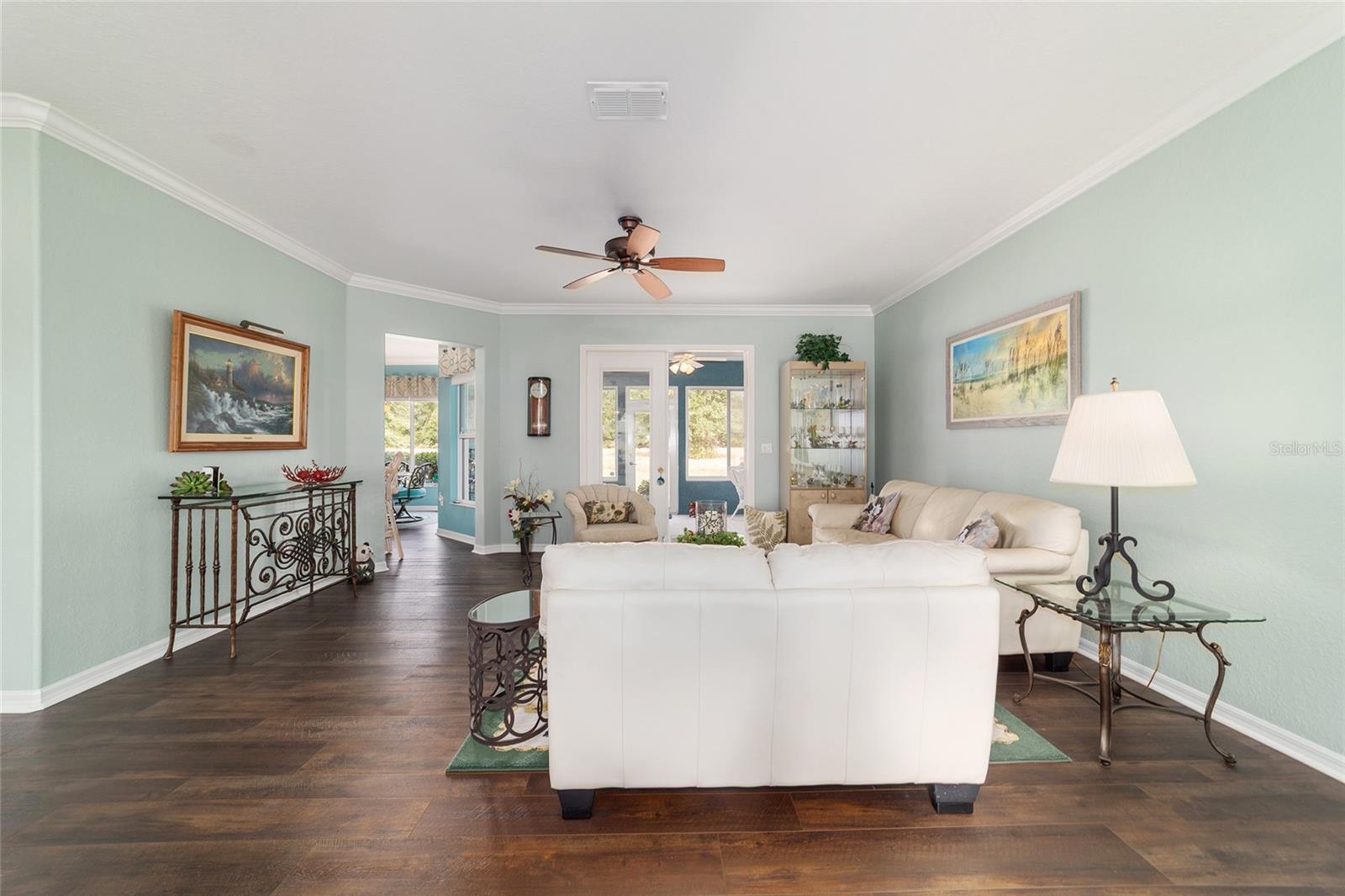 Galleria model with 3 bedrooms, 2 baths, and a full-size 3-car garage located on a natural preserve. Features luxury vinyl plank flooring, granite kitchen counters, Pull outs, stainless steel appliances, instent hot water in kitchen ,recessed lighting, 4 solar tubes, crown molding, dual closets in the master, double quartz vanities, walk-in shower, water closet , and tile in the master bath. Guest rooms are carpeted. The climate-controlled, glass-enclosed lanai has a remote awning and overlooks the preserve, plus there's a spacious patio with a gas line for grilling. The garage includes cabinets, epoxy flooring, attic storage with drop-down stairs, Additional amenities: well for irrigation, whole-house water filtration, fans and lights throughout.