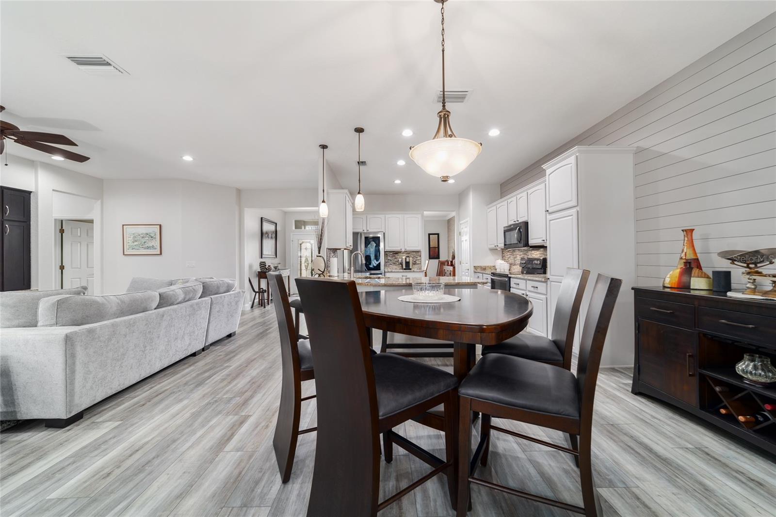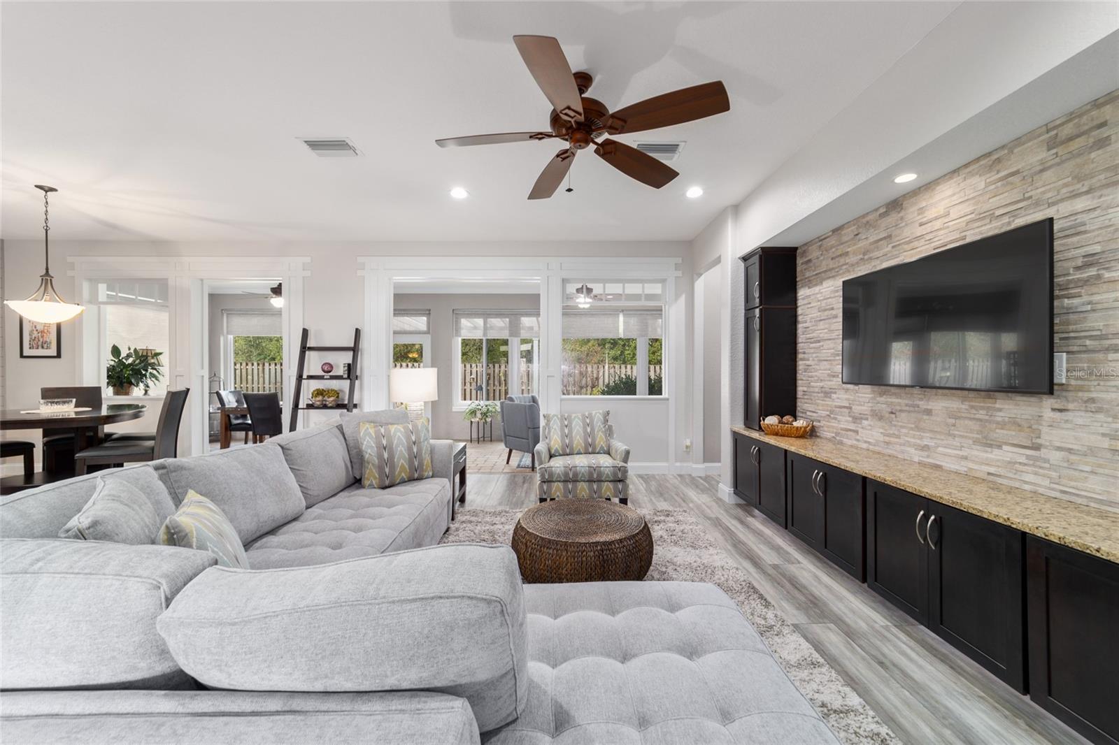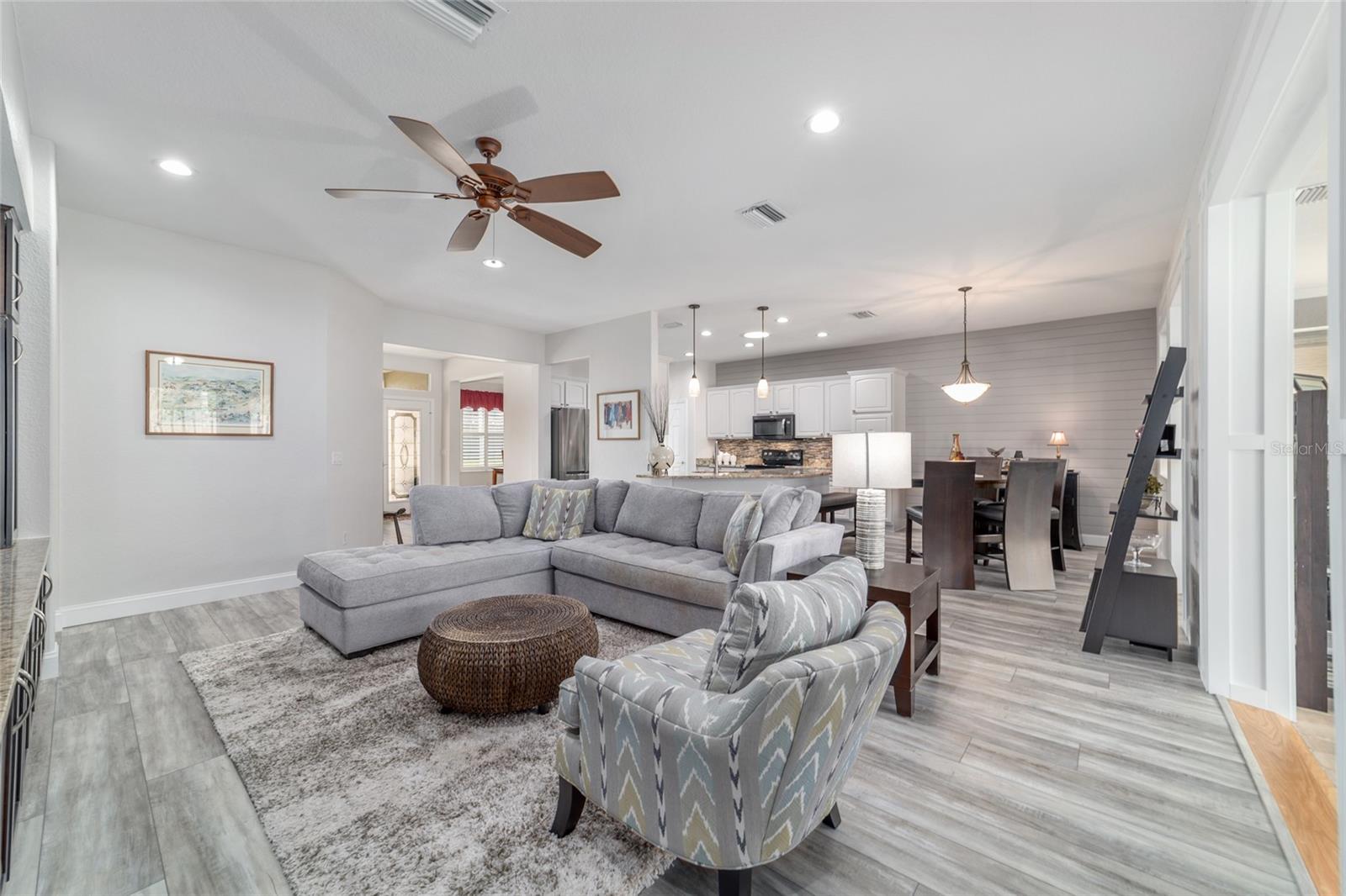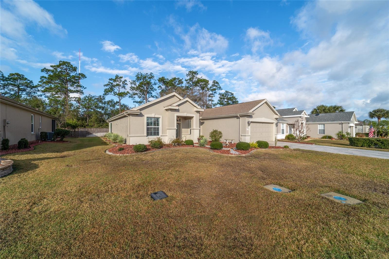 Welcome to this beautifully maintained Hanover floor plan3/2 Located in the highly desirable 55+ Del Webb Spruce Creek Golf & Country Club. This stucco home offers 1958 sq. ft. of living space, including the light filled Florida room, perfect for relaxing or entertaining. From the moment you arrive, you’ll notice the outstanding curb appeal, complete with a painted driveway and walkway, updated landscaping .Inside the open floor plan is enhanced by custom woodwork , recessed lighting, Interior highlights include Luxury vinyl plank flooring throughout newly purchased appliances, plus washer and dryer tiled back splash, and large kitchen. Updated bathrooms, including an en-suite with a beautiful walk-in shower and new fixtures. Plantation shutters, updated lighting, and ceiling fans , Enjoy seamless entertaining with the open Florida room, kitchen pass-through, and a private outdoor patio-perfect for morning coffee, grilling out, or evening gatherings. Major updates for peace of mind are roofing re-shingled (2021) HVAC (2017), This home combines modern updates with a highly functional layout, all within a vibrant community offering golf, recreation, and endless amenities.